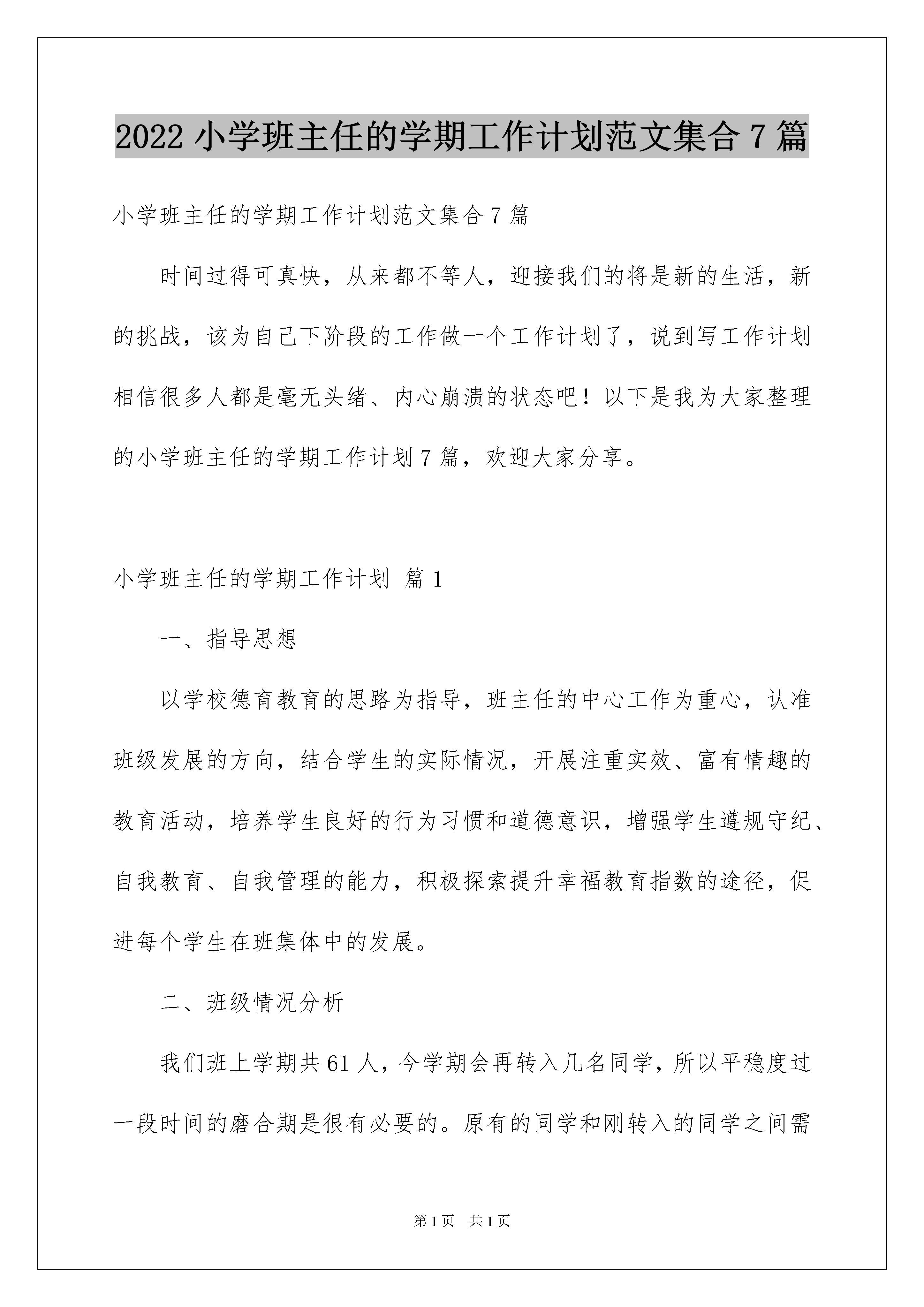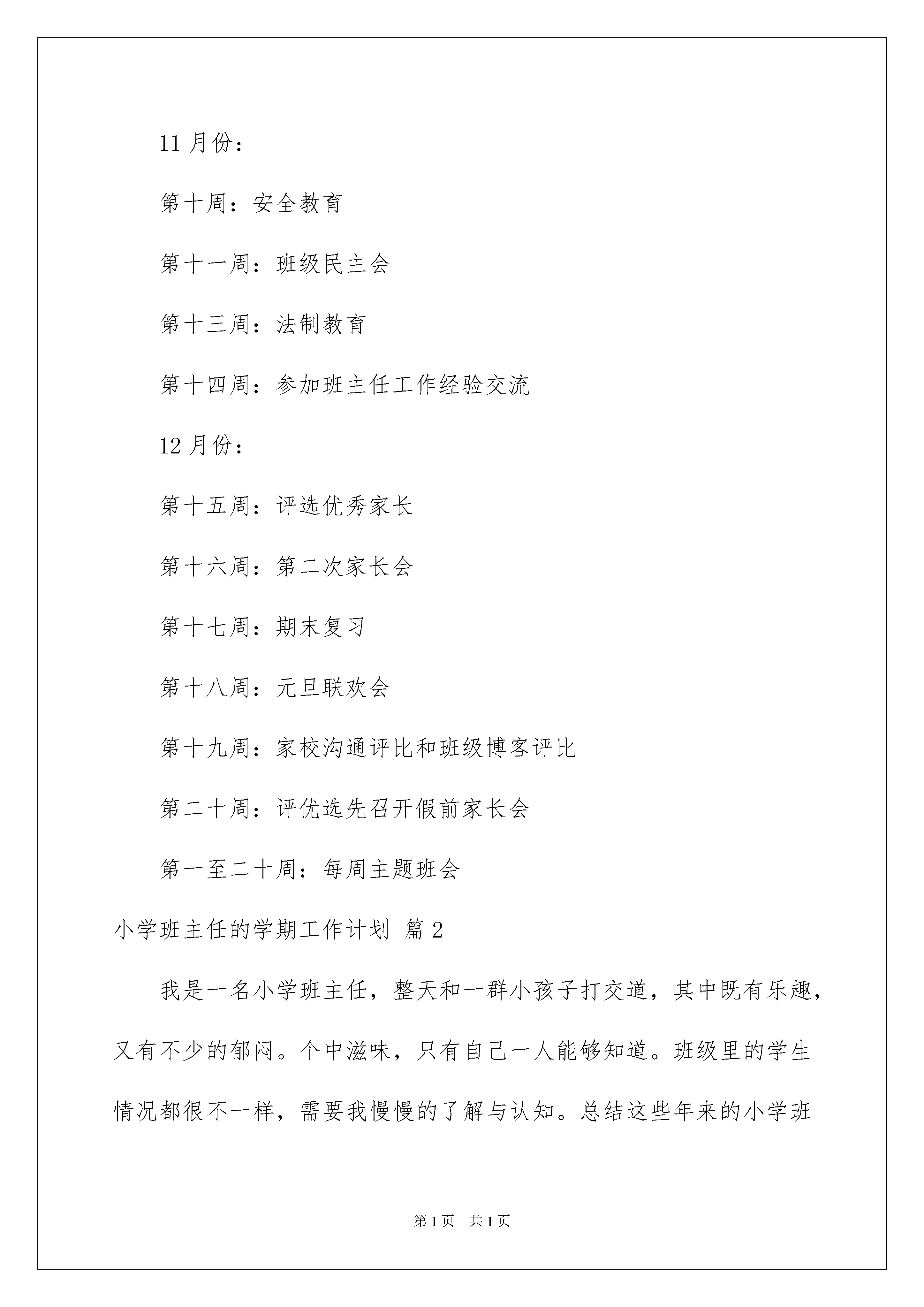2022小学班主任的学期工作计划范文集合7篇小学班主任的学期工作计划范文集合7篇时间过得可真快,从来都不等人,迎接我们的将是新的生活,新的挑战,该为自己下阶段的工作做一个工作计划了,说到写工作计划相信很多人都是毫无头绪、内心崩溃的状态吧!以下是我为大家整理的小学班主任的学期工作计划7篇,欢迎大家分享。小学班主任的学期工作计划篇1一、指导思想以学校德育教育的思路为指导,班主任的中心工作为重心,认准班级发展的方向,结合学生的实际情况,开展注重实效、富有情趣的教育活动,培养学生良好的行为习惯和道德意识,增强学生遵规守纪、自我教育、自我管理的能力,积极探索提升幸福教育指数的途径,促进每个学生在班集体中的发展。二、班级情况分析我们班上学期共61人,今学期会再转入几名同学,所以平稳度过一段时间的磨合期是很有必要的。原有的同学和刚转入的同学之间需要磨合,新同学和新环境、新老师的教育教学方式需要磨合。另外,很重要的一点是,所有的同学都需要和新学段的要求产生磨合。这六十几名同学呈现出很多特点,比如家庭教育背景悬殊很大,学生之间综合素养和性格脾气差异很大,等等。在过去的两年时间里,班集体经历了很多次的磨合,形成了乐观向上的心态、重视班集体荣誉、家长积极配合学校班级工作等班级品质。在三年级,班集体将面临着很多的考验和挑战,需要经历很多的磨炼,需要不断积累,需要来自老师、家长、学校和社会的引导和支持,从而实现进一步的突破和发展。三、新学期工作目标1、进行常规教育,提升自我管理意识,解决班级在秩序方面累积下来的问题,改进班级纪律状况。2、结合实际情况的需要,对学生进行生动、有实效的思想品德教育。3、适时调整班干部,结合实际进行培训,增强对班务的熟悉程度,培养独立处理问题、协调合作、勇担责任、实心热爱班级的品质。4、以课堂教学为主场,严格细致要求,促进良好学风的形成,带动班级的成长。5、与班级各任课老师经常沟通交流,及时了解各科课堂学习状况和学生的个体表现,实施全面教育。6、关爱学生心理健康,针对存在的心理问题,深入调查导致的原因,有针对性和艺术性地开展工作,改善部分学生的心理状况。7、师生共同创设丰富多彩、有内涵、有特色的班级文化,让班级文化教育人,让班级文化熏陶人,让班级文化彰显学生素养。8、及时了解和发现导致学生之间产生矛盾、冲突的因素,指导学生公平对待他人,妥善处理与同学之间的关系。9、把安全工作放在首位,常说常抓,经常排查室内外的安全隐患,指导学生了解各种安全知识,掌握必要的逃生本领,教育学生认真对待各种逃生演习。10、培养良好的卫生习惯,教育学生搞好个人卫生,认真做好值日扫除,爱护室内外和公共场所的卫生,掌握一些劳动技能,维持整洁的环境。11、继续实施与家长建起沟通的桥梁的策略,采用有效的方式,与家长建立交流的途径,促进双方的理解和支持,并充分尊重和发挥学生家长在职业资源、专业知识资源、爱好特长等方面的优势,使教育力量最大化。12、不断学习和探索,促进自我发展和提高,为做好班级工作奠定基础。四、重点工作9月份:第一周:检阅暑假作业,评选优秀作业。第一至四周:入学常规教育,参加学校的常规教育月活动。第一二周:“感念师恩”主题教育活动第三周:第一次家长会第四周:班干部评选10月份:第五周:国庆活动,班级文化建设第六周:关心老人重阳节活动第七周:学做学长,参加一年级入队仪式第三至十周:观察秋天、体验秋天活动第八周:家长委员会会议第九周:全面健身系列竞赛活动11月份:第十周:安全教育第十一周:班级民主会第十三周:法制教育第十四周:参加班主任工作经验交流12月份:第十五周:评选优秀家长第十六周:第二次家长会第十七周:期末复习第十八周:元旦联欢会第十九周:家校沟通评比和班级博客评比第二十周:评优选先召开假前家长会第一至二十周:每周主题班会小学班主任的学期工作计划篇2我是一名小学班主任,整天和一群小孩子打交道,其中既有乐趣,又有不少的郁闷。个中滋味,只有自己一人能够知道。班级里的学生情况都很不一样,需要我慢慢的了解与认知。总结这些年来的小学班主任的经验,我做出了新一年的工作计划。内容有下:一、班级学生情况分析本班共有36名学生,15位女同学和21位男同学。家庭离婚的有5位,无单亲家庭,有一名同学为小智。其中有四分之一的同学学习认真,各方面表现突出。有些同学聪明伶俐,学习能力比较强,态度比较端正,学习成绩优良。大部分同学能按时完成作业,但一般学习方法不够灵活,学习成绩良好。有9名同学学习不够努力,缺乏学习自觉性学习成绩较差。班内有大队长1名,中队长5名,每组有一名小队长。学生性格平时较活泼好动,兴趣广泛