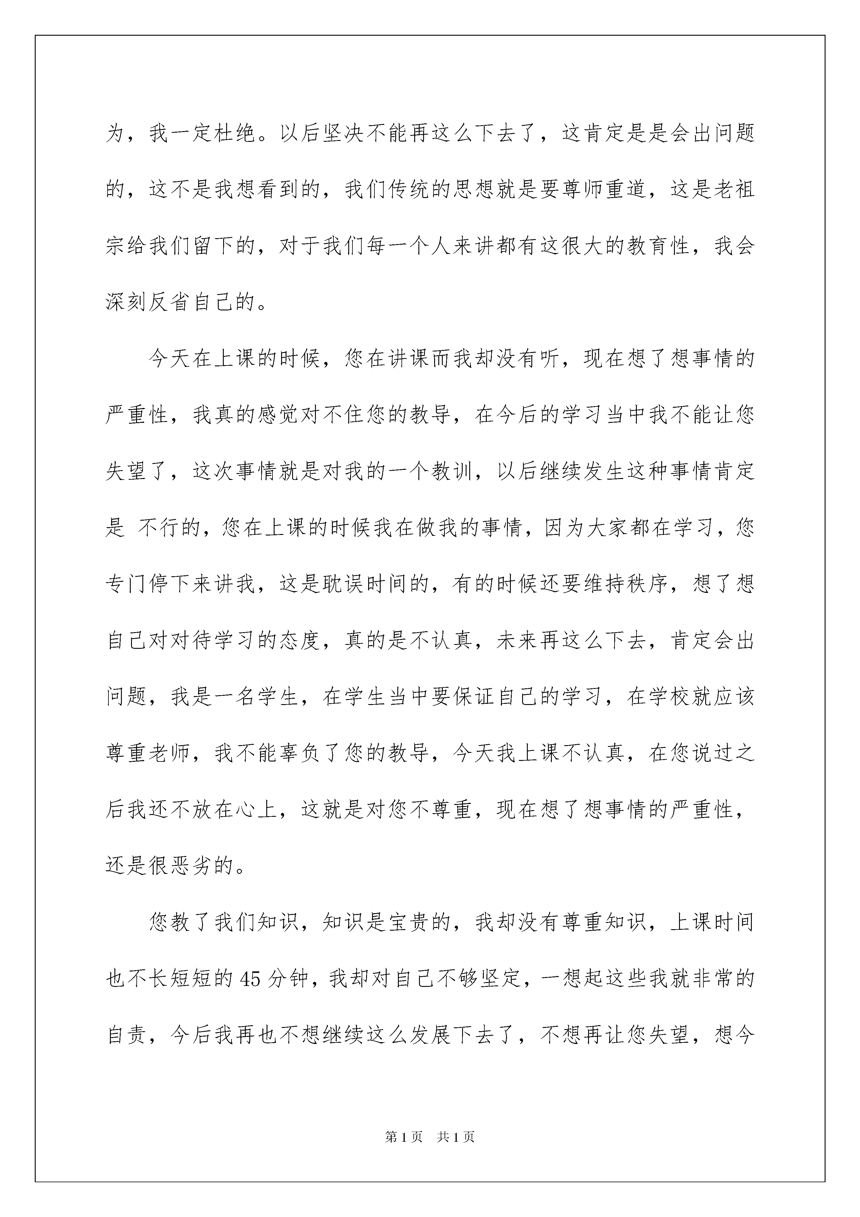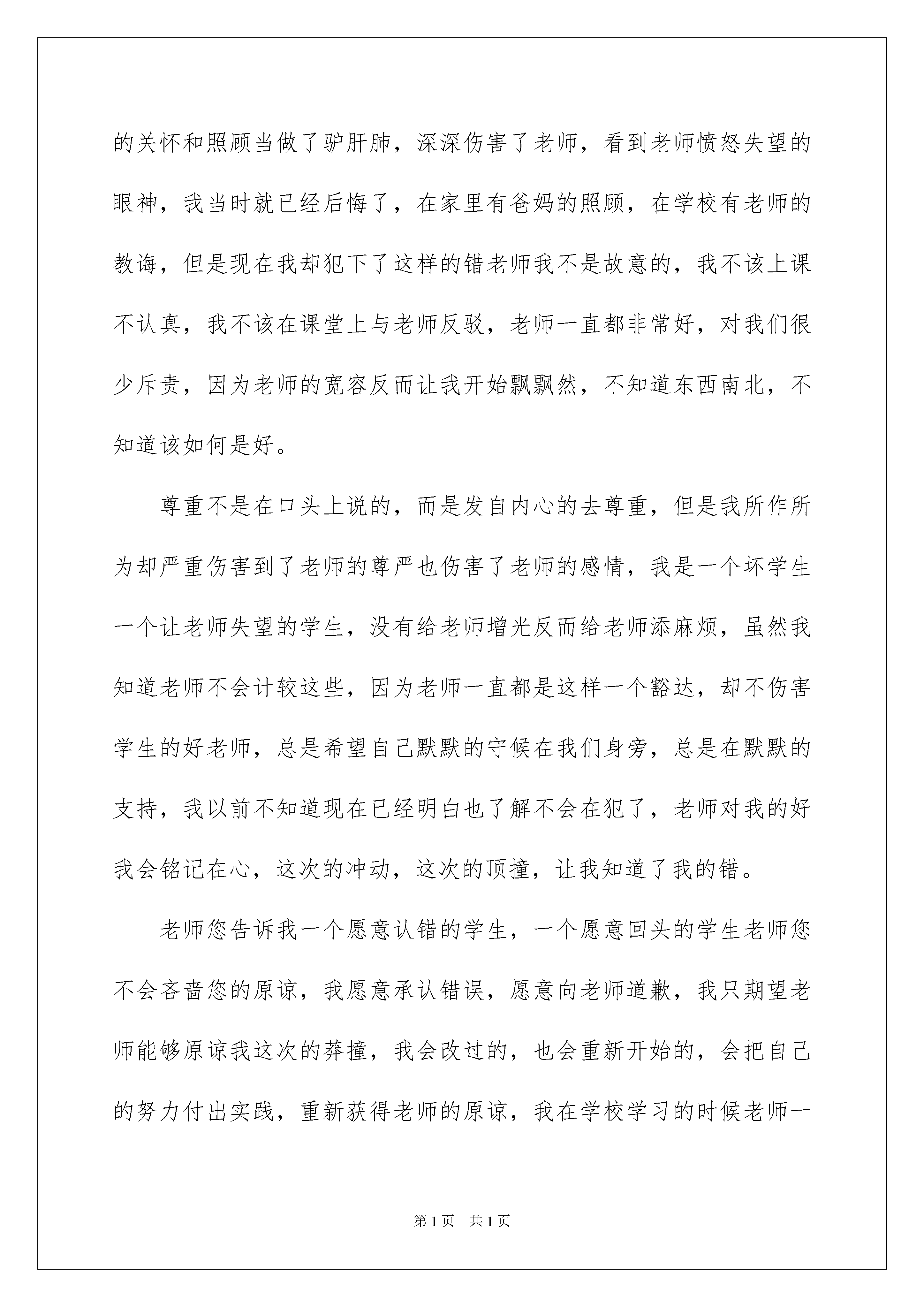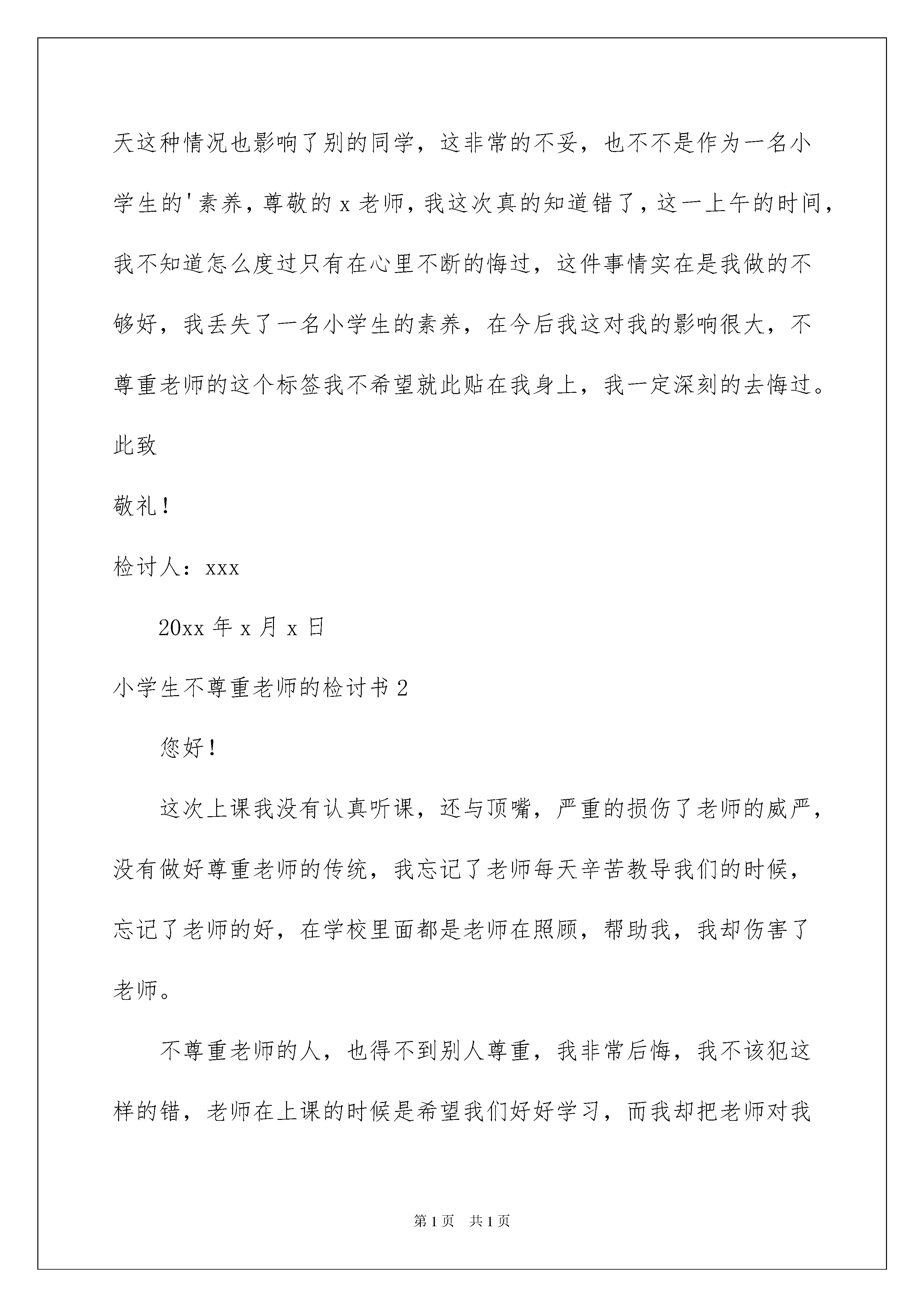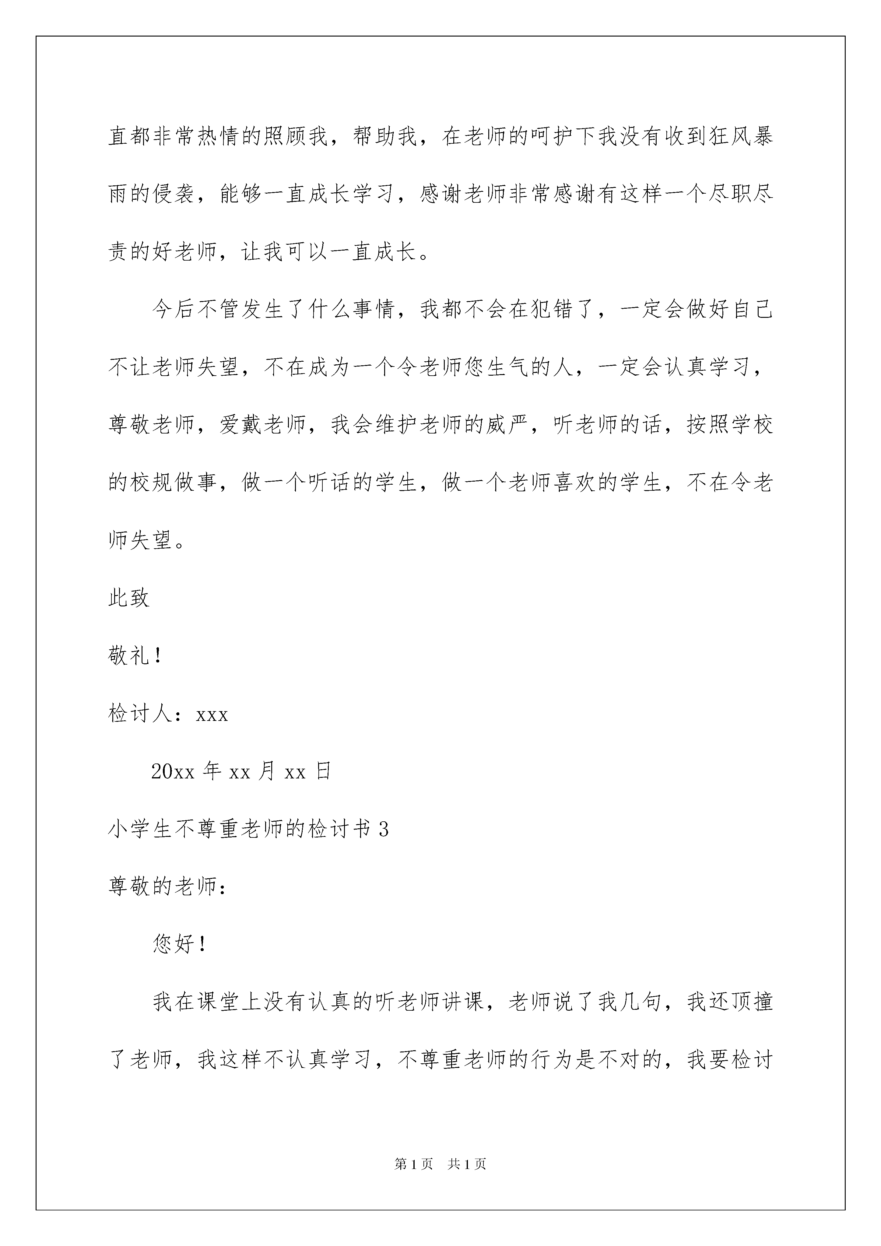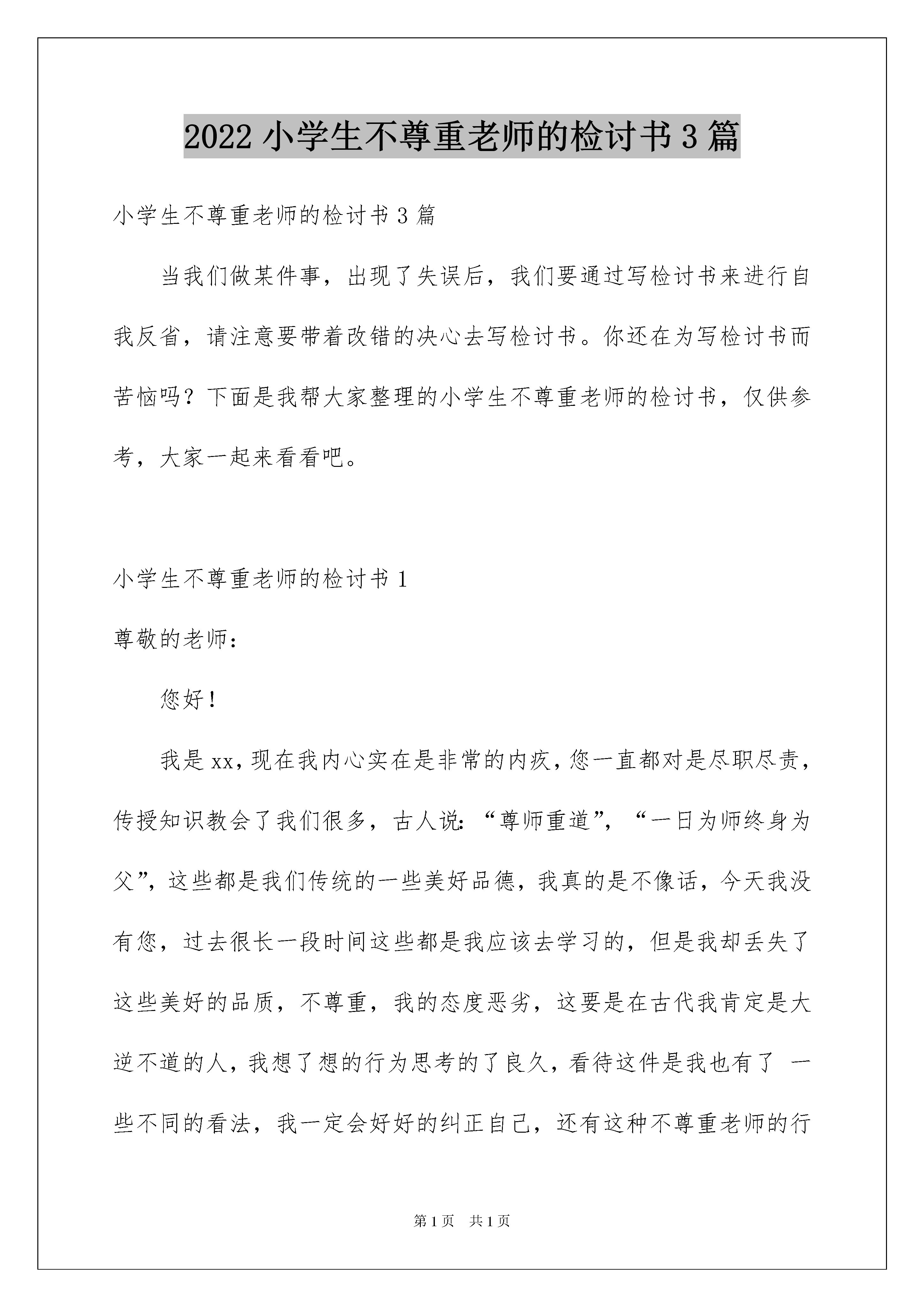 2022小学生不尊重老师的检讨书3篇小学生不尊重老师的检讨书3篇当我们做某件事,出现了失误后,我们要通过写检讨书来进行自我反省,请注意要带着改错的决心去写检讨书。你还在为写检讨书而苦恼吗?下面是我帮大家整理的小学生不尊重老师的检讨书,仅供参考,大家一起来看看吧。小学生不尊重老师的检讨书1尊敬的老师:您好!我是xx,现在我内心实在是非常的内疚,您一直都对是尽职尽责,传授知识教会了我们很多,古人说:“尊师重道”,“一日为师终身为父”,这些都是我们传统的一些美好品德,我真的是不像话,今天我没有您,过去很长一段时间这些都是我应该去学习的,但是我却丢失了这些美好的品质,不尊重,我的态度恶劣,这要是在古代我肯定是大逆不道的人,我想了想的行为思考的了良久,看待这件是我也有了一些不同的看法,我一定会好好的纠正自己,还有这种不尊重老师的行为,我一定杜绝。以后坚决不能再这么下去了,这肯定是是会出问题的,这不是我想看到的,我们传统的思想就是要尊师重道,这是老祖宗给我们留下的,对于我们每一个人来讲都有这很大的教育性,我会深刻反省自己的。今天在上课的时候,您在讲课而我却没有听,现在想了想事情的严重性,我真的感觉对不住您的教导,在今后的学习当中我不能让您失望了,这次事情就是对我的一个教训,以后继续发生这种事情肯定是不行的,您在上课的时候我在做我的事情,因为大家都在学习,您专门停下来讲我,这是耽误时间的,有的时候还要维持秩序,想了想自己对对待学习的态度,真的是不认真,未来再这么下去,肯定会出问题,我是一名学生,在学生当中要保证自己的学习,在学校就应该尊重老师,我不能辜负了您的教导,今天我上课不认真,在您说过之后我还不放在心上,这就是对您不尊重,现在想了想事情的严重性,还是很恶劣的。您教了我们知识,知识是宝贵的,我却没有尊重知识,上课时间也不长短短的45分钟,我却对自己不够坚定,一想起这些我就非常的自责,今后我再也不想继续这么发展下去了,不想再让您失望,想今天这种情况也影响了别的同学,这非常的不妥,也不不是作为一名小学生的'素养,尊敬的x老师,我这次真的知道错了,这一上午的时间,我不知道怎么度过只有在心里不断的悔过,这件事情实在是我做的不够好,我丢失了一名小学生的素养,在今后我这对我的影响很大,不尊重老师的这个标签我不希望就此贴在我身上,我一定深刻的去悔过。此致敬礼!检讨人:xxx20xx年x月x日小学生不尊重老师的检讨书2您好!这次上课我没有认真听课,还与顶嘴,严重的损伤了老师的威严,没有做好尊重老师的传统,我忘记了老师每天辛苦教导我们的时候,忘记了老师的好,在学校里面都是老师在照顾,帮助我,我却伤害了老师。不尊重老师的人,也得不到别人尊重,我非常后悔,我不该犯这样的错,老师在上课的时候是希望我们好好学习,而我却把老师对我的关怀和照顾当做了驴肝肺,深深伤害了老师,看到老师愤怒失望的眼神,我当时就已经后悔了,在家里有爸妈的照顾,在学校有老师的教诲,但是现在我却犯下了这样的错老师我不是故意的,我不该上课不认真,我不该在课堂上与老师反驳,老师一直都非常好,对我们很少斥责,因为老师的宽容反而让我开始飘飘然,不知道东西南北,不知道该如何是好。尊重不是在口头上说的,而是发自内心的去尊重,但是我所作所为却严重伤害到了老师的尊严也伤害了老师的感情,我是一个坏学生一个让老师失望的学生,没有给老师增光反而给老师添麻烦,虽然我知道老师不会计较这些,因为老师一直都是这样一个豁达,却不伤害学生的好老师,总是希望自己默默的守候在我们身旁,总是在默默的支持,我以前不知道现在已经明白也了解不会在犯了,老师对我的好我会铭记在心,这次的冲动,这次的顶撞,让我知道了我的错。老师您告诉我一个愿意认错的学生,一个愿意回头的学生老师您不会吝啬您的原谅,我愿意承认错误,愿意向老师道歉,我只期望老师能够原谅我这次的莽撞,我会改过的,也会重新开始的,会把自己的努力付出实践,重新获得老师的原谅,我在学校学习的时候老师一直都非常热情的照顾我,帮助我,在老师的呵护下我没有收到狂风暴雨的侵袭,能够一直成长学习,感谢老师非常感谢有这样一个尽职尽责的好老师,让我可以一直成长。今后不管发生了什么事情,我都不会在犯错了,一定会做好自己不让老师失望,不在成为一个令老师您生气的人,一定会认真学习,尊敬老师,爱戴老师,我会维护老师的威严,听老师的话,按照学校的校规做事,做一个听话的学生,做一个老师喜欢的学生,不在令老师失望。此致敬礼!检讨人:xxx20xx年xx月xx日小学生不尊重老师的检讨书3尊敬的老师:您好!我在课堂上没有认真的听老师讲课,老师说了我几句,我还顶撞了老