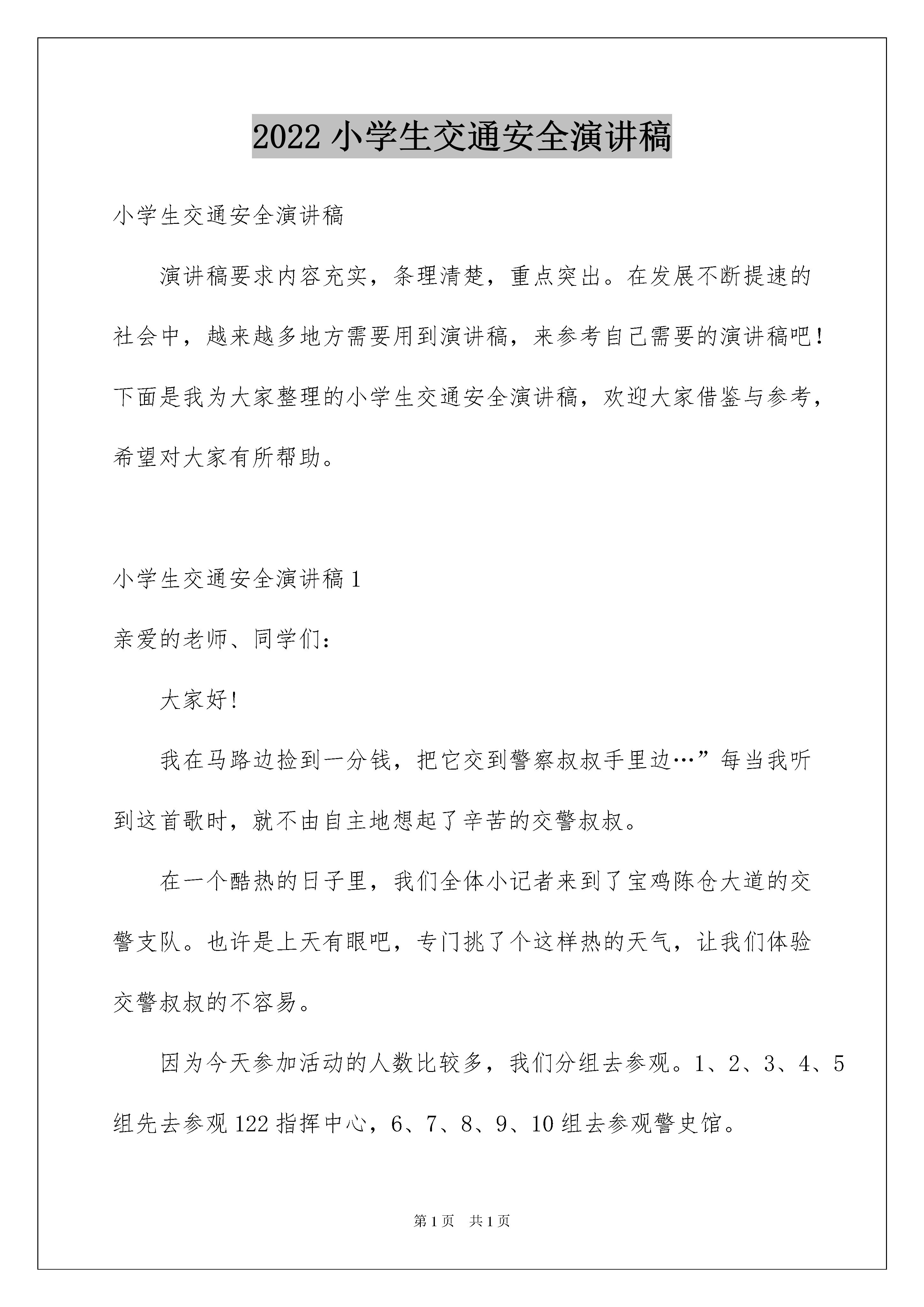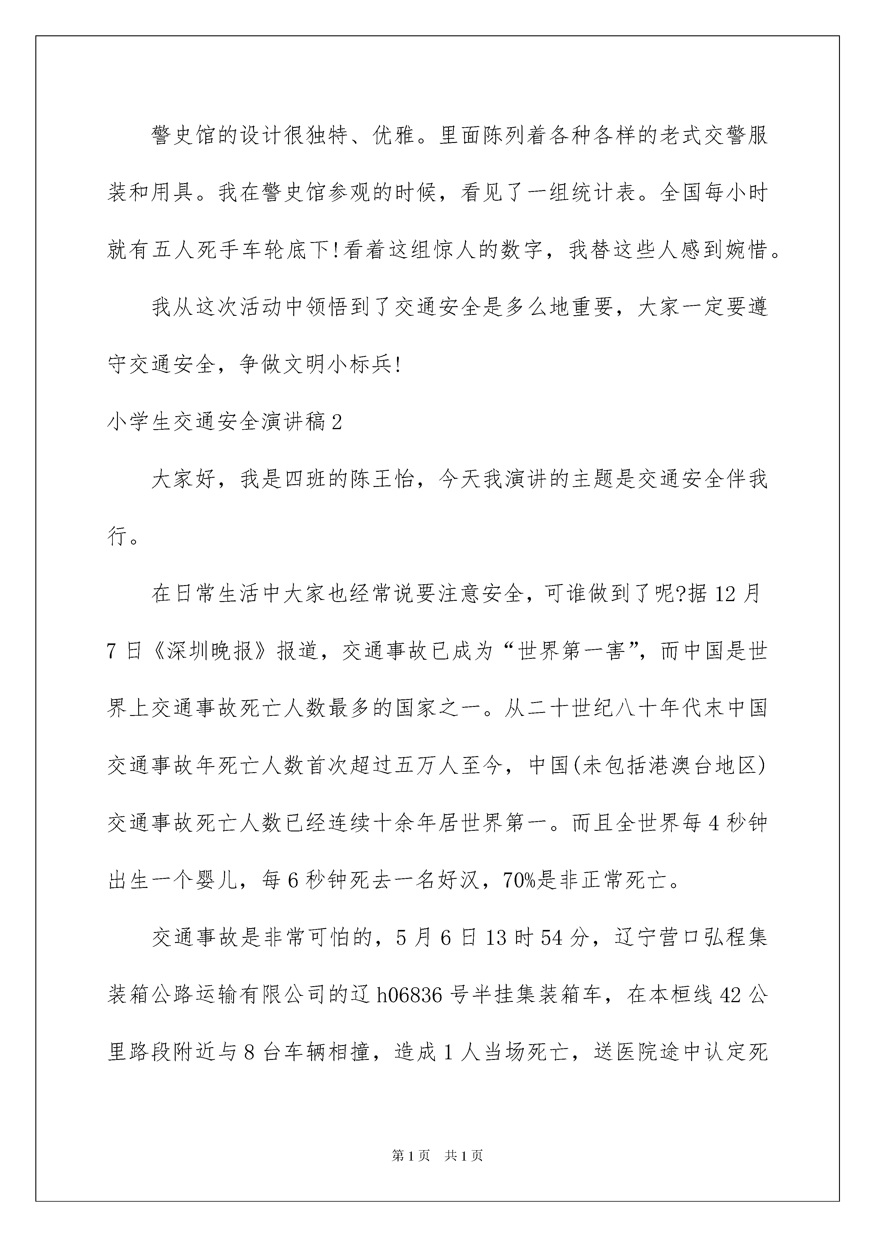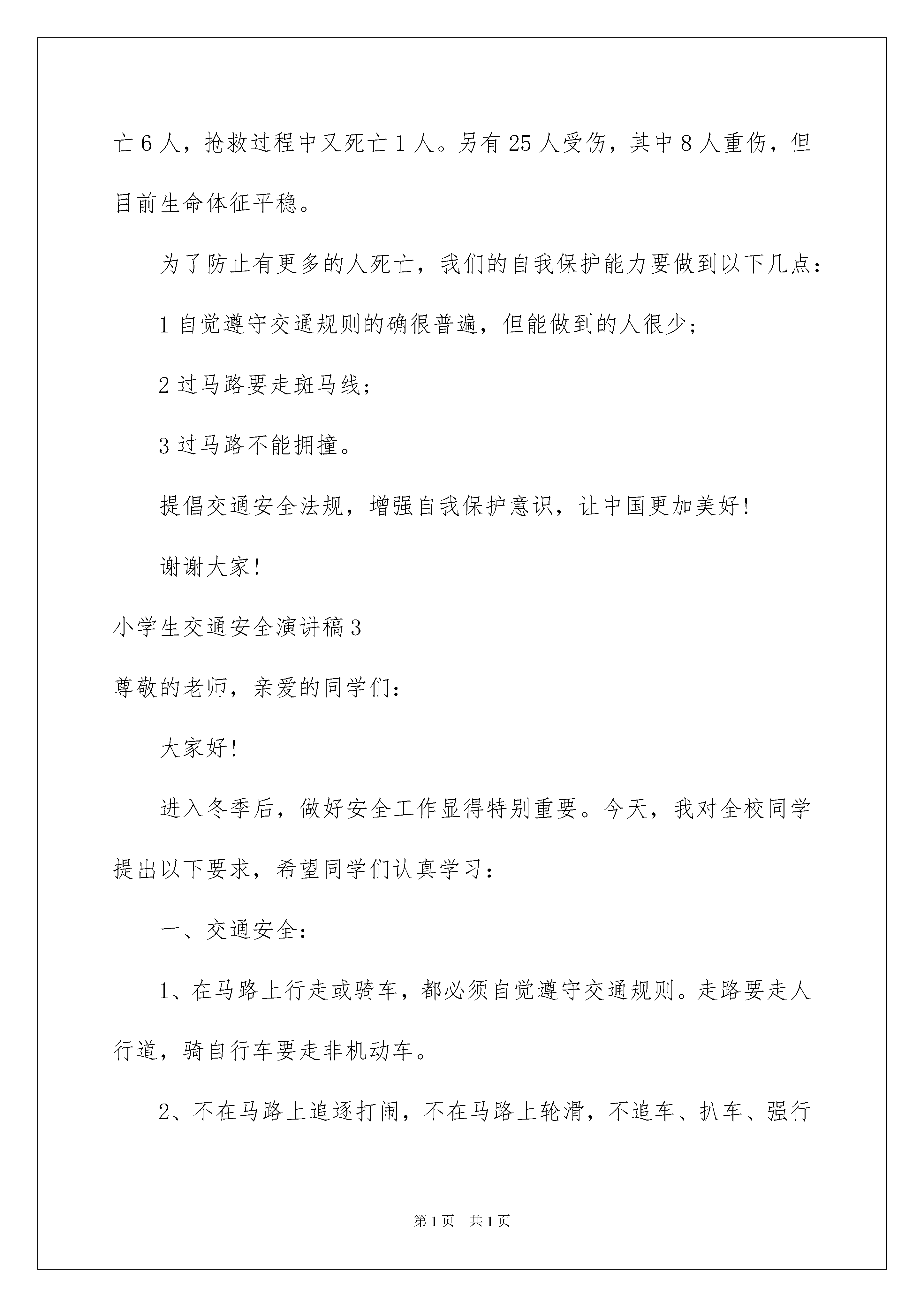 2022小学生交通安全演讲稿小学生交通安全演讲稿演讲稿要求内容充实,条理清楚,重点突出。在发展不断提速的社会中,越来越多地方需要用到演讲稿,来参考自己需要的演讲稿吧!下面是我为大家整理的小学生交通安全演讲稿,欢迎大家借鉴与参考,希望对大家有所帮助。小学生交通安全演讲稿1亲爱的老师、同学们:大家好!我在马路边捡到一分钱,把它交到警察叔叔手里边…”每当我听到这首歌时,就不由自主地想起了辛苦的交警叔叔。在一个酷热的日子里,我们全体小记者来到了宝鸡陈仓大道的交警支队。也许是上天有眼吧,专门挑了个这样热的天气,让我们体验交警叔叔的不容易。因为今天参加活动的人数比较多,我们分组去参观。1、2、3、4、5组先去参观122指挥中心,6、7、8、9、10组去参观警史馆。警史馆的设计很独特、优雅。里面陈列着各种各样的老式交警服装和用具。我在警史馆参观的时候,看见了一组统计表。全国每小时就有五人死手车轮底下!看着这组惊人的数字,我替这些人感到婉惜。我从这次活动中领悟到了交通安全是多么地重要,大家一定要遵守交通安全,争做文明小标兵!小学生交通安全演讲稿2大家好,我是四班的陈王怡,今天我演讲的主题是交通安全伴我行。在日常生活中大家也经常说要注意安全,可谁做到了呢?据12月7日《深圳晚报》报道,交通事故已成为“世界第一害”,而中国是世界上交通事故死亡人数最多的国家之一。从二十世纪八十年代末中国交通事故年死亡人数首次超过五万人至今,中国(未包括港澳台地区)交通事故死亡人数已经连续十余年居世界第一。而且全世界每4秒钟出生一个婴儿,每6秒钟死去一名好汉,70%是非正常死亡。交通事故是非常可怕的,5月6日13时54分,辽宁营口弘程集装箱公路运输有限公司的辽h06836号半挂集装箱车,在本桓线42公里路段附近与8台车辆相撞,造成1人当场死亡,送医院途中认定死亡6人,抢救过程中又死亡1人。另有25人受伤,其中8人重伤,但目前生命体征平稳。为了防止有更多的人死亡,我们的自我保护能力要做到以下几点:1自觉遵守交通规则的确很普遍,但能做到的人很少;2过马路要走斑马线;3过马路不能拥撞。提倡交通安全法规,增强自我保护意识,让中国更加美好!谢谢大家!小学生交通安全演讲稿3尊敬的老师,亲爱的同学们:大家好!进入冬季后,做好安全工作显得特别重要。今天,我对全校同学提出以下要求,希望同学们认真学习:一、交通安全:1、在马路上行走或骑车,都必须自觉遵守交通规则。走路要走人行道,骑自行车要走非机动车。2、不在马路上追逐打闹,不在马路上轮滑,不追车、扒车、强行拦车。3、乘坐公交车,一定要在车停稳之后,再上车、下车。不乘坐无牌、无营运证、超载的车辆。4、车辆行驶中,不要将头、手、身体伸出窗外。二、活动安全:1、不到禁止靠近的地方做游戏,不做危险的游戏。2、外出玩耍要告知父母和谁玩,玩什么,在哪儿玩,什么时候回家。3、集体活动时,遇到拥挤,要沉着冷静,保护好头、胸、腹部不被挤压。三、防火安全:1、不将火柴、打火机当作玩具,也不烧东西玩。2、家用电器必须在家长的指导下正确使用。低年级学生禁止单独使用这些电器,不超负荷用电,不乱接电线,不乱动插座、电器开关。3、常见的灭火方法:用水灭火、用东西盖住灭火、用沙灭火。遇到不可控制的火势要及时逃生和报警。四、用电安全:1、不用手、金属物或铅笔芯等东西去拨弄开关,也不要把它们插到插座孔里。喝水或饮料时不要在插座附近喝,以免水或饮料洒到插孔里,造成电器短路、着火。2、在户外玩耍时,要远离高压输电设备及配电室之类的地方。不要在高压线附近放风筝,不要到配电室附近去玩。3、不要在电线上面搭挂、晾晒衣物,以免发生危险。4、发现有人触电,在救助触电者时,首先要切断电源。在切断电源之前,千万不要用手去拉触电者,否则救助者也会触电。5、遇到触电者应及早叫大人来处理,并打“120”急救电话,让医生来救护。五、饮食安全:1、不到小摊上买“三无”食品,不吃过期、变质的食品。2、不喝酒精类饮料六、上网安全:正确利用网络学习,不痴迷上网、痴迷游戏,不去营业性的娱乐场所玩耍(包括网吧、游戏机房、室等)。提高自我保护意识,远离网络危险!七、自我保护:1、在家遇生人,不要轻易开门。如不速之客来访时,要先查明身份再开门。如果不能确定身份,就打电话向父母询问,或求助邻居。2、不要接受陌生人食品,不接受陌生人的邀请去看展览、拍电影、做广告等,更不能到陌生人家里去玩。3、如遇问路者,可以告之大概方向,但不能应其要求带其前往。一旦发现有陌生人尾随或是不停纠缠,应迅速走向人多的地方,或是寻找街头民警的帮助。4、如果在路上遭坏人抢劫,不要冒失地