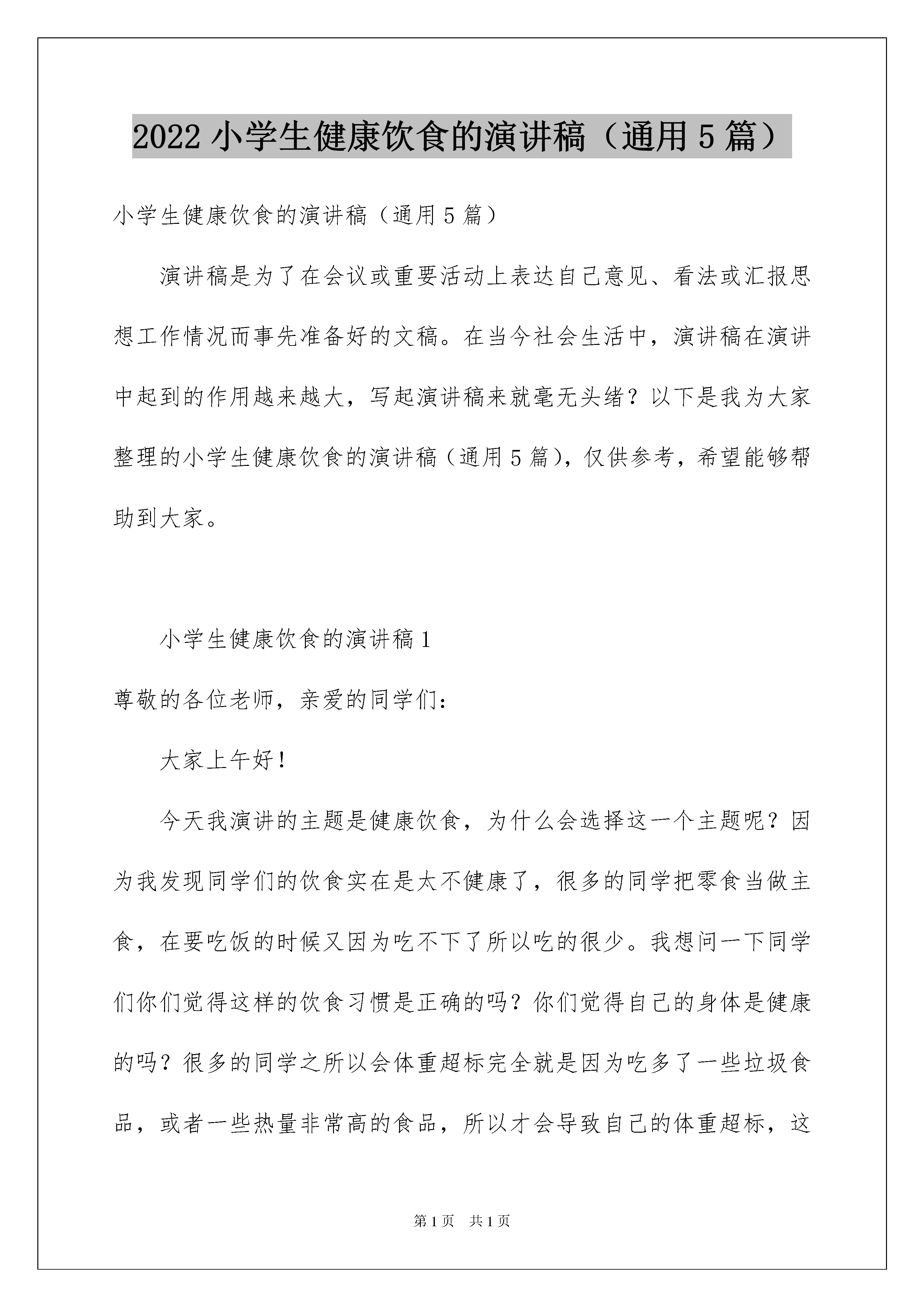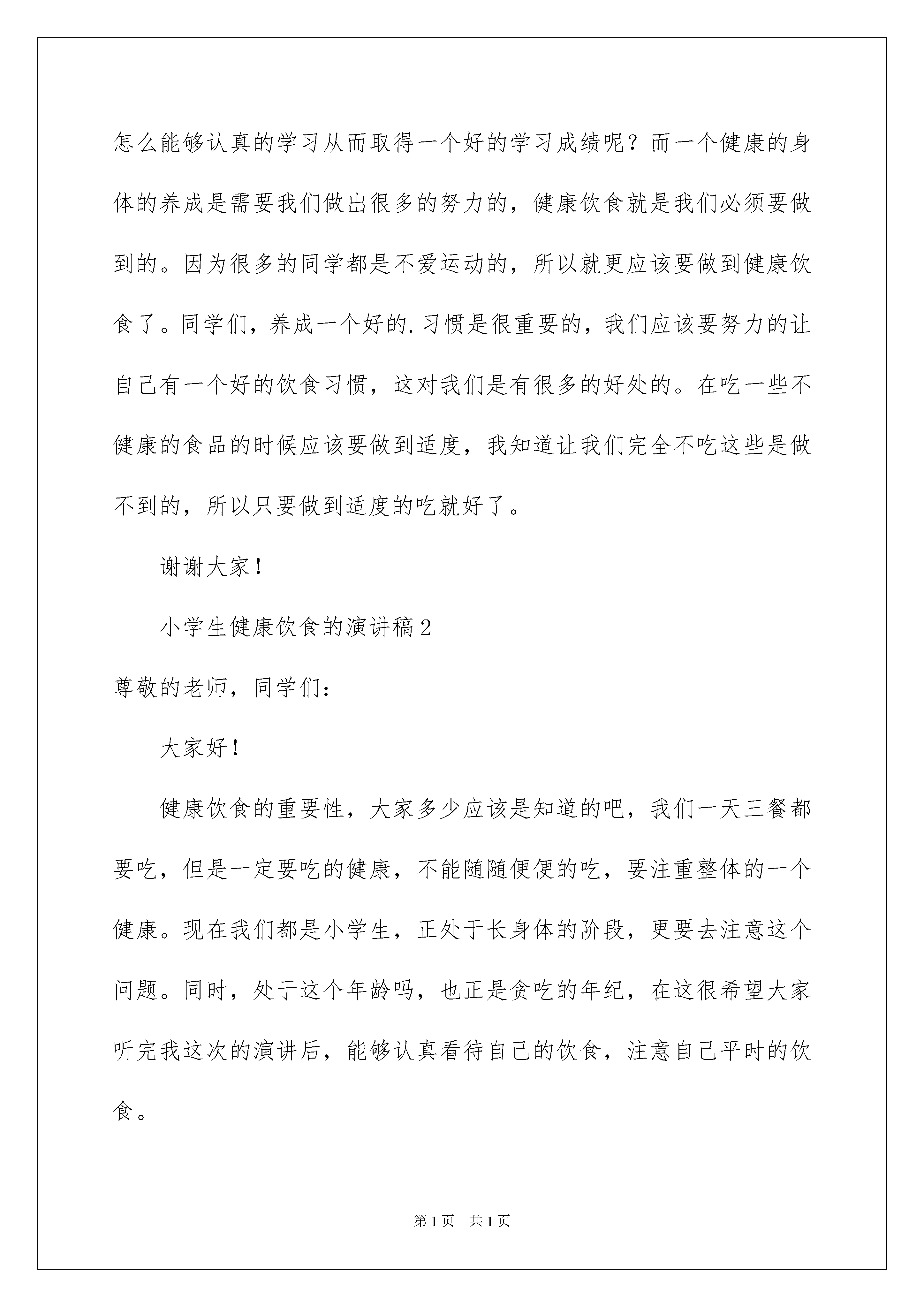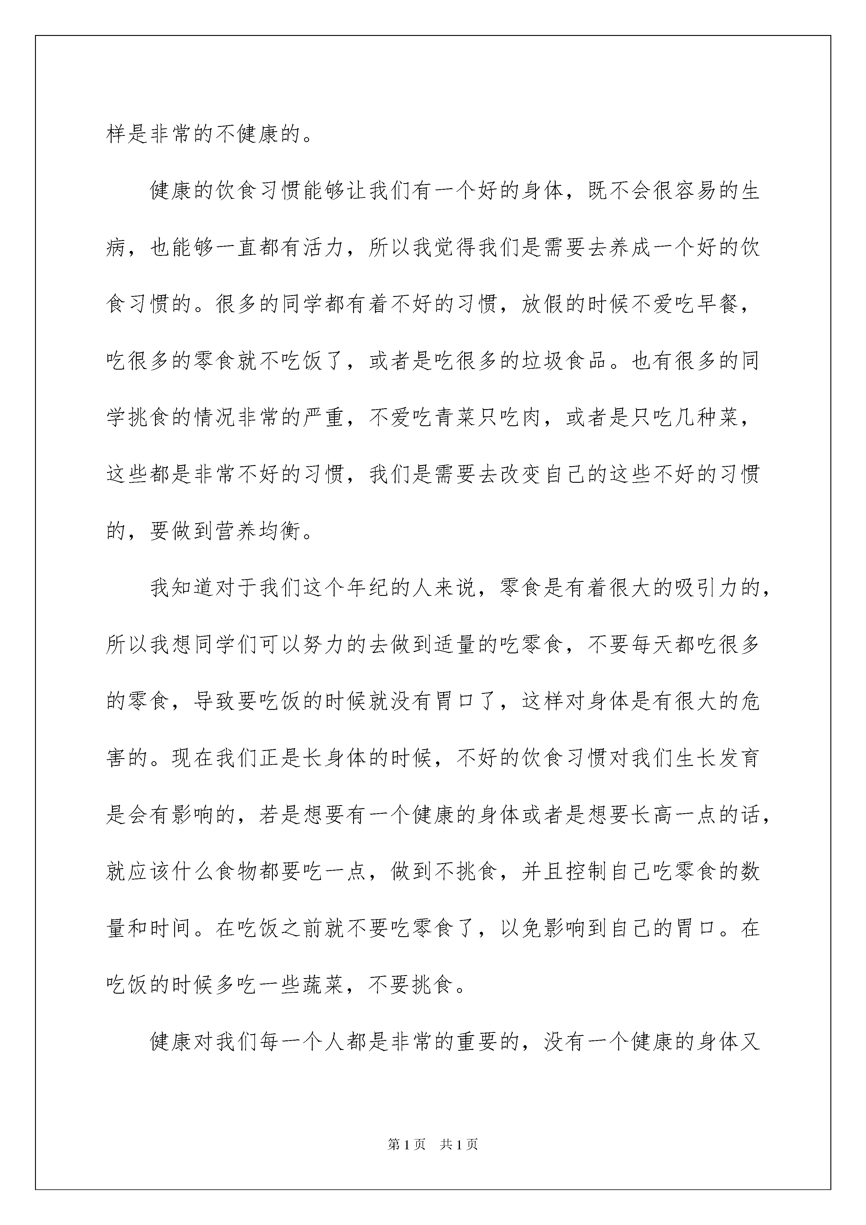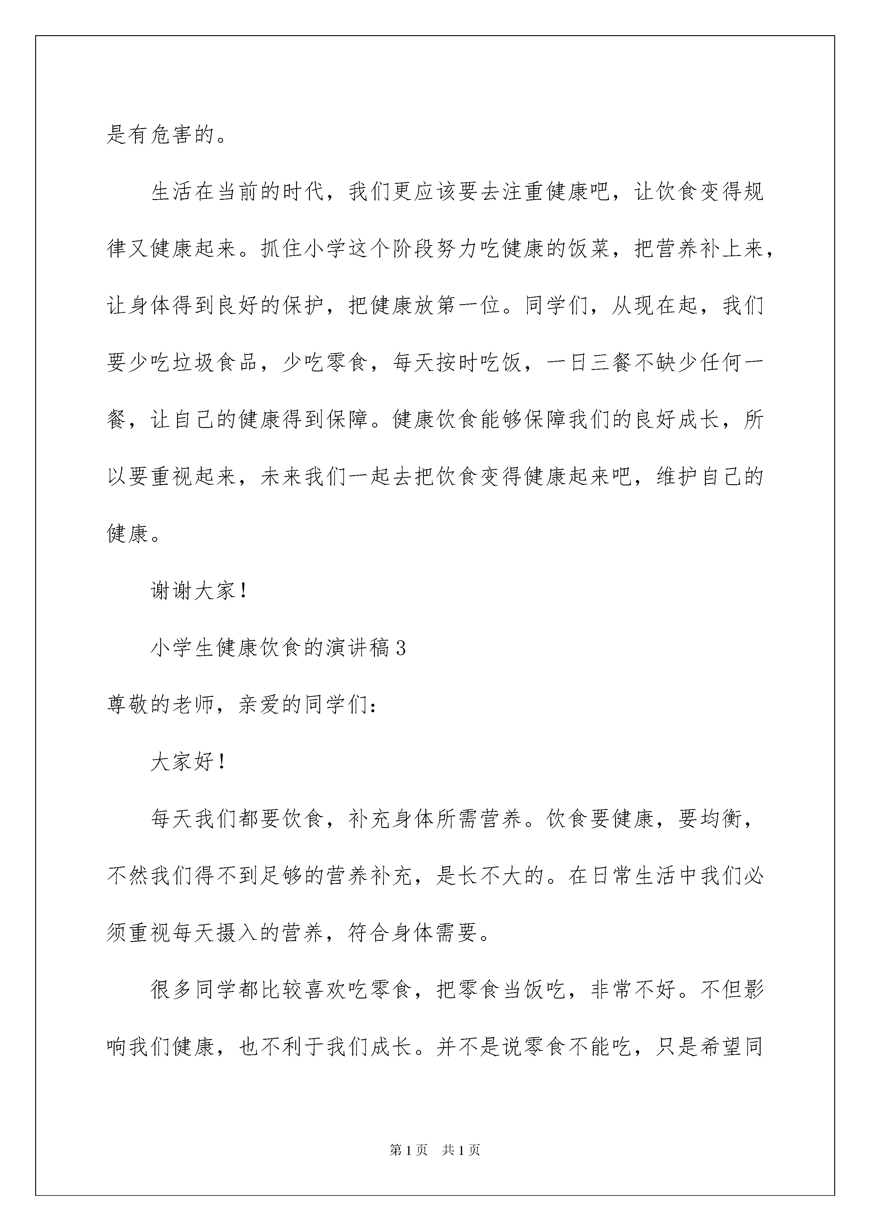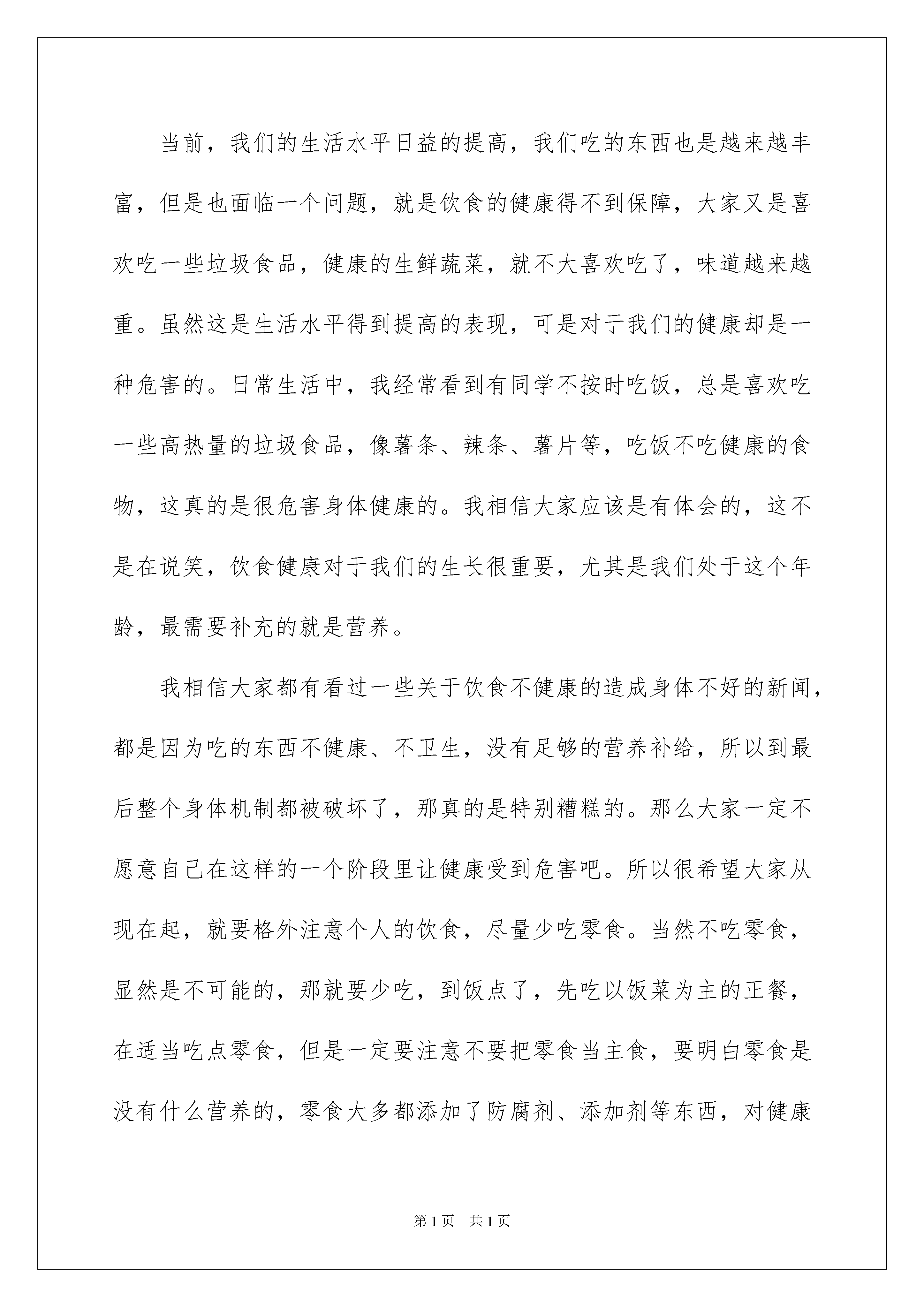 2022小学生健康饮食的演讲稿(通用5篇)小学生健康饮食的演讲稿(通用5篇)演讲稿是为了在会议或重要活动上表达自己意见、看法或汇报思想工作情况而事先准备好的文稿。在当今社会生活中,演讲稿在演讲中起到的作用越来越大,写起演讲稿来就毫无头绪?以下是我为大家整理的小学生健康饮食的演讲稿(通用5篇),仅供参考,希望能够帮助到大家。小学生健康饮食的演讲稿1尊敬的各位老师,亲爱的同学们:大家上午好!今天我演讲的主题是健康饮食,为什么会选择这一个主题呢?因为我发现同学们的饮食实在是太不健康了,很多的同学把零食当做主食,在要吃饭的时候又因为吃不下了所以吃的很少。我想问一下同学们你们觉得这样的饮食习惯是正确的吗?你们觉得自己的身体是健康的吗?很多的同学之所以会体重超标完全就是因为吃多了一些垃圾食品,或者一些热量非常高的食品,所以才会导致自己的体重超标,这样是非常的不健康的。健康的饮食习惯能够让我们有一个好的身体,既不会很容易的生病,也能够一直都有活力,所以我觉得我们是需要去养成一个好的饮食习惯的。很多的同学都有着不好的习惯,放假的时候不爱吃早餐,吃很多的零食就不吃饭了,或者是吃很多的垃圾食品。也有很多的同学挑食的情况非常的严重,不爱吃青菜只吃肉,或者是只吃几种菜,这些都是非常不好的习惯,我们是需要去改变自己的这些不好的习惯的,要做到营养均衡。我知道对于我们这个年纪的人来说,零食是有着很大的吸引力的,所以我想同学们可以努力的去做到适量的吃零食,不要每天都吃很多的零食,导致要吃饭的时候就没有胃口了,这样对身体是有很大的危害的。现在我们正是长身体的时候,不好的饮食习惯对我们生长发育是会有影响的,若是想要有一个健康的身体或者是想要长高一点的话,就应该什么食物都要吃一点,做到不挑食,并且控制自己吃零食的数量和时间。在吃饭之前就不要吃零食了,以免影响到自己的胃口。在吃饭的时候多吃一些蔬菜,不要挑食。健康对我们每一个人都是非常的重要的,没有一个健康的身体又怎么能够认真的学习从而取得一个好的学习成绩呢?而一个健康的身体的养成是需要我们做出很多的努力的,健康饮食就是我们必须要做到的。因为很多的同学都是不爱运动的,所以就更应该要做到健康饮食了。同学们,养成一个好的.习惯是很重要的,我们应该要努力的让自己有一个好的饮食习惯,这对我们是有很多的好处的。在吃一些不健康的食品的时候应该要做到适度,我知道让我们完全不吃这些是做不到的,所以只要做到适度的吃就好了。谢谢大家!小学生健康饮食的演讲稿2尊敬的老师,同学们:大家好!健康饮食的重要性,大家多少应该是知道的吧,我们一天三餐都要吃,但是一定要吃的健康,不能随随便便的吃,要注重整体的一个健康。现在我们都是小学生,正处于长身体的阶段,更要去注意这个问题。同时,处于这个年龄吗,也正是贪吃的年纪,在这很希望大家听完我这次的演讲后,能够认真看待自己的饮食,注意自己平时的饮食。当前,我们的生活水平日益的提高,我们吃的东西也是越来越丰富,但是也面临一个问题,就是饮食的健康得不到保障,大家又是喜欢吃一些垃圾食品,健康的生鲜蔬菜,就不大喜欢吃了,味道越来越重。虽然这是生活水平得到提高的表现,可是对于我们的健康却是一种危害的。日常生活中,我经常看到有同学不按时吃饭,总是喜欢吃一些高热量的垃圾食品,像薯条、辣条、薯片等,吃饭不吃健康的食物,这真的是很危害身体健康的。我相信大家应该是有体会的,这不是在说笑,饮食健康对于我们的生长很重要,尤其是我们处于这个年龄,最需要补充的就是营养。我相信大家都有看过一些关于饮食不健康的造成身体不好的新闻,都是因为吃的东西不健康、不卫生,没有足够的营养补给,所以到最后整个身体机制都被破坏了,那真的是特别糟糕的。那么大家一定不愿意自己在这样的一个阶段里让健康受到危害吧。所以很希望大家从现在起,就要格外注意个人的饮食,尽量少吃零食。当然不吃零食,显然是不可能的,那就要少吃,到饭点了,先吃以饭菜为主的正餐,在适当吃点零食,但是一定要注意不要把零食当主食,要明白零食是没有什么营养的,零食大多都添加了防腐剂、添加剂等东西,对健康是有危害的。生活在当前的时代,我们更应该要去注重健康吧,让饮食变得规律又健康起来。抓住小学这个阶段努力吃健康的饭菜,把营养补上来,让身体得到良好的保护,把健康放第一位。同学们,从现在起,我们要少吃垃圾食品,少吃零食,每天按时吃饭,一日三餐不缺少任何一餐,让自己的健康得到保障。健康饮食能够保障我们的良好成长,所以要重视起来,未来我们一起去把饮食变得健康起来吧,维护自己的健康。谢谢大家!小学生健康饮食的演讲稿3尊敬的老师,亲爱的同学们:大家好!每天我