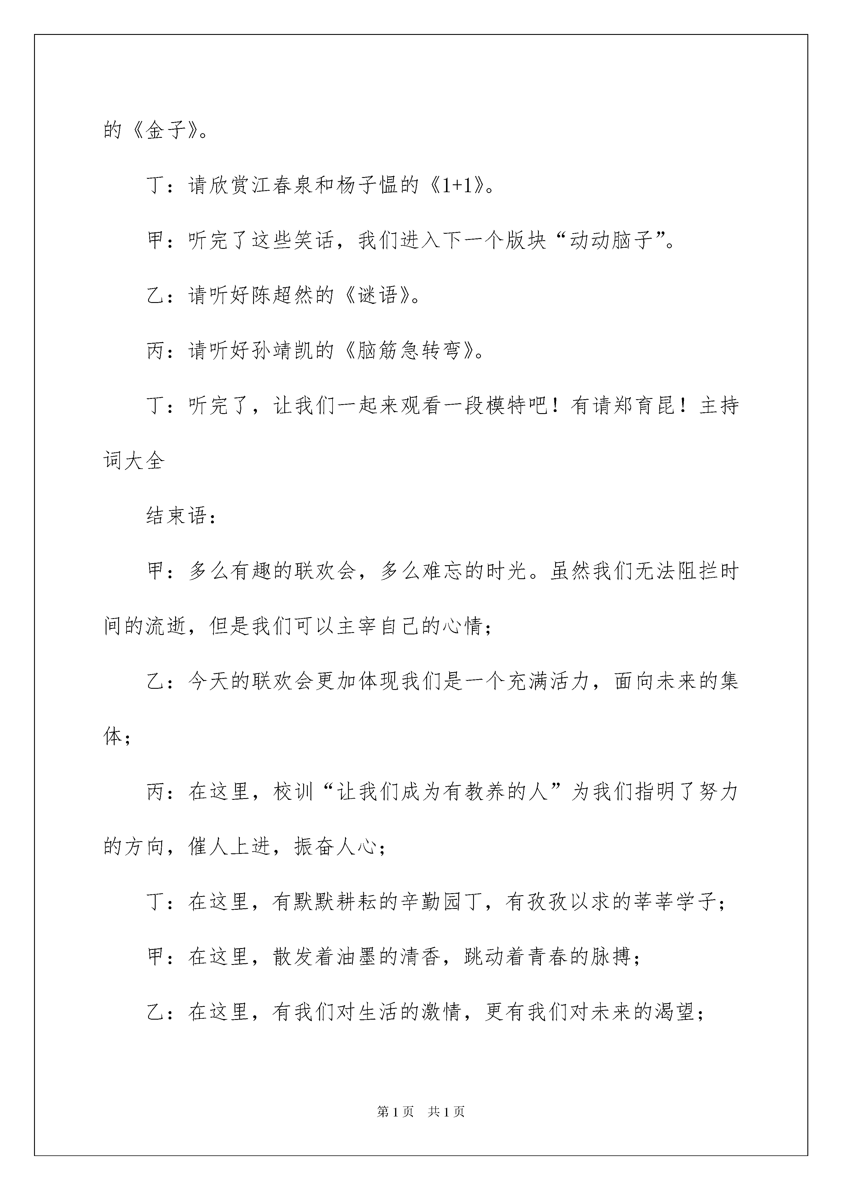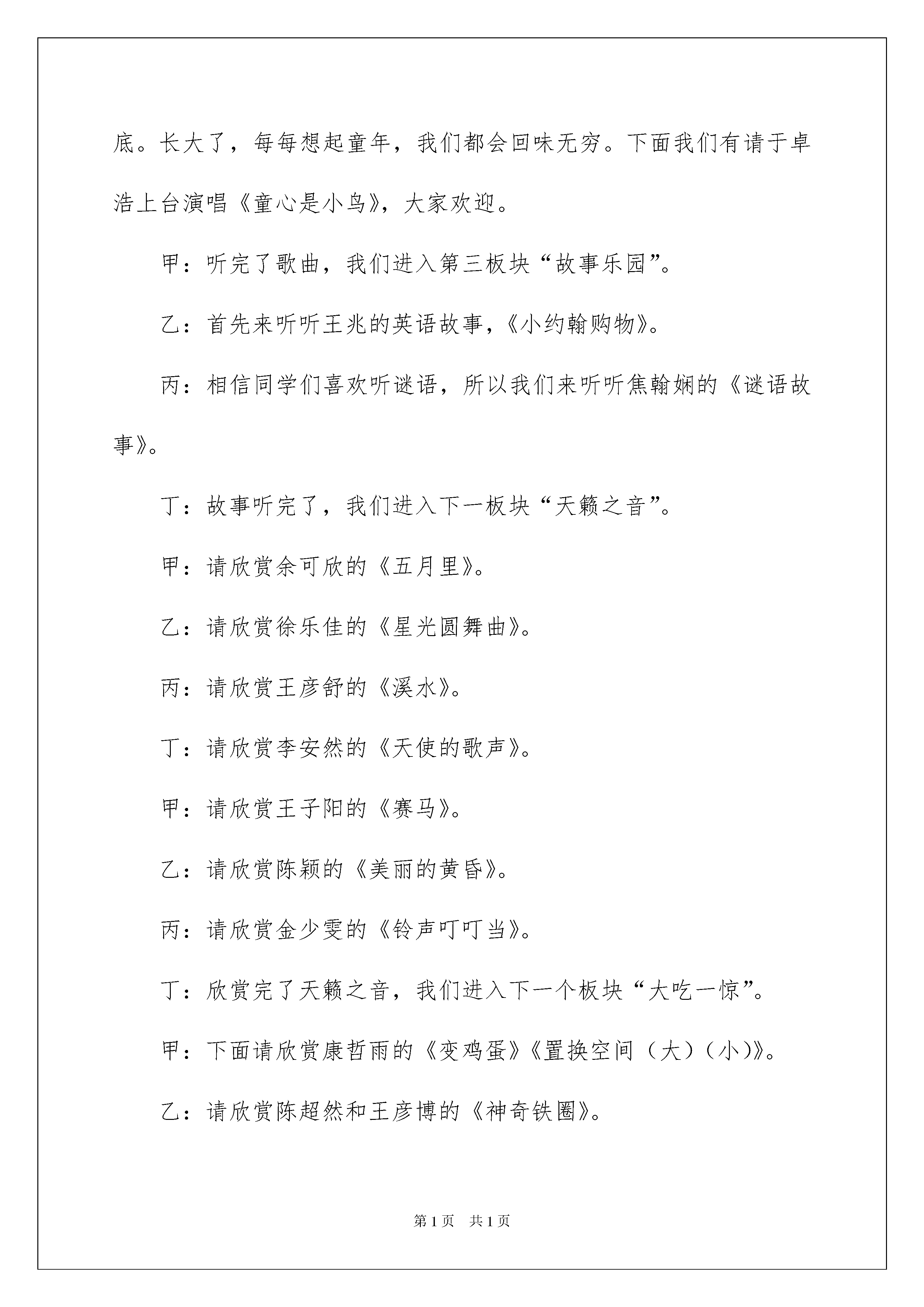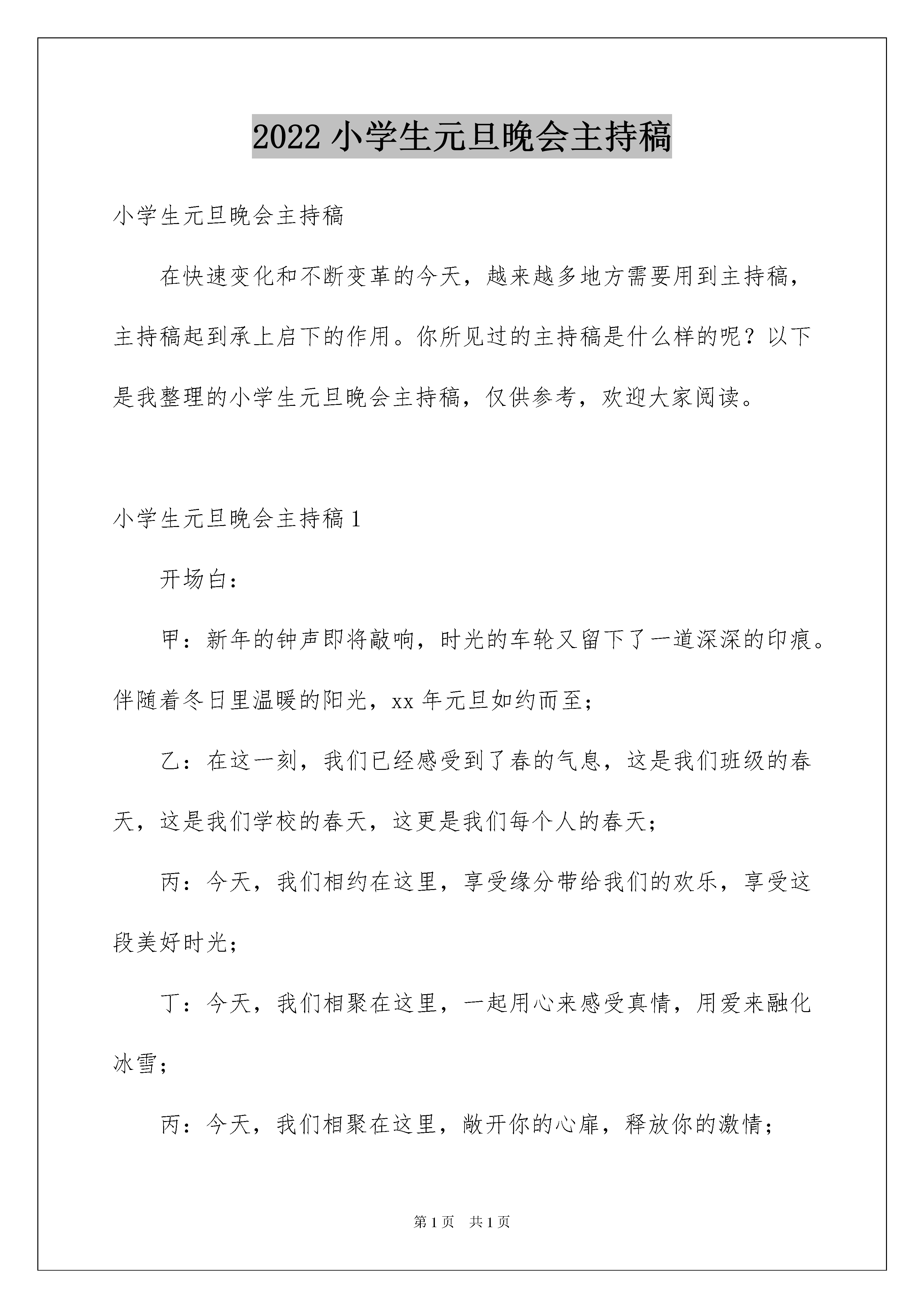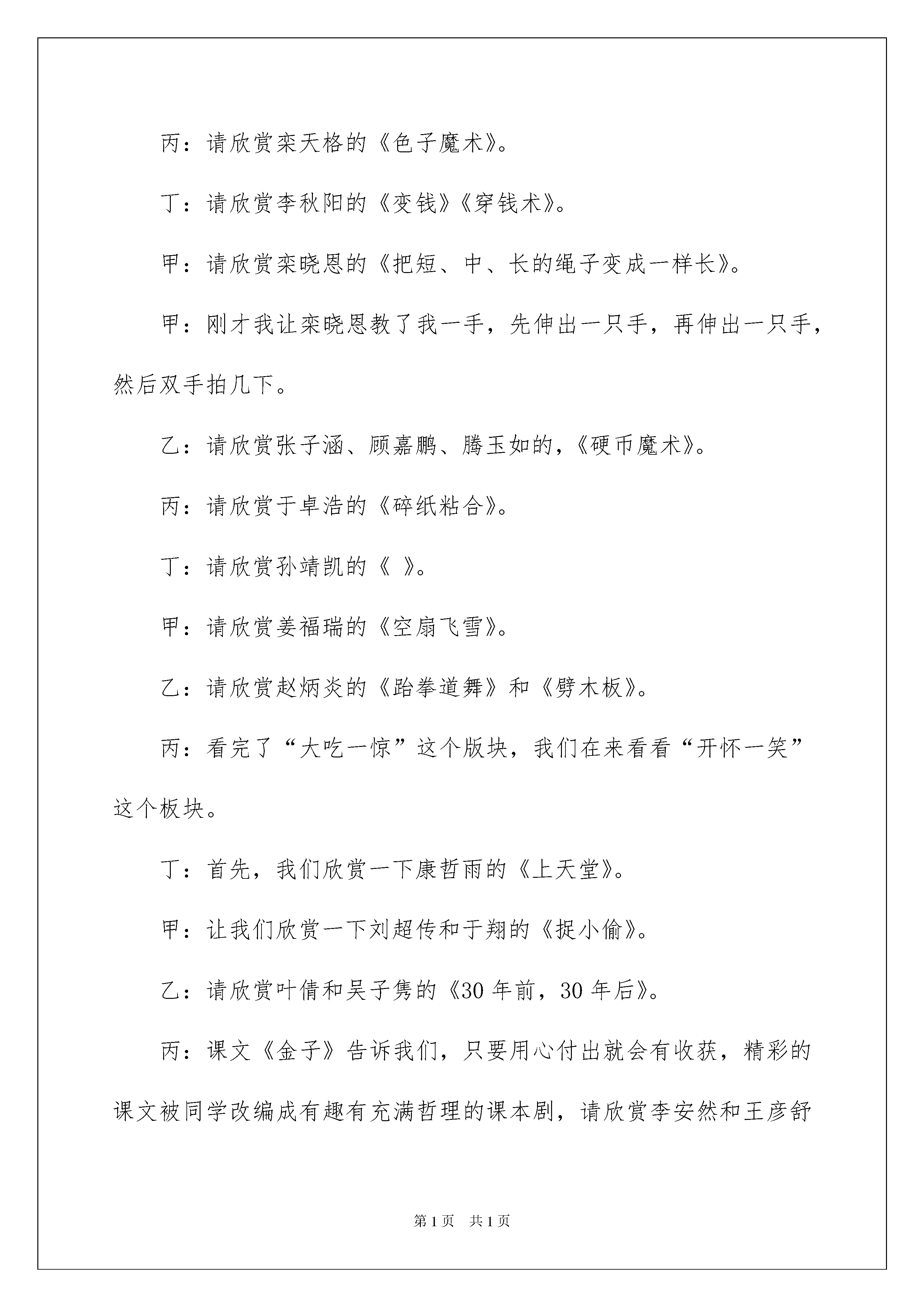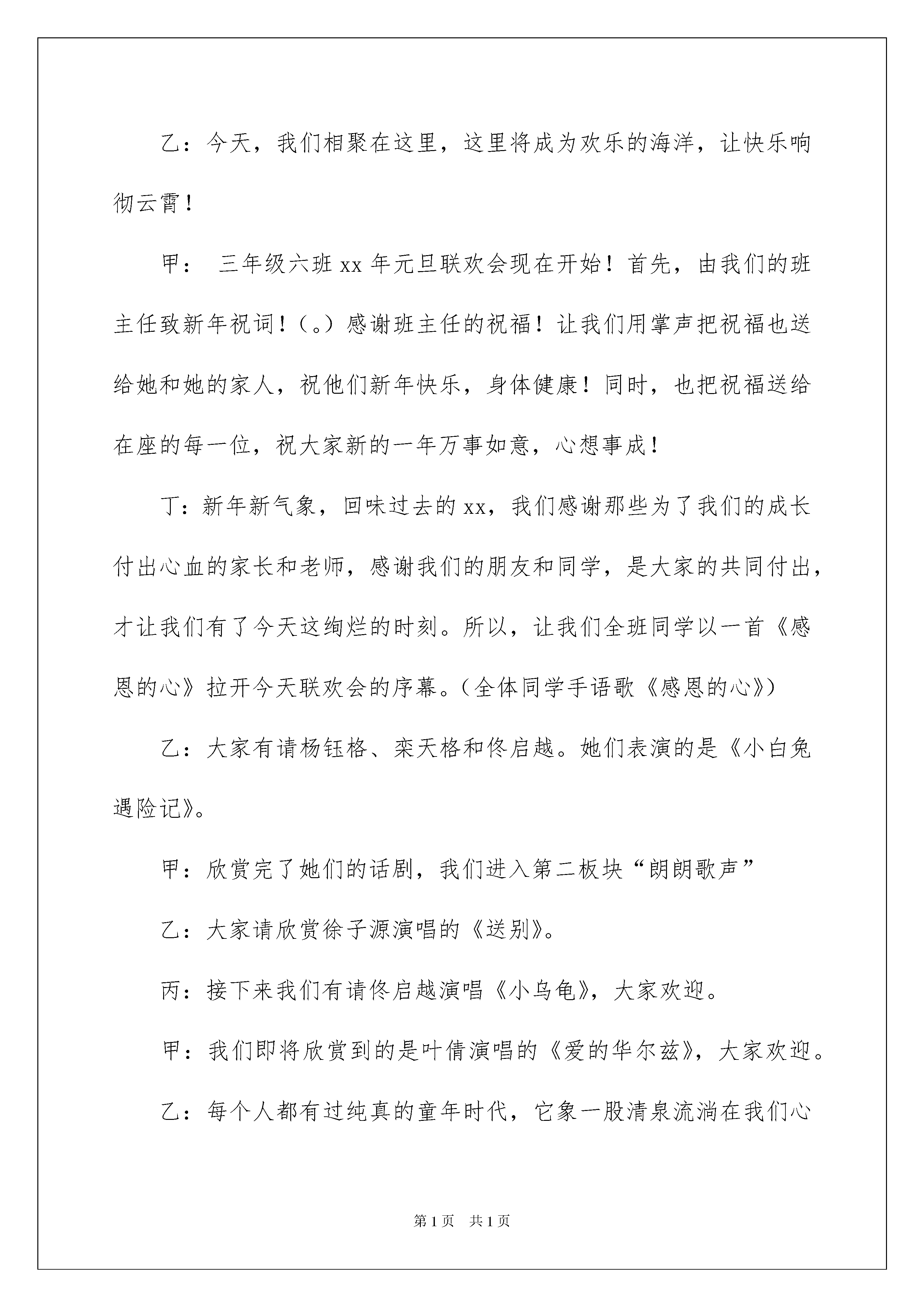 2022小学生元旦晚会主持稿小学生元旦晚会主持稿在快速变化和不断变革的今天,越来越多地方需要用到主持稿,主持稿起到承上启下的作用。你所见过的主持稿是什么样的呢?以下是我整理的小学生元旦晚会主持稿,仅供参考,欢迎大家阅读。小学生元旦晚会主持稿1开场白:甲:新年的钟声即将敲响,时光的车轮又留下了一道深深的印痕。伴随着冬日里温暖的阳光,xx年元旦如约而至;乙:在这一刻,我们已经感受到了春的气息,这是我们班级的春天,这是我们学校的春天,这更是我们每个人的春天;丙:今天,我们相约在这里,享受缘分带给我们的欢乐,享受这段美好时光;丁:今天,我们相聚在这里,一起用心来感受真情,用爱来融化冰雪;丙:今天,我们相聚在这里,敞开你的心扉,释放你的激情;乙:今天,我们相聚在这里,这里将成为欢乐的海洋,让快乐响彻云霄!甲:三年级六班xx年元旦联欢会现在开始!首先,由我们的班主任致新年祝词!(。)感谢班主任的祝福!让我们用掌声把祝福也送给她和她的家人,祝他们新年快乐,身体健康!同时,也把祝福送给在座的每一位,祝大家新的一年万事如意,心想事成!丁:新年新气象,回味过去的xx,我们感谢那些为了我们的成长付出心血的家长和老师,感谢我们的朋友和同学,是大家的共同付出,才让我们有了今天这绚烂的时刻。所以,让我们全班同学以一首《感恩的心》拉开今天联欢会的序幕。(全体同学手语歌《感恩的心》)乙:大家有请杨钰格、栾天格和佟启越。她们表演的是《小白兔遇险记》。甲:欣赏完了她们的话剧,我们进入第二板块“朗朗歌声”乙:大家请欣赏徐子源演唱的《送别》。丙:接下来我们有请佟启越演唱《小乌龟》,大家欢迎。甲:我们即将欣赏到的是叶倩演唱的《爱的华尔兹》,大家欢迎。乙:每个人都有过纯真的童年时代,它象一股清泉流淌在我们心底。长大了,每每想起童年,我们都会回味无穷。下面我们有请于卓浩上台演唱《童心是小鸟》,大家欢迎。甲:听完了歌曲,我们进入第三板块“故事乐园”。乙:首先来听听王兆的英语故事,《小约翰购物》。丙:相信同学们喜欢听谜语,所以我们来听听焦翰娴的《谜语故事》。丁:故事听完了,我们进入下一板块“天籁之音”。甲:请欣赏余可欣的《五月里》。乙:请欣赏徐乐佳的《星光圆舞曲》。丙:请欣赏王彦舒的《溪水》。丁:请欣赏李安然的《天使的歌声》。甲:请欣赏王子阳的《赛马》。乙:请欣赏陈颖的《美丽的黄昏》。丙:请欣赏金少雯的《铃声叮叮当》。丁:欣赏完了天籁之音,我们进入下一个板块“大吃一惊”。甲:下面请欣赏康哲雨的《变鸡蛋》《置换空间(大)(小)》。乙:请欣赏陈超然和王彦博的《神奇铁圈》。丙:请欣赏栾天格的《色子魔术》。丁:请欣赏李秋阳的《变钱》《穿钱术》。甲:请欣赏栾晓恩的《把短、中、长的绳子变成一样长》。甲:刚才我让栾晓恩教了我一手,先伸出一只手,再伸出一只手,然后双手拍几下。乙:请欣赏张子涵、顾嘉鹏、腾玉如的,《硬币魔术》。丙:请欣赏于卓浩的《碎纸粘合》。丁:请欣赏孙靖凯的《》。甲:请欣赏姜福瑞的《空扇飞雪》。乙:请欣赏赵炳炎的《跆拳道舞》和《劈木板》。丙:看完了“大吃一惊”这个版块,我们在来看看“开怀一笑”这个板块。丁:首先,我们欣赏一下康哲雨的《上天堂》。甲:让我们欣赏一下刘超传和于翔的《捉小偷》。乙:请欣赏叶倩和吴子隽的《30年前,30年后》。丙:课文《金子》告诉我们,只要用心付出就会有收获,精彩的课文被同学改编成有趣有充满哲理的课本剧,请欣赏李安然和王彦舒的《金子》。丁:请欣赏江春泉和杨子愠的《1+1》。甲:听完了这些笑话,我们进入下一个版块“动动脑子”。乙:请听好陈超然的《谜语》。丙:请听好孙靖凯的《脑筋急转弯》。丁:听完了,让我们一起来观看一段模特吧!有请郑育昆!主持词大全结束语:甲:多么有趣的联欢会,多么难忘的时光。虽然我们无法阻拦时间的流逝,但是我们可以主宰自己的心情;乙:今天的联欢会更加体现我们是一个充满活力,面向未来的集体;丙:在这里,校训“让我们成为有教养的人”为我们指明了努力的方向,催人上进,振奋人心;丁:在这里,有默默耕耘的辛勤园丁,有孜孜以求的莘莘学子;甲:在这里,散发着油墨的清香,跳动着青春的脉搏;乙:在这里,有我们对生活的激情,更有我们对未来的渴望;合:因为,我们始终相信:明天会更好。小学生元旦晚会主持稿2丙:(译:)我们的心儿像怒放的花朵,荡起一片欢乐的海洋。甲:(译:)新年的脸红了;乙:(译:)新年的心飞了;丙:(译:)春的脚步近了;甲:(译:)春的`身段也婀娜了;乙:(译:)新年拉近了我们成长的距离;丙:(译:)新年染红了我们快乐的生活;甲:(译:)新年让我们截取下了四季的片段;乙:(译:)新年给了
