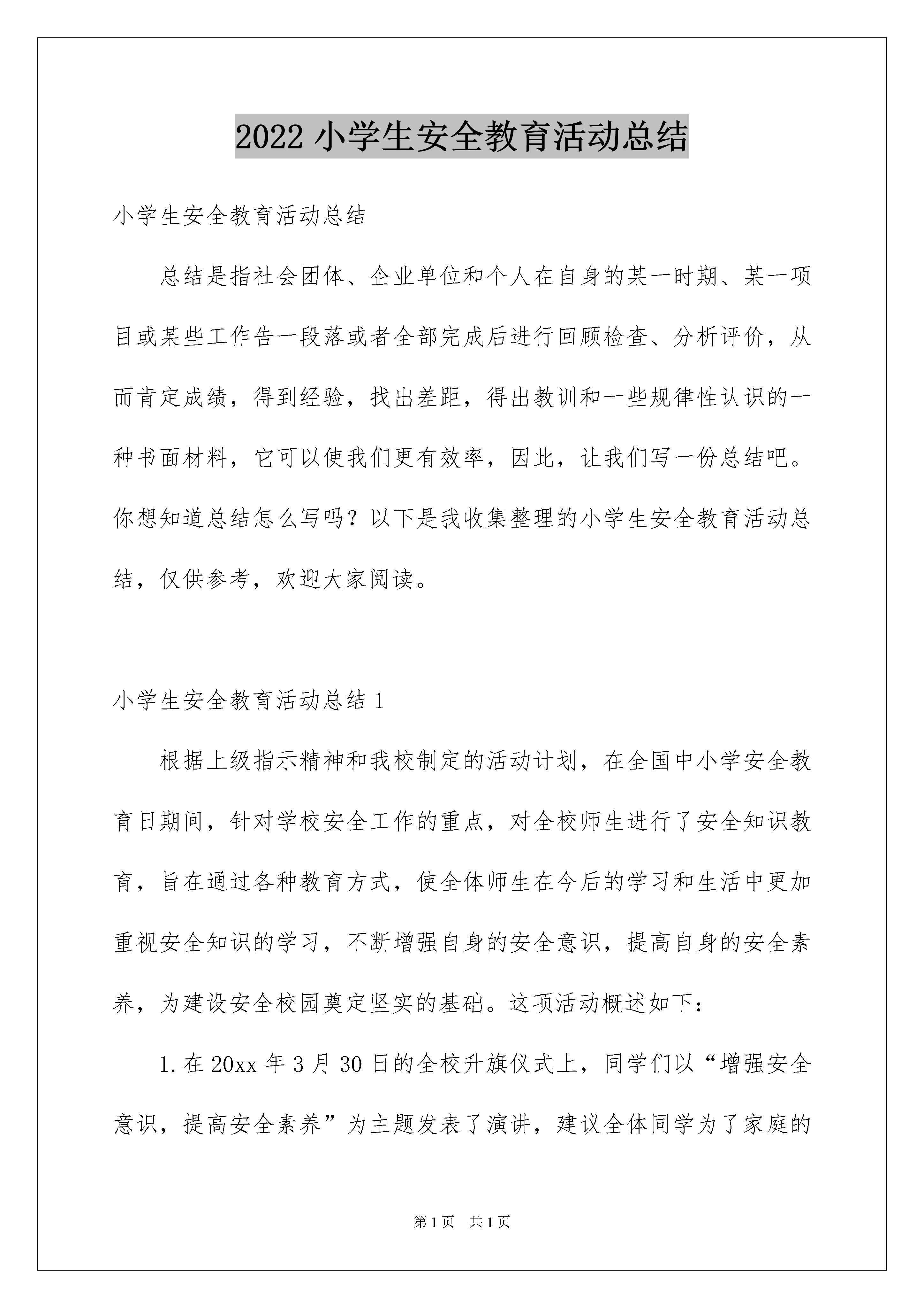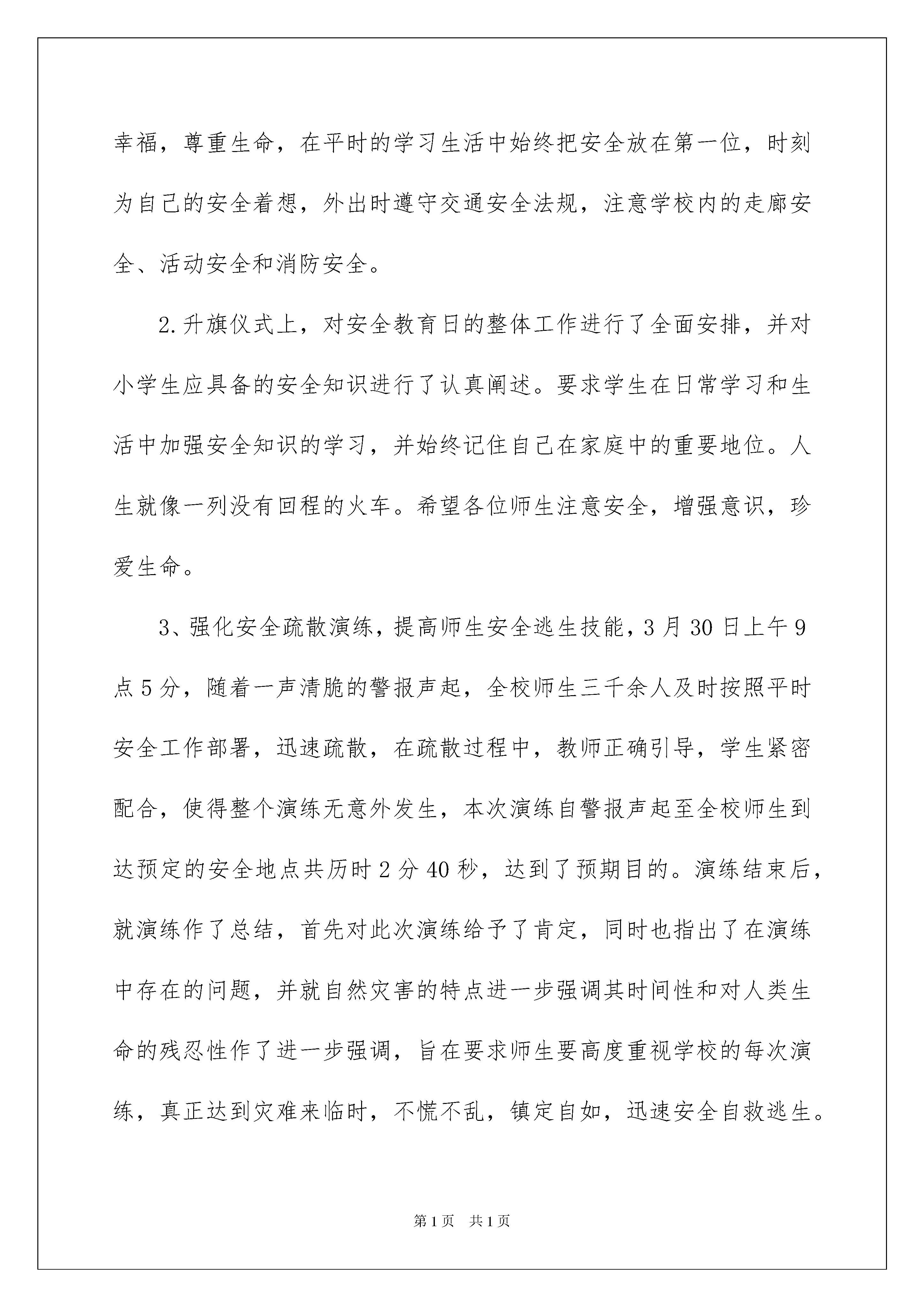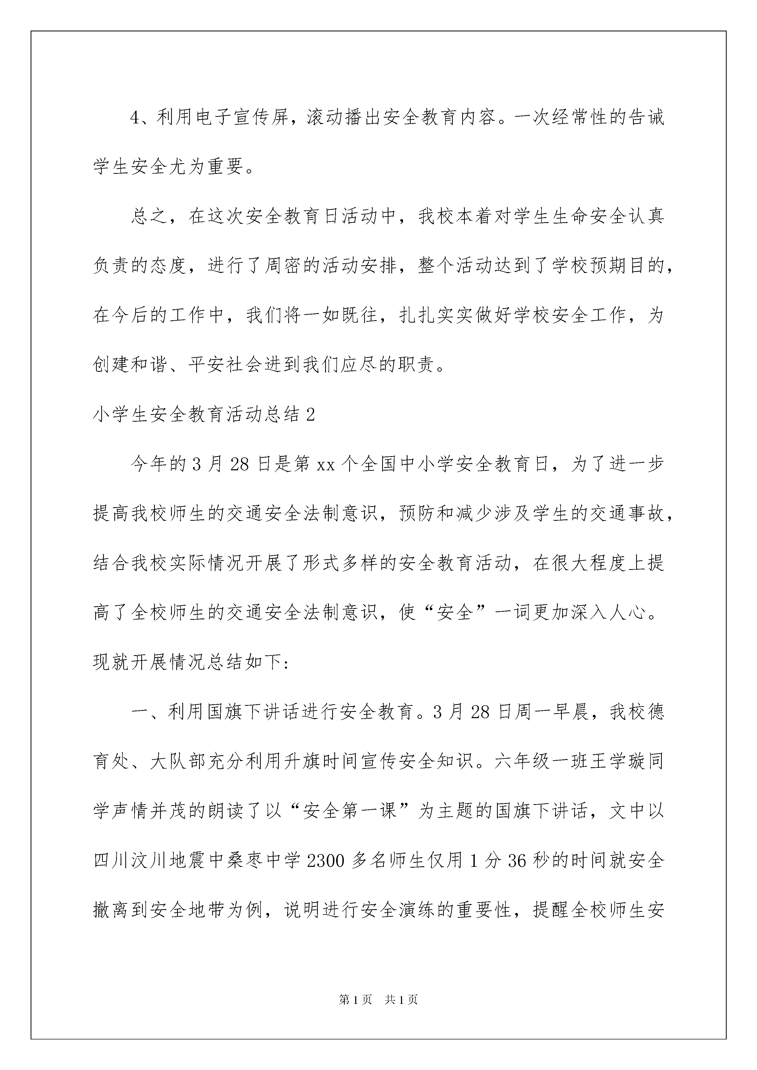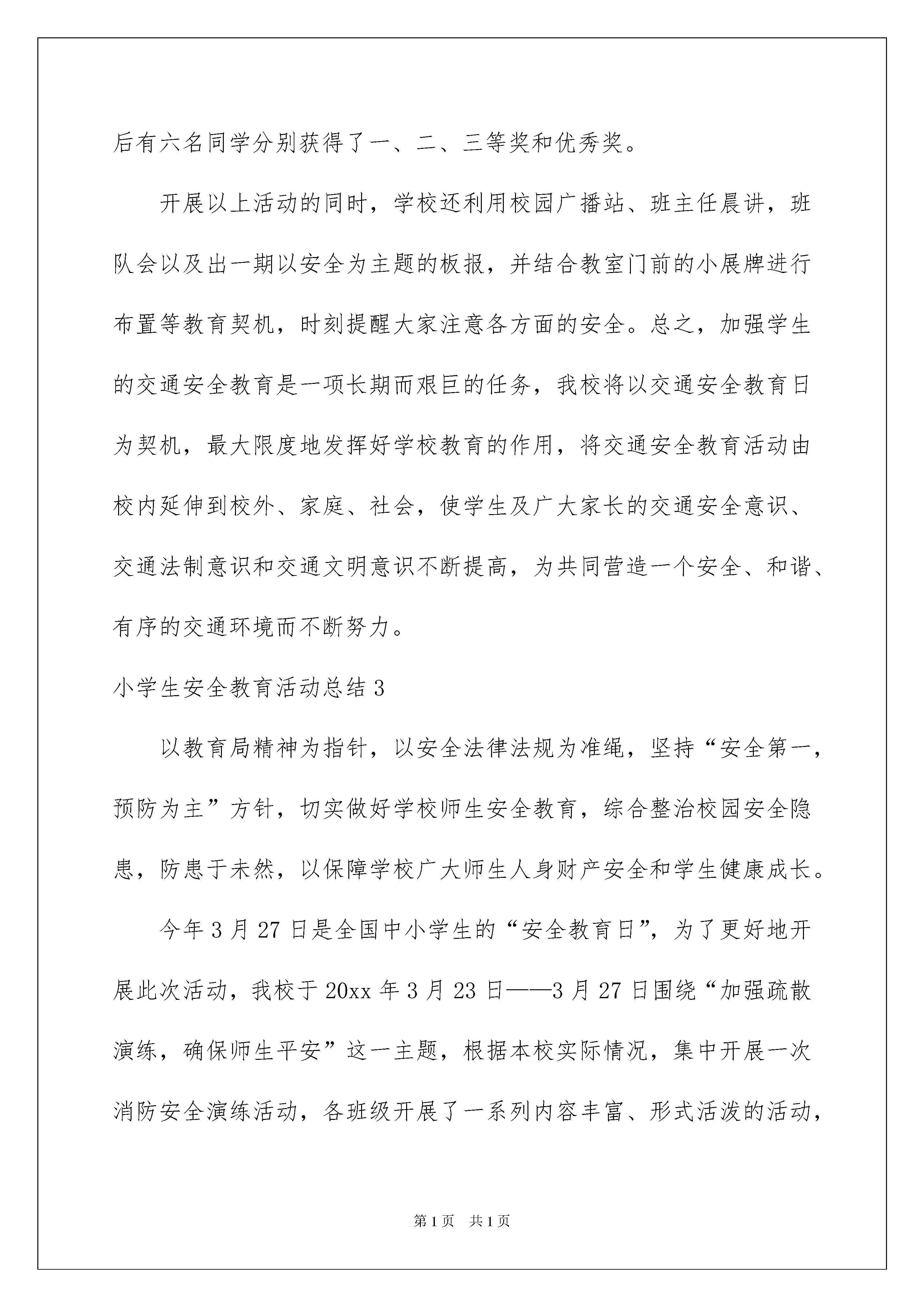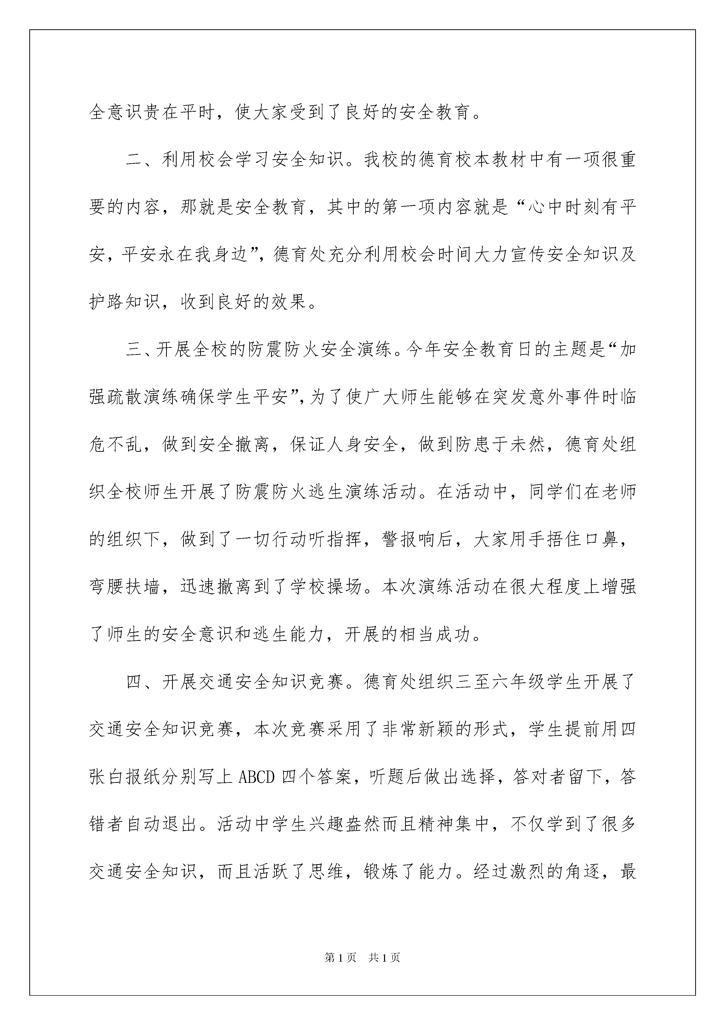 2022小学生安全教育活动总结小学生安全教育活动总结总结是指社会团体、企业单位和个人在自身的某一时期、某一项目或某些工作告一段落或者全部完成后进行回顾检查、分析评价,从而肯定成绩,得到经验,找出差距,得出教训和一些规律性认识的一种书面材料,它可以使我们更有效率,因此,让我们写一份总结吧。你想知道总结怎么写吗?以下是我收集整理的小学生安全教育活动总结,仅供参考,欢迎大家阅读。小学生安全教育活动总结1根据上级指示精神和我校制定的活动计划,在全国中小学安全教育日期间,针对学校安全工作的重点,对全校师生进行了安全知识教育,旨在通过各种教育方式,使全体师生在今后的学习和生活中更加重视安全知识的学习,不断增强自身的安全意识,提高自身的安全素养,为建设安全校园奠定坚实的基础。这项活动概述如下:1.在20xx年3月30日的全校升旗仪式上,同学们以“增强安全意识,提高安全素养”为主题发表了演讲,建议全体同学为了家庭的幸福,尊重生命,在平时的学习生活中始终把安全放在第一位,时刻为自己的安全着想,外出时遵守交通安全法规,注意学校内的走廊安全、活动安全和消防安全。2.升旗仪式上,对安全教育日的整体工作进行了全面安排,并对小学生应具备的安全知识进行了认真阐述。要求学生在日常学习和生活中加强安全知识的学习,并始终记住自己在家庭中的重要地位。人生就像一列没有回程的火车。希望各位师生注意安全,增强意识,珍爱生命。3、强化安全疏散演练,提高师生安全逃生技能,3月30日上午9点5分,随着一声清脆的警报声起,全校师生三千余人及时按照平时安全工作部署,迅速疏散,在疏散过程中,教师正确引导,学生紧密配合,使得整个演练无意外发生,本次演练自警报声起至全校师生到达预定的安全地点共历时2分40秒,达到了预期目的。演练结束后,就演练作了总结,首先对此次演练给予了肯定,同时也指出了在演练中存在的问题,并就自然灾害的特点进一步强调其时间性和对人类生命的残忍性作了进一步强调,旨在要求师生要高度重视学校的每次演练,真正达到灾难来临时,不慌不乱,镇定自如,迅速安全自救逃生。4、利用电子宣传屏,滚动播出安全教育内容。一次经常性的告诫学生安全尤为重要。总之,在这次安全教育日活动中,我校本着对学生生命安全认真负责的态度,进行了周密的活动安排,整个活动达到了学校预期目的,在今后的工作中,我们将一如既往,扎扎实实做好学校安全工作,为创建和谐、平安社会进到我们应尽的职责。小学生安全教育活动总结2今年的3月28日是第xx个全国中小学安全教育日,为了进一步提高我校师生的交通安全法制意识,预防和减少涉及学生的交通事故,结合我校实际情况开展了形式多样的安全教育活动,在很大程度上提高了全校师生的交通安全法制意识,使“安全”一词更加深入人心。现就开展情况总结如下:一、利用国旗下讲话进行安全教育。3月28日周一早晨,我校德育处、大队部充分利用升旗时间宣传安全知识。六年级一班王学璇同学声情并茂的朗读了以“安全第一课”为主题的国旗下讲话,文中以四川汶川地震中桑枣中学2300多名师生仅用1分36秒的时间就安全撤离到安全地带为例,说明进行安全演练的重要性,提醒全校师生安全意识贵在平时,使大家受到了良好的安全教育。二、利用校会学习安全知识。我校的德育校本教材中有一项很重要的内容,那就是安全教育,其中的第一项内容就是“心中时刻有平安,平安永在我身边”,德育处充分利用校会时间大力宣传安全知识及护路知识,收到良好的效果。三、开展全校的防震防火安全演练。今年安全教育日的主题是“加强疏散演练确保学生平安”,为了使广大师生能够在突发意外事件时临危不乱,做到安全撤离,保证人身安全,做到防患于未然,德育处组织全校师生开展了防震防火逃生演练活动。在活动中,同学们在老师的组织下,做到了一切行动听指挥,警报响后,大家用手捂住口鼻,弯腰扶墙,迅速撤离到了学校操场。本次演练活动在很大程度上增强了师生的安全意识和逃生能力,开展的相当成功。四、开展交通安全知识竞赛。德育处组织三至六年级学生开展了交通安全知识竞赛,本次竞赛采用了非常新颖的形式,学生提前用四张白报纸分别写上ABCD四个答案,听题后做出选择,答对者留下,答错者自动退出。活动中学生兴趣盎然而且精神集中,不仅学到了很多交通安全知识,而且活跃了思维,锻炼了能力。经过激烈的角逐,最后有六名同学分别获得了一、二、三等奖和优秀奖。开展以上活动的同时,学校还利用校园广播站、班主任晨讲,班队会以及出一期以安全为主题的板报,并结合教室门前的小展牌进行布置等教育契机,时刻提醒大家注意各方面的安全。总之,加强学生的交通安全教育是一项长期而艰巨的任务,我校将