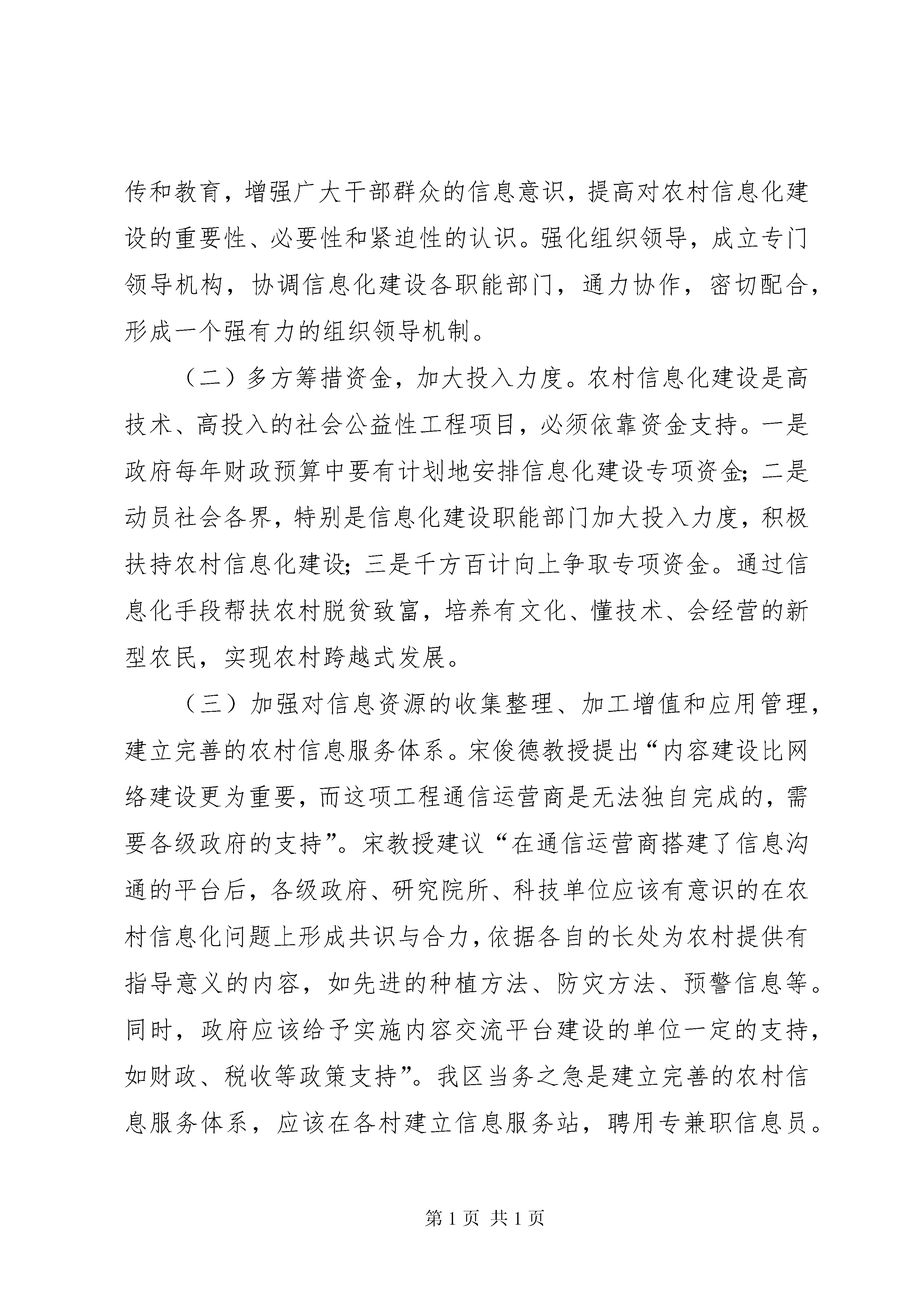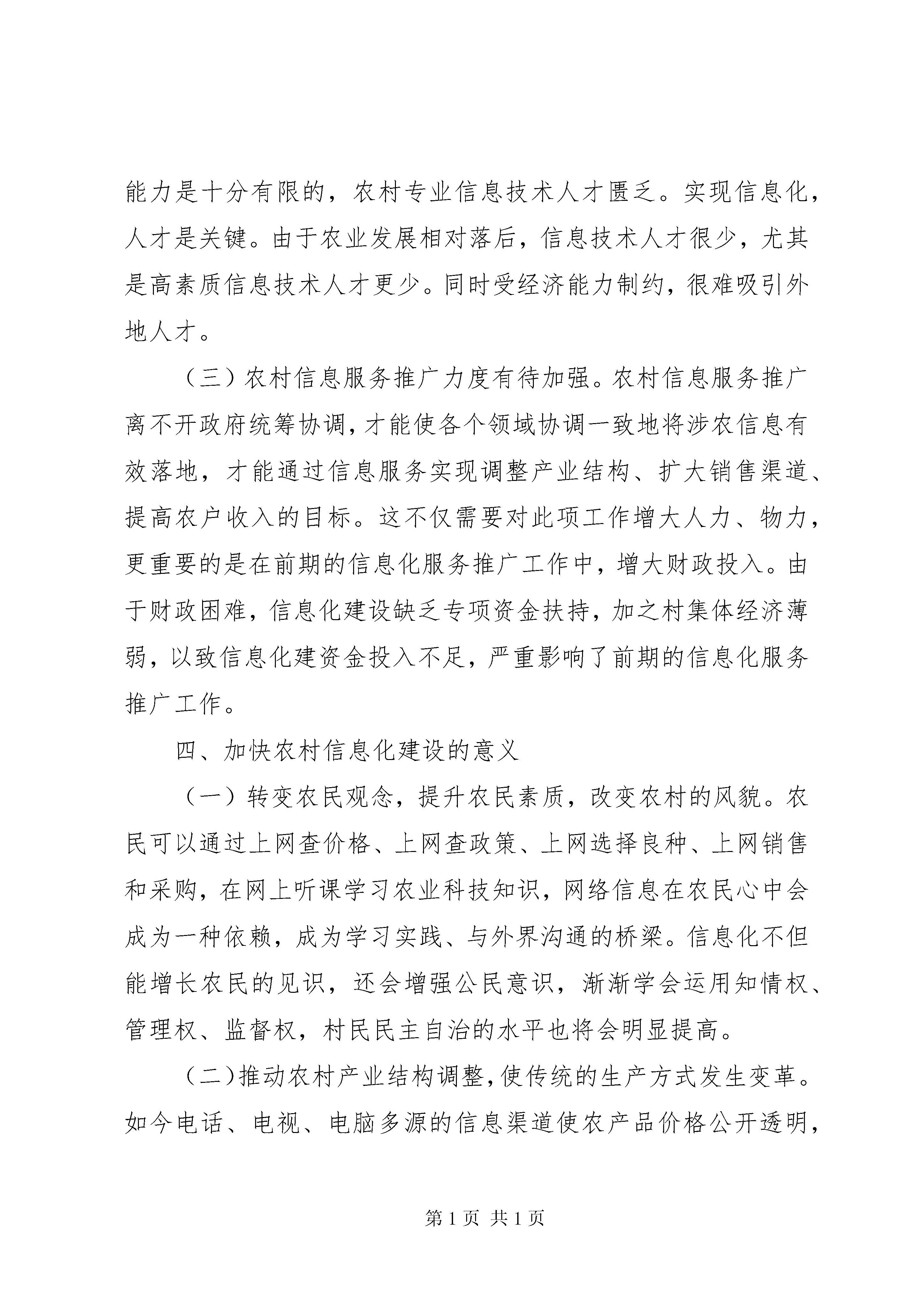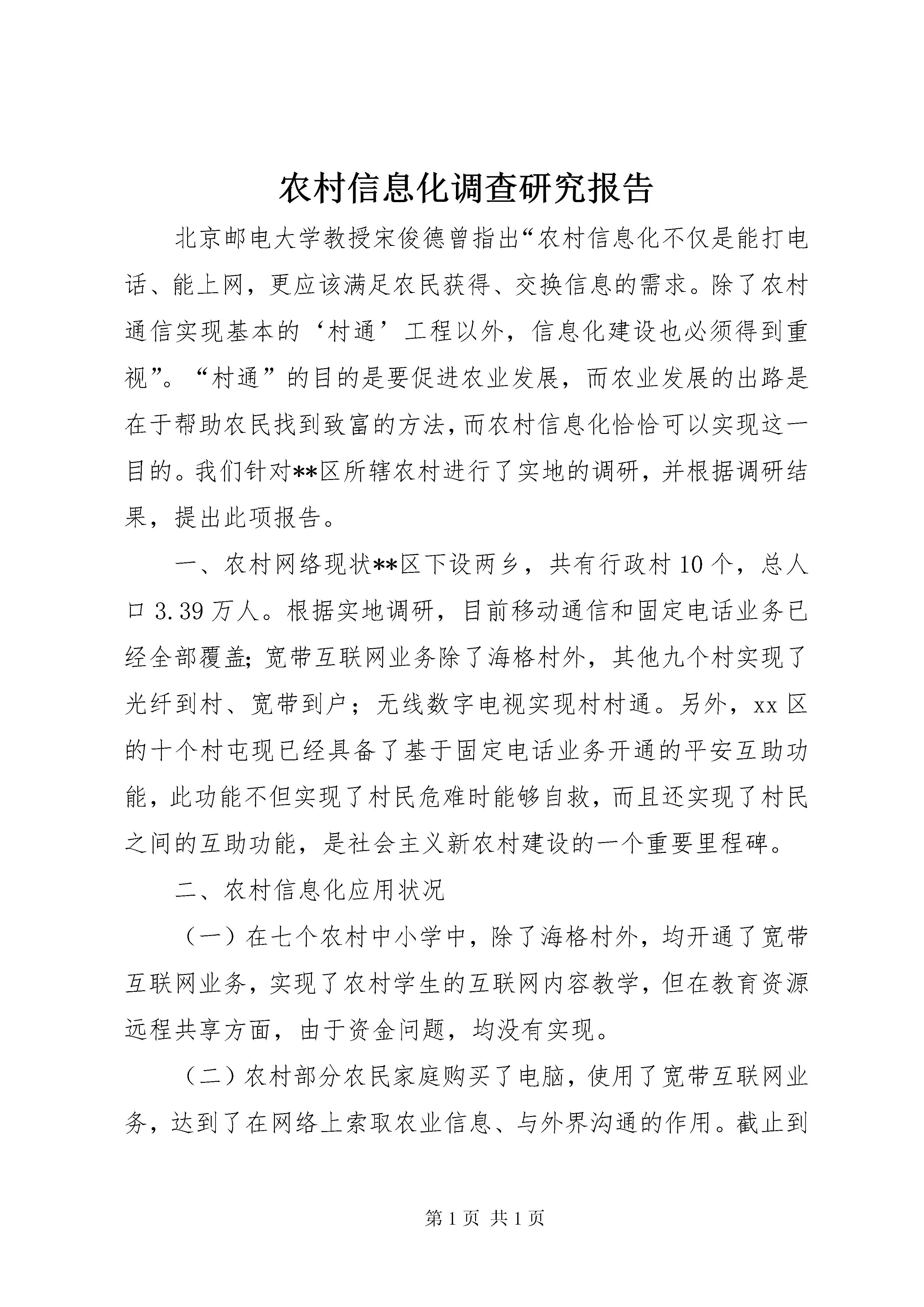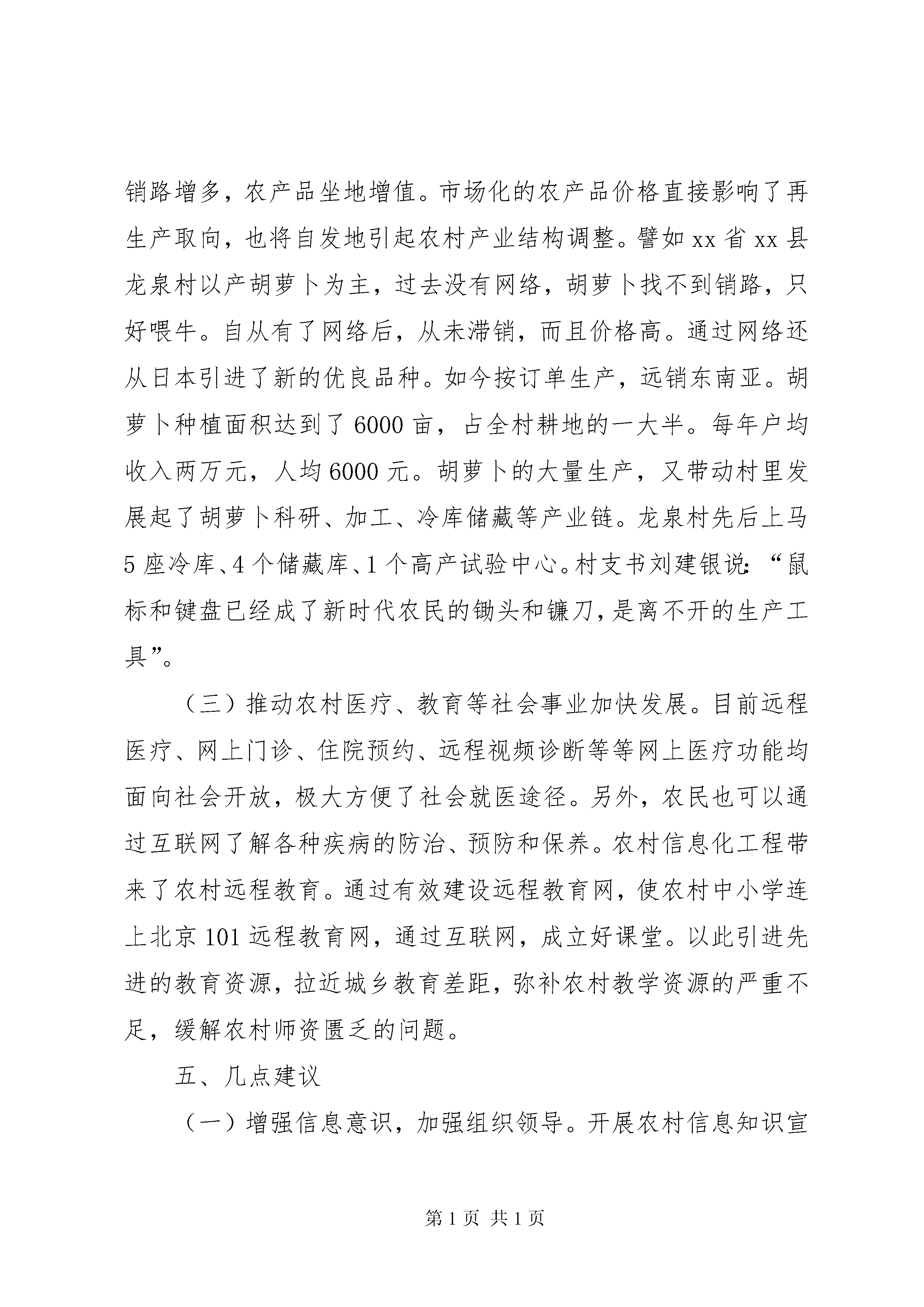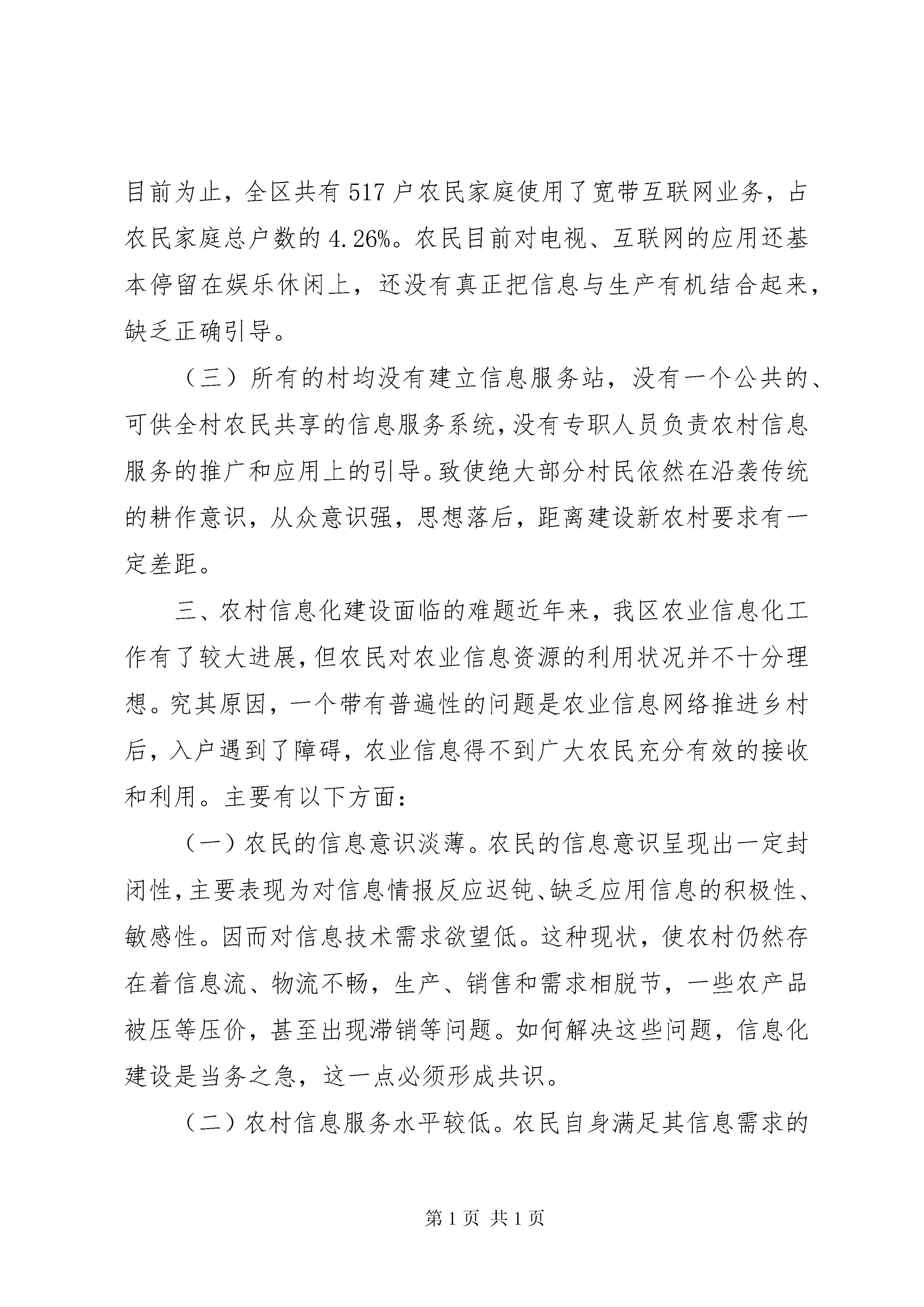 农村信息化调查研究报告北京邮电大学教授宋俊德曾指出“农村信息化不仅是能打电话、能上网,更应该满足农民获得、交换信息的需求。除了农村通信实现基本的‘村通’工程以外,信息化建设也必须得到重视”。“村通”的目的是要促进农业发展,而农业发展的出路是在于帮助农民找到致富的方法,而农村信息化恰恰可以实现这一目的。我们针对**区所辖农村进行了实地的调研,并根据调研结果,提出此项报告。一、农村网络现状**区下设两乡,共有行政村10个,总人口3.39万人。根据实地调研,目前移动通信和固定电话业务已经全部覆盖;宽带互联网业务除了海格村外,其他九个村实现了光纤到村、宽带到户;无线数字电视实现村村通。另外,xx区的十个村屯现已经具备了基于固定电话业务开通的平安互助功能,此功能不但实现了村民危难时能够自救,而且还实现了村民之间的互助功能,是社会主义新农村建设的一个重要里程碑。二、农村信息化应用状况(一)在七个农村中小学中,除了海格村外,均开通了宽带互联网业务,实现了农村学生的互联网内容教学,但在教育资源远程共享方面,由于资金问题,均没有实现。(二)农村部分农民家庭购买了电脑,使用了宽带互联网业务,达到了在网络上索取农业信息、与外界沟通的作用。截止到目前为止,全区共有517户农民家庭使用了宽带互联网业务,占农民家庭总户数的4.26%。农民目前对电视、互联网的应用还基本停留在娱乐休闲上,还没有真正把信息与生产有机结合起来,缺乏正确引导。(三)所有的村均没有建立信息服务站,没有一个公共的、可供全村农民共享的信息服务系统,没有专职人员负责农村信息服务的推广和应用上的引导。致使绝大部分村民依然在沿袭传统的耕作意识,从众意识强,思想落后,距离建设新农村要求有一定差距。三、农村信息化建设面临的难题近年来,我区农业信息化工作有了较大进展,但农民对农业信息资源的利用状况并不十分理想。究其原因,一个带有普遍性的问题是农业信息网络推进乡村后,入户遇到了障碍,农业信息得不到广大农民充分有效的接收和利用。主要有以下方面:(一)农民的信息意识淡薄。农民的信息意识呈现出一定封闭性,主要表现为对信息情报反应迟钝、缺乏应用信息的积极性、敏感性。因而对信息技术需求欲望低。这种现状,使农村仍然存在着信息流、物流不畅,生产、销售和需求相脱节,一些农产品被压等压价,甚至出现滞销等问题。如何解决这些问题,信息化建设是当务之急,这一点必须形成共识。(二)农村信息服务水平较低。农民自身满足其信息需求的能力是十分有限的,农村专业信息技术人才匮乏。实现信息化,人才是关键。由于农业发展相对落后,信息技术人才很少,尤其是高素质信息技术人才更少。同时受经济能力制约,很难吸引外地人才。(三)农村信息服务推广力度有待加强。农村信息服务推广离不开政府统筹协调,才能使各个领域协调一致地将涉农信息有效落地,才能通过信息服务实现调整产业结构、扩大销售渠道、提高农户收入的目标。这不仅需要对此项工作增大人力、物力,更重要的是在前期的信息化服务推广工作中,增大财政投入。由于财政困难,信息化建设缺乏专项资金扶持,加之村集体经济薄弱,以致信息化建资金投入不足,严重影响了前期的信息化服务推广工作。四、加快农村信息化建设的意义(一)转变农民观念,提升农民素质,改变农村的风貌。农民可以通过上网查价格、上网查政策、上网选择良种、上网销售和采购,在网上听课学习农业科技知识,网络信息在农民心中会成为一种依赖,成为学习实践、与外界沟通的桥梁。信息化不但能增长农民的见识,还会增强公民意识,渐渐学会运用知情权、管理权、监督权,村民民主自治的水平也将会明显提高。(二)推动农村产业结构调整,使传统的生产方式发生变革。如今电话、电视、电脑多源的信息渠道使农产品价格公开透明,销路增多,农产品坐地增值。市场化的农产品价格直接影响了再生产取向,也将自发地引起农村产业结构调整。譬如xx省xx县龙泉村以产胡萝卜为主,过去没有网络,胡萝卜找不到销路,只好喂牛。自从有了网络后,从未滞销,而且价格高。通过网络还从日本引进了新的优良品种。如今按订单生产,远销东南亚。胡萝卜种植面积达到了6000亩,占全村耕地的一大半。每年户均收入两万元,人均6000元。胡萝卜的大量生产,又带动村里发展起了胡萝卜科研、加工、冷库储藏等产业链。龙泉村先后上马5座冷库、4个储藏库、1个高产试验中心。村支书刘建银说:“鼠标和键盘已经成了新时代农民的锄头和镰刀,是离不开的生产工具”。(三)推动农村医疗、教育等社会事业加快发展。目前远程医疗、网上门诊、住院预约、远程视频诊断等等网上医疗功能均面向社会开放,极大方便了社会就医途径。另外,农民也可以通过互联网了解各种疾病的防治、预防和保养。农村信息化工程带来了农村远程教育。通过有效建设远程教育网,使农村中小学连上北京101远程教育
