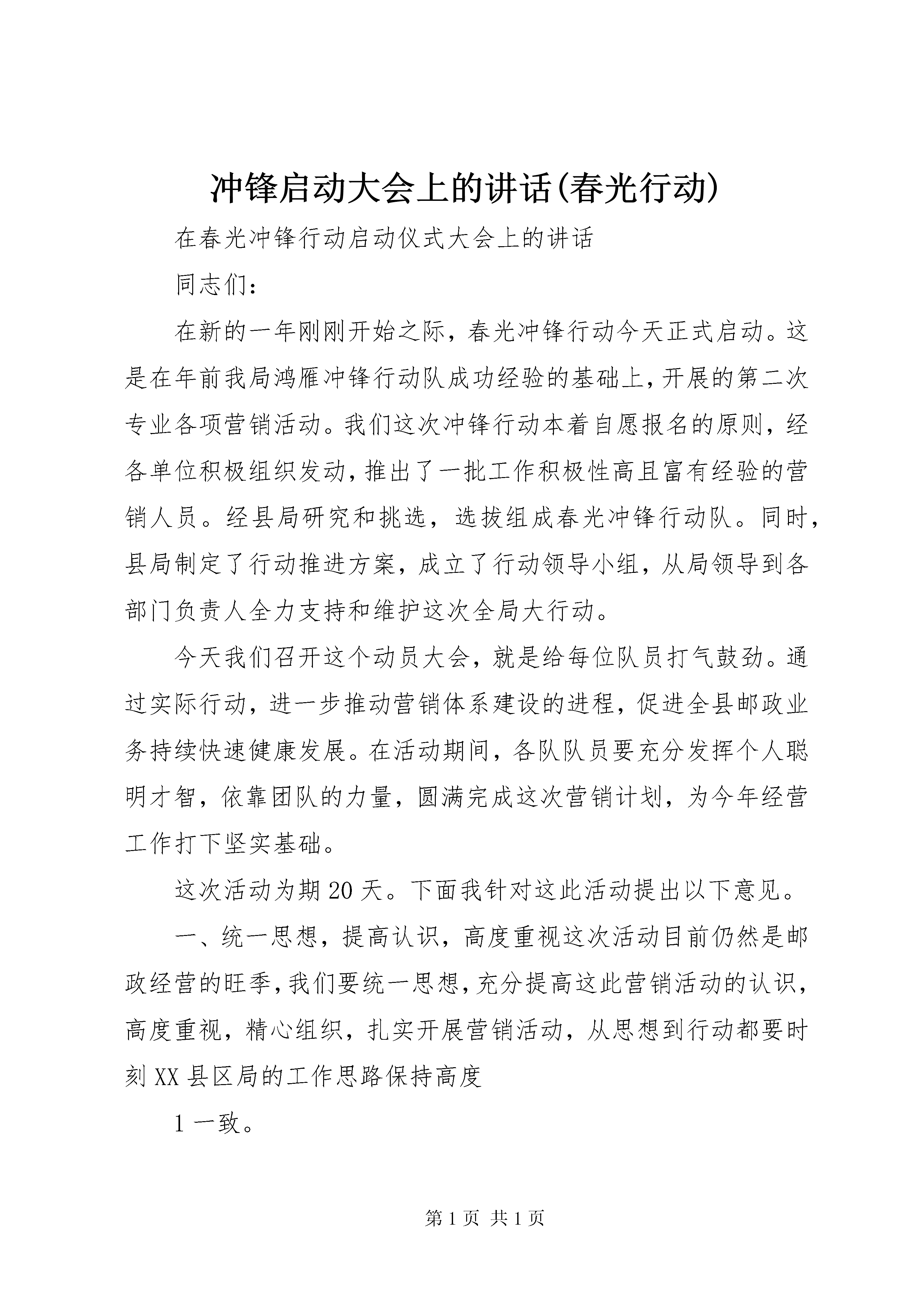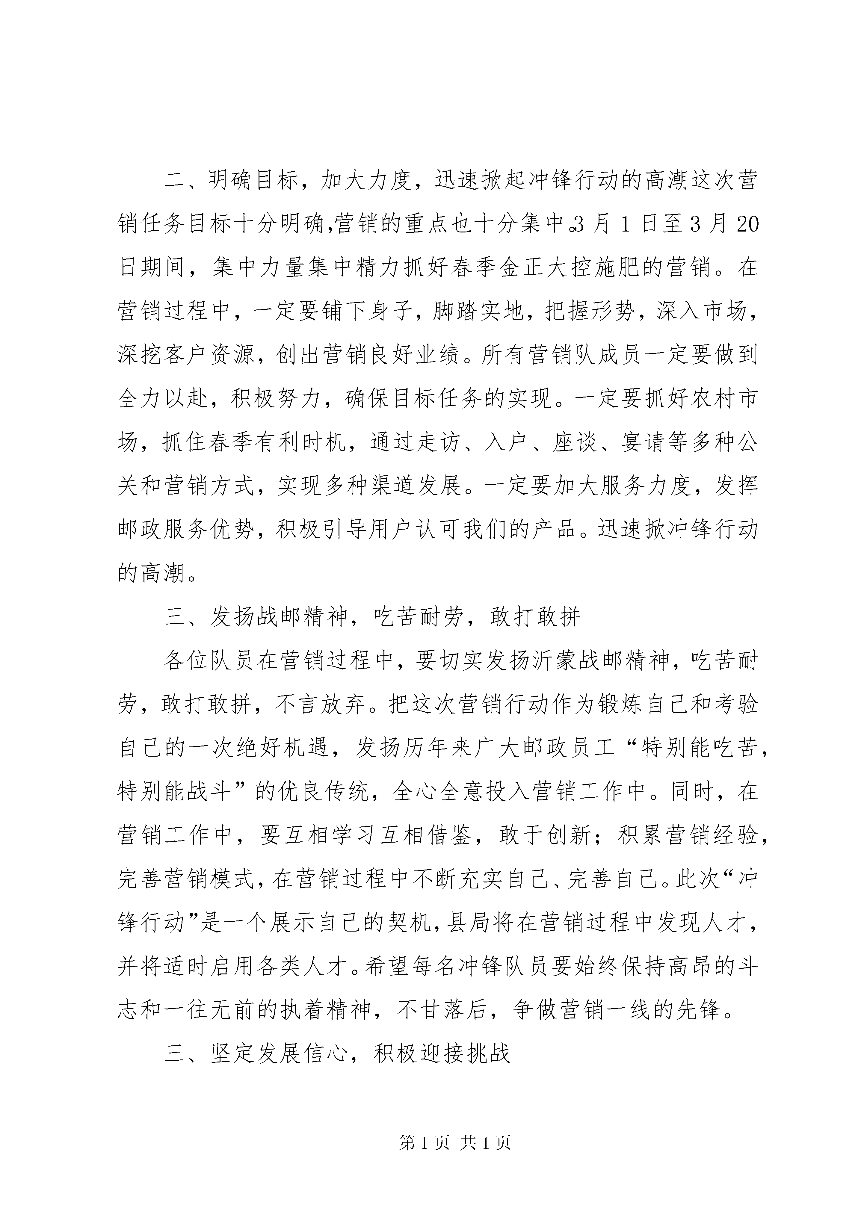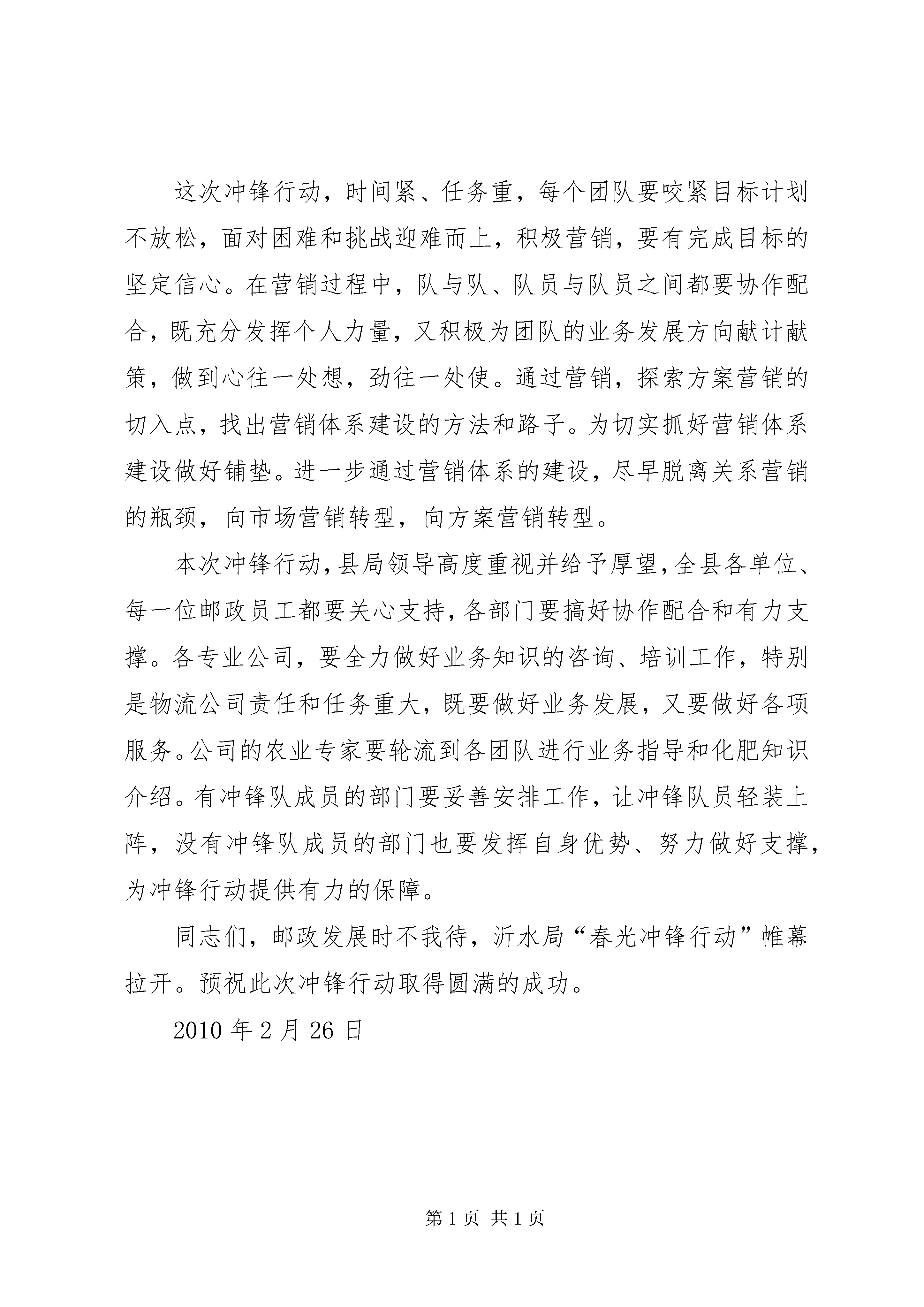 冲锋启动大会上的讲话(春光行动)在春光冲锋行动启动仪式大会上的讲话同志们:在新的一年刚刚开始之际,春光冲锋行动今天正式启动。这是在年前我局鸿雁冲锋行动队成功经验的基础上,开展的第二次专业各项营销活动。我们这次冲锋行动本着自愿报名的原则,经各单位积极组织发动,推出了一批工作积极性高且富有经验的营销人员。经县局研究和挑选,选拔组成春光冲锋行动队。同时,县局制定了行动推进方案,成立了行动领导小组,从局领导到各部门负责人全力支持和维护这次全局大行动。今天我们召开这个动员大会,就是给每位队员打气鼓劲。通过实际行动,进一步推动营销体系建设的进程,促进全县邮政业务持续快速健康发展。在活动期间,各队队员要充分发挥个人聪明才智,依靠团队的力量,圆满完成这次营销计划,为今年经营工作打下坚实基础。这次活动为期20天。下面我针对这此活动提出以下意见。一、统一思想,提高认识,高度重视这次活动目前仍然是邮政经营的旺季,我们要统一思想,充分提高这此营销活动的认识,高度重视,精心组织,扎实开展营销活动,从思想到行动都要时刻XX县区局的工作思路保持高度1一致。二、明确目标,加大力度,迅速掀起冲锋行动的高潮这次营销任务目标十分明确,营销的重点也十分集中。3月1日至3月20日期间,集中力量集中精力抓好春季金正大控施肥的营销。在营销过程中,一定要铺下身子,脚踏实地,把握形势,深入市场,深挖客户资源,创出营销良好业绩。所有营销队成员一定要做到全力以赴,积极努力,确保目标任务的实现。一定要抓好农村市场,抓住春季有利时机,通过走访、入户、座谈、宴请等多种公关和营销方式,实现多种渠道发展。一定要加大服务力度,发挥邮政服务优势,积极引导用户认可我们的产品。迅速掀冲锋行动的高潮。三、发扬战邮精神,吃苦耐劳,敢打敢拼各位队员在营销过程中,要切实发扬沂蒙战邮精神,吃苦耐劳,敢打敢拼,不言放弃。把这次营销行动作为锻炼自己和考验自己的一次绝好机遇,发扬历年来广大邮政员工“特别能吃苦,特别能战斗”的优良传统,全心全意投入营销工作中。同时,在营销工作中,要互相学习互相借鉴,敢于创新;积累营销经验,完善营销模式,在营销过程中不断充实自己、完善自己。此次“冲锋行动”是一个展示自己的契机,县局将在营销过程中发现人才,并将适时启用各类人才。希望每名冲锋队员要始终保持高昂的斗志和一往无前的执着精神,不甘落后,争做营销一线的先锋。三、坚定发展信心,积极迎接挑战这次冲锋行动,时间紧、任务重,每个团队要咬紧目标计划不放松,面对困难和挑战迎难而上,积极营销,要有完成目标的坚定信心。在营销过程中,队与队、队员与队员之间都要协作配合,既充分发挥个人力量,又积极为团队的业务发展方向献计献策,做到心往一处想,劲往一处使。通过营销,探索方案营销的切入点,找出营销体系建设的方法和路子。为切实抓好营销体系建设做好铺垫。进一步通过营销体系的建设,尽早脱离关系营销的瓶颈,向市场营销转型,向方案营销转型。本次冲锋行动,县局领导高度重视并给予厚望,全县各单位、每一位邮政员工都要关心支持,各部门要搞好协作配合和有力支撑。各专业公司,要全力做好业务知识的咨询、培训工作,特别是物流公司责任和任务重大,既要做好业务发展,又要做好各项服务。公司的农业专家要轮流到各团队进行业务指导和化肥知识介绍。有冲锋队成员的部门要妥善安排工作,让冲锋队员轻装上阵,没有冲锋队成员的部门也要发挥自身优势、努力做好支撑,为冲锋行动提供有力的保障。同志们,邮政发展时不我待,沂水局“春光冲锋行动”帷幕拉开。预祝此次冲锋行动取得圆满的成功。2010年2月26日