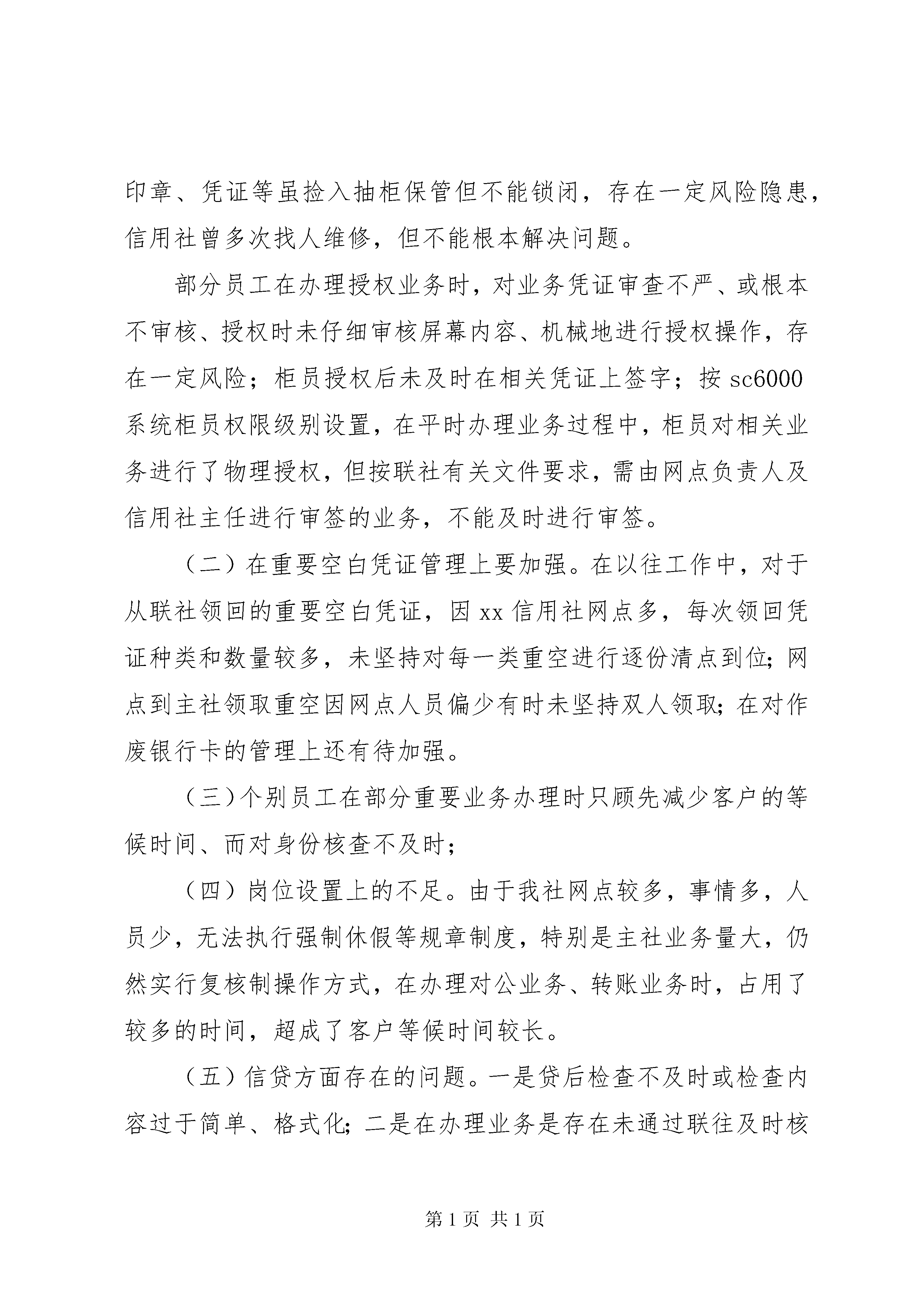 农村信用社合规文化建设年活动自查报告xx信用社辖内四个分社、三个储蓄所及一个营业主社和一个信贷部,现有在职员工36人。一直以来,xx信用社始终坚持合规操作,将合规人人有责、合规从我从起的理念贯输到员工的业务办理过程中,全社年年均未发生安全责任事故、刑事案件事故。今年5月以来,我社按威信联发(2011)116号xx县农村信用合作联社关于印发《xx县农村信用社合规文化建设年活动实施方案》的通知要求,开展了宣传发动、部署动员,并于2011年6月上旬以来开展了一次以规章制度执行和柜台操作风险为主的案件隐患的自查。在员工自查的基础上,刘超与刘毅两位主任于7月9-10日(星期六、星期日)对全社各网点的合规操作进行了检查,检查面达100%。检查内容包括:人员管理、授权授信、贷款管理、票据业务、大额资金交易、辖内往来、联行往来、现金出纳管理、sc6000综合业务操作流程、岗位设置、银行卡、atm机、安全保卫工作及内控规章制度的执行情况等。现将自查情况汇报如下:一、加强组织领导,安排部署到位我社按活动要求,成立了以社主任刘超同志为组长,信用社副主任、信贷组长、各网点负责人为成员的xx信用社合规文化建设年活动领导小组,明确了工作小组的工作职责:及时贯彻落实上级有关合规文化建设年活动的指示精神;加强对全社合规文化建设年活动工作的督促和检查;定期或不定期的召开合规文化建设活动分析会,学习各项规章制度,对合规文化建设年活动工作进行总结分析,确保合规文化建设年活动不流于形式。工作领导小组及时召开动员大会,深入思想发动,全面部署活动工作目标,落实措施及要求;在会议室制作、张贴标语;制作合规文化建设年活动专栏,将职工合规自检、违规自查情况进行张贴;指定专人对活动开展情况进行宣传报道,增强员工对工作重要性的认识。二、认真自查,堵塞漏洞坚持规章制度执行情况自查和对sc6000操作流程与贷款三项治理检查相结合,尽可能发现操作业务中存在的问题和漏洞,及时提出整改意见和措施,将合规文化建设年活动逐步引向深入。1.开展对合规管理组织架构是否健全、合规职责是否明确清晰、合规工作是否正常开展并在组织上得到全面保障的自查。2.对主要业务规章制度的落实和执行情况,重点是各项制制度执行是否走样,各个环节是否操作到位,监督到位,会计对帐制度落实情况,单位银行结算账户开销户管理,个人结算账户管理,银行卡管理,大额现金(转账)交易管理,授权审批管理,票据业务及重要空白凭证管理,atm机管理和sc6000操作流程等进行了全面检查。从检查的情况看,我社各营业网点的职工均能比较严格执行各项规章制度,严格落实会计出纳基本制度;严格执行十六项基本规定,做到了五无、六相符;均能按照sc6000操作流程办理每一笔业务,各种重空及抵押品入库保管,各岗位能做到相互配合、相互监督,从制度执行上杜绝了各种隐患。3.对贷款三法一指引执行情况和贷款三项治理工作的检查;对贷款程序合规性以及贷款手续有效性进行了检查。不存在逆程序办理贷款、自批自贷、违反规定向关系人发放贷款等行为,贷款审批符合内部授权、授信管理规定,借款合同、担保合同印章、签名与预留印鉴、签名一致、有效,借款人身份证、贷款证、营业执照等贷款资料真实有效。我社一直比较注重贷后跟踪检查。4.对岗位设置、工作职责边界、安全保卫等进行了检查。经查我社及辖属各营业网点能够较好地执行农村信用社安全保卫规章制度。5.全社员工结合本岗位实际,认真查找工作中存在的问题和不足,并及时写出自查报告,签订整改承诺责任书。三、存在的问题通过自查,依然找出了各网点业务操作人员日常工作中存在的不足之处:(一)部分员工在营业室内操作oa系统进行身份核查或办理其他查询业务时,未将sc6000系统退至login状态;部分网点办公桌因年久失修,不能锁闭,致使部分员工在离柜时钱款、印章、凭证等虽捡入抽柜保管但不能锁闭,存在一定风险隐患,信用社曾多次找人维修,但不能根本解决问题。部分员工在办理授权业务时,对业务凭证审查不严、或根本不审核、授权时未仔细审核屏幕内容、机械地进行授权操作,存在一定风险;柜员授权后未及时在相关凭证上签字;按sc6000系统柜员权限级别设置,在平时办理业务过程中,柜员对相关业务进行了物理授权,但按联社有关文件要求,需由网点负责人及信用社主任进行审签的业务,不能及时进行审签。(二)在重要空白凭证管理上要加强。在以往工作中,对于从联社领回的重要空白凭证,因xx信用社网点多,每次领回凭证种类和数量较多,未坚持对每一类重空进行逐份清点到位;网点到主社领取重空因网点人员偏少有时未坚持双人领取;在对作废银行卡的管理上还有待加强。(三)个别员工在部分重要业务办理时只顾先减少客户的等候时间、而对身份核查不及时;(四)岗位设置上的不足。由于我社网点较多,事情多