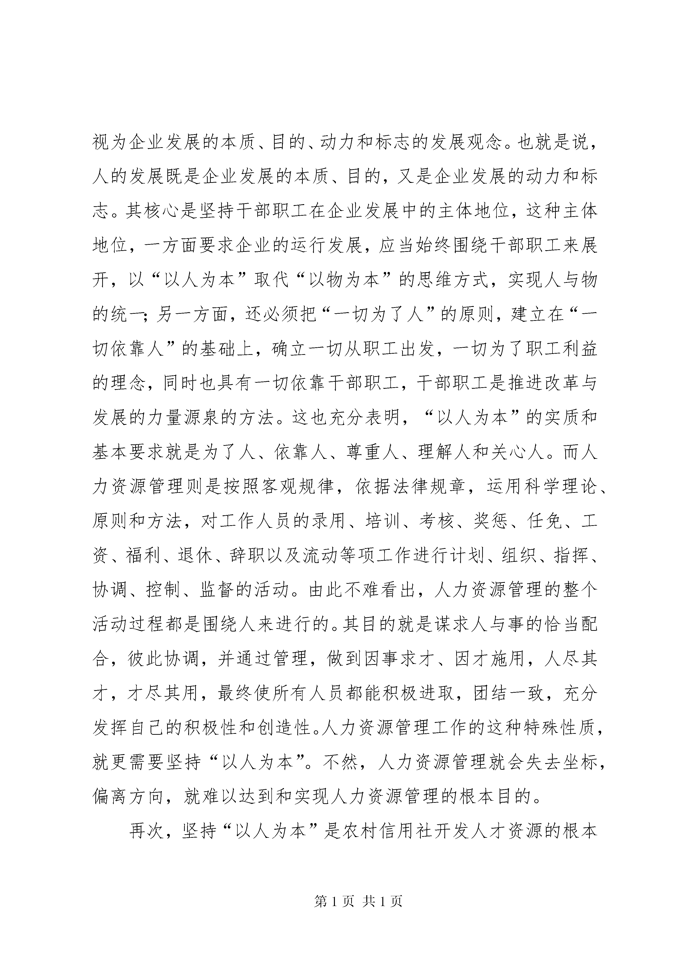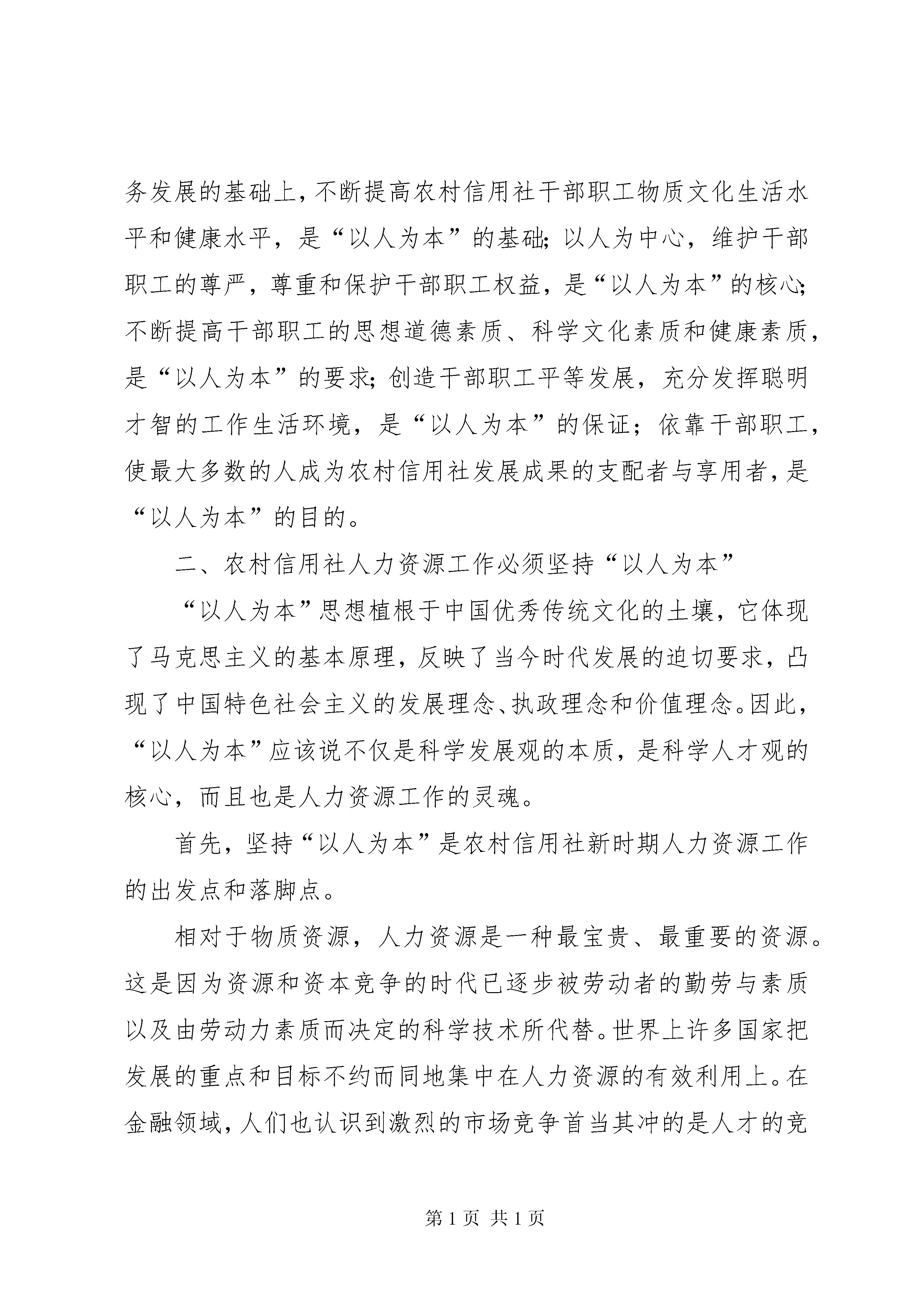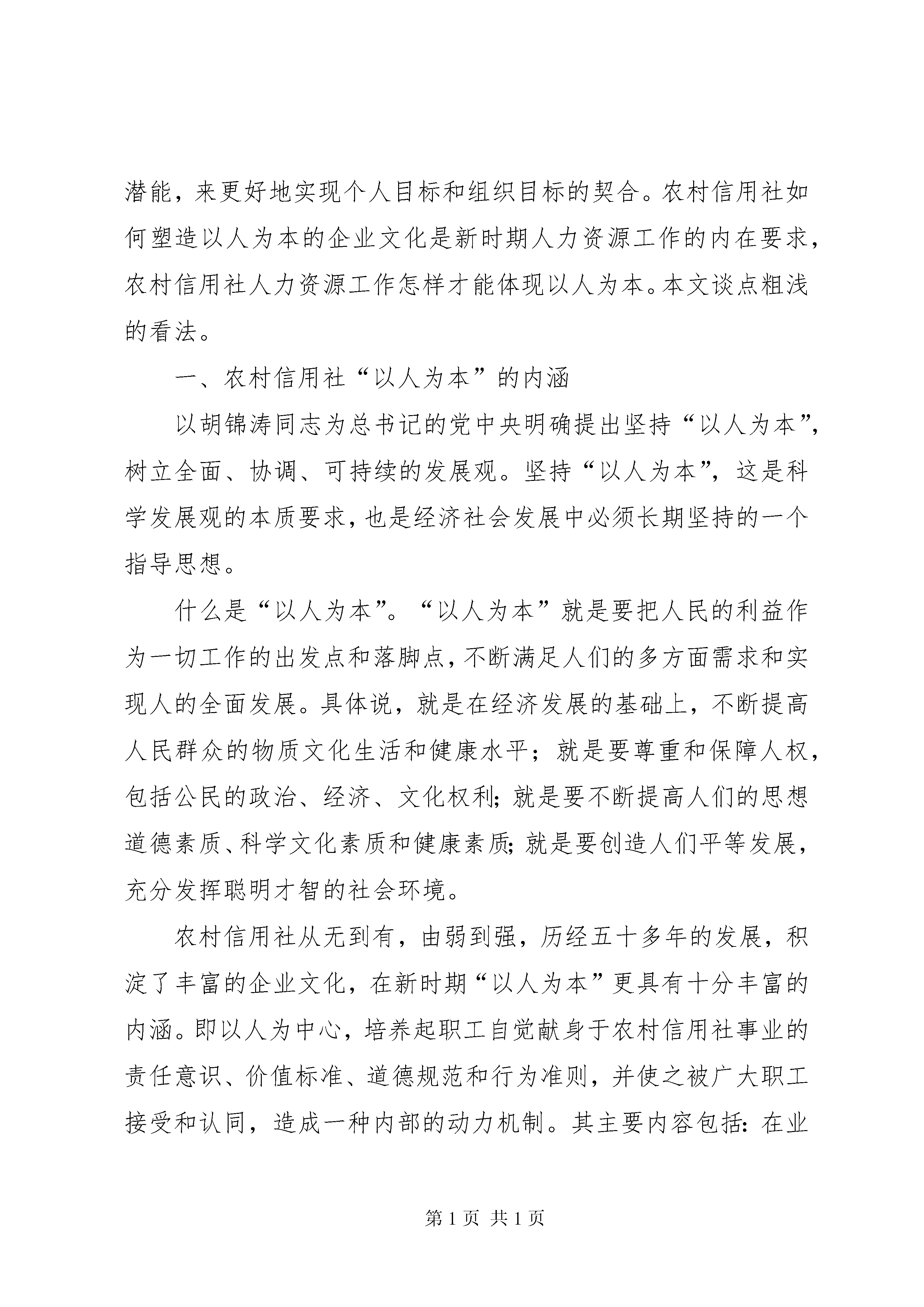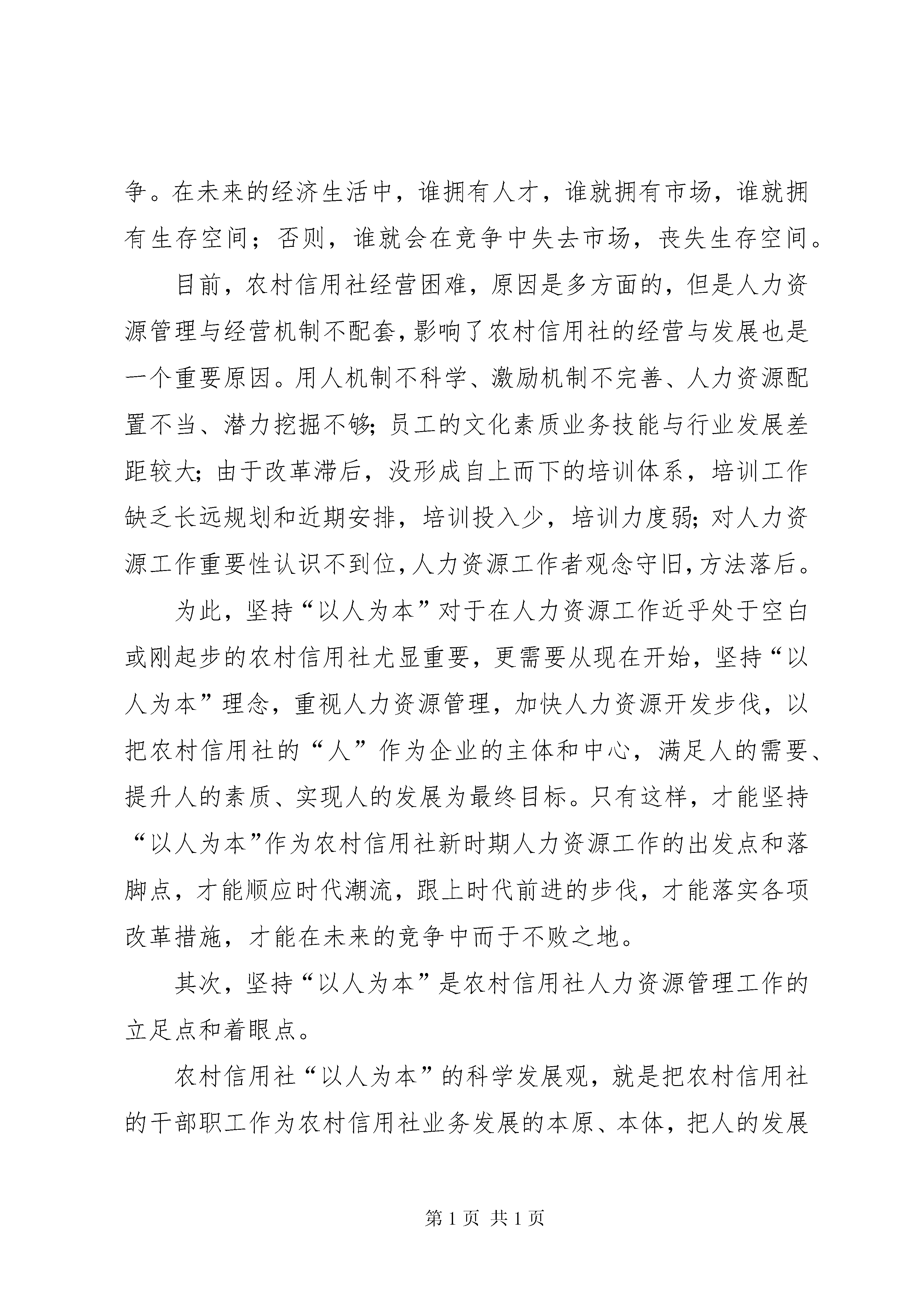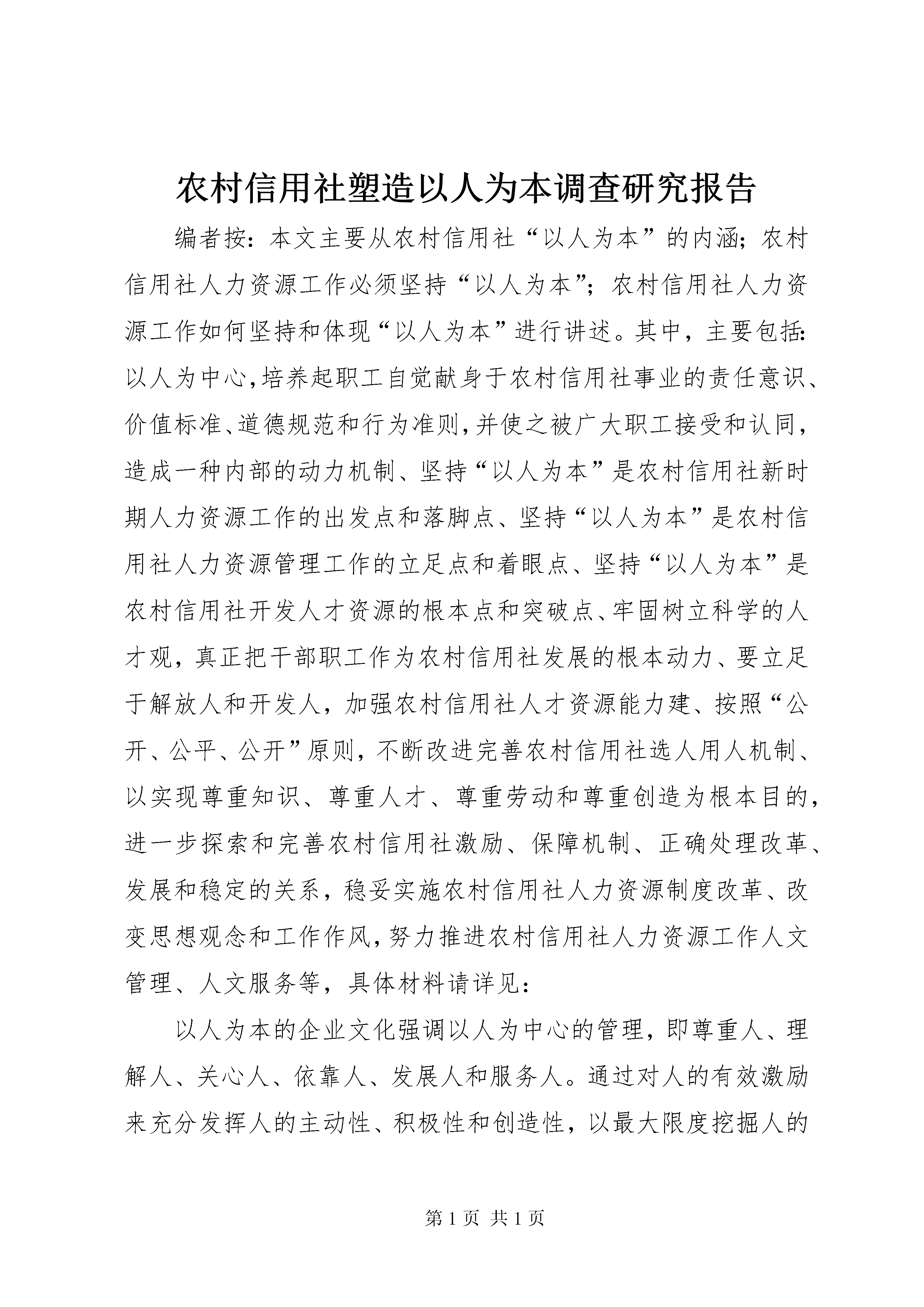 农村信用社塑造以人为本调查研究报告编者按:本文主要从农村信用社“以人为本”的内涵;农村信用社人力资源工作必须坚持“以人为本”;农村信用社人力资源工作如何坚持和体现“以人为本”进行讲述。其中,主要包括:以人为中心,培养起职工自觉献身于农村信用社事业的责任意识、价值标准、道德规范和行为准则,并使之被广大职工接受和认同,造成一种内部的动力机制、坚持“以人为本”是农村信用社新时期人力资源工作的出发点和落脚点、坚持“以人为本”是农村信用社人力资源管理工作的立足点和着眼点、坚持“以人为本”是农村信用社开发人才资源的根本点和突破点、牢固树立科学的人才观,真正把干部职工作为农村信用社发展的根本动力、要立足于解放人和开发人,加强农村信用社人才资源能力建、按照“公开、公平、公开”原则,不断改进完善农村信用社选人用人机制、以实现尊重知识、尊重人才、尊重劳动和尊重创造为根本目的,进一步探索和完善农村信用社激励、保障机制、正确处理改革、发展和稳定的关系,稳妥实施农村信用社人力资源制度改革、改变思想观念和工作作风,努力推进农村信用社人力资源工作人文管理、人文服务等,具体材料请详见:以人为本的企业文化强调以人为中心的管理,即尊重人、理解人、关心人、依靠人、发展人和服务人。通过对人的有效激励来充分发挥人的主动性、积极性和创造性,以最大限度挖掘人的潜能,来更好地实现个人目标和组织目标的契合。农村信用社如何塑造以人为本的企业文化是新时期人力资源工作的内在要求,农村信用社人力资源工作怎样才能体现以人为本。本文谈点粗浅的看法。一、农村信用社“以人为本”的内涵以胡锦涛同志为总书记的党中央明确提出坚持“以人为本”,树立全面、协调、可持续的发展观。坚持“以人为本”,这是科学发展观的本质要求,也是经济社会发展中必须长期坚持的一个指导思想。什么是“以人为本”。“以人为本”就是要把人民的利益作为一切工作的出发点和落脚点,不断满足人们的多方面需求和实现人的全面发展。具体说,就是在经济发展的基础上,不断提高人民群众的物质文化生活和健康水平;就是要尊重和保障人权,包括公民的政治、经济、文化权利;就是要不断提高人们的思想道德素质、科学文化素质和健康素质;就是要创造人们平等发展,充分发挥聪明才智的社会环境。农村信用社从无到有,由弱到强,历经五十多年的发展,积淀了丰富的企业文化,在新时期“以人为本”更具有十分丰富的内涵。即以人为中心,培养起职工自觉献身于农村信用社事业的责任意识、价值标准、道德规范和行为准则,并使之被广大职工接受和认同,造成一种内部的动力机制。其主要内容包括:在业务发展的基础上,不断提高农村信用社干部职工物质文化生活水平和健康水平,是“以人为本”的基础;以人为中心,维护干部职工的尊严,尊重和保护干部职工权益,是“以人为本”的核心;不断提高干部职工的思想道德素质、科学文化素质和健康素质,是“以人为本”的要求;创造干部职工平等发展,充分发挥聪明才智的工作生活环境,是“以人为本”的保证;依靠干部职工,使最大多数的人成为农村信用社发展成果的支配者与享用者,是“以人为本”的目的。二、农村信用社人力资源工作必须坚持“以人为本”“以人为本”思想植根于中国优秀传统文化的土壤,它体现了马克思主义的基本原理,反映了当今时代发展的迫切要求,凸现了中国特色社会主义的发展理念、执政理念和价值理念。因此,“以人为本”应该说不仅是科学发展观的本质,是科学人才观的核心,而且也是人力资源工作的灵魂。首先,坚持“以人为本”是农村信用社新时期人力资源工作的出发点和落脚点。相对于物质资源,人力资源是一种最宝贵、最重要的资源。这是因为资源和资本竞争的时代已逐步被劳动者的勤劳与素质以及由劳动力素质而决定的科学技术所代替。世界上许多国家把发展的重点和目标不约而同地集中在人力资源的有效利用上。在金融领域,人们也认识到激烈的市场竞争首当其冲的是人才的竞争。在未来的经济生活中,谁拥有人才,谁就拥有市场,谁就拥有生存空间;否则,谁就会在竞争中失去市场,丧失生存空间。目前,农村信用社经营困难,原因是多方面的,但是人力资源管理与经营机制不配套,影响了农村信用社的经营与发展也是一个重要原因。用人机制不科学、激励机制不完善、人力资源配置不当、潜力挖掘不够;员工的文化素质业务技能与行业发展差距较大;由于改革滞后,没形成自上而下的培训体系,培训工作缺乏长远规划和近期安排,培训投入少,培训力度弱;对人力资源工作重要性认识不到位,人力资源工作者观念守旧,方法落后。为此,坚持“以人为本”对于在人力资源工作近乎处于空白或刚起步的农村信用社尤显重要,更需要从现在开始,坚持“以人为本”理念,重视人力资源管理,加快人力资源开发步伐,以把农村信用社的“人”作为企业的主体和中心,满足人的需要、提升人的素质、实现人的发展为最终目标。
