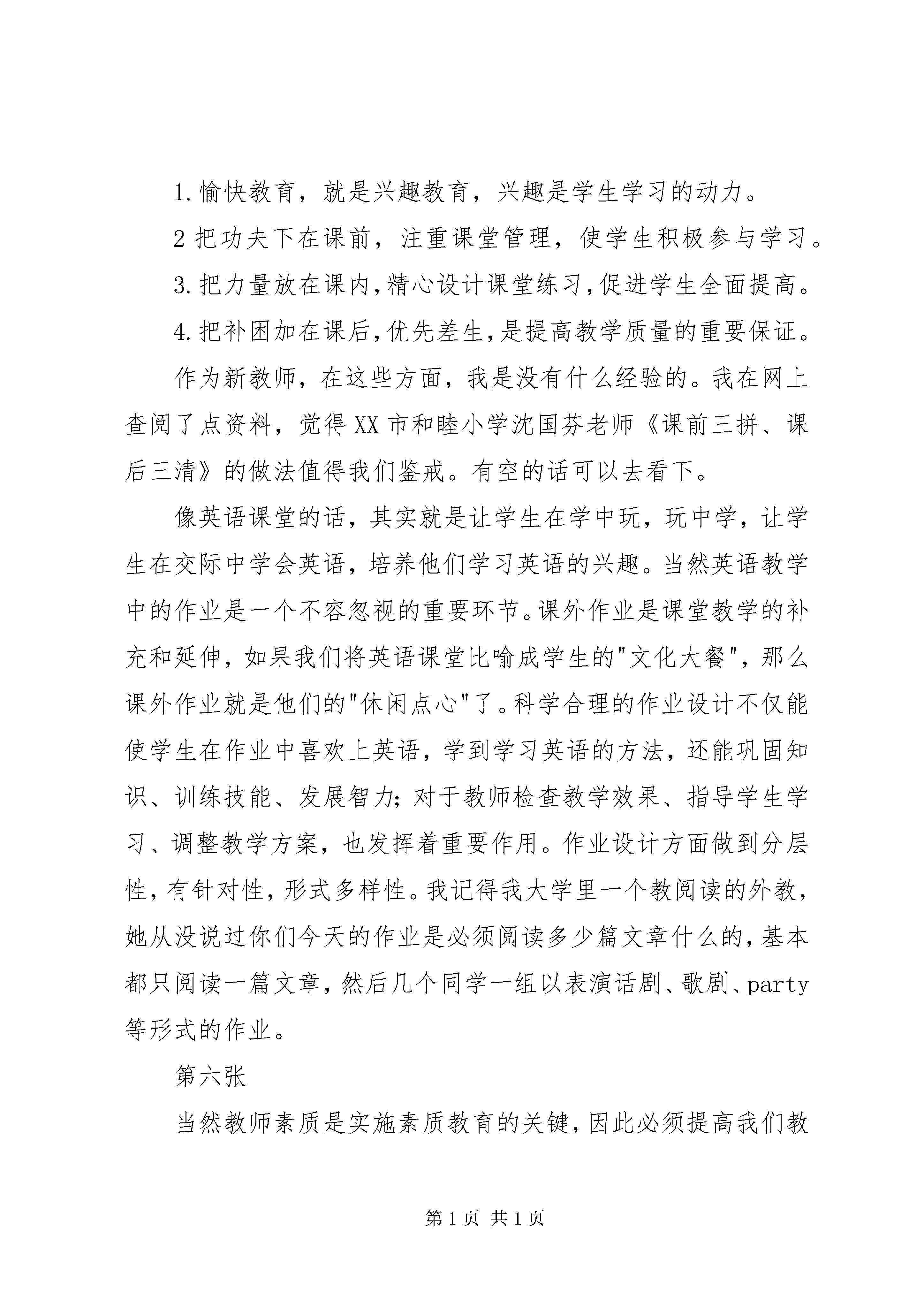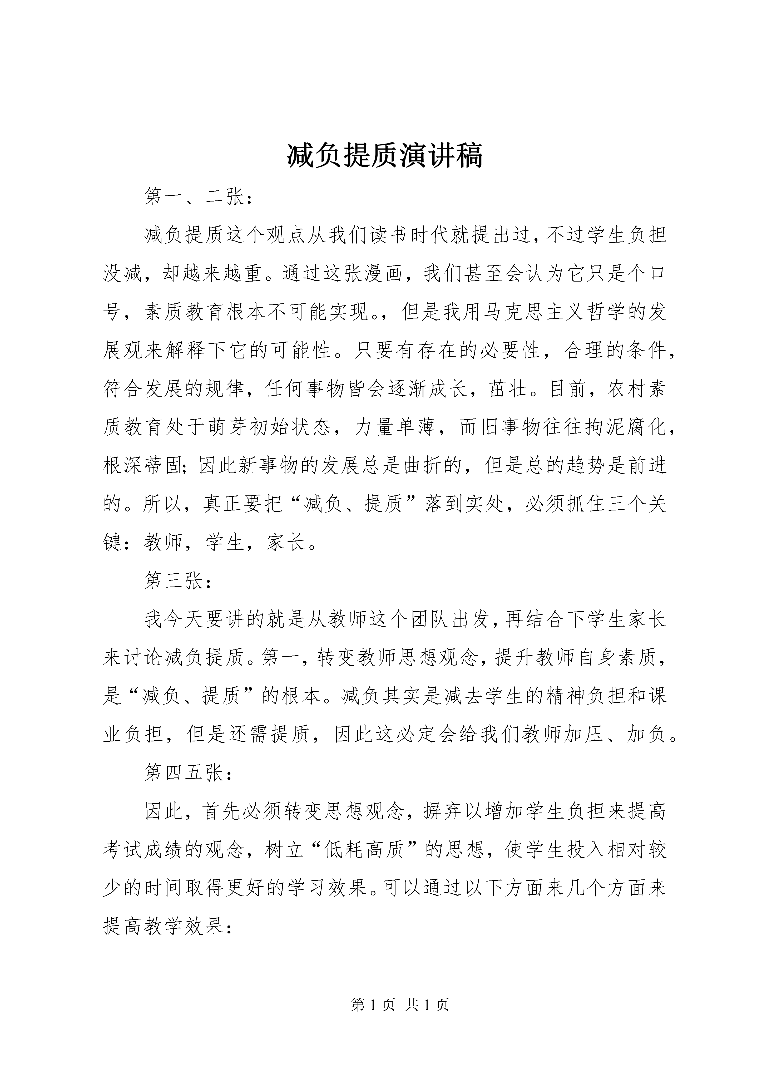 减负提质演讲稿第一、二张:减负提质这个观点从我们读书时代就提出过,不过学生负担没减,却越来越重。通过这张漫画,我们甚至会认为它只是个口号,素质教育根本不可能实现。,但是我用马克思主义哲学的发展观来解释下它的可能性。只要有存在的必要性,合理的条件,符合发展的规律,任何事物皆会逐渐成长,茁壮。目前,农村素质教育处于萌芽初始状态,力量单薄,而旧事物往往拘泥腐化,根深蒂固;因此新事物的发展总是曲折的,但是总的趋势是前进的。所以,真正要把“减负、提质”落到实处,必须抓住三个关键:教师,学生,家长。第三张:我今天要讲的就是从教师这个团队出发,再结合下学生家长来讨论减负提质。第一,转变教师思想观念,提升教师自身素质,是“减负、提质”的根本。减负其实是减去学生的精神负担和课业负担,但是还需提质,因此这必定会给我们教师加压、加负。第四五张:因此,首先必须转变思想观念,摒弃以增加学生负担来提高考试成绩的观念,树立“低耗高质”的思想,使学生投入相对较少的时间取得更好的学习效果。可以通过以下方面来几个方面来提高教学效果:1.愉快教育,就是兴趣教育,兴趣是学生学习的动力。2把功夫下在课前,注重课堂管理,使学生积极参与学习。3.把力量放在课内,精心设计课堂练习,促进学生全面提高。4.把补困加在课后,优先差生,是提高教学质量的重要保证。作为新教师,在这些方面,我是没有什么经验的。我在网上查阅了点资料,觉得XX市和睦小学沈国芬老师《课前三拼、课后三清》的做法值得我们鉴戒。有空的话可以去看下。像英语课堂的话,其实就是让学生在学中玩,玩中学,让学生在交际中学会英语,培养他们学习英语的兴趣。当然英语教学中的作业是一个不容忽视的重要环节。课外作业是课堂教学的补充和延伸,如果我们将英语课堂比喻成学生的"文化大餐",那么课外作业就是他们的"休闲点心"了。科学合理的作业设计不仅能使学生在作业中喜欢上英语,学到学习英语的方法,还能巩固知识、训练技能、发展智力;对于教师检查教学效果、指导学生学习、调整教学方案,也发挥着重要作用。作业设计方面做到分层性,有针对性,形式多样性。我记得我大学里一个教阅读的外教,她从没说过你们今天的作业是必须阅读多少篇文章什么的,基本都只阅读一篇文章,然后几个同学一组以表演话剧、歌剧、party等形式的作业。第六张当然教师素质是实施素质教育的关键,因此必须提高我们教师的素质。第七张第二大点增强学生学习动力,养成良好的学习习惯是“减负、提质”的保障1.挖掘学生潜能,彰显学生特色。①做好学生的思想工作,发挥学生的主观能动性,增强学生学习的动力。②学生发展注重因材施教,彰显学生特色,是实现以人为本的科学发展观的具体体现。2.促使学生养成良好的学习习惯,发展智力,提高能力。第八张第三,教师还必须大力宣传减负提质的实质,家校配合实现“减负增效”。这副漫画就充分反应了教师和家长的不配合,教师虽然减少了作业,但是望子成龙的家长却忧心忡忡,生怕“减负”后影响子女的学业,耽误前程,于是请家教,报补习班,不仅将“减负”所得的空余时间利用起来,而且连节假日都安排满满的。因此教师应及时向家长传到减负提质的思想,并引导和帮助家长怎么养成学生良好的学习习惯。o1.预习的习惯。o2.记笔记并事后整理的习惯。o3.课后复习的习惯。复习的目的是“温故而知新”。o4.独立解决问题的习惯。o5.及时改错的习惯。o6.认真书写的习惯。o7.认真观察、思索的习惯。o8.积极阅读、写作的习惯。o9.养成有条理的习惯。o10.培养孩子主动学习的习惯。让我们给工作一份热情、一份激情、一颗童心、一颗平常心,努力学习,快乐工作,我们的人生价值将在学生身上得以体现,我们的生命长河将在学生身上得以延伸