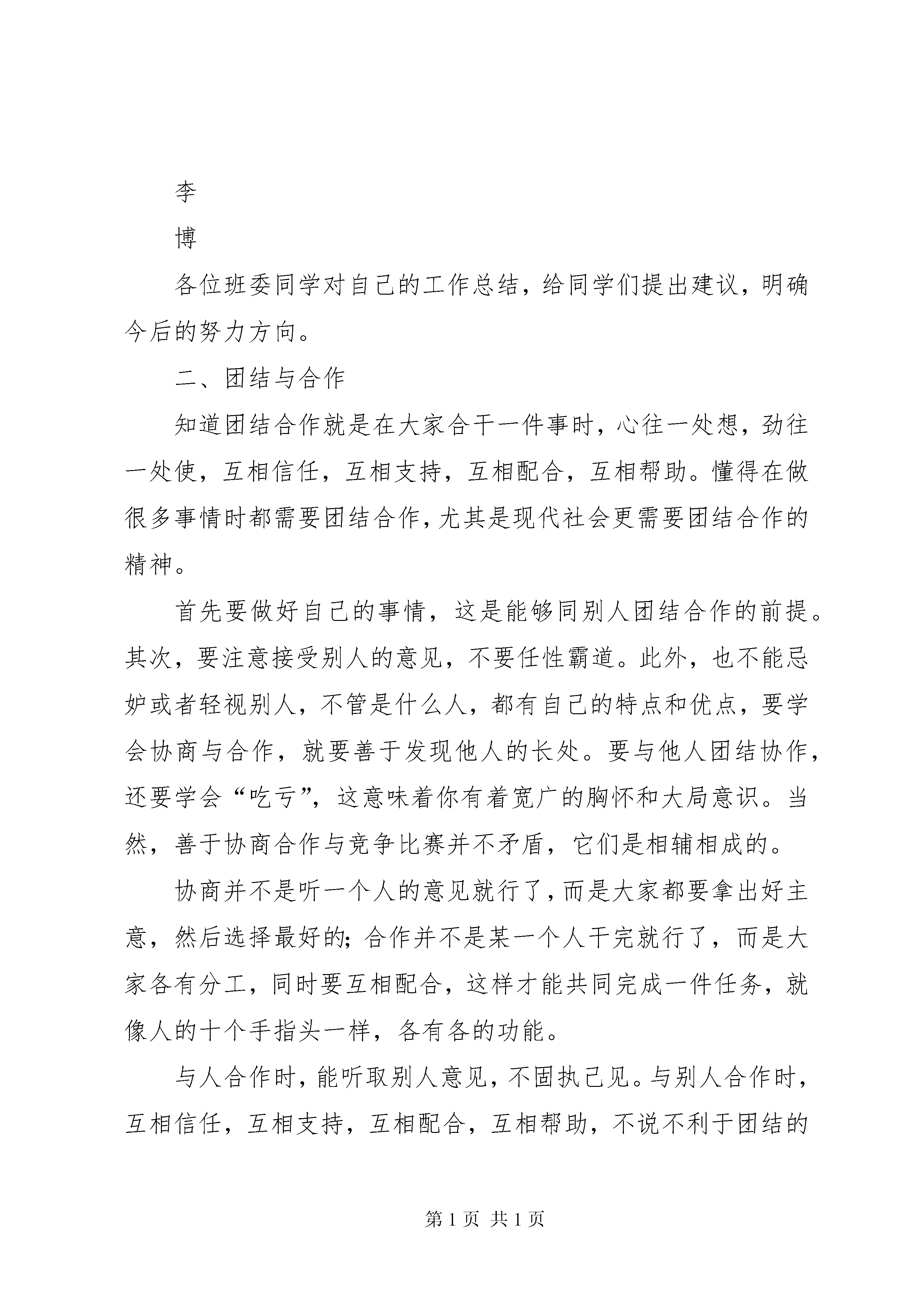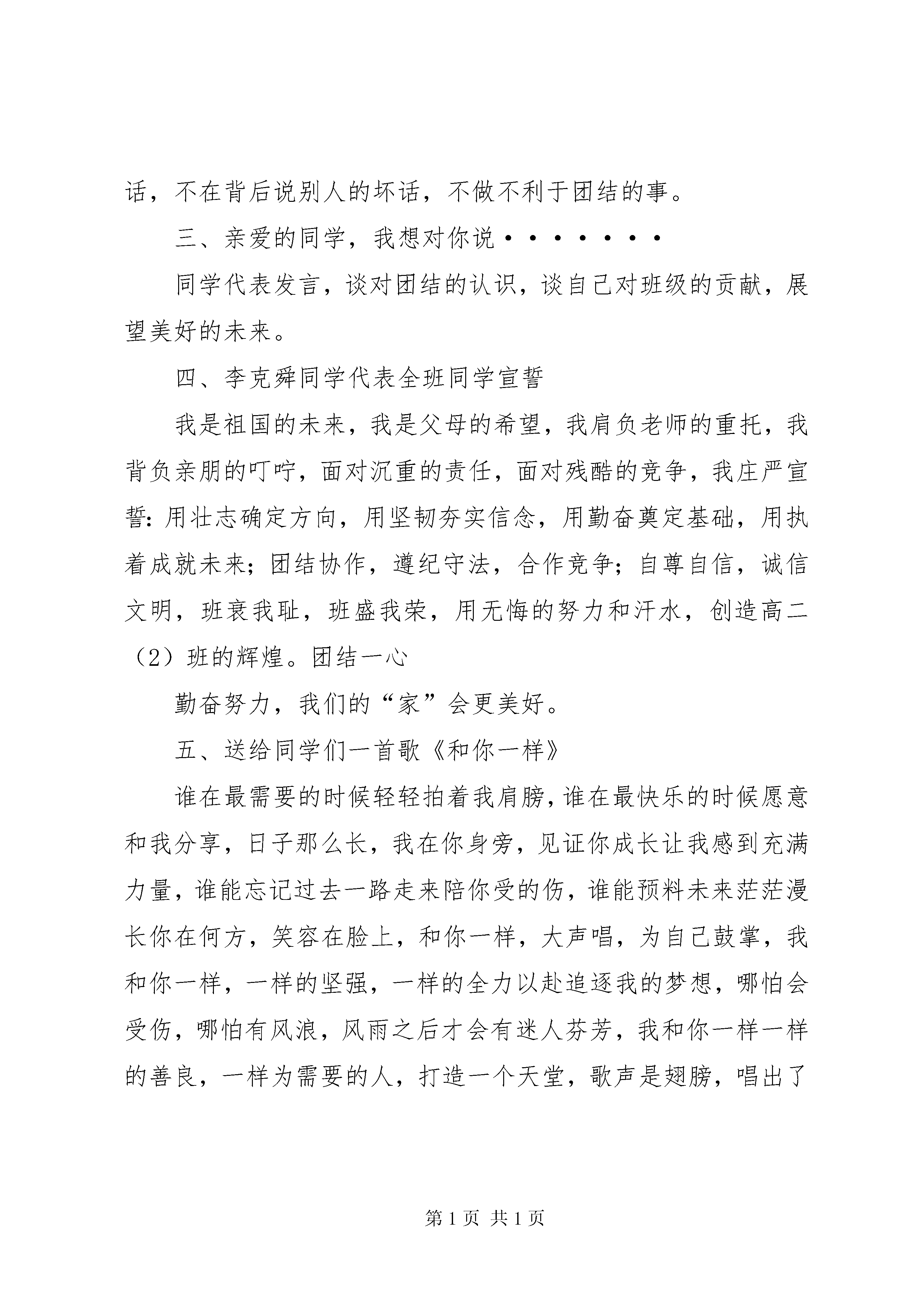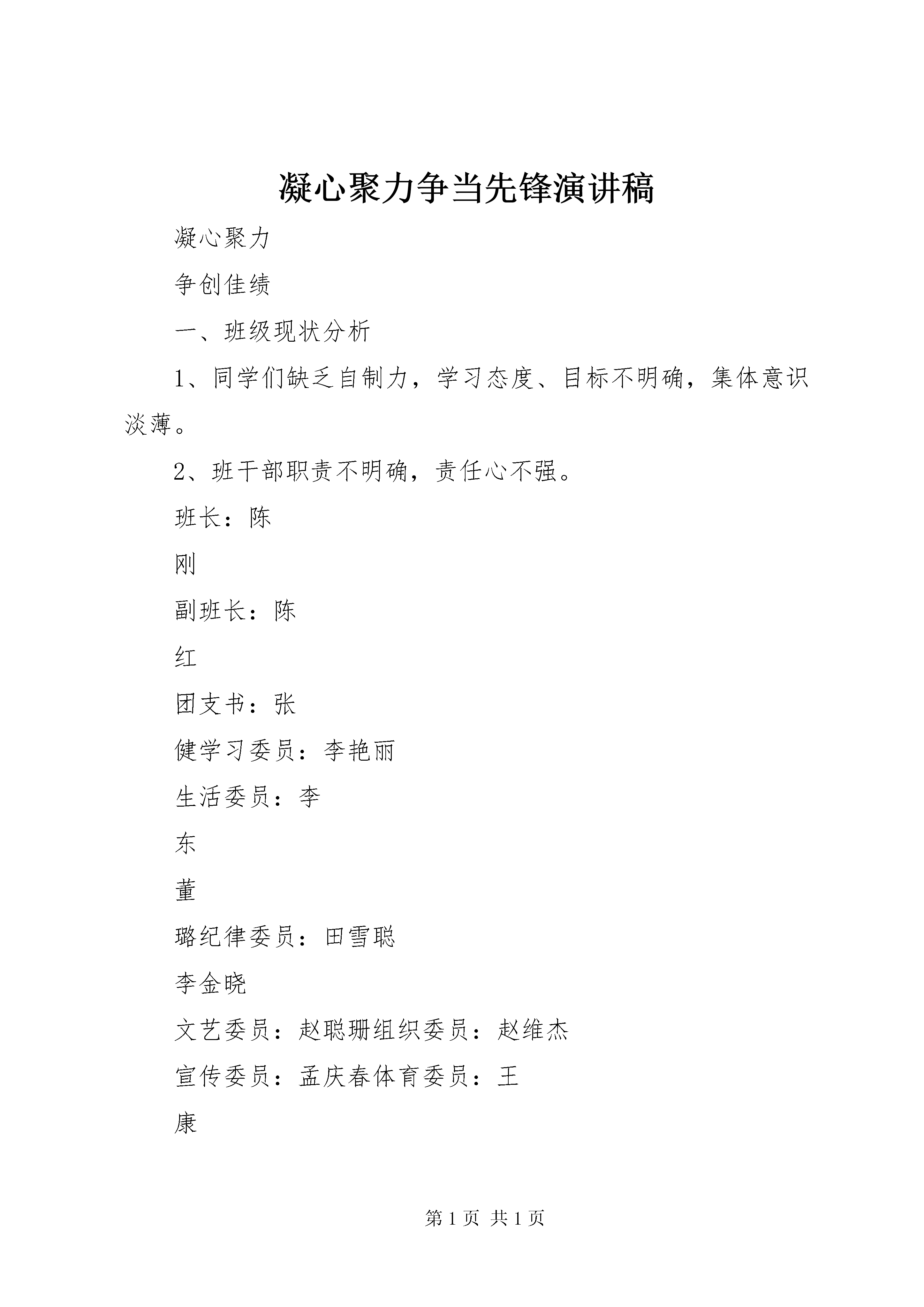 凝心聚力争当先锋演讲稿凝心聚力争创佳绩一、班级现状分析1、同学们缺乏自制力,学习态度、目标不明确,集体意识淡薄。2、班干部职责不明确,责任心不强。班长:陈刚副班长:陈红团支书:张健学习委员:李艳丽生活委员:李东董璐纪律委员:田雪聪李金晓文艺委员:赵聪珊组织委员:赵维杰宣传委员:孟庆春体育委员:王康李博各位班委同学对自己的工作总结,给同学们提出建议,明确今后的努力方向。二、团结与合作知道团结合作就是在大家合干一件事时,心往一处想,劲往一处使,互相信任,互相支持,互相配合,互相帮助。懂得在做很多事情时都需要团结合作,尤其是现代社会更需要团结合作的精神。首先要做好自己的事情,这是能够同别人团结合作的前提。其次,要注意接受别人的意见,不要任性霸道。此外,也不能忌妒或者轻视别人,不管是什么人,都有自己的特点和优点,要学会协商与合作,就要善于发现他人的长处。要与他人团结协作,还要学会“吃亏”,这意味着你有着宽广的胸怀和大局意识。当然,善于协商合作与竞争比赛并不矛盾,它们是相辅相成的。协商并不是听一个人的意见就行了,而是大家都要拿出好主意,然后选择最好的;合作并不是某一个人干完就行了,而是大家各有分工,同时要互相配合,这样才能共同完成一件任务,就像人的十个手指头一样,各有各的功能。与人合作时,能听取别人意见,不固执己见。与别人合作时,互相信任,互相支持,互相配合,互相帮助,不说不利于团结的话,不在背后说别人的坏话,不做不利于团结的事。三、亲爱的同学,我想对你说·······同学代表发言,谈对团结的认识,谈自己对班级的贡献,展望美好的未来。四、李克舜同学代表全班同学宣誓我是祖国的未来,我是父母的希望,我肩负老师的重托,我背负亲朋的叮咛,面对沉重的责任,面对残酷的竞争,我庄严宣誓:用壮志确定方向,用坚韧夯实信念,用勤奋奠定基础,用执着成就未来;团结协作,遵纪守法,合作竞争;自尊自信,诚信文明,班衰我耻,班盛我荣,用无悔的努力和汗水,创造高二(2)班的辉煌。团结一心勤奋努力,我们的“家”会更美好。五、送给同学们一首歌《和你一样》谁在最需要的时候轻轻拍着我肩膀,谁在最快乐的时候愿意和我分享,日子那么长,我在你身旁,见证你成长让我感到充满力量,谁能忘记过去一路走来陪你受的伤,谁能预料未来茫茫漫长你在何方,笑容在脸上,和你一样,大声唱,为自己鼓掌,我和你一样,一样的坚强,一样的全力以赴追逐我的梦想,哪怕会受伤,哪怕有风浪,风雨之后才会有迷人芬芳,我和你一样一样的善良,一样为需要的人,打造一个天堂,歌声是翅膀,唱出了希望,所有的付出只因爱的力量,和你一样。