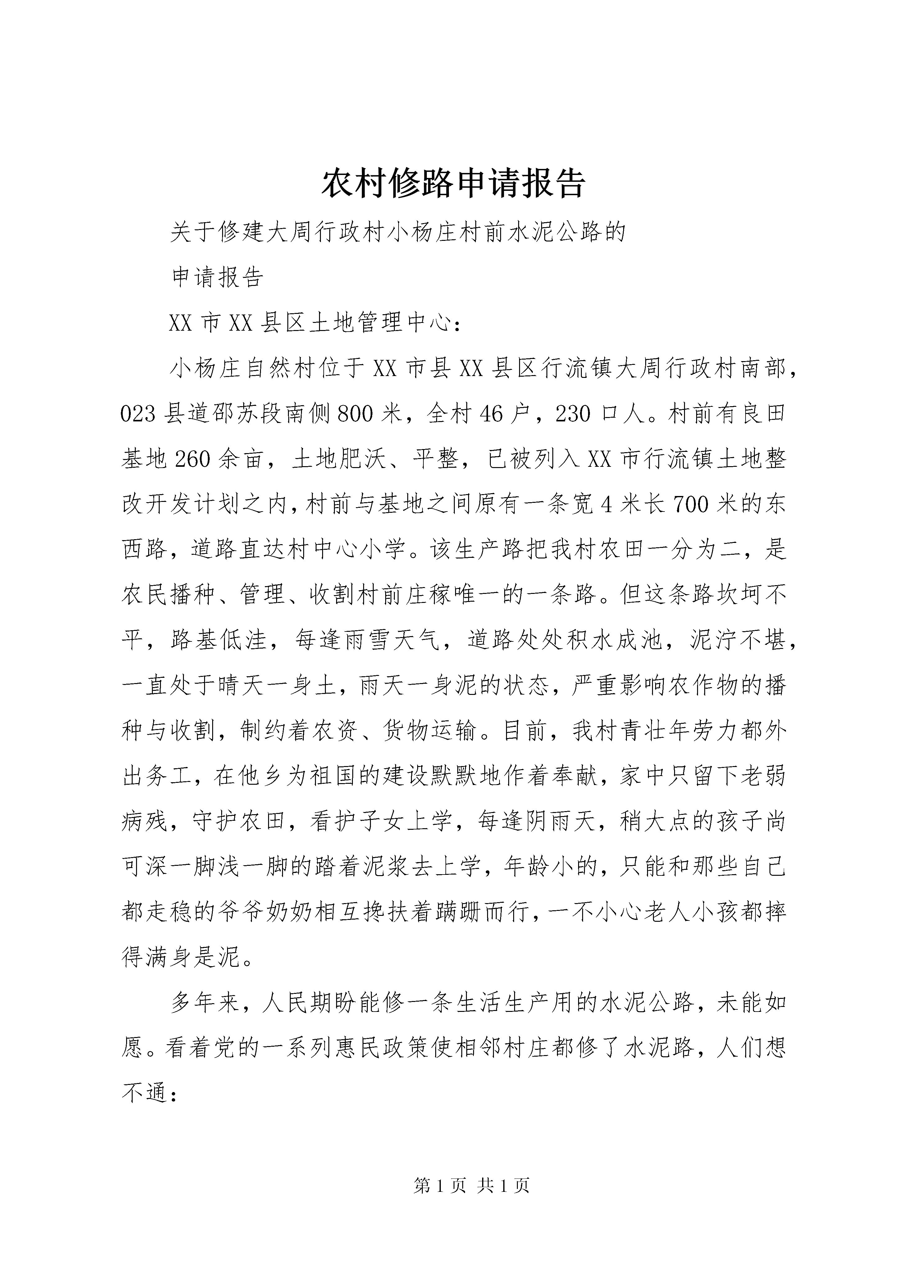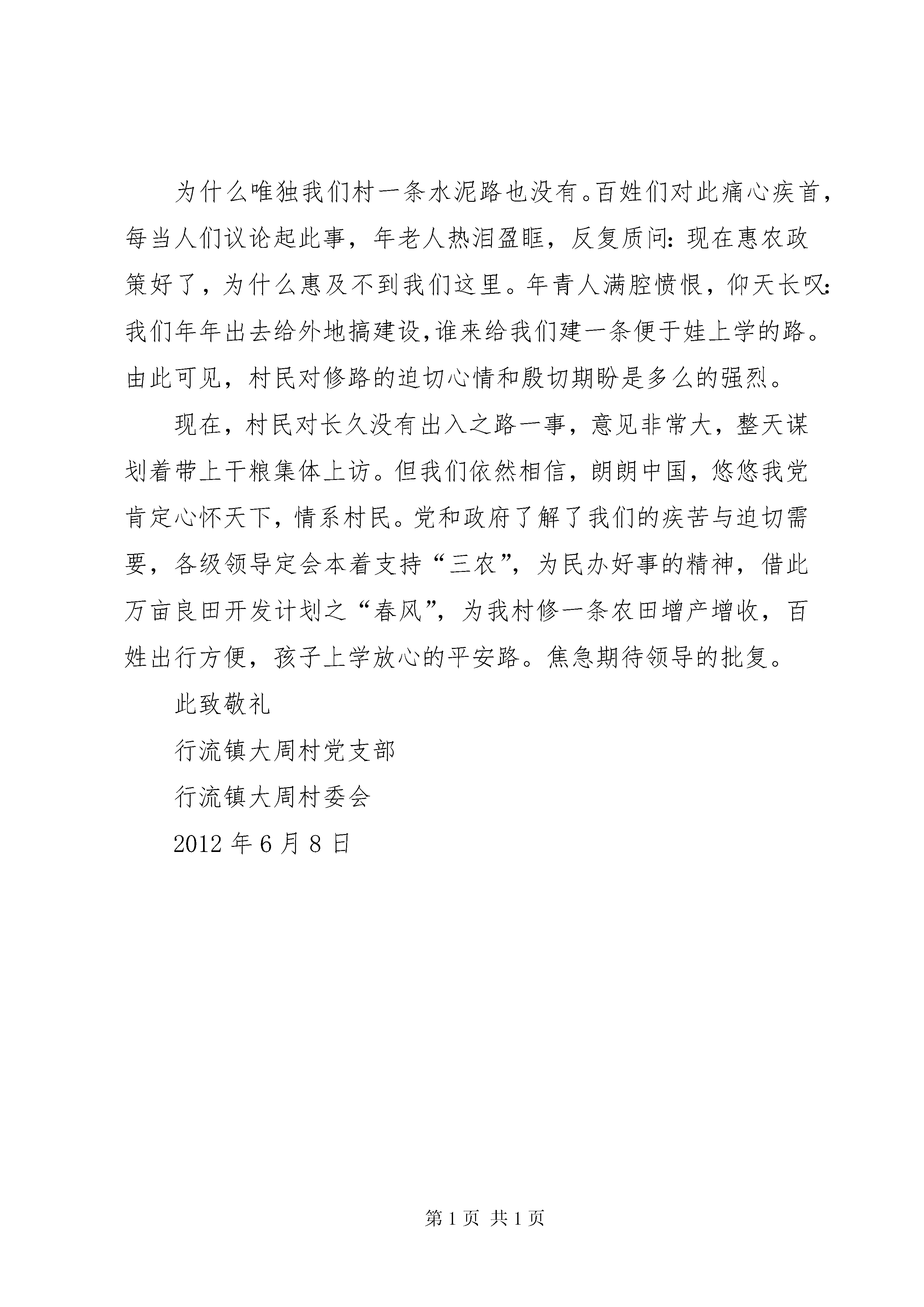 农村修路申请报告关于修建大周行政村小杨庄村前水泥公路的申请报告XX市XX县区土地管理中心:小杨庄自然村位于XX市县XX县区行流镇大周行政村南部,023县道邵苏段南侧800米,全村46户,230口人。村前有良田基地260余亩,土地肥沃、平整,已被列入XX市行流镇土地整改开发计划之内,村前与基地之间原有一条宽4米长700米的东西路,道路直达村中心小学。该生产路把我村农田一分为二,是农民播种、管理、收割村前庄稼唯一的一条路。但这条路坎坷不平,路基低洼,每逢雨雪天气,道路处处积水成池,泥泞不堪,一直处于晴天一身土,雨天一身泥的状态,严重影响农作物的播种与收割,制约着农资、货物运输。目前,我村青壮年劳力都外出务工,在他乡为祖国的建设默默地作着奉献,家中只留下老弱病残,守护农田,看护子女上学,每逢阴雨天,稍大点的孩子尚可深一脚浅一脚的踏着泥浆去上学,年龄小的,只能和那些自己都走稳的爷爷奶奶相互搀扶着蹒跚而行,一不小心老人小孩都摔得满身是泥。多年来,人民期盼能修一条生活生产用的水泥公路,未能如愿。看着党的一系列惠民政策使相邻村庄都修了水泥路,人们想不通:为什么唯独我们村一条水泥路也没有。百姓们对此痛心疾首,每当人们议论起此事,年老人热泪盈眶,反复质问:现在惠农政策好了,为什么惠及不到我们这里。年青人满腔愤恨,仰天长叹:我们年年出去给外地搞建设,谁来给我们建一条便于娃上学的路。由此可见,村民对修路的迫切心情和殷切期盼是多么的强烈。现在,村民对长久没有出入之路一事,意见非常大,整天谋划着带上干粮集体上访。但我们依然相信,朗朗中国,悠悠我党肯定心怀天下,情系村民。党和政府了解了我们的疾苦与迫切需要,各级领导定会本着支持“三农”,为民办好事的精神,借此万亩良田开发计划之“春风”,为我村修一条农田增产增收,百姓出行方便,孩子上学放心的平安路。焦急期待领导的批复。此致敬礼行流镇大周村党支部行流镇大周村委会2012年6月8日