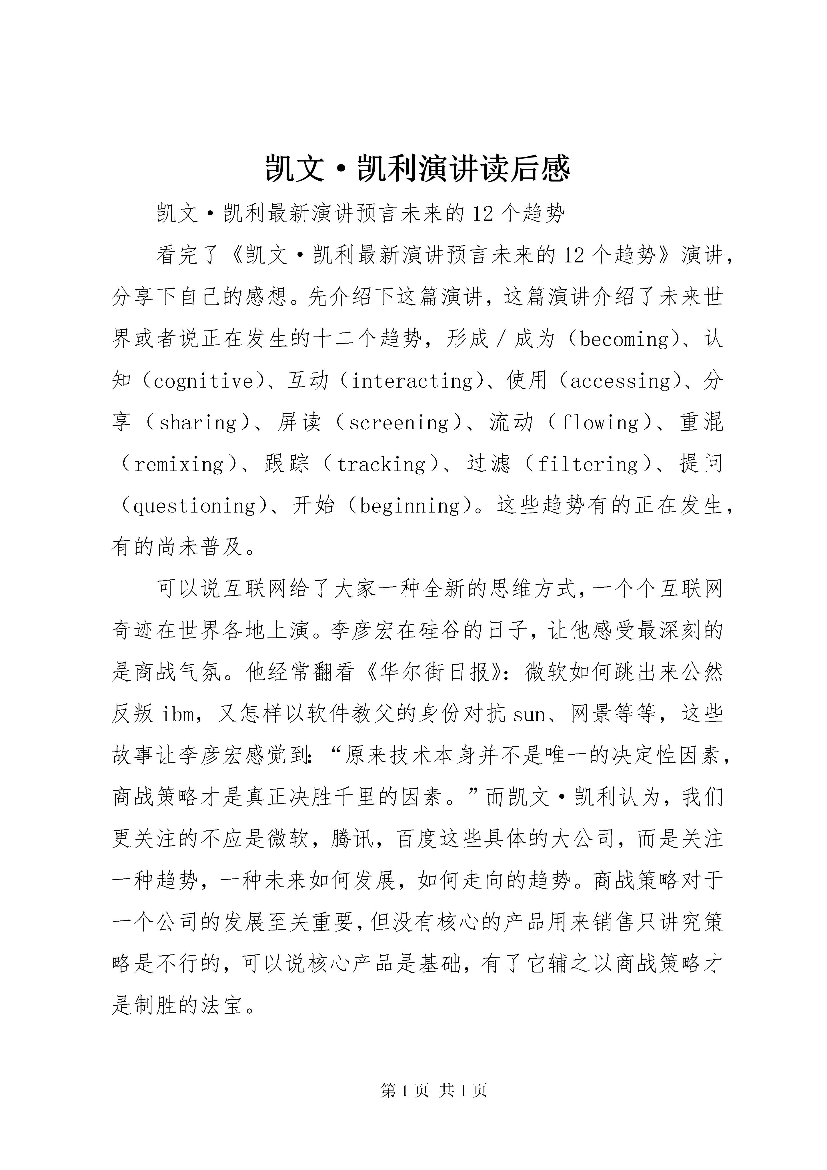凯文·凯利演讲读后感凯文·凯利最新演讲预言未来的12个趋势看完了《凯文·凯利最新演讲预言未来的12个趋势》演讲,分享下自己的感想。先介绍下这篇演讲,这篇演讲介绍了未来世界或者说正在发生的十二个趋势,形成/成为(becoming)、认知(cognitive)、互动(interacting)、使用(accessing)、分享(sharing)、屏读(screening)、流动(flowing)、重混(remixing)、跟踪(tracking)、过滤(filtering)、提问(questioning)、开始(beginning)。这些趋势有的正在发生,有的尚未普及。可以说互联网给了大家一种全新的思维方式,一个个互联网奇迹在世界各地上演。李彦宏在硅谷的日子,让他感受最深刻的是商战气氛。他经常翻看《华尔街日报》:微软如何跳出来公然反叛ibm,又怎样以软件教父的身份对抗sun、网景等等,这些故事让李彦宏感觉到:“原来技术本身并不是唯一的决定性因素,商战策略才是真正决胜千里的因素。”而凯文·凯利认为,我们更关注的不应是微软,腾讯,百度这些具体的大公司,而是关注一种趋势,一种未来如何发展,如何走向的趋势。商战策略对于一个公司的发展至关重要,但没有核心的产品用来销售只讲究策略是不行的,可以说核心产品是基础,有了它辅之以商战策略才是制胜的法宝。而核心产品从哪里来,在互联网模式下,产品更新换代如此之快。天下武功,唯快不破。只有关注未来发展的趋势,研究未来的趋势,走在他人前列,才能让企业立于不败之地。其实我们可以通过诺基亚的辉煌与没落看出来,一百多年前,诺基亚公司还只是一家纸浆厂。一百多年后,在智能机出现之前,诺基亚成为了全球手机龙头行业,这一繁荣持续了十二年。而后来到2007年,不仅是全球次贷危机的前奏,也是苹果推出智能手机的开端。随后加上安卓与苹果的左右夹击,诺基亚手机的牢固位置一下子似乎更适合存放在消费者的记忆里。诺基亚开始没落,直至被微软收购。诺基亚没落的原因,则与管理层的盲目与自大,被眼前的成功与光环蒙住了视觉,没有很好的预见到未来的发展趋势,低谷了竞争对手的真正实力不无关系。而未来的趋势是怎样的呢。演讲中,凯文·凯利介绍了人工智能、虚拟现实以及流等未来最具颠覆的变化趋势。我觉得智能是贯穿到十一种趋势里面的。凯文·凯利在演讲中提到“认知”,是使我们现在使用的这些东西更加的智能化,有些人认为是人工智能,但其实它包含很多东西包括图像的智能化。他认为,人工智能的发展会带来失业,比如无人驾驶汽车技术的进步,可能会导致到到2025年的时候,50%的开卡车的人不能开卡车了,但是也会创造一些新的工作职位,购买作为人工智能的商品,把人工智能和你要做的事情合在一起,就会变成很有价值的商品。透过演讲,我们可以知道,移动互联网的飞速发展使整个社会结构发生了根本性的变化,不仅仅是影响人的日常生活,对于整个公司的组织结构以及整个企业的运营方式都带来巨大的变化,也随之衍生出很多新的商业模式。正如凯文·凯利所说,我们会看到未来的很多趋势,这是非常重要的一点,如果理解这一点那么我们就可以有很多的成功,如果我们的社会朝着这个方向去走,我们就会拥抱这些变化,拥抱那些对我们有利的变化。最好的时候还未到来,而现在就是为那一刻到来做改变的时刻。