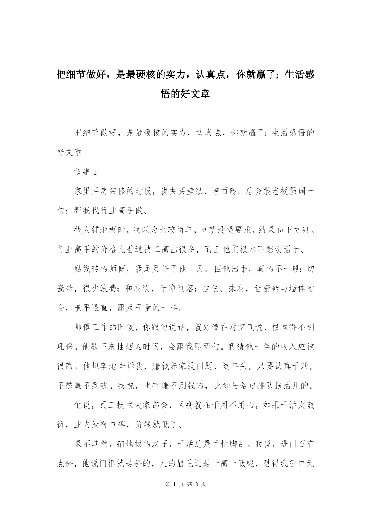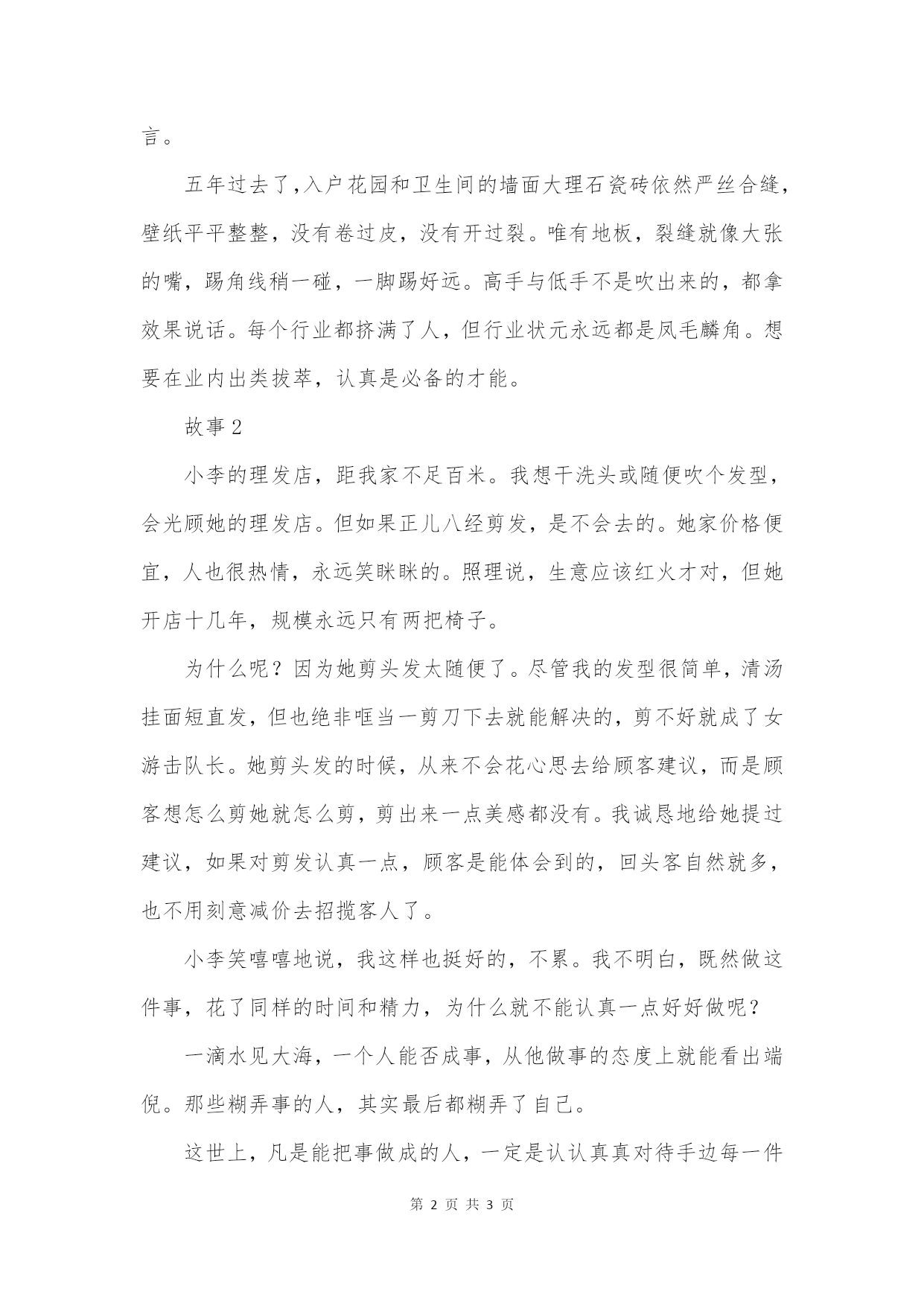 第PAGE\*MERGEFORMAT3页共NUMPAGES\*MERGEFORMAT3页把细节做好,是最硬核的实力,认真点,你就赢了;生活感悟的好文章把细节做好,是最硬核的实力,认真点,你就赢了;生活感悟的好文章故事1家里买房装修的时候,我去买壁纸、墙面砖,总会跟老板强调一句:帮我找行业高手做。找人铺地板时,我以为比较简单,也就没提要求,结果高下立判。行业高手的价格比普通技工高出很多,而且他们根本不愁没活干。贴瓷砖的师傅,我足足等了他十天。但他出手,真的不一般:切瓷砖,很少浪费;和灰浆,干净利落;拉毛、抹灰,让瓷砖与墙体粘合,横平竖直,跟尺子量的一样。师傅工作的时候,你跟他说话,就好像在对空气说,根本得不到理睬。他歇下来抽烟的时候,会跟我聊两句。我猜他一年的收入应该很高。他坦率地告诉我,赚钱养家没问题,这年头,只要认真干活,不愁赚不到钱。我说,也有赚不到钱的,比如马路边排队揽活儿的。他说,瓦工技术大家都会,区别就在于用不用心,如果干活太敷衍,业内没有口碑,价钱就低了。果不其然,铺地板的汉子,干活总是手忙脚乱。我说,进门石有点斜,他说门框就是斜的,人的眉毛还是一高一低呢,怼得我哑口无言。五年过去了,入户花园和卫生间的墙面大理石瓷砖依然严丝合缝,壁纸平平整整,没有卷过皮,没有开过裂。唯有地板,裂缝就像大张的嘴,踢角线稍一碰,一脚踢好远。高手与低手不是吹出来的,都拿效果说话。每个行业都挤满了人,但行业状元永远都是凤毛麟角。想要在业内出类拔萃,认真是必备的才能。故事2小李的理发店,距我家不足百米。我想干洗头或随便吹个发型,会光顾她的理发店。但如果正儿八经剪发,是不会去的。她家价格便宜,人也很热情,永远笑眯眯的。照理说,生意应该红火才对,但她开店十几年,规模永远只有两把椅子。为什么呢?因为她剪头发太随便了。尽管我的发型很简单,清汤挂面短直发,但也绝非哐当一剪刀下去就能解决的,剪不好就成了女游击队长。她剪头发的时候,从来不会花心思去给顾客建议,而是顾客想怎么剪她就怎么剪,剪出来一点美感都没有。我诚恳地给她提过建议,如果对剪发认真一点,顾客是能体会到的,回头客自然就多,也不用刻意减价去招揽客人了。小李笑嘻嘻地说,我这样也挺好的,不累。我不明白,既然做这件事,花了同样的时间和精力,为什么就不能认真一点好好做呢?一滴水见大海,一个人能否成事,从他做事的态度上就能看出端倪。那些糊弄事的人,其实最后都糊弄了自己。这世上,凡是能把事做成的人,一定是认认真真对待手边每一件小事的人。故事3有一次跟朋友阿丹聊到一个话题:为什么在一个起点同时出发的人,不出一两年,便有人领先,到底是在哪个路口突然分流?这差距又是怎么形成的?阿丹说她的亲身体会是:那些被她远远地甩在后边的小伙伴,往往都是遇难关就后退的人,根本称不上对手。在前行的路上,她们一点点地落后,一点点地被筛掉了。而阿丹可以认认真真硬着头皮一直往前冲,她说,既然上路就要拼尽全力。阿丹18岁从农村出来,在一家四星级宾馆从洗衣工做起,别人不愿干的事,她会抢着干。她当客房服务员时,做床连包毛毯,不到两分钟,地区技术比武她连续两年都是第一名。她一步一个台阶,洗衣工、客房服务员、领班、经理,走到现在,自主创业,有了自己的连锁饭店。她认真努力的每一步都有迹可循。当初和她一块儿出门打工的小姐妹,至今仍在起跑线上奔忙,差别何止是几条街!造成天壤之别的,恰恰就是看似不起眼的“认真”二字。认真,是平庸与卓越的分水岭,造成了我们努力结果的千差万别。把细节做好,是最硬核的实力。认真点,你就赢了。