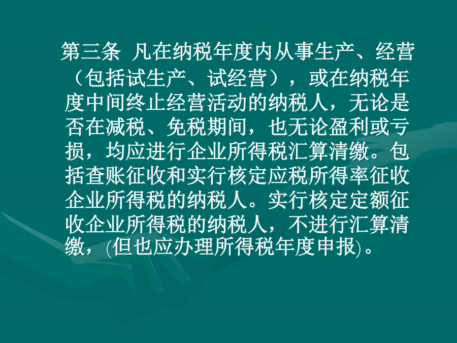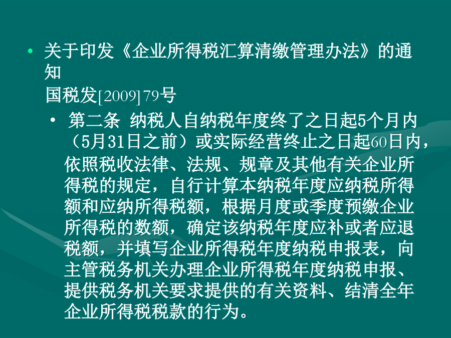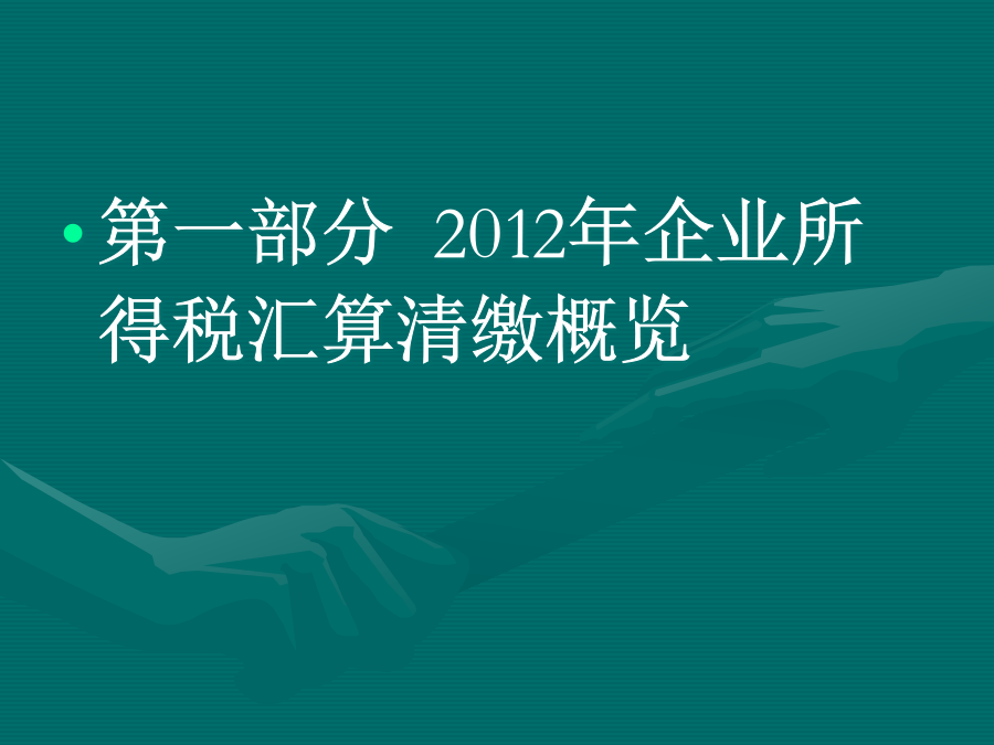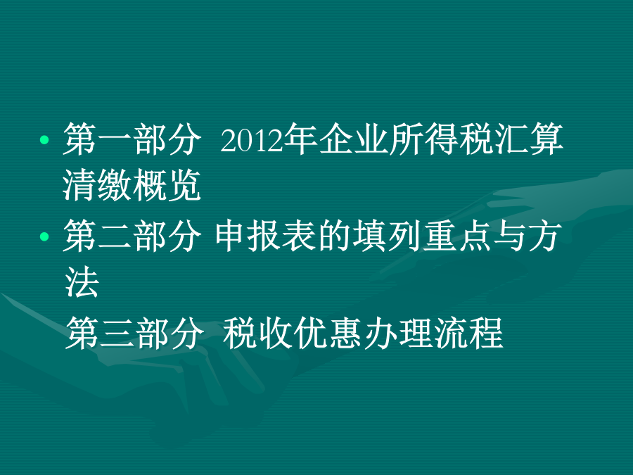 2012年企业所得税汇算清缴第二部分申报表的填列重点与方法一、利润总额的计算(一)附表一《收入明细表》《国家税务总局关于确认企业所得税收人若干问题的通知》(国税函[2008]875号):1.风险和报酬转移。2.企业对已售出的商品既没有保留通常与所有权相联系的继续管理权,也没有实施有效控制。3.金额能够可靠地计量。4.成本能够可靠地核算。不同销售方式下确认收入时间不作为广告费宣传费、招待费计提基数经营租赁:直线法税法(二)附表二《成本费用明细表》二应纳税所得额的计算(一)收入类调整项目(二)扣除类调整项目(三)资产类项目调整(四)准备金调整项目三、应纳税额的计算第三部分税收优惠办理流程(一)审批类(二)备案类