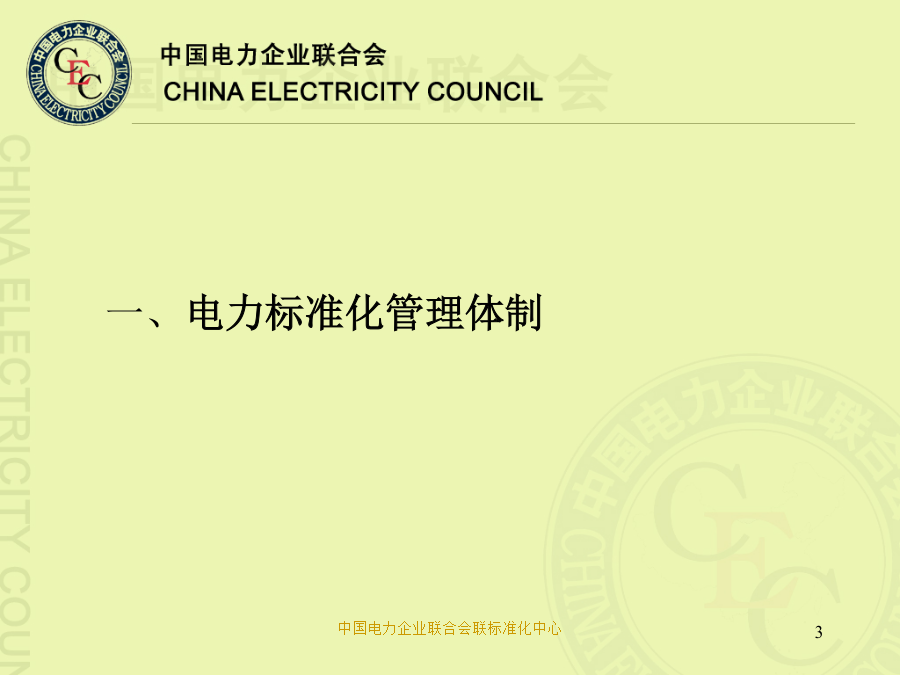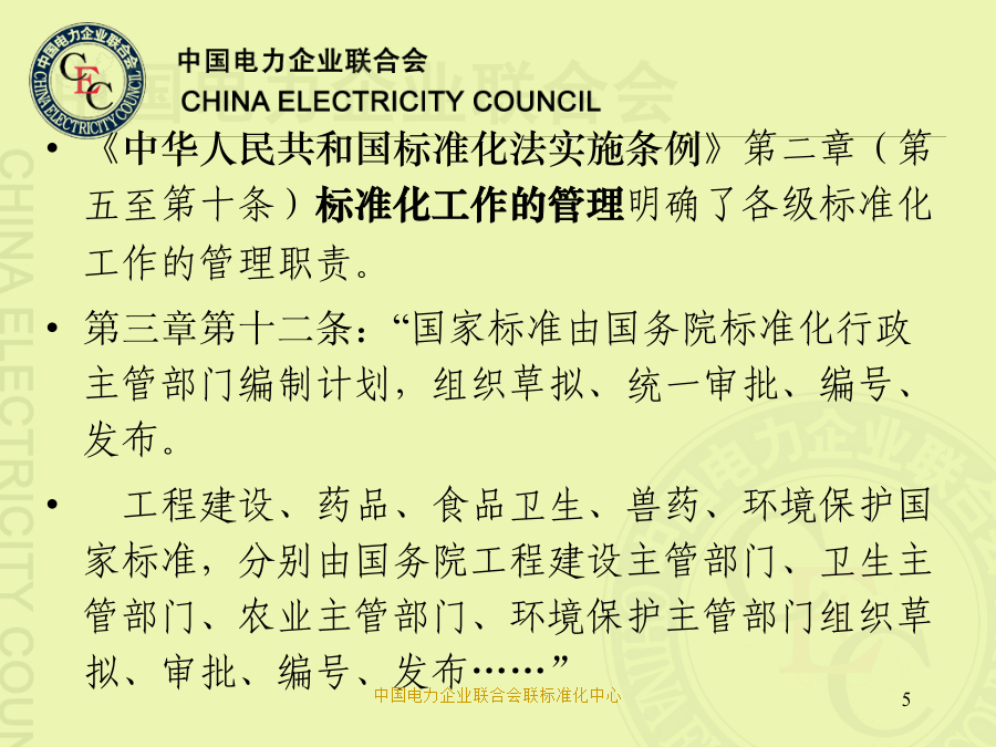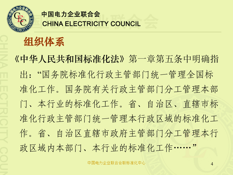 电力行业标准化与电力企业标准化建设发展现状中国质量技检疫总局术监督检验总局GeneralAdministrationofQualitySupervision,InspectionandQuarantineofthePeople'sRepublicofChina(AQSIQ)国家标准化管理委员会/住房与城乡建设部电力标准化管理体制标准化管理的分工电力标准化工作思路标准化管理的分工标准化管理的分工电力标委会及IEC/TC中国秘书处电力标准化的法规体系电力标准规章制度企业标准化定位电力标准化工作的现实意义电力企业标准化发展历程四、电力行业标准化建设的经验和体会建立和完善两个体系工作体系—组织机构、网络、规则是标准化活动的保障标准体系—文本梳理、收集、传递是标准化活动的依据