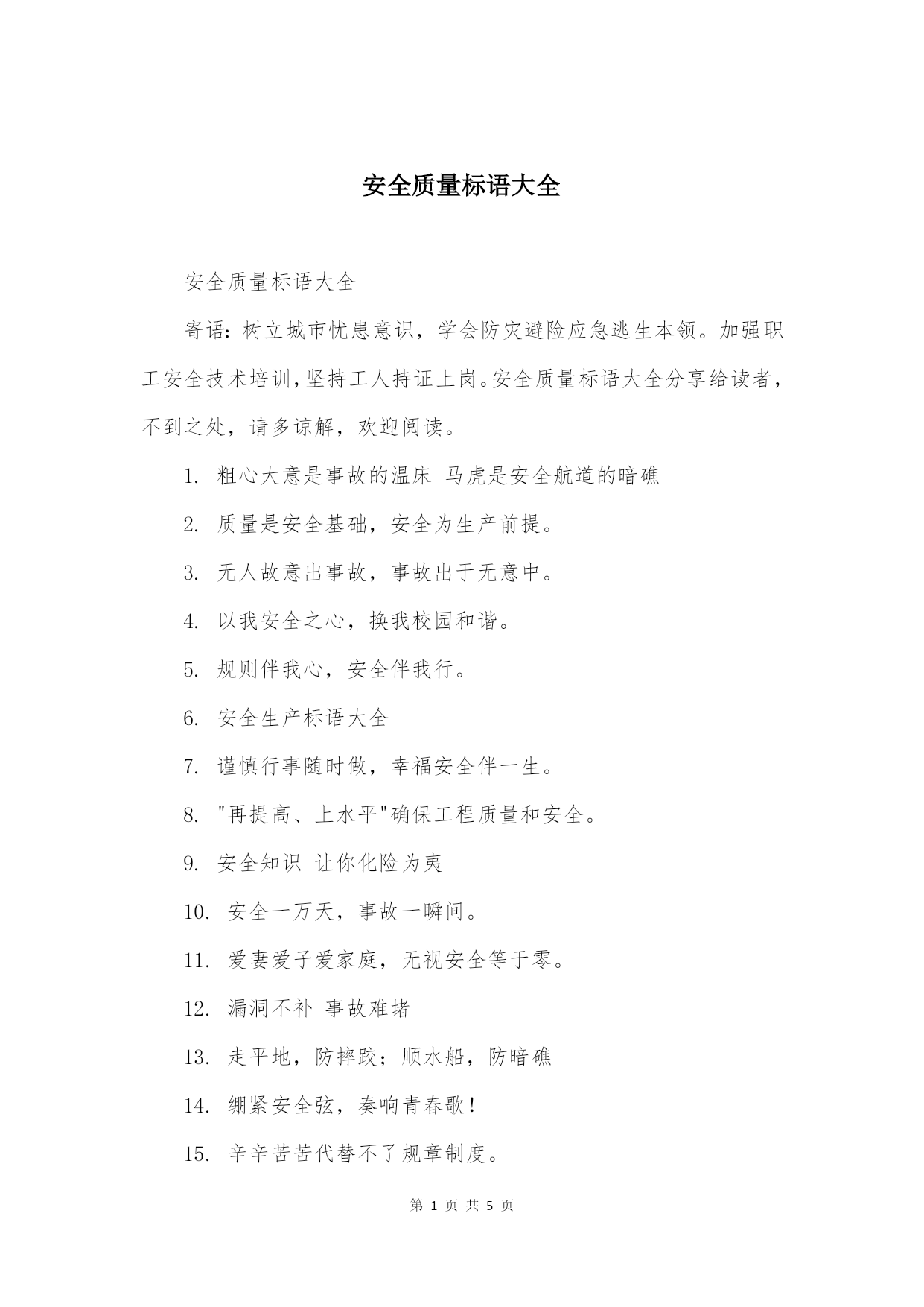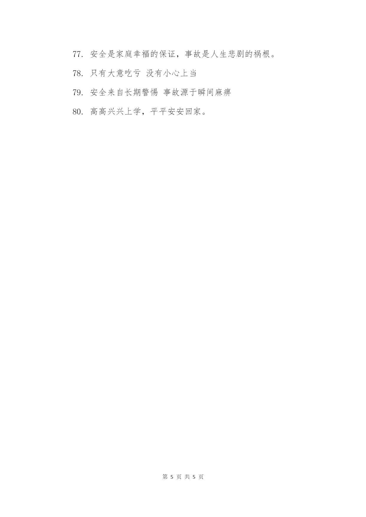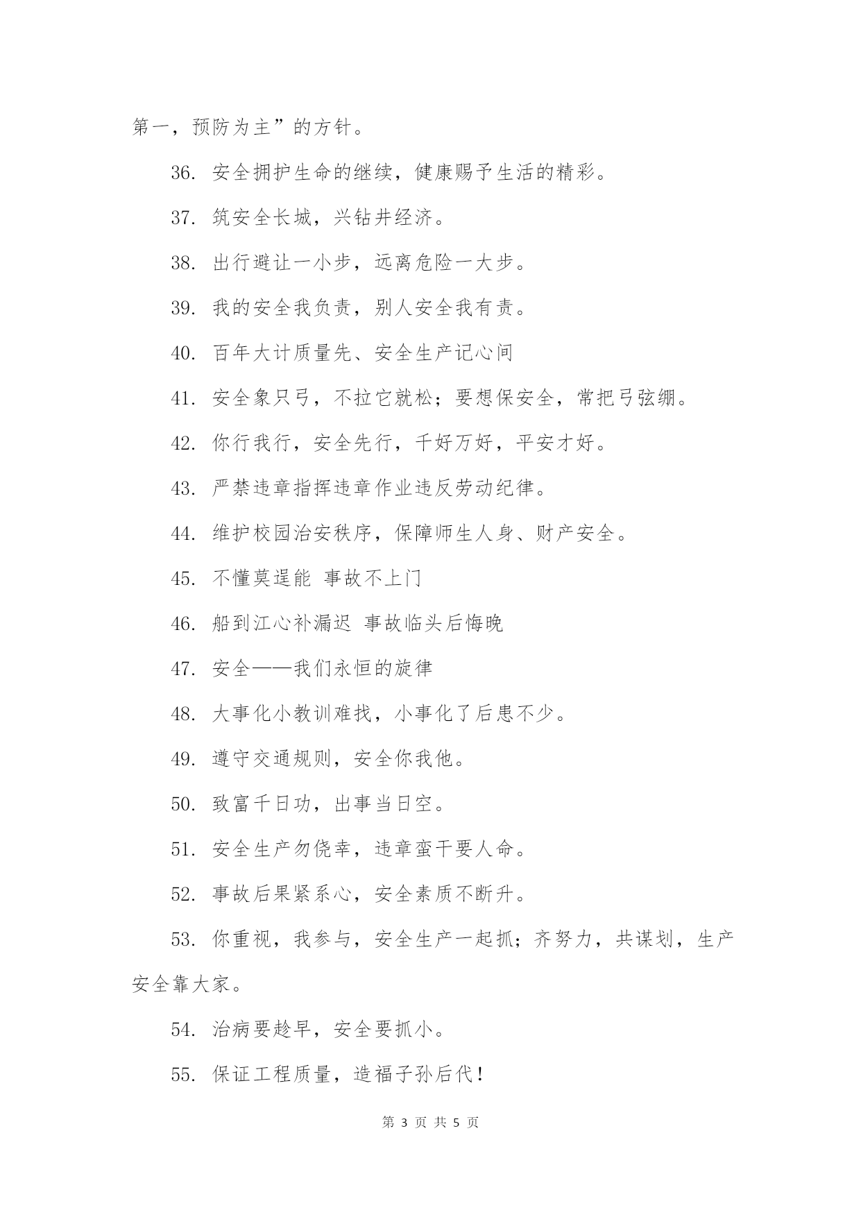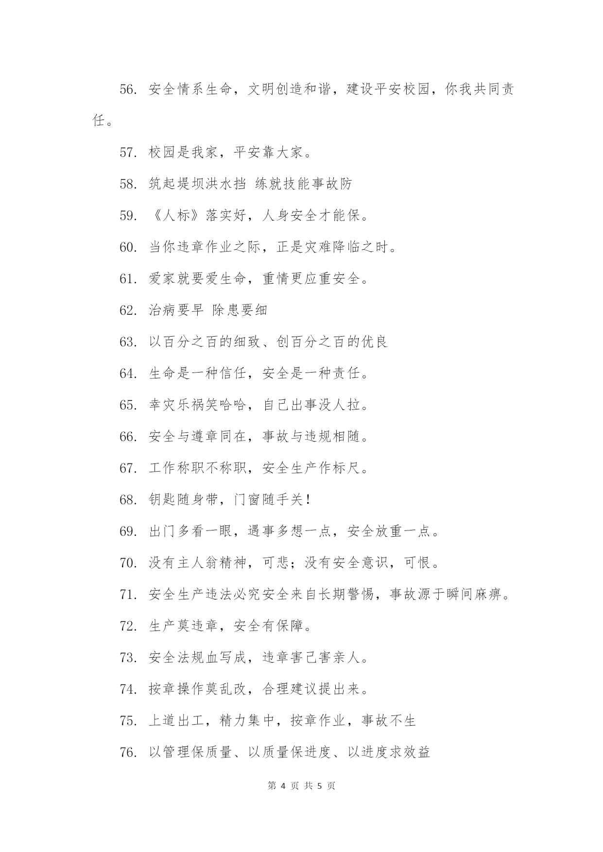第PAGE\*MERGEFORMAT5页共NUMPAGES\*MERGEFORMAT5页安全质量标语大全安全质量标语大全寄语:树立城市忧患意识,学会防灾避险应急逃生本领。加强职工安全技术培训,坚持工人持证上岗。安全质量标语大全分享给读者,不到之处,请多谅解,欢迎阅读。1.粗心大意是事故的温床马虎是安全航道的暗礁2.质量是安全基础,安全为生产前提。3.无人故意出事故,事故出于无意中。4.以我安全之心,换我校园和谐。5.规则伴我心,安全伴我行。6.安全生产标语大全7.谨慎行事随时做,幸福安全伴一生。8."再提高、上水平"确保工程质量和安全。9.安全知识让你化险为夷10.安全一万天,事故一瞬间。11.爱妻爱子爱家庭,无视安全等于零。12.漏洞不补事故难堵13.走平地,防摔跤;顺水船,防暗礁14.绷紧安全弦,奏响青春歌!15.辛辛苦苦代替不了规章制度。16.质量是公路建设永恒的话题17.违章违纪不狠抓害人害己害国家18.平安到家,家人放心。19.道路牵着你我他,安全系着千万家。20.好人主义害死人,发生事故坑了人。21.有妻有子有家庭,没有安全等于零。22.安全勤劳生活美好23.纸币莫过手,一卡通健康!24.火不单行,防患未燃。25.安全行车三件宝,车良技高思想好。26.遵章守纪光荣违章违纪可耻27.生产必须安全,安全促进生产。28.以人为本,平安为先,加快建设平安校园。29.内强职工素质,外树交通形象30.安全为了生产,生产必须安全。时时注意安全,处处预防事故。31.文明交通我先行,交通事故绕我行;礼行互让不慌张,谦虚谨慎交通畅。32.文明礼让,安全共创。33.上有老,下有小,出了事故不得了。34.凭侥幸,耍大胆,出了事故后悔晚。35.积极行动起来,开展“安全生产周”活动。深入贯彻“安全第一,预防为主”的方针。36.安全拥护生命的继续,健康赐予生活的精彩。37.筑安全长城,兴钻井经济。38.出行避让一小步,远离危险一大步。39.我的安全我负责,别人安全我有责。40.百年大计质量先、安全生产记心间41.安全象只弓,不拉它就松;要想保安全,常把弓弦绷。42.你行我行,安全先行,千好万好,平安才好。43.严禁违章指挥违章作业违反劳动纪律。44.维护校园治安秩序,保障师生人身、财产安全。45.不懂莫逞能事故不上门46.船到江心补漏迟事故临头后悔晚47.安全——我们永恒的旋律48.大事化小教训难找,小事化了后患不少。49.遵守交通规则,安全你我他。50.致富千日功,出事当日空。51.安全生产勿侥幸,违章蛮干要人命。52.事故后果紧系心,安全素质不断升。53.你重视,我参与,安全生产一起抓;齐努力,共谋划,生产安全靠大家。54.治病要趁早,安全要抓小。55.保证工程质量,造福子孙后代!56.安全情系生命,文明创造和谐,建设平安校园,你我共同责任。57.校园是我家,平安靠大家。58.筑起堤坝洪水挡练就技能事故防59.《人标》落实好,人身安全才能保。60.当你违章作业之际,正是灾难降临之时。61.爱家就要爱生命,重情更应重安全。62.治病要早除患要细63.以百分之百的细致、创百分之百的优良64.生命是一种信任,安全是一种责任。65.幸灾乐祸笑哈哈,自己出事没人拉。66.安全与遵章同在,事故与违规相随。67.工作称职不称职,安全生产作标尺。68.钥匙随身带,门窗随手关!69.出门多看一眼,遇事多想一点,安全放重一点。70.没有主人翁精神,可悲;没有安全意识,可恨。71.安全生产违法必究安全来自长期警惕,事故源于瞬间麻痹。72.生产莫违章,安全有保障。73.安全法规血写成,违章害己害亲人。74.按章操作莫乱改,合理建议提出来。75.上道出工,精力集中,按章作业,事故不生76.以管理保质量、以质量保进度、以进度求效益77.安全是家庭幸福的保证,事故是人生悲剧的祸根。78.只有大意吃亏没有小心上当79.安全来自长期警惕事故源于瞬间麻痹80.高高兴兴上学,平平安安回家。
