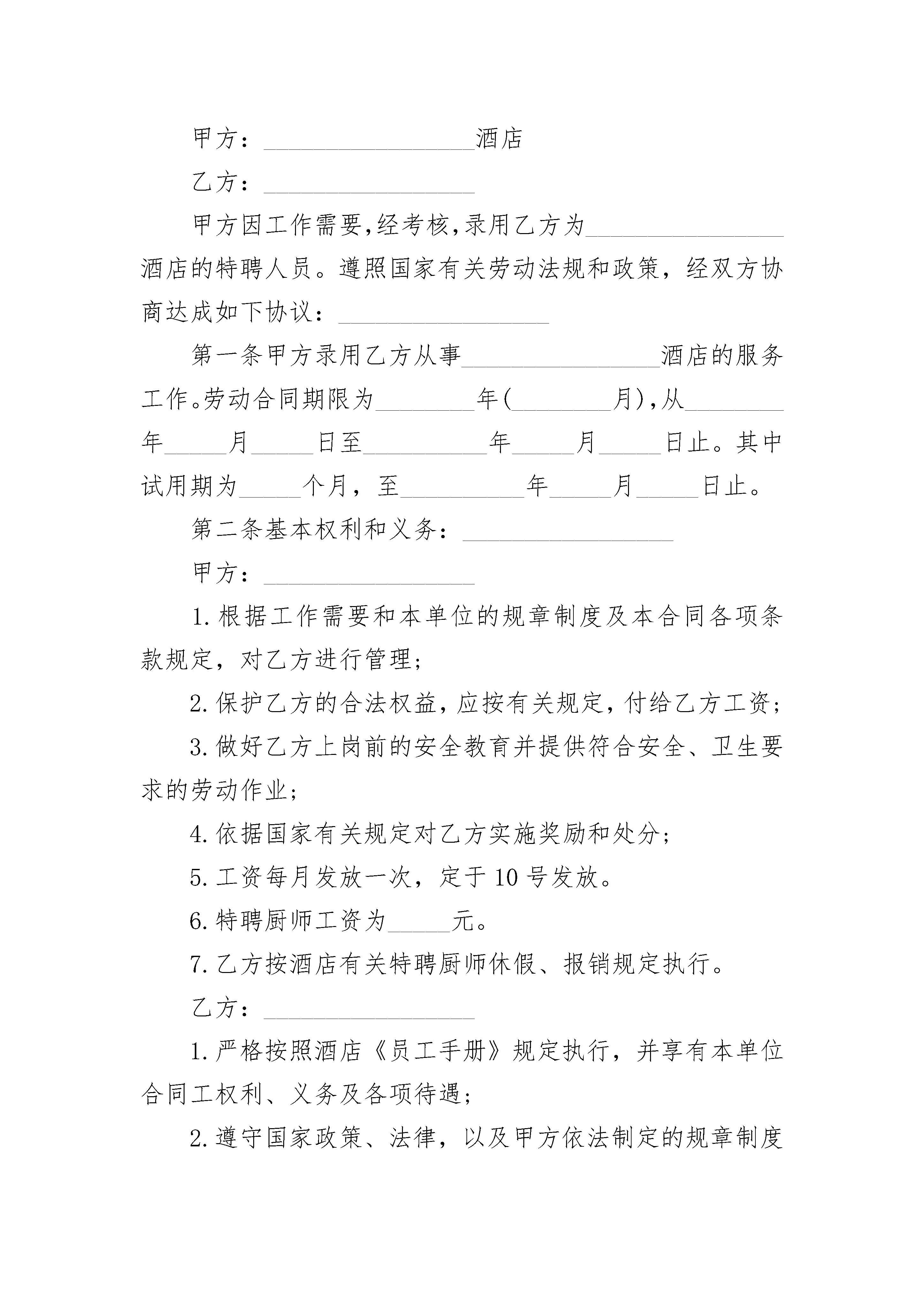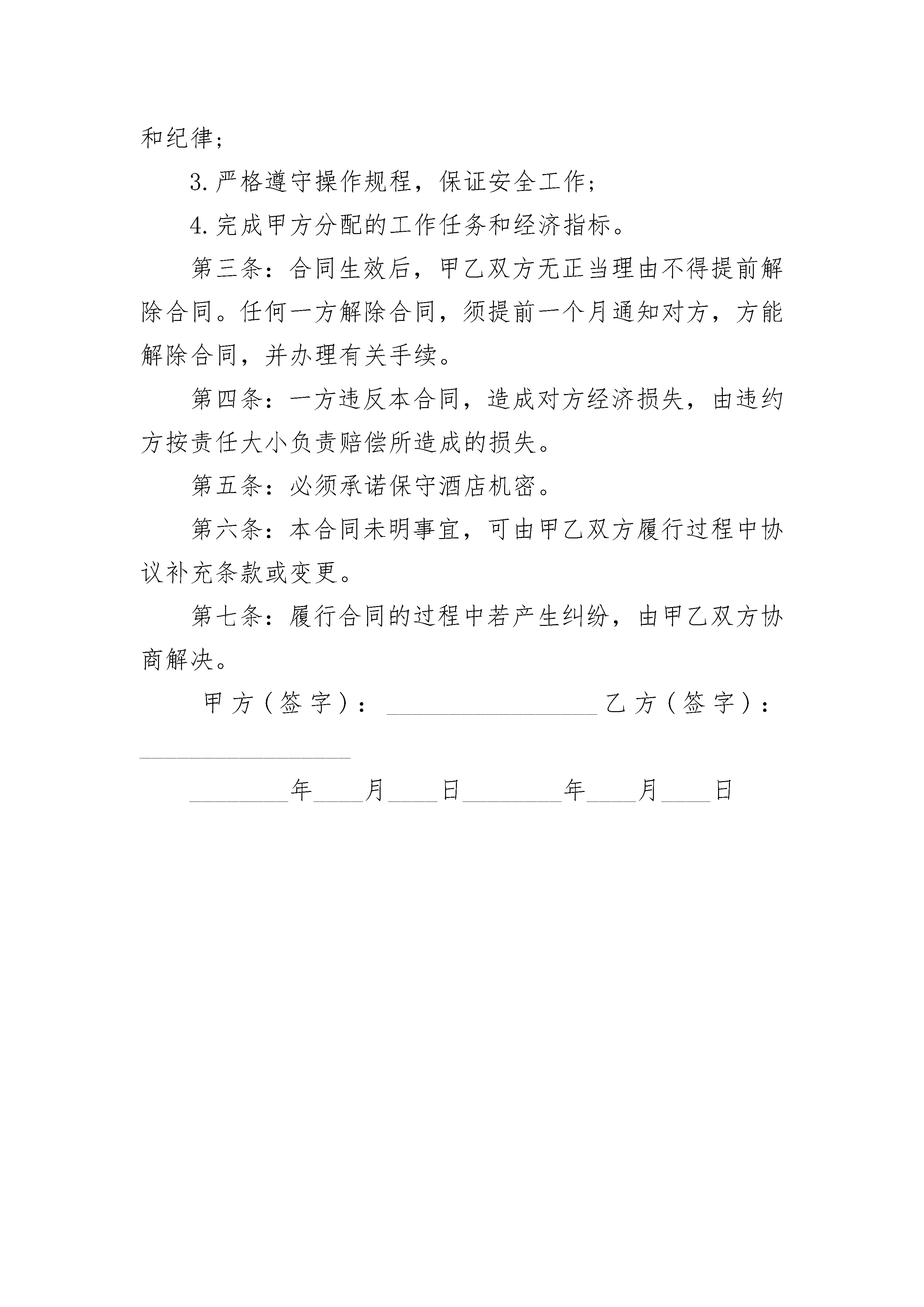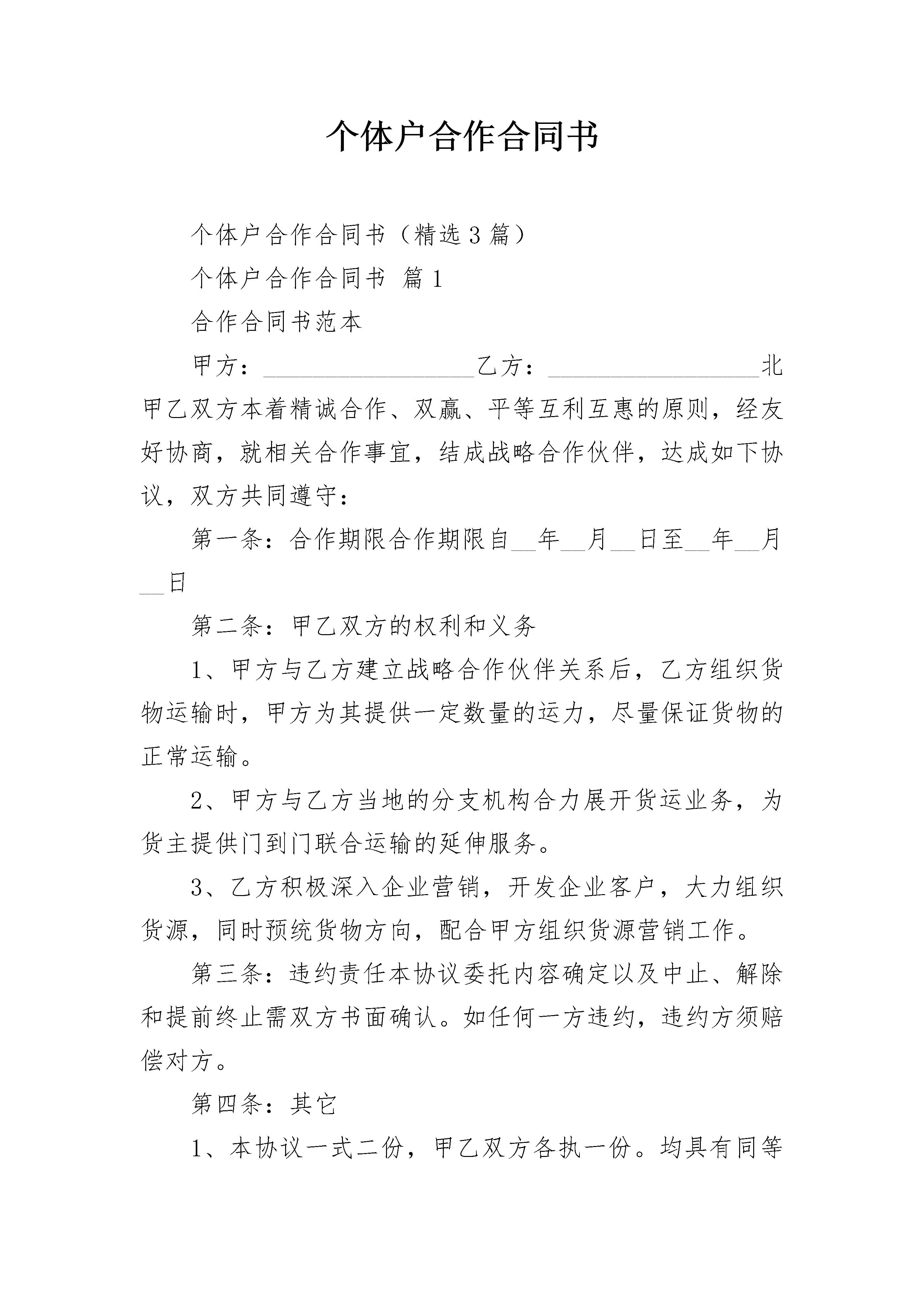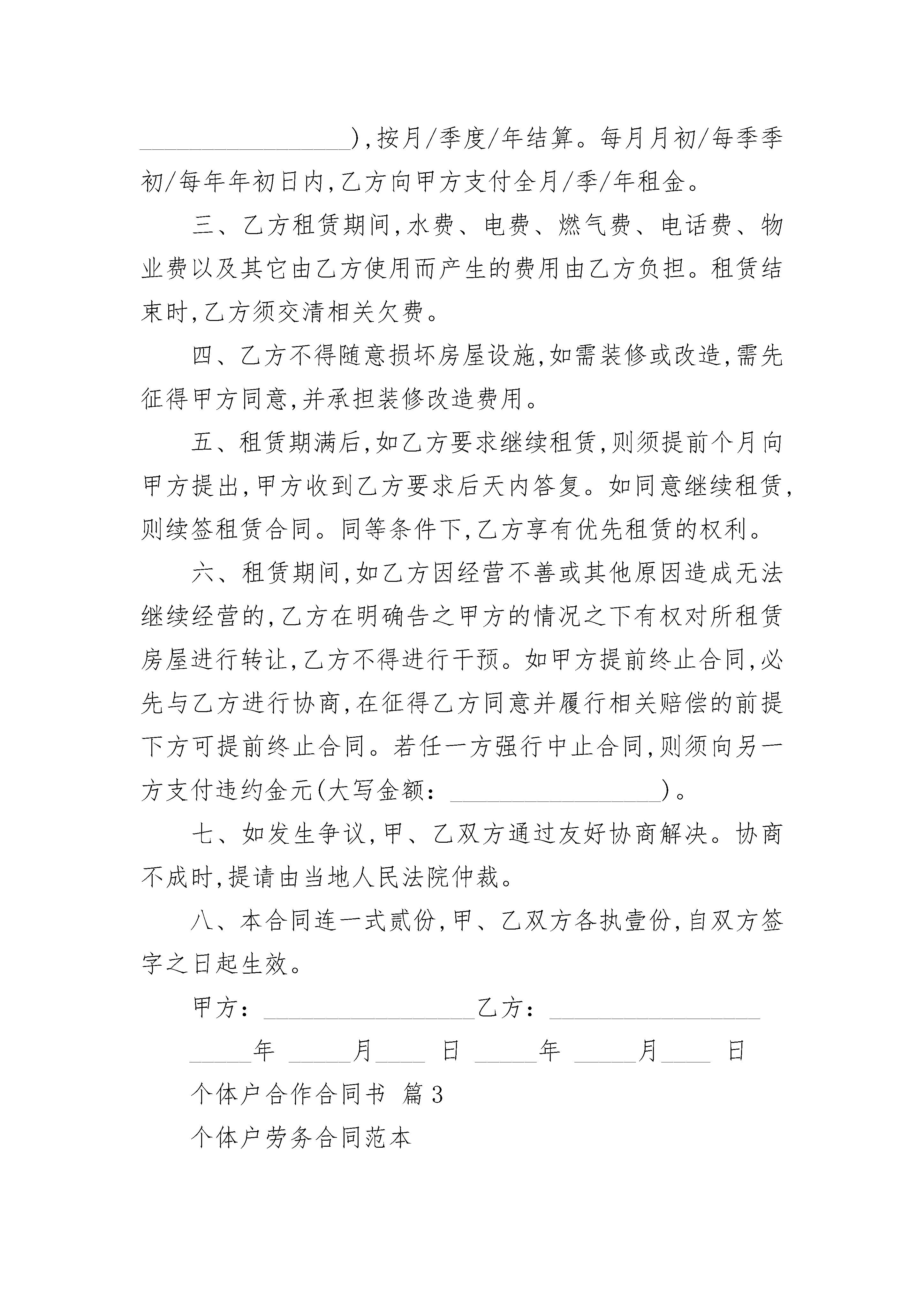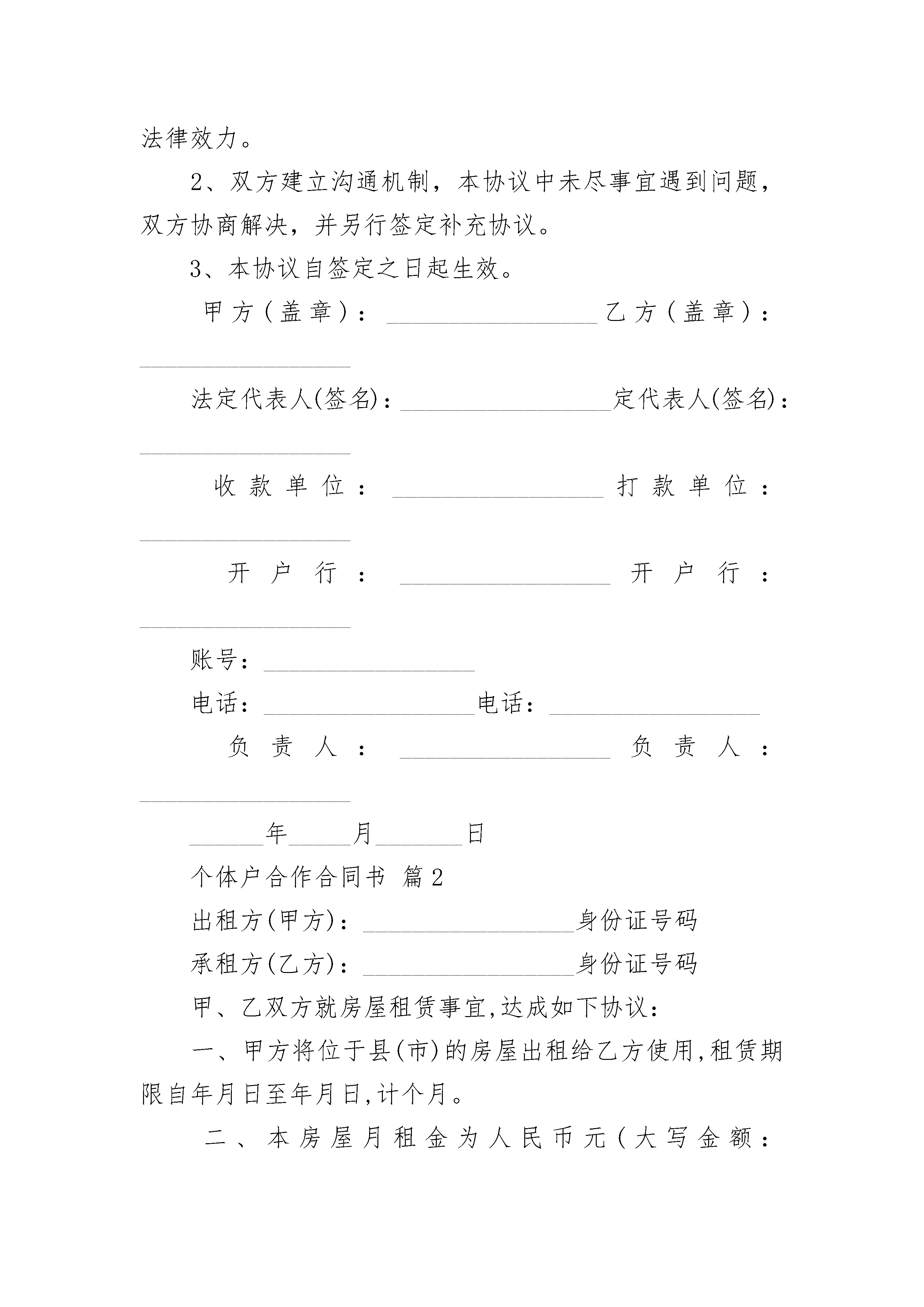 个体户合作合同书个体户合作合同书(精选3篇)个体户合作合同书篇1合作合同书范本甲方:_________________乙方:_________________北甲乙双方本着精诚合作、双赢、平等互利互惠的原则,经友好协商,就相关合作事宜,结成战略合作伙伴,达成如下协议,双方共同遵守:第一条:合作期限合作期限自__年__月__日至__年__月__日第二条:甲乙双方的权利和义务1、甲方与乙方建立战略合作伙伴关系后,乙方组织货物运输时,甲方为其提供一定数量的运力,尽量保证货物的正常运输。2、甲方与乙方当地的分支机构合力展开货运业务,为货主提供门到门联合运输的延伸服务。3、乙方积极深入企业营销,开发企业客户,大力组织货源,同时预统货物方向,配合甲方组织货源营销工作。第三条:违约责任本协议委托内容确定以及中止、解除和提前终止需双方书面确认。如任何一方违约,违约方须赔偿对方。第四条:其它1、本协议一式二份,甲乙双方各执一份。均具有同等法律效力。2、双方建立沟通机制,本协议中未尽事宜遇到问题,双方协商解决,并另行签定补充协议。3、本协议自签定之日起生效。甲方(盖章):_________________乙方(盖章):_________________法定代表人(签名):_________________定代表人(签名):_________________收款单位:_________________打款单位:_________________开户行:_________________开户行:_________________账号:_________________电话:_________________电话:_________________负责人:_________________负责人:_______________________年_____月_______日个体户合作合同书篇2出租方(甲方):_________________身份证号码承租方(乙方):_________________身份证号码甲、乙双方就房屋租赁事宜,达成如下协议:一、甲方将位于县(市)的房屋出租给乙方使用,租赁期限自年月日至年月日,计个月。二、本房屋月租金为人民币元(大写金额:_________________),按月/季度/年结算。每月月初/每季季初/每年年初日内,乙方向甲方支付全月/季/年租金。三、乙方租赁期间,水费、电费、燃气费、电话费、物业费以及其它由乙方使用而产生的费用由乙方负担。租赁结束时,乙方须交清相关欠费。四、乙方不得随意损坏房屋设施,如需装修或改造,需先征得甲方同意,并承担装修改造费用。五、租赁期满后,如乙方要求继续租赁,则须提前个月向甲方提出,甲方收到乙方要求后天内答复。如同意继续租赁,则续签租赁合同。同等条件下,乙方享有优先租赁的权利。六、租赁期间,如乙方因经营不善或其他原因造成无法继续经营的,乙方在明确告之甲方的情况之下有权对所租赁房屋进行转让,乙方不得进行干预。如甲方提前终止合同,必先与乙方进行协商,在征得乙方同意并履行相关赔偿的前提下方可提前终止合同。若任一方强行中止合同,则须向另一方支付违约金元(大写金额:_________________)。七、如发生争议,甲、乙双方通过友好协商解决。协商不成时,提请由当地人民法院仲裁。八、本合同连一式贰份,甲、乙双方各执壹份,自双方签字之日起生效。甲方:_________________乙方:______________________年_____月____日_____年_____月____日个体户合作合同书篇3个体户劳务合同范本甲方:_________________酒店乙方:_________________甲方因工作需要,经考核,录用乙方为________________酒店的特聘人员。遵照国家有关劳动法规和政策,经双方协商达成如下协议:_________________第一条甲方录用乙方从事________________酒店的服务工作。劳动合同期限为________年(________月),从________年_____月_____日至__________年_____月_____日止。其中试用期为_____个月,至__________年_____月_____日止。第二条基本权利和义务:_________________甲方:_________________1.根据工作需要和本单位的规章制度及本合同各项条款规定,对乙方进行管理;2.保护乙方的合法权益,应按有关规定,付给乙方工资;3.做好乙方上岗前的安全教育并提供符合安全、卫生要求的劳动作业;4.依据国家有关规定对乙方实施奖励和处分;5.工资每月发放一次,定于10号发放。6.特聘厨师工资为_____元。7.乙方按酒店有关特聘厨师休假、报销