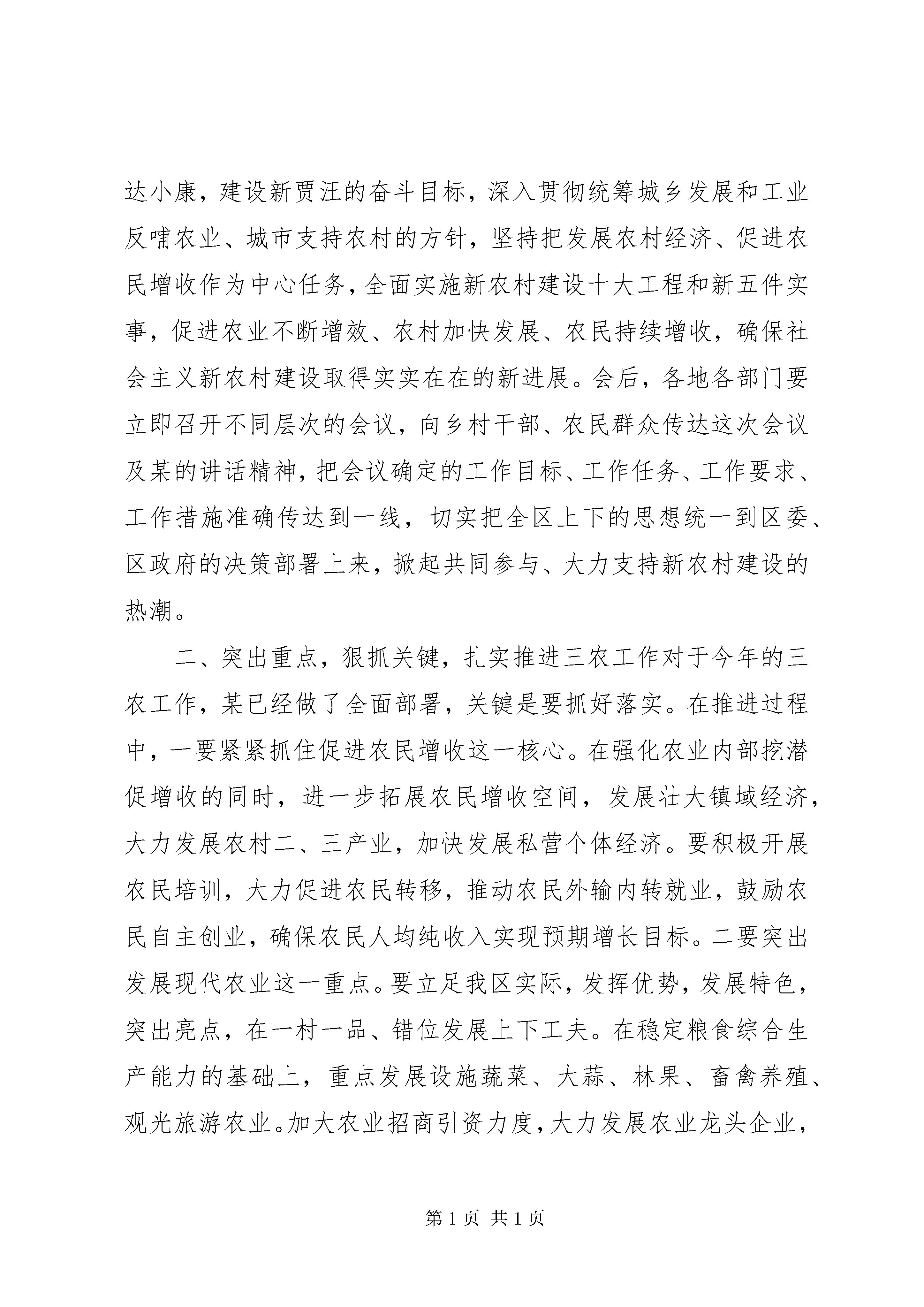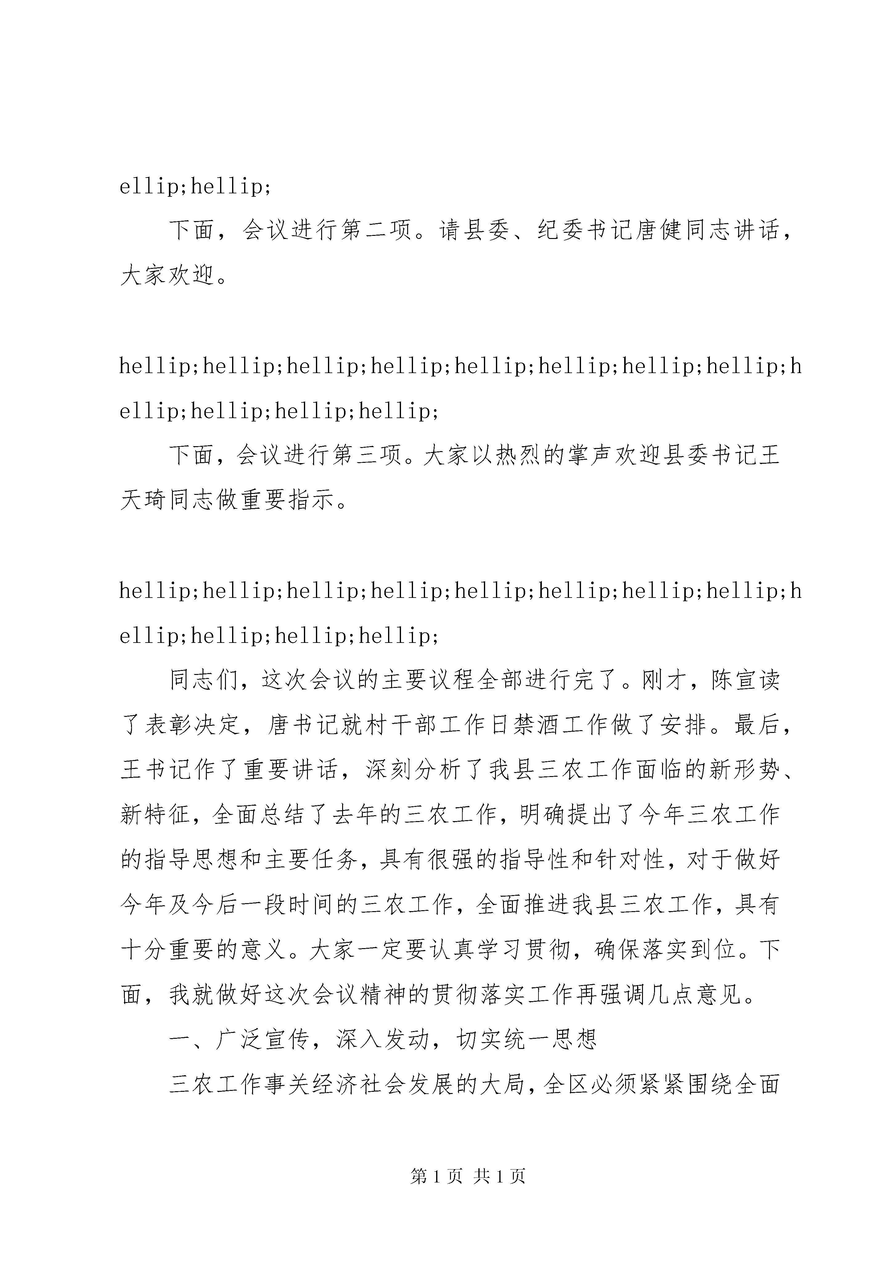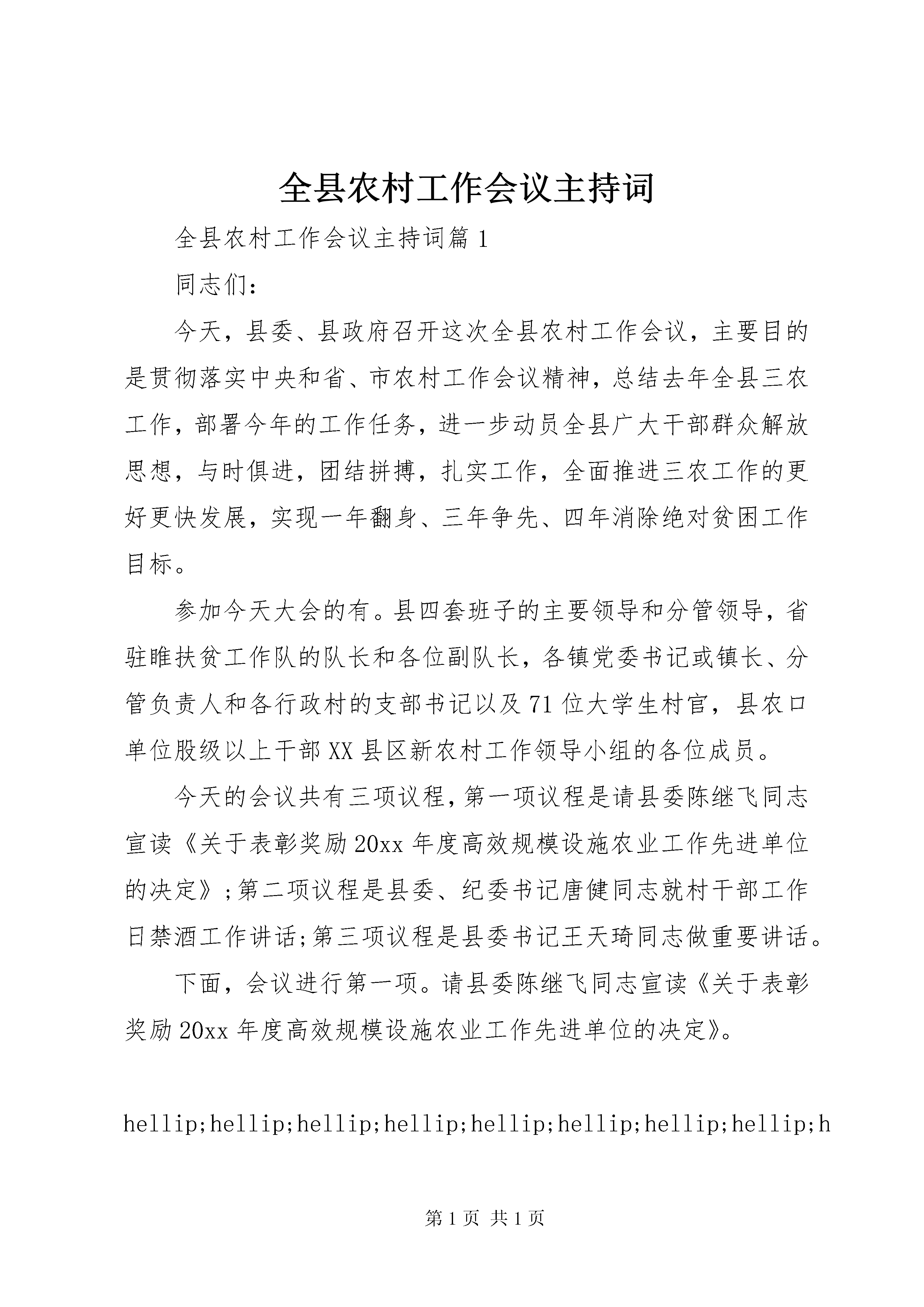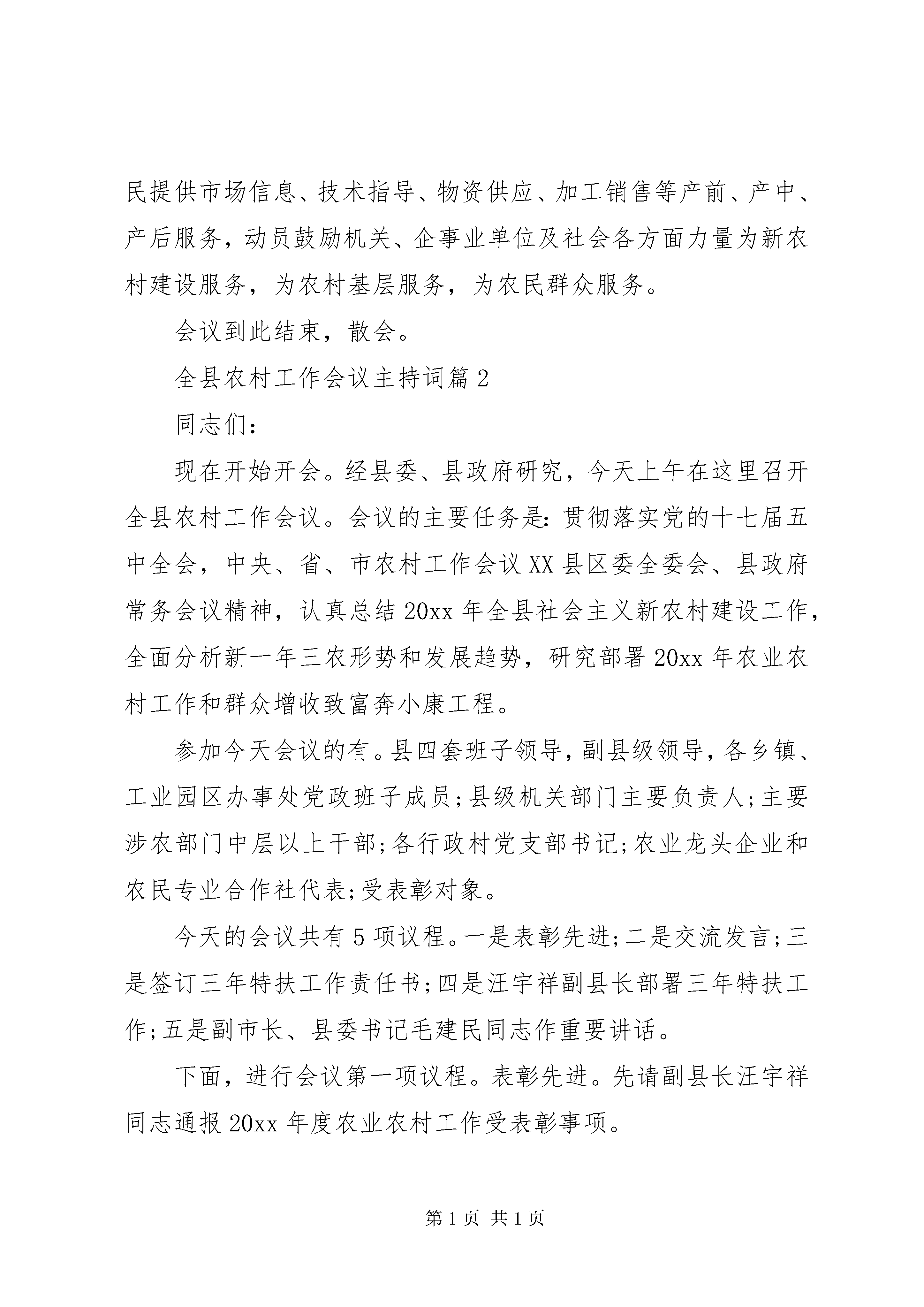 全县农村工作会议主持词全县农村工作会议主持词篇1同志们:今天,县委、县政府召开这次全县农村工作会议,主要目的是贯彻落实中央和省、市农村工作会议精神,总结去年全县三农工作,部署今年的工作任务,进一步动员全县广大干部群众解放思想,与时俱进,团结拼搏,扎实工作,全面推进三农工作的更好更快发展,实现一年翻身、三年争先、四年消除绝对贫困工作目标。参加今天大会的有。县四套班子的主要领导和分管领导,省驻睢扶贫工作队的队长和各位副队长,各镇党委书记或镇长、分管负责人和各行政村的支部书记以及71位大学生村官,县农口单位股级以上干部XX县区新农村工作领导小组的各位成员。今天的会议共有三项议程,第一项议程是请县委陈继飞同志宣读《关于表彰奖励20xx年度高效规模设施农业工作先进单位的决定》;第二项议程是县委、纪委书记唐健同志就村干部工作日禁酒工作讲话;第三项议程是县委书记王天琦同志做重要讲话。下面,会议进行第一项。请县委陈继飞同志宣读《关于表彰奖励20xx年度高效规模设施农业工作先进单位的决定》。hellip;hellip;hellip;hellip;hellip;hellip;hellip;hellip;hellip;hellip;下面,会议进行第二项。请县委、纪委书记唐健同志讲话,大家欢迎。hellip;hellip;hellip;hellip;hellip;hellip;hellip;hellip;hellip;hellip;hellip;hellip;下面,会议进行第三项。大家以热烈的掌声欢迎县委书记王天琦同志做重要指示。hellip;hellip;hellip;hellip;hellip;hellip;hellip;hellip;hellip;hellip;hellip;hellip;同志们,这次会议的主要议程全部进行完了。刚才,陈宣读了表彰决定,唐书记就村干部工作日禁酒工作做了安排。最后,王书记作了重要讲话,深刻分析了我县三农工作面临的新形势、新特征,全面总结了去年的三农工作,明确提出了今年三农工作的指导思想和主要任务,具有很强的指导性和针对性,对于做好今年及今后一段时间的三农工作,全面推进我县三农工作,具有十分重要的意义。大家一定要认真学习贯彻,确保落实到位。下面,我就做好这次会议精神的贯彻落实工作再强调几点意见。一、广泛宣传,深入发动,切实统一思想三农工作事关经济社会发展的大局,全区必须紧紧围绕全面达小康,建设新贾汪的奋斗目标,深入贯彻统筹城乡发展和工业反哺农业、城市支持农村的方针,坚持把发展农村经济、促进农民增收作为中心任务,全面实施新农村建设十大工程和新五件实事,促进农业不断增效、农村加快发展、农民持续增收,确保社会主义新农村建设取得实实在在的新进展。会后,各地各部门要立即召开不同层次的会议,向乡村干部、农民群众传达这次会议及某的讲话精神,把会议确定的工作目标、工作任务、工作要求、工作措施准确传达到一线,切实把全区上下的思想统一到区委、区政府的决策部署上来,掀起共同参与、大力支持新农村建设的热潮。二、突出重点,狠抓关键,扎实推进三农工作对于今年的三农工作,某已经做了全面部署,关键是要抓好落实。在推进过程中,一要紧紧抓住促进农民增收这一核心。在强化农业内部挖潜促增收的同时,进一步拓展农民增收空间,发展壮大镇域经济,大力发展农村二、三产业,加快发展私营个体经济。要积极开展农民培训,大力促进农民转移,推动农民外输内转就业,鼓励农民自主创业,确保农民人均纯收入实现预期增长目标。二要突出发展现代农业这一重点。要立足我区实际,发挥优势,发展特色,突出亮点,在一村一品、错位发展上下工夫。在稳定粮食综合生产能力的基础上,重点发展设施蔬菜、大蒜、林果、畜禽养殖、观光旅游农业。加大农业招商引资力度,大力发展农业龙头企业,提高农产品附加值;加强农民专业合作组织建设,进一步完善农产品流通体系,畅通农产品销售渠道;加快推进农业科技创新,强化农产品质量建设,不断增强农业综合竞争力。三要切实强化改善农村生产生活条件这一基础。从解决农民最关心、最直接、最现实的问题做起,大力实施农村实事工程,重点抓好农村道路建设、河塘疏浚、清洁能源建设、农村绿化等工作,确保农村群众的生产条件和生活环境有大的改观。三、明确责任,强化措施,确保形成工作合力在新的形势下,三农工作任务重、要求高,必须加大组织力度,强化指导服务,调动各方力量,形成强有力的工作合力,扎实推进新农村建设。一要进一步强化责任意识。各地各部门一定要充分认识三农工作的重要性,认真履行好发展农业、繁荣农村、富裕农民的重要职责,切实作到思想上高度重视,领导上加大力度,工作上抓好落实。二要进一步加大投入力度。坚持予得更多、取得更少、放得更活,进一步巩固、完善和强化支农惠农政策,按照三个高于的要求