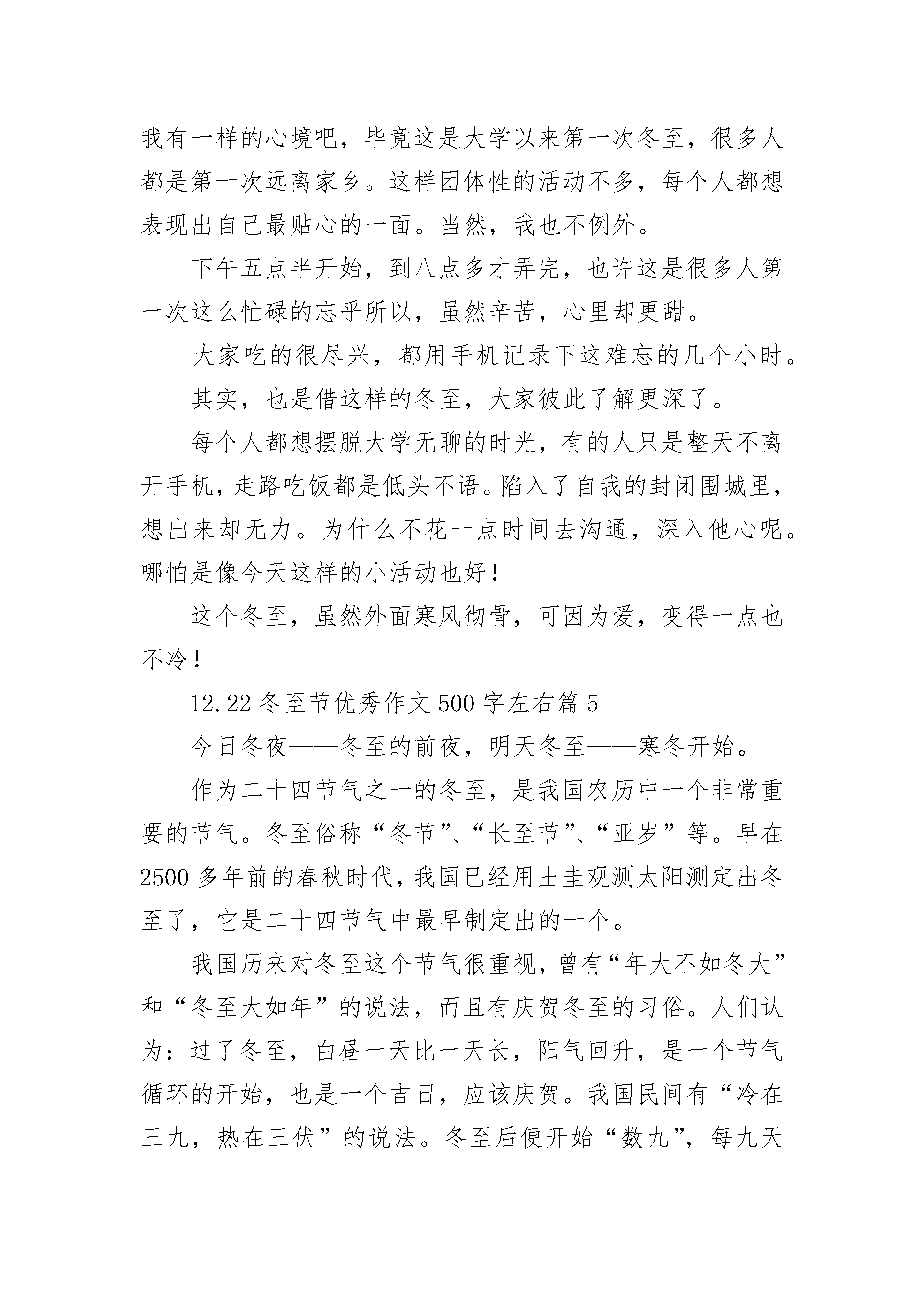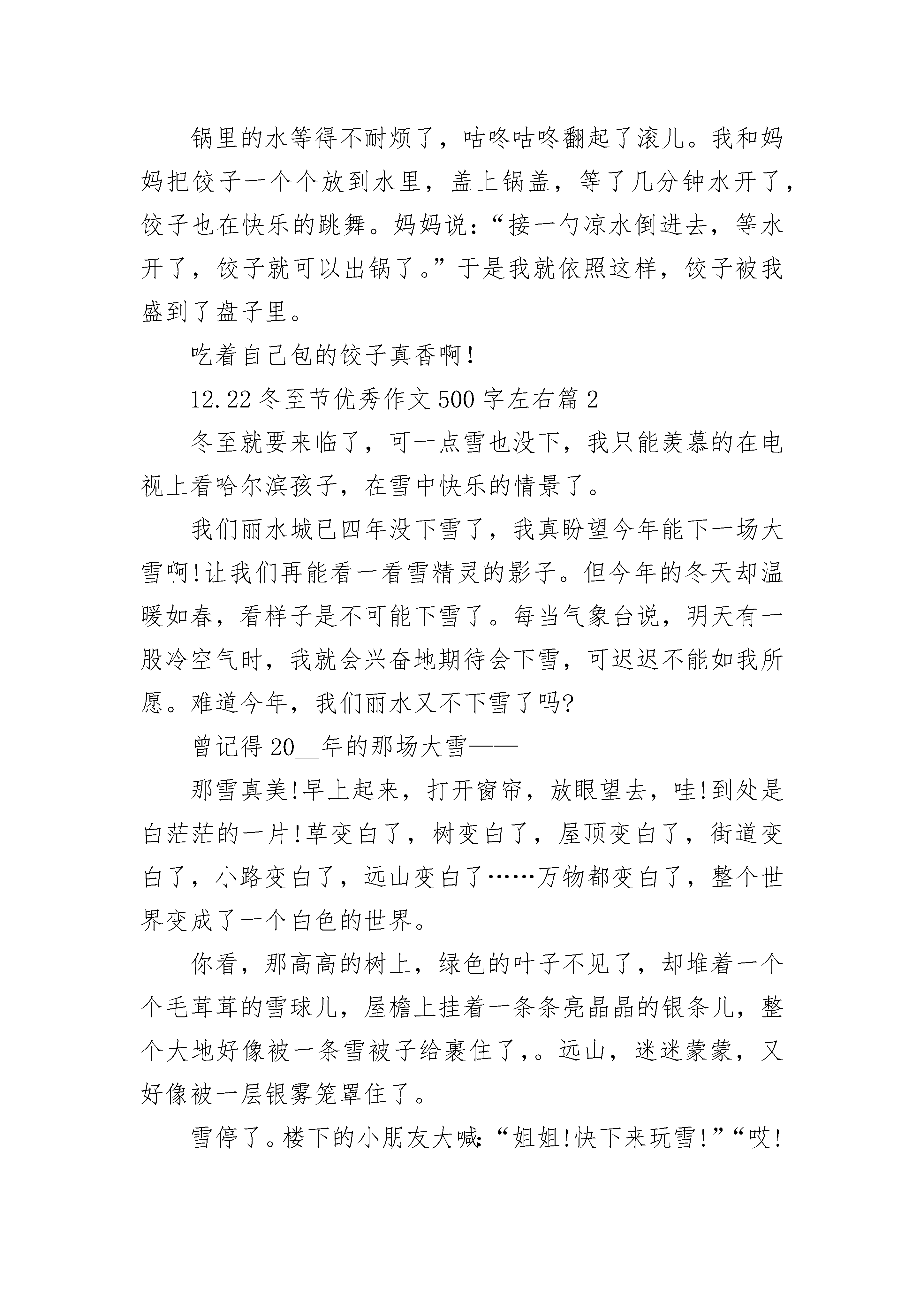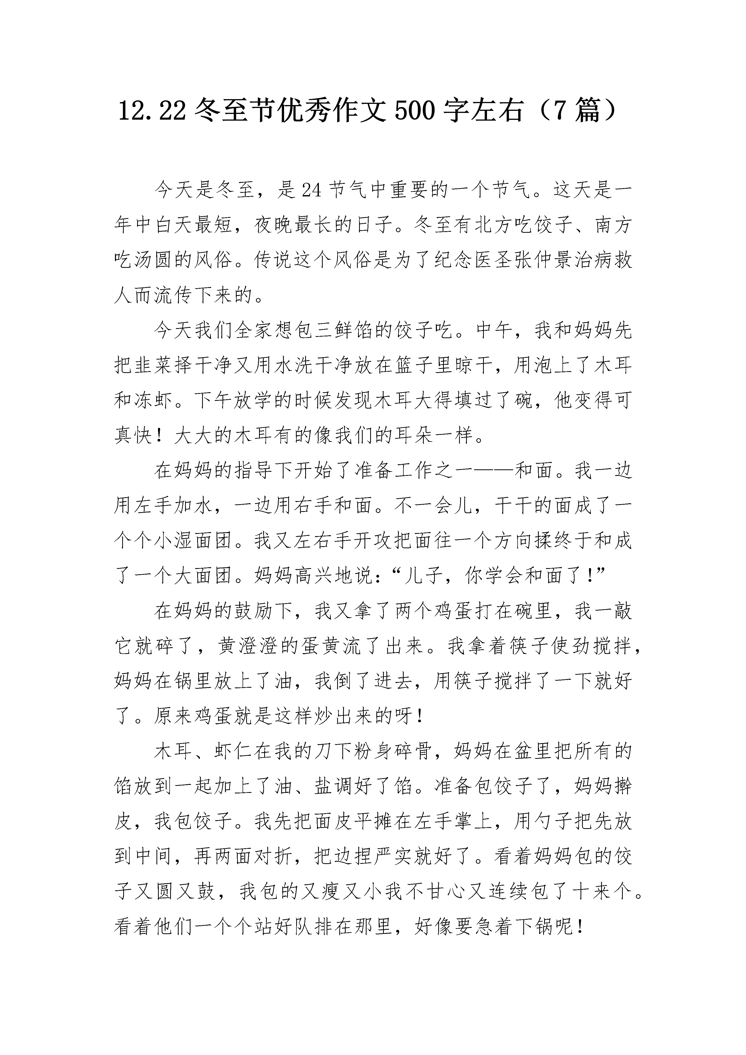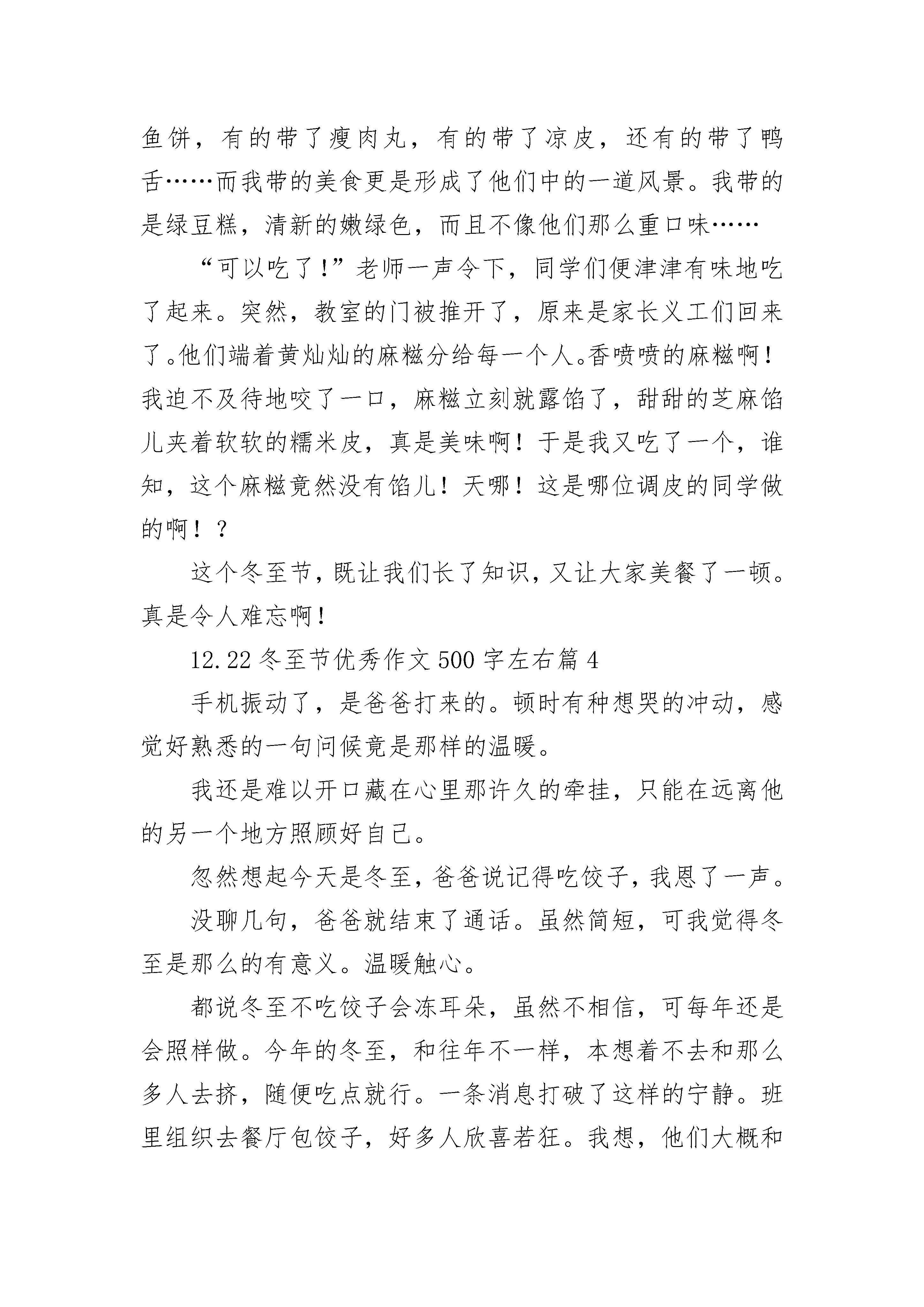12.22冬至节优秀作文500字左右(7篇)今天是冬至,是24节气中重要的一个节气。这天是一年中白天最短,夜晚最长的日子。冬至有北方吃饺子、南方吃汤圆的风俗。传说这个风俗是为了纪念医圣张仲景治病救人而流传下来的。今天我们全家想包三鲜馅的饺子吃。中午,我和妈妈先把韭菜择干净又用水洗干净放在篮子里晾干,用泡上了木耳和冻虾。下午放学的时候发现木耳大得填过了碗,他变得可真快!大大的木耳有的像我们的耳朵一样。在妈妈的指导下开始了准备工作之一——和面。我一边用左手加水,一边用右手和面。不一会儿,干干的面成了一个个小湿面团。我又左右手开攻把面往一个方向揉终于和成了一个大面团。妈妈高兴地说:“儿子,你学会和面了!”在妈妈的鼓励下,我又拿了两个鸡蛋打在碗里,我一敲它就碎了,黄澄澄的蛋黄流了出来。我拿着筷子使劲搅拌,妈妈在锅里放上了油,我倒了进去,用筷子搅拌了一下就好了。原来鸡蛋就是这样炒出来的呀!木耳、虾仁在我的刀下粉身碎骨,妈妈在盆里把所有的馅放到一起加上了油、盐调好了馅。准备包饺子了,妈妈擀皮,我包饺子。我先把面皮平摊在左手掌上,用勺子把先放到中间,再两面对折,把边捏严实就好了。看着妈妈包的饺子又圆又鼓,我包的又瘦又小我不甘心又连续包了十来个。看着他们一个个站好队排在那里,好像要急着下锅呢!锅里的水等得不耐烦了,咕咚咕咚翻起了滚儿。我和妈妈把饺子一个个放到水里,盖上锅盖,等了几分钟水开了,饺子也在快乐的跳舞。妈妈说:“接一勺凉水倒进去,等水开了,饺子就可以出锅了。”于是我就依照这样,饺子被我盛到了盘子里。吃着自己包的饺子真香啊!12.22冬至节优秀作文500字左右篇2冬至就要来临了,可一点雪也没下,我只能羡慕的在电视上看哈尔滨孩子,在雪中快乐的情景了。我们丽水城已四年没下雪了,我真盼望今年能下一场大雪啊!让我们再能看一看雪精灵的影子。但今年的冬天却温暖如春,看样子是不可能下雪了。每当气象台说,明天有一股冷空气时,我就会兴奋地期待会下雪,可迟迟不能如我所愿。难道今年,我们丽水又不下雪了吗?曾记得20__年的那场大雪——那雪真美!早上起来,打开窗帘,放眼望去,哇!到处是白茫茫的一片!草变白了,树变白了,屋顶变白了,街道变白了,小路变白了,远山变白了……万物都变白了,整个世界变成了一个白色的世界。你看,那高高的树上,绿色的叶子不见了,却堆着一个个毛茸茸的雪球儿,屋檐上挂着一条条亮晶晶的银条儿,整个大地好像被一条雪被子给裹住了,。远山,迷迷蒙蒙,又好像被一层银雾笼罩住了。雪停了。楼下的小朋友大喊:“姐姐!快下来玩雪!”“哎!来了!”我迫不及待的从六楼跑下来。小女孩堆起了雪人,小男孩打起了雪仗,欢快的笑声,响彻云霄。看着我们快乐,大人们也耐不住了,一个个都出来了,加入了我们玩雪的队伍……这时,我想起书上的一句话:在冬天里尝一尝雪的味道会回味无穷。我抓起一把雪,就往嘴里塞,呀!冰冰凉凉的,那味儿,夏天的棒冰哪比得上!这清凉,冰爽的雪味儿沁透了身体。啊!这美丽的“白雪公主”,这快乐的“雪精灵”,你本应是冬天的常客,可如今,为何脚步稀稀?四年了!我再也没看见你的身影——今年你能来吗?12.22冬至节优秀作文500字左右篇3冬至要吃汤圆、麻糍,吃了我们就大一岁了,记忆中的冬至大致如此。这个冬至却不同于往常,班主任郭老师带领着我们深刻的感受了冬至的文化、习俗。课堂上我们学习了南、北方人的饮食习惯:北方人冬至吃饺子、馄饨,南方人吃汤圆。那天下午,我们还邀请了张开翔妈妈来课堂指导我们做汤圆。在开翔妈妈的耐心教导和同学们的虚心学习下,一个个白嫩嫩圆溜溜的汤圆出现在每个同学的手中。汤圆越做越多,最后,每一组的芝麻馅都用光了,汤圆也装了一大盘。于是家长义工们把汤圆端到楼下去加工,做成麻糍。趁汤圆加工的时间,同学们拿出自己早早准备好的温州美食,摆在桌面上。一眼望去,各种美味尽收眼底。瞧,有的带了温州鱼饼,有的带了瘦肉丸,有的带了凉皮,还有的带了鸭舌……而我带的美食更是形成了他们中的一道风景。我带的是绿豆糕,清新的嫩绿色,而且不像他们那么重口味……“可以吃了!”老师一声令下,同学们便津津有味地吃了起来。突然,教室的门被推开了,原来是家长义工们回来了。他们端着黄灿灿的麻糍分给每一个人。香喷喷的麻糍啊!我迫不及待地咬了一口,麻糍立刻就露馅了,甜甜的芝麻馅儿夹着软软的糯米皮,真是美味啊!于是我又吃了一个,谁知,这个麻糍竟然没有馅儿!天哪!这是哪位调皮的同学做的啊!?这个冬至节,既让我们长了知识,又让大家美餐了一顿。真是令人难忘啊!12.22冬至节优秀作文500字左右篇4手机振动了,是爸爸打来的。顿时有种想哭的冲动,感觉好熟悉的一句问候竟是那样的温暖。我还是难以开口藏在心里那许久的牵挂,只能在远离他的另一个地方照顾好自己。忽然想起今天是冬至,爸爸说记得吃饺子,我恩了一声。没聊几