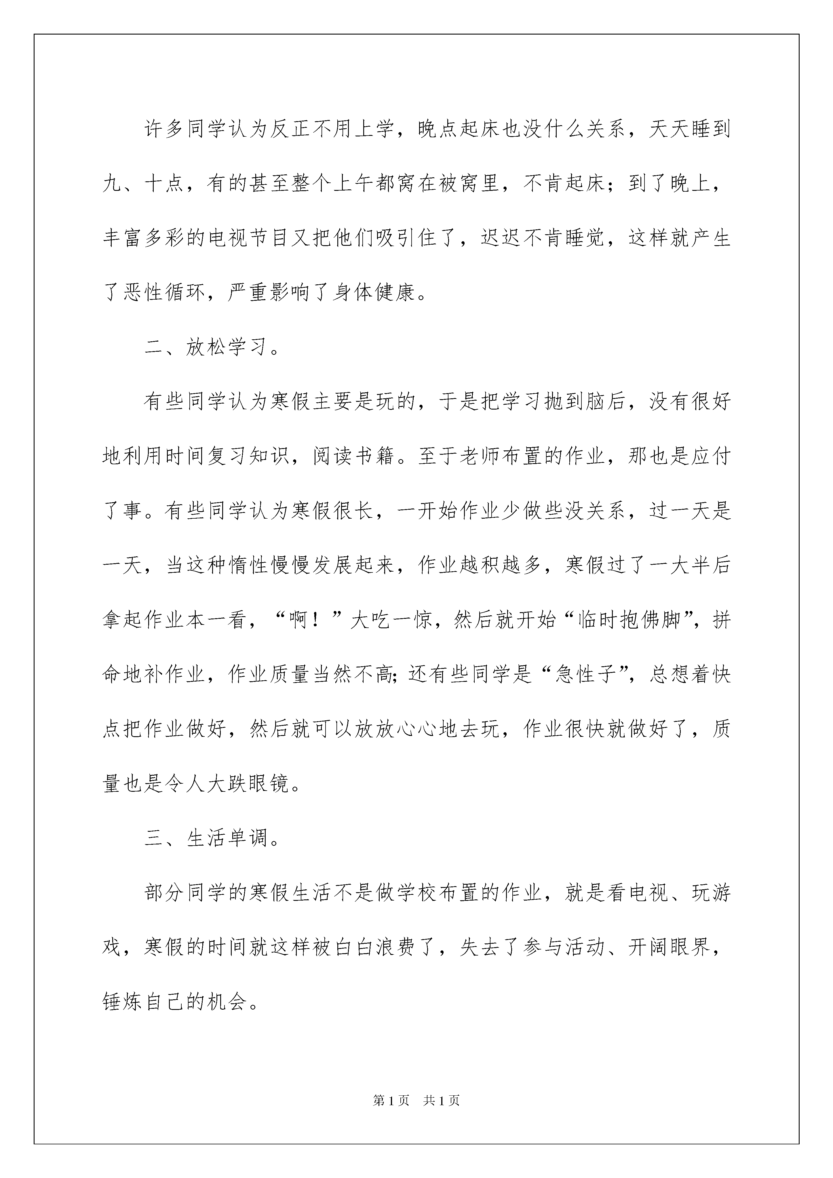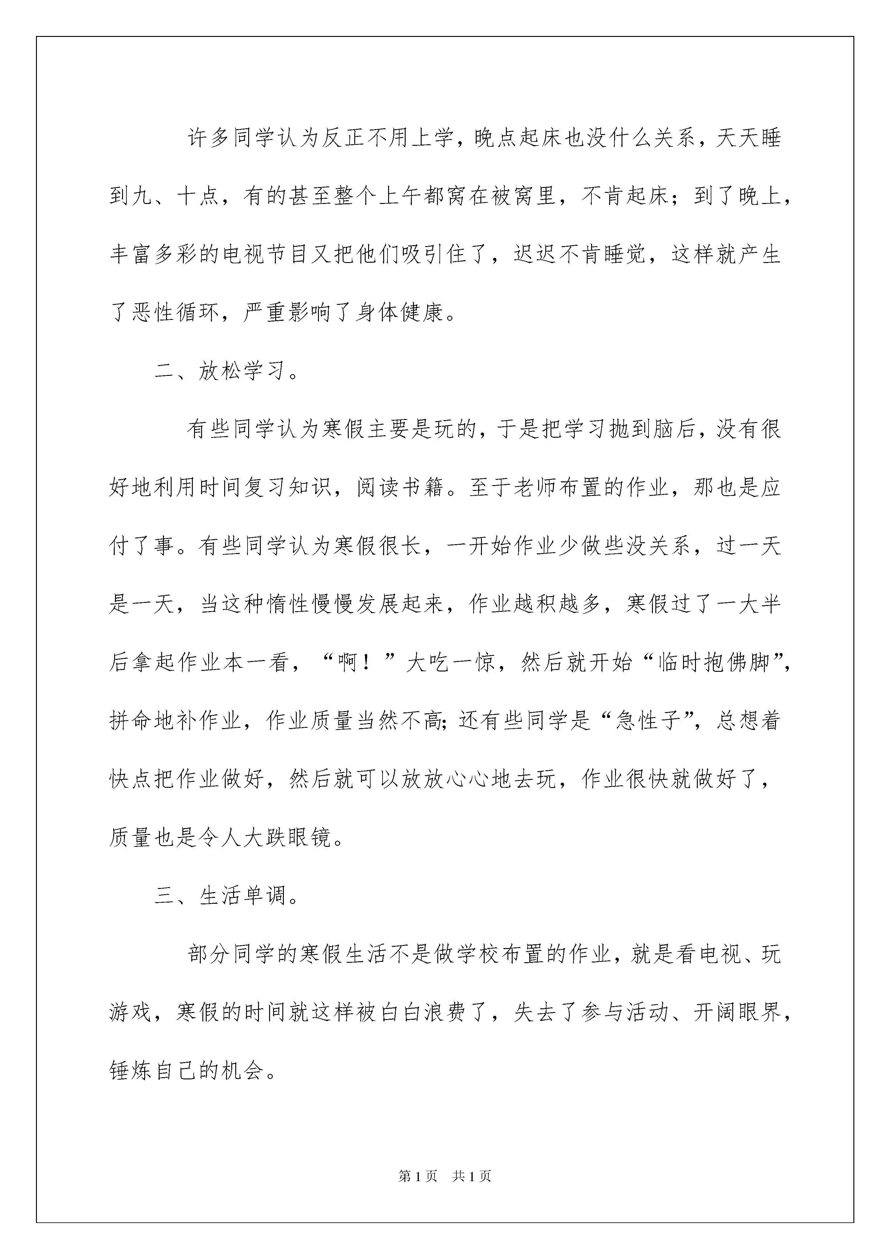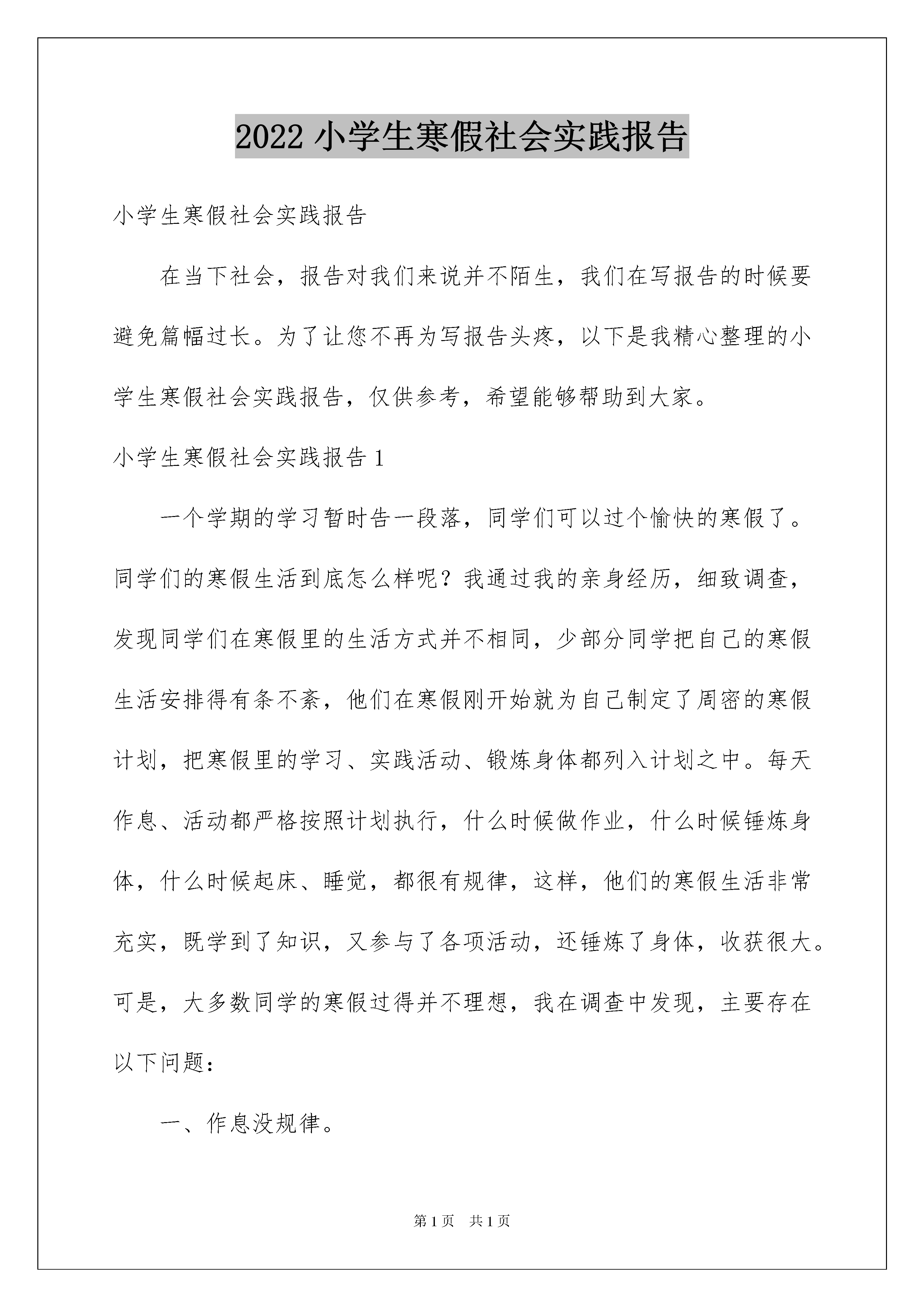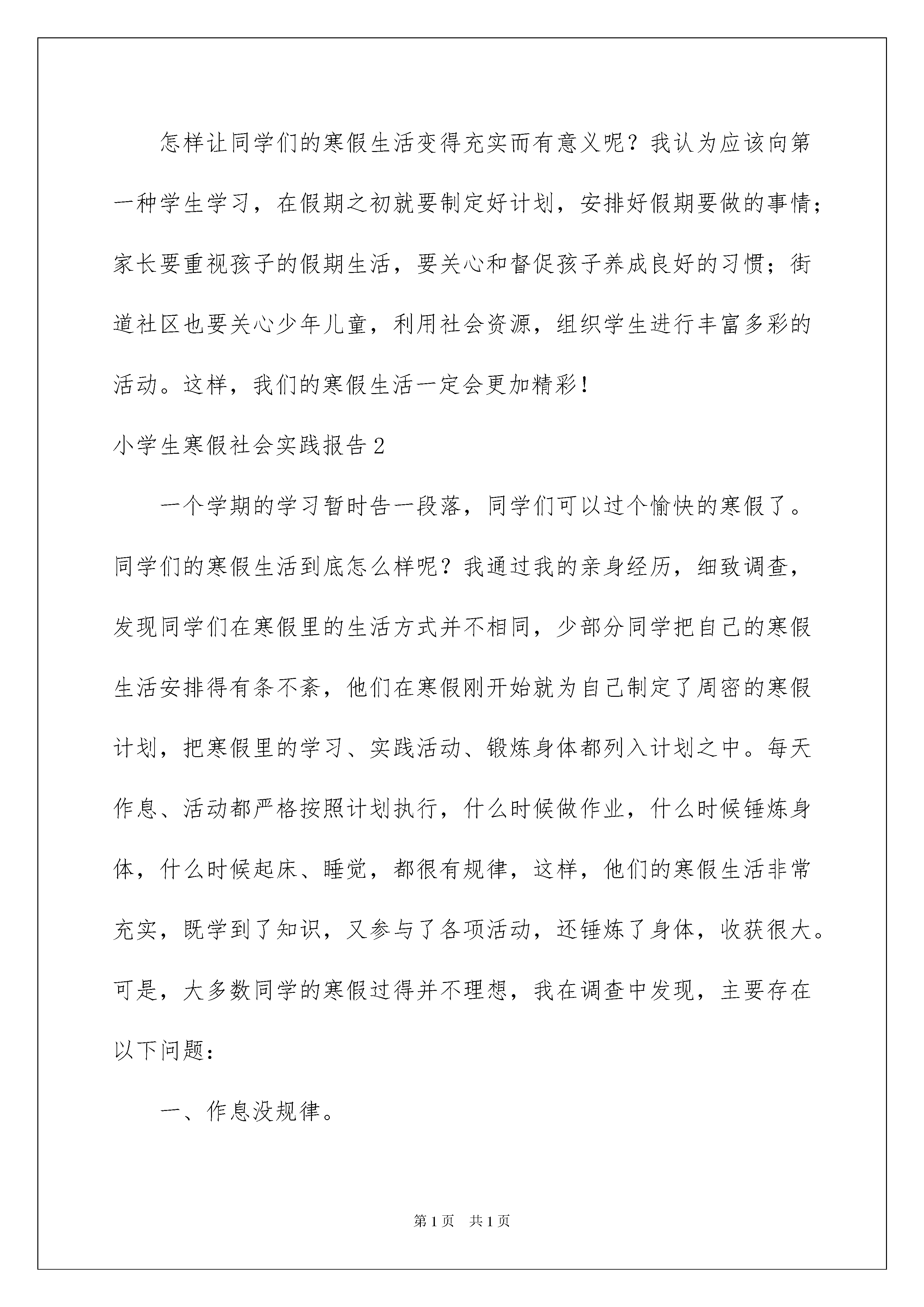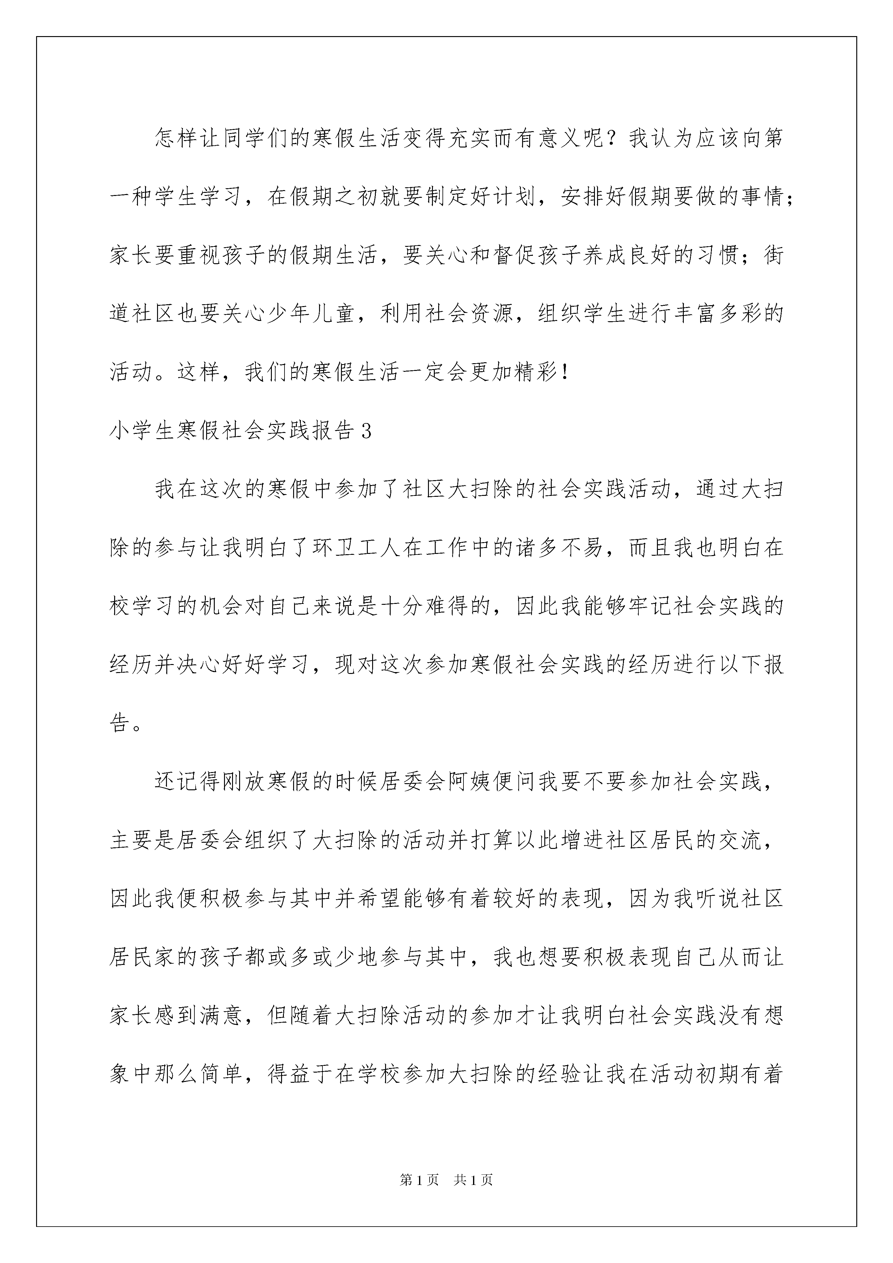 2022小学生寒假社会实践报告小学生寒假社会实践报告在当下社会,报告对我们来说并不陌生,我们在写报告的时候要避免篇幅过长。为了让您不再为写报告头疼,以下是我精心整理的小学生寒假社会实践报告,仅供参考,希望能够帮助到大家。小学生寒假社会实践报告1一个学期的学习暂时告一段落,同学们可以过个愉快的寒假了。同学们的寒假生活到底怎么样呢?我通过我的亲身经历,细致调查,发现同学们在寒假里的生活方式并不相同,少部分同学把自己的寒假生活安排得有条不紊,他们在寒假刚开始就为自己制定了周密的寒假计划,把寒假里的学习、实践活动、锻炼身体都列入计划之中。每天作息、活动都严格按照计划执行,什么时候做作业,什么时候锤炼身体,什么时候起床、睡觉,都很有规律,这样,他们的寒假生活非常充实,既学到了知识,又参与了各项活动,还锤炼了身体,收获很大。可是,大多数同学的寒假过得并不理想,我在调查中发现,主要存在以下问题:一、作息没规律。许多同学认为反正不用上学,晚点起床也没什么关系,天天睡到九、十点,有的甚至整个上午都窝在被窝里,不肯起床;到了晚上,丰富多彩的电视节目又把他们吸引住了,迟迟不肯睡觉,这样就产生了恶性循环,严重影响了身体健康。二、放松学习。有些同学认为寒假主要是玩的,于是把学习抛到脑后,没有很好地利用时间复习知识,阅读书籍。至于老师布置的作业,那也是应付了事。有些同学认为寒假很长,一开始作业少做些没关系,过一天是一天,当这种惰性慢慢发展起来,作业越积越多,寒假过了一大半后拿起作业本一看,“啊!”大吃一惊,然后就开始“临时抱佛脚”,拼命地补作业,作业质量当然不高;还有些同学是“急性子”,总想着快点把作业做好,然后就可以放放心心地去玩,作业很快就做好了,质量也是令人大跌眼镜。三、生活单调。部分同学的寒假生活不是做学校布置的作业,就是看电视、玩游戏,寒假的时间就这样被白白浪费了,失去了参与活动、开阔眼界,锤炼自己的机会。怎样让同学们的寒假生活变得充实而有意义呢?我认为应该向第一种学生学习,在假期之初就要制定好计划,安排好假期要做的事情;家长要重视孩子的假期生活,要关心和督促孩子养成良好的习惯;街道社区也要关心少年儿童,利用社会资源,组织学生进行丰富多彩的活动。这样,我们的寒假生活一定会更加精彩!小学生寒假社会实践报告2一个学期的学习暂时告一段落,同学们可以过个愉快的寒假了。同学们的寒假生活到底怎么样呢?我通过我的亲身经历,细致调查,发现同学们在寒假里的生活方式并不相同,少部分同学把自己的寒假生活安排得有条不紊,他们在寒假刚开始就为自己制定了周密的寒假计划,把寒假里的学习、实践活动、锻炼身体都列入计划之中。每天作息、活动都严格按照计划执行,什么时候做作业,什么时候锤炼身体,什么时候起床、睡觉,都很有规律,这样,他们的寒假生活非常充实,既学到了知识,又参与了各项活动,还锤炼了身体,收获很大。可是,大多数同学的寒假过得并不理想,我在调查中发现,主要存在以下问题:一、作息没规律。许多同学认为反正不用上学,晚点起床也没什么关系,天天睡到九、十点,有的甚至整个上午都窝在被窝里,不肯起床;到了晚上,丰富多彩的电视节目又把他们吸引住了,迟迟不肯睡觉,这样就产生了恶性循环,严重影响了身体健康。二、放松学习。有些同学认为寒假主要是玩的,于是把学习抛到脑后,没有很好地利用时间复习知识,阅读书籍。至于老师布置的作业,那也是应付了事。有些同学认为寒假很长,一开始作业少做些没关系,过一天是一天,当这种惰性慢慢发展起来,作业越积越多,寒假过了一大半后拿起作业本一看,“啊!”大吃一惊,然后就开始“临时抱佛脚”,拼命地补作业,作业质量当然不高;还有些同学是“急性子”,总想着快点把作业做好,然后就可以放放心心地去玩,作业很快就做好了,质量也是令人大跌眼镜。三、生活单调。部分同学的寒假生活不是做学校布置的作业,就是看电视、玩游戏,寒假的时间就这样被白白浪费了,失去了参与活动、开阔眼界,锤炼自己的机会。怎样让同学们的寒假生活变得充实而有意义呢?我认为应该向第一种学生学习,在假期之初就要制定好计划,安排好假期要做的事情;家长要重视孩子的假期生活,要关心和督促孩子养成良好的习惯;街道社区也要关心少年儿童,利用社会资源,组织学生进行丰富多彩的活动。这样,我们的寒假生活一定会更加精彩!小学生寒假社会实践报告3我在这次的寒假中参加了社区大扫除的社会实践活动,通过大扫除的参与让我明白了环卫工人在工作中的诸多不易,而且我也明白在校学习的机会对自己来说是十分难得的,因此我能够牢记社会实践的经历并决心好好学习,现对这次参加寒假社会实践的经历进行以下报告。还记得