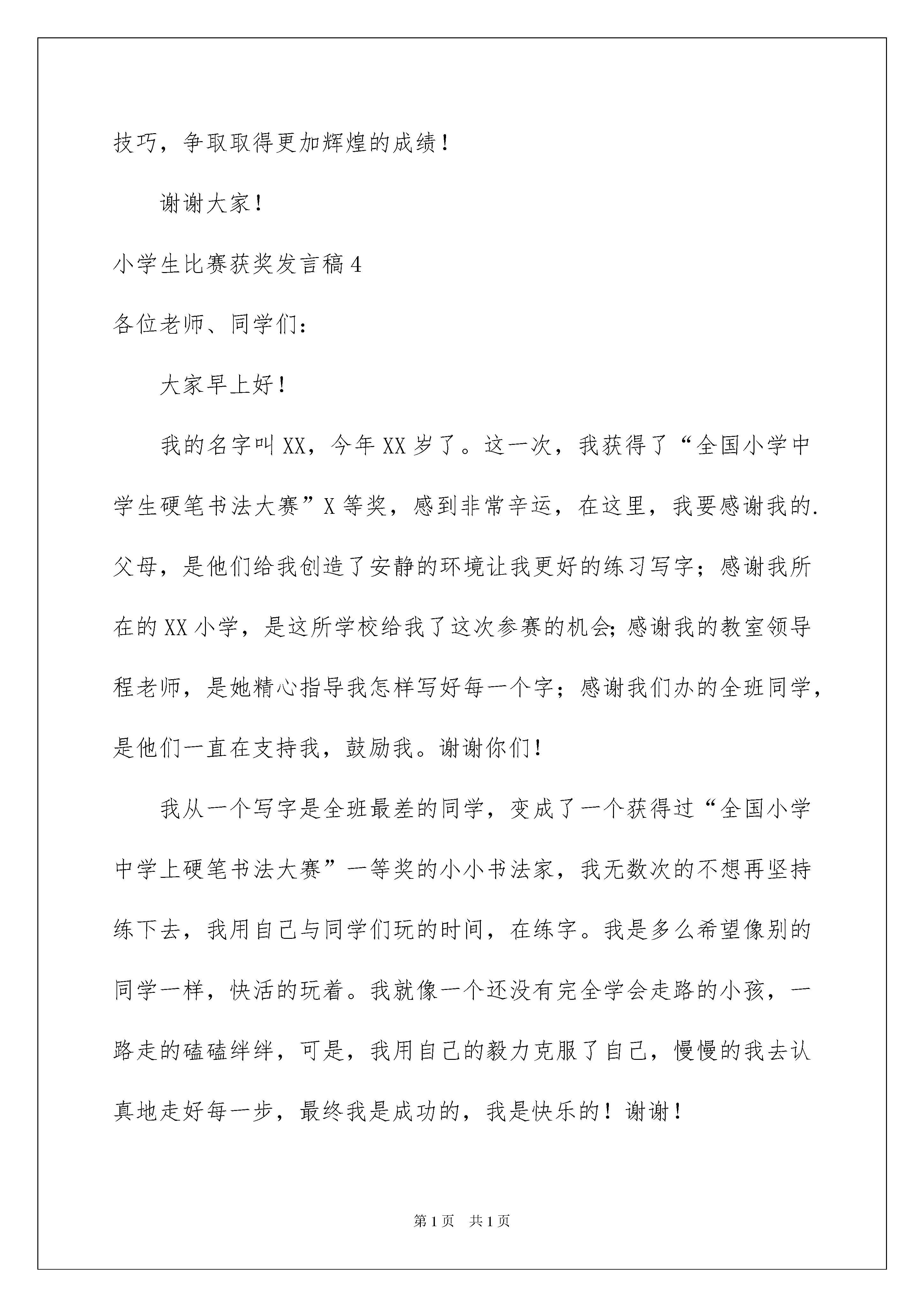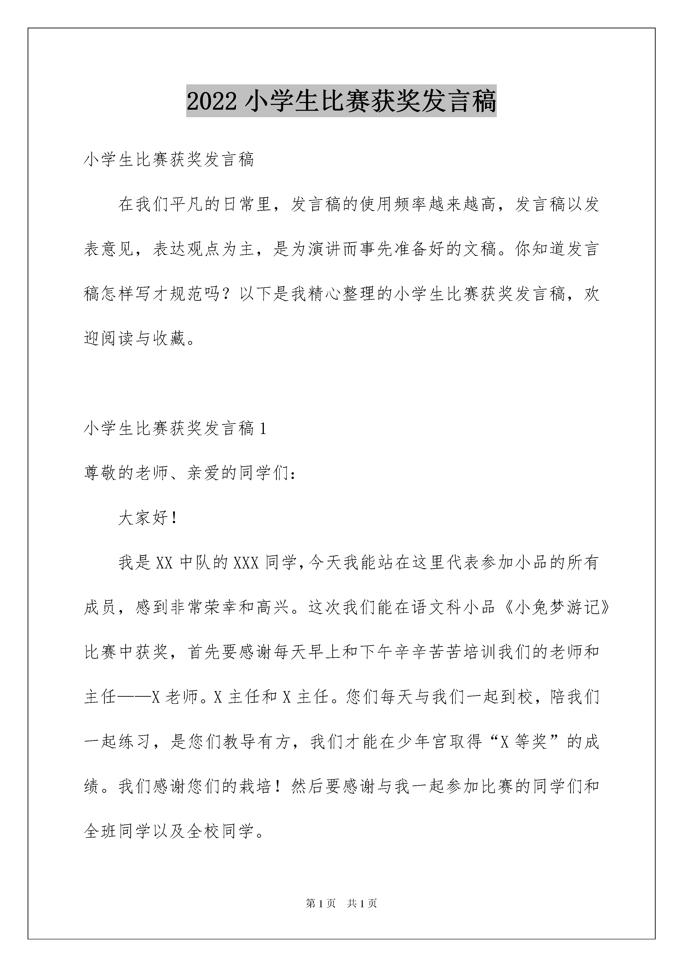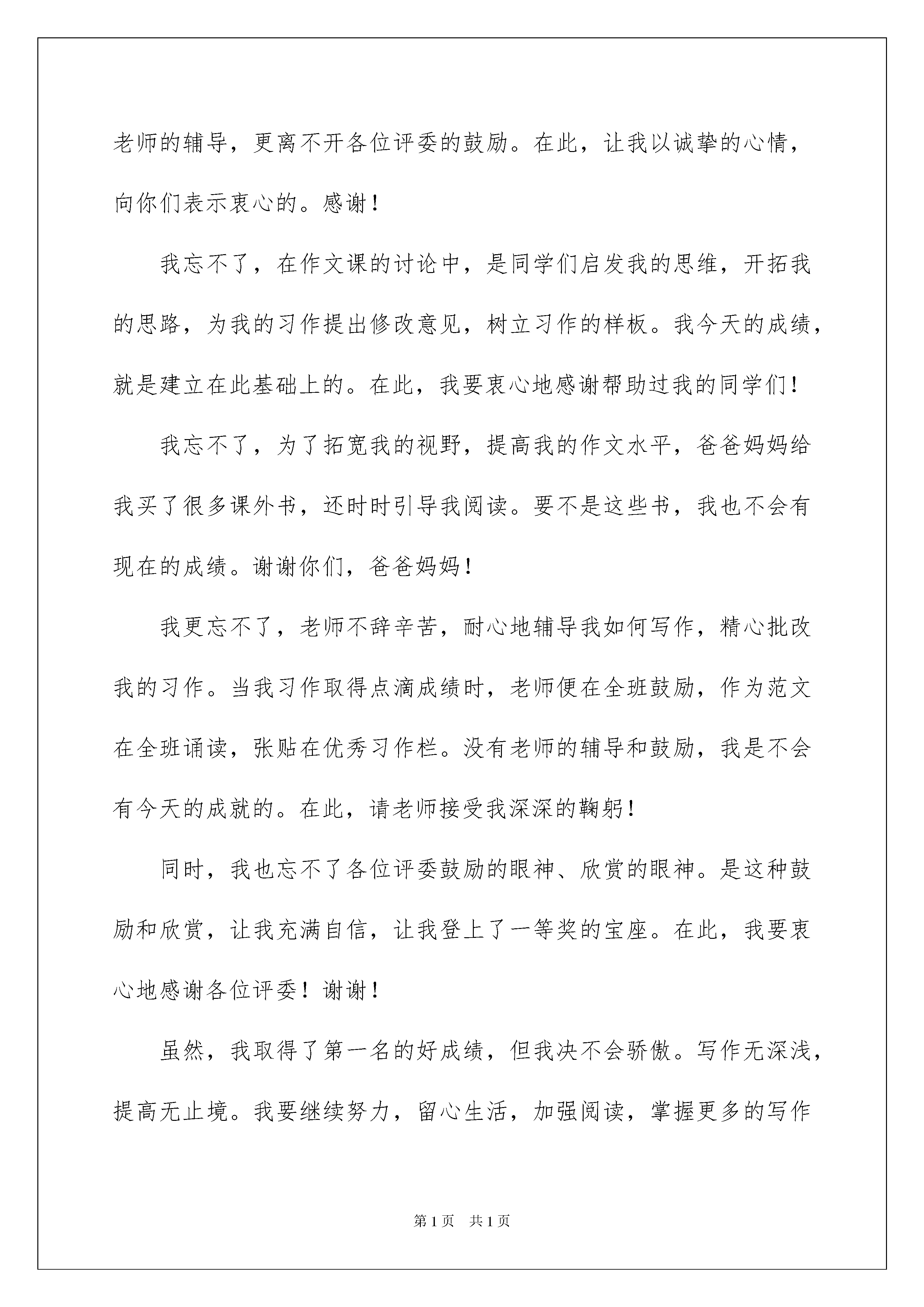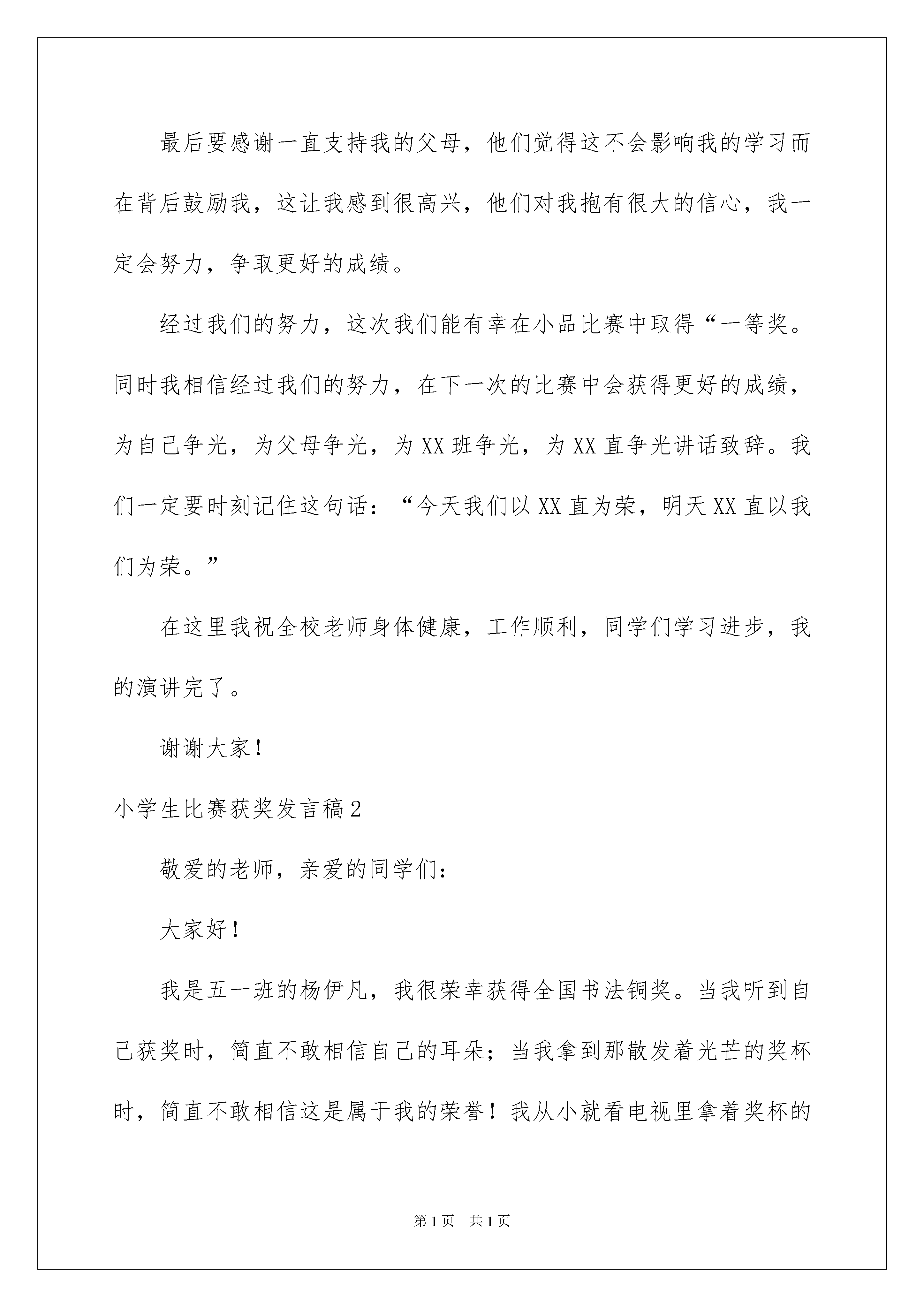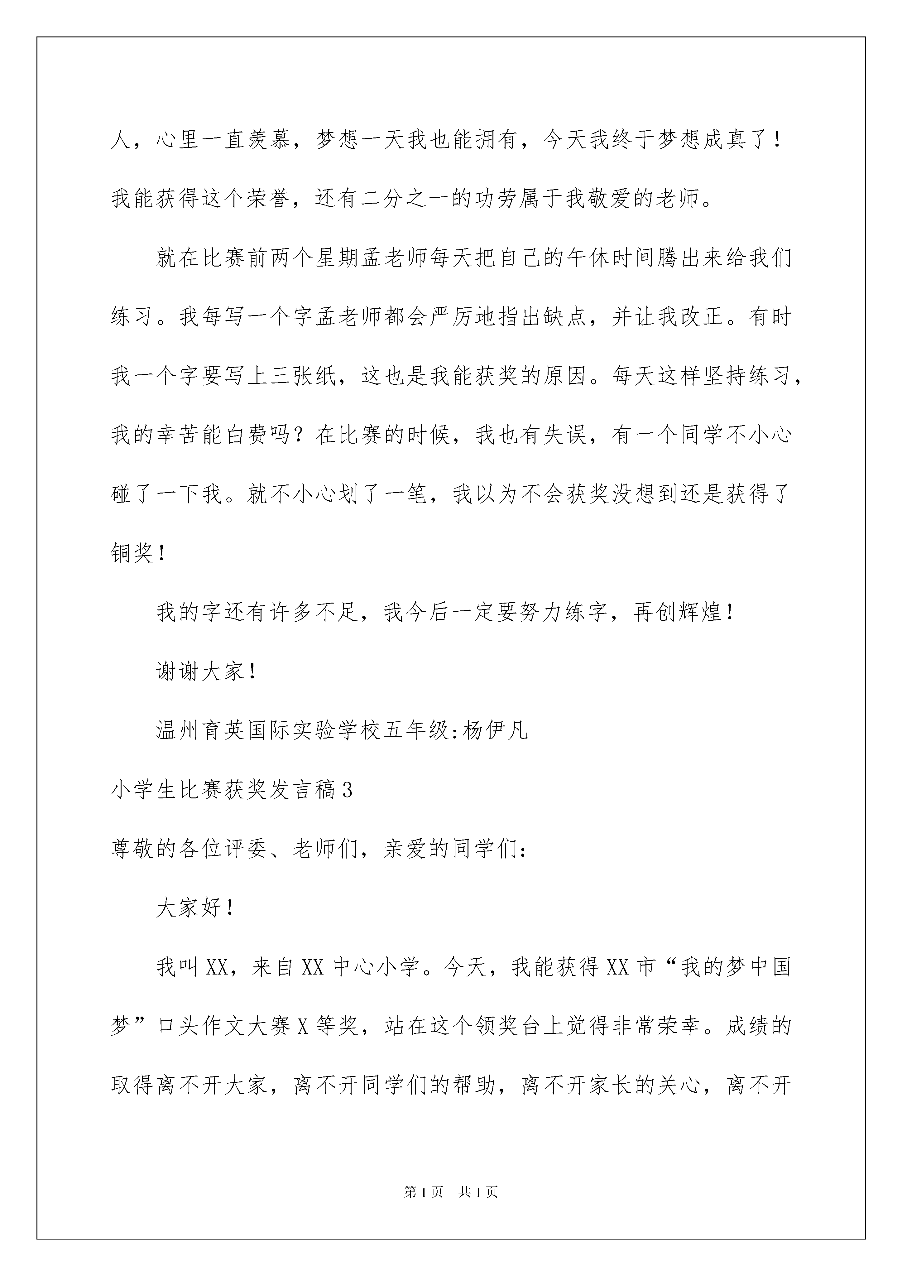 2022小学生比赛获奖发言稿小学生比赛获奖发言稿在我们平凡的日常里,发言稿的使用频率越来越高,发言稿以发表意见,表达观点为主,是为演讲而事先准备好的文稿。你知道发言稿怎样写才规范吗?以下是我精心整理的小学生比赛获奖发言稿,欢迎阅读与收藏。小学生比赛获奖发言稿1尊敬的老师、亲爱的同学们:大家好!我是XX中队的XXX同学,今天我能站在这里代表参加小品的所有成员,感到非常荣幸和高兴。这次我们能在语文科小品《小兔梦游记》比赛中获奖,首先要感谢每天早上和下午辛辛苦苦培训我们的老师和主任——X老师。X主任和X主任。您们每天与我们一起到校,陪我们一起练习,是您们教导有方,我们才能在少年宫取得“X等奖”的成绩。我们感谢您们的栽培!然后要感谢与我一起参加比赛的同学们和全班同学以及全校同学。最后要感谢一直支持我的父母,他们觉得这不会影响我的学习而在背后鼓励我,这让我感到很高兴,他们对我抱有很大的信心,我一定会努力,争取更好的成绩。经过我们的努力,这次我们能有幸在小品比赛中取得“一等奖。同时我相信经过我们的努力,在下一次的比赛中会获得更好的成绩,为自己争光,为父母争光,为XX班争光,为XX直争光讲话致辞。我们一定要时刻记住这句话:“今天我们以XX直为荣,明天XX直以我们为荣。”在这里我祝全校老师身体健康,工作顺利,同学们学习进步,我的演讲完了。谢谢大家!小学生比赛获奖发言稿2敬爱的老师,亲爱的同学们:大家好!我是五一班的杨伊凡,我很荣幸获得全国书法铜奖。当我听到自己获奖时,简直不敢相信自己的耳朵;当我拿到那散发着光芒的奖杯时,简直不敢相信这是属于我的荣誉!我从小就看电视里拿着奖杯的人,心里一直羡慕,梦想一天我也能拥有,今天我终于梦想成真了!我能获得这个荣誉,还有二分之一的功劳属于我敬爱的老师。就在比赛前两个星期孟老师每天把自己的午休时间腾出来给我们练习。我每写一个字孟老师都会严厉地指出缺点,并让我改正。有时我一个字要写上三张纸,这也是我能获奖的原因。每天这样坚持练习,我的幸苦能白费吗?在比赛的时候,我也有失误,有一个同学不小心碰了一下我。就不小心划了一笔,我以为不会获奖没想到还是获得了铜奖!我的字还有许多不足,我今后一定要努力练字,再创辉煌!谢谢大家!温州育英国际实验学校五年级:杨伊凡小学生比赛获奖发言稿3尊敬的各位评委、老师们,亲爱的同学们:大家好!我叫XX,来自XX中心小学。今天,我能获得XX市“我的梦中国梦”口头作文大赛X等奖,站在这个领奖台上觉得非常荣幸。成绩的取得离不开大家,离不开同学们的帮助,离不开家长的关心,离不开老师的辅导,更离不开各位评委的鼓励。在此,让我以诚挚的心情,向你们表示衷心的。感谢!我忘不了,在作文课的讨论中,是同学们启发我的思维,开拓我的思路,为我的习作提出修改意见,树立习作的样板。我今天的成绩,就是建立在此基础上的。在此,我要衷心地感谢帮助过我的同学们!我忘不了,为了拓宽我的视野,提高我的作文水平,爸爸妈妈给我买了很多课外书,还时时引导我阅读。要不是这些书,我也不会有现在的成绩。谢谢你们,爸爸妈妈!我更忘不了,老师不辞辛苦,耐心地辅导我如何写作,精心批改我的习作。当我习作取得点滴成绩时,老师便在全班鼓励,作为范文在全班诵读,张贴在优秀习作栏。没有老师的辅导和鼓励,我是不会有今天的成就的。在此,请老师接受我深深的鞠躬!同时,我也忘不了各位评委鼓励的眼神、欣赏的眼神。是这种鼓励和欣赏,让我充满自信,让我登上了一等奖的宝座。在此,我要衷心地感谢各位评委!谢谢!虽然,我取得了第一名的好成绩,但我决不会骄傲。写作无深浅,提高无止境。我要继续努力,留心生活,加强阅读,掌握更多的写作技巧,争取取得更加辉煌的成绩!谢谢大家!小学生比赛获奖发言稿4各位老师、同学们:大家早上好!我的名字叫XX,今年XX岁了。这一次,我获得了“全国小学中学生硬笔书法大赛”X等奖,感到非常辛运,在这里,我要感谢我的.父母,是他们给我创造了安静的环境让我更好的练习写字;感谢我所在的XX小学,是这所学校给我了这次参赛的机会;感谢我的教室领导程老师,是她精心指导我怎样写好每一个字;感谢我们办的全班同学,是他们一直在支持我,鼓励我。谢谢你们!我从一个写字是全班最差的同学,变成了一个获得过“全国小学中学上硬笔书法大赛”一等奖的小小书法家,我无数次的不想再坚持练下去,我用自己与同学们玩的时间,在练字。我是多么希望像别的同学一样,快活的玩着。我就像一个还没有完全学会走路的小孩,一路走的磕磕绊绊,可是,我用自己的毅力克服了自己,慢慢的我去认真地走好每一步,最终我是成功的,我是快乐的!谢谢!小学生比赛获奖发言稿5尊敬的