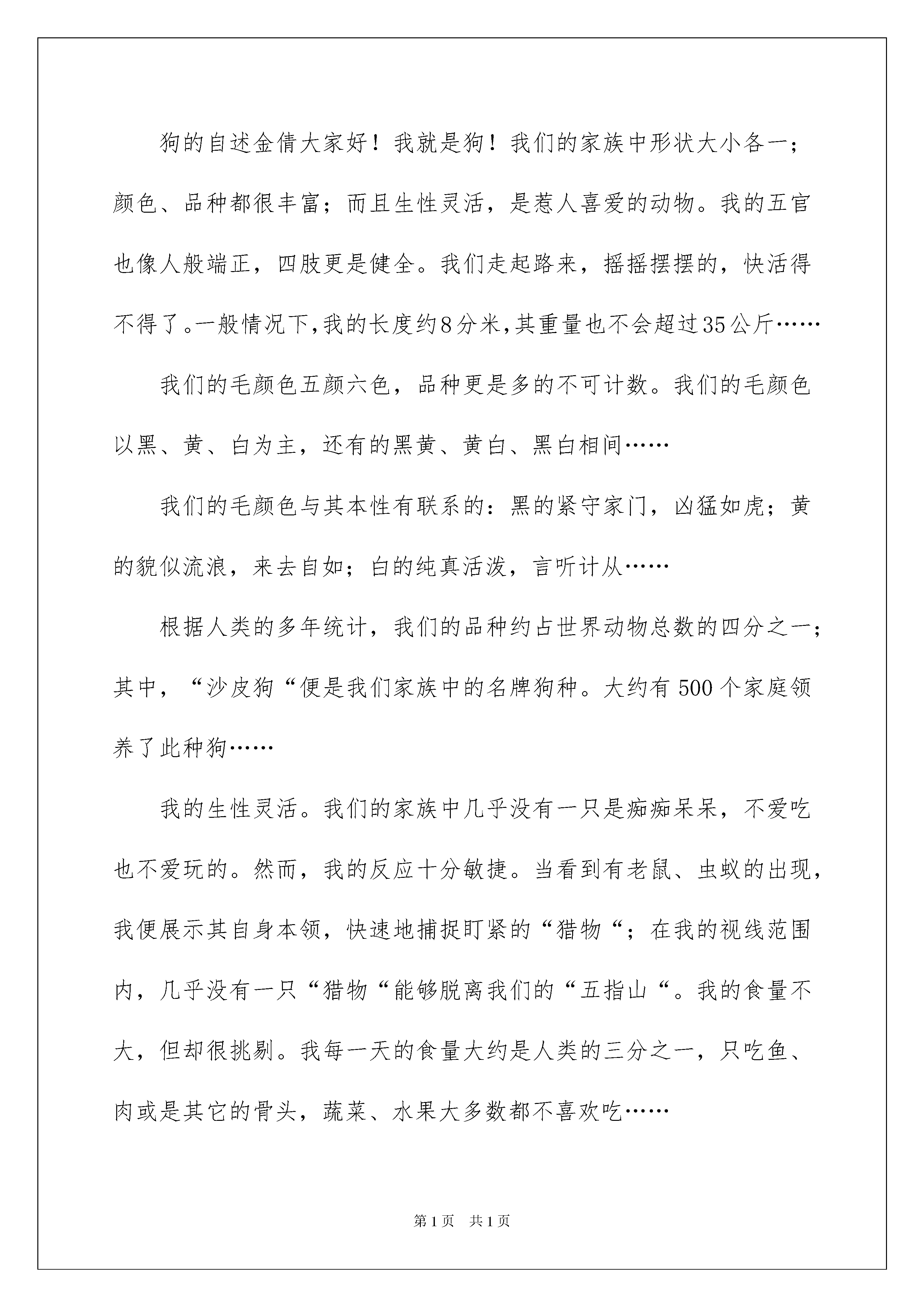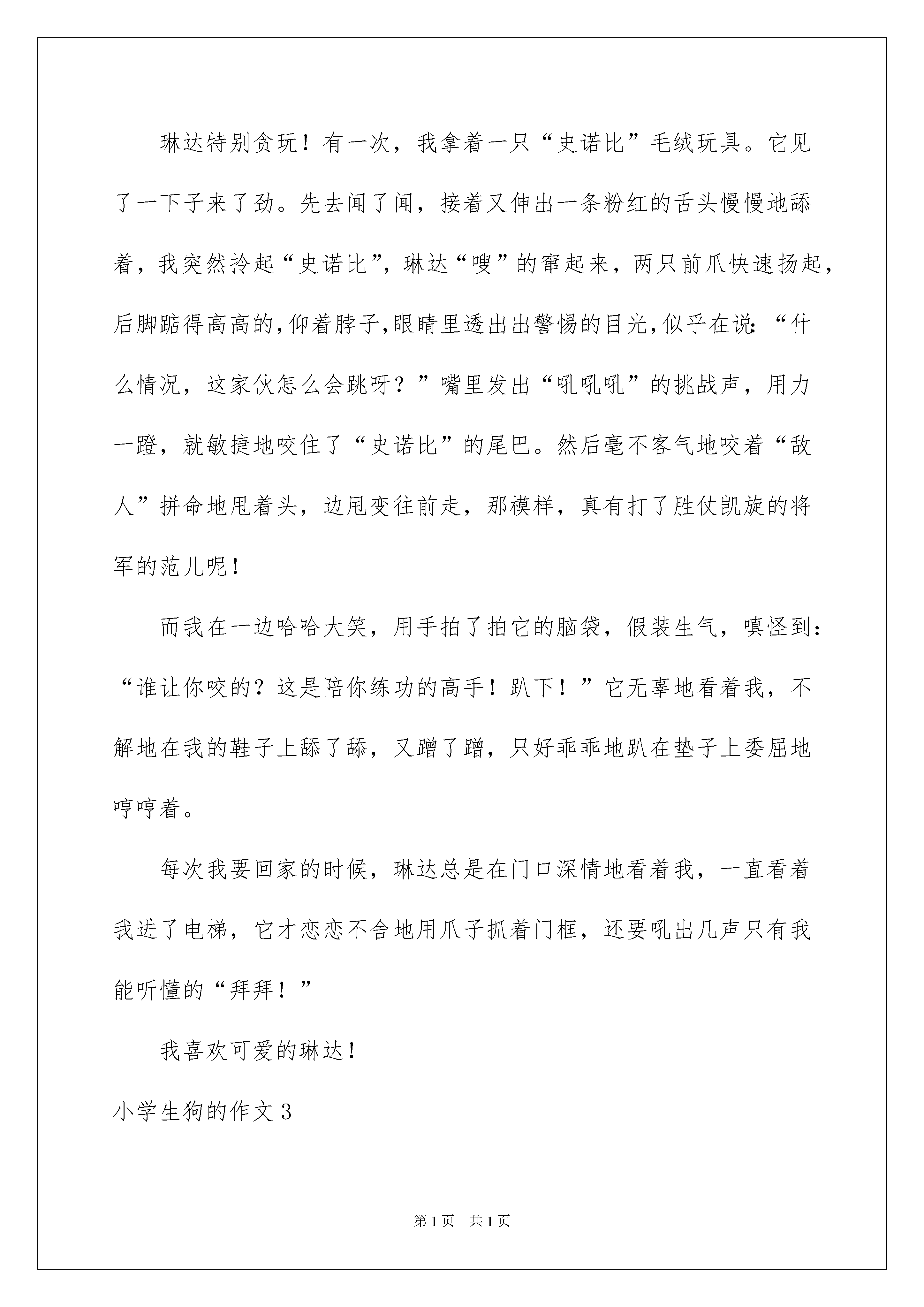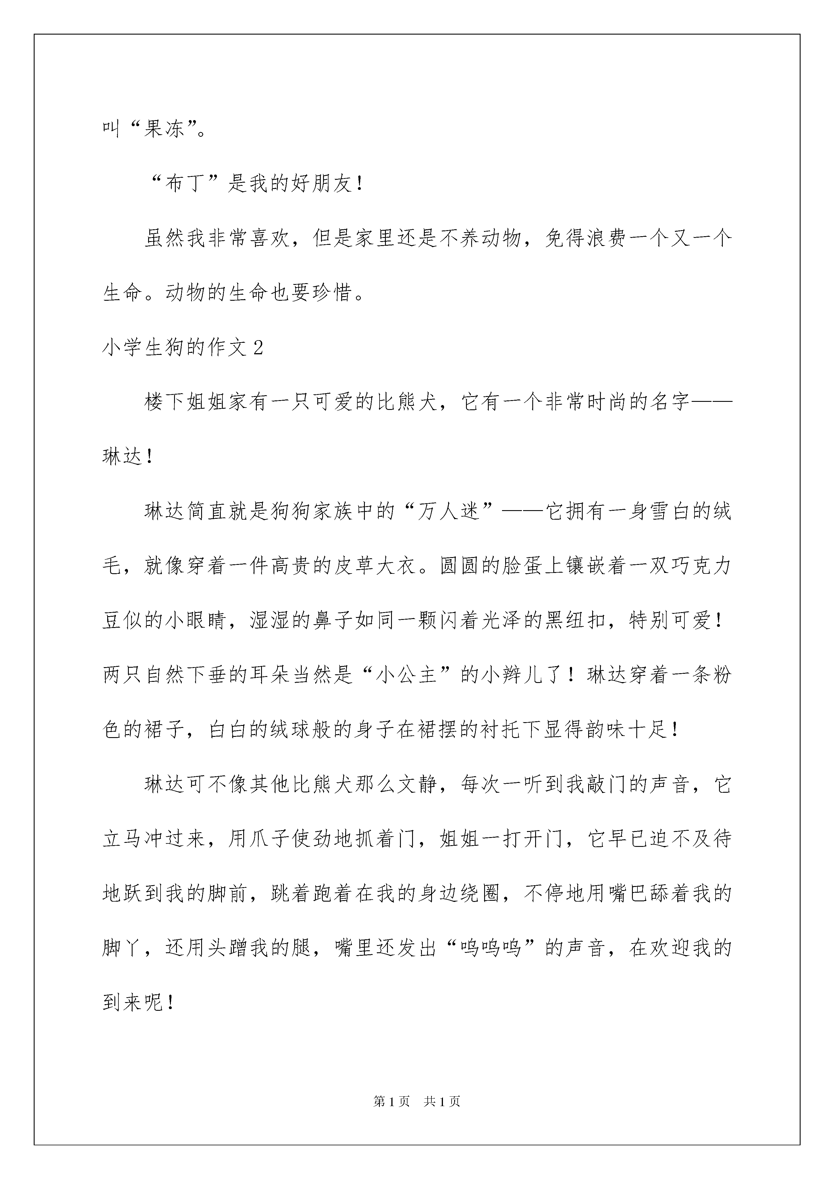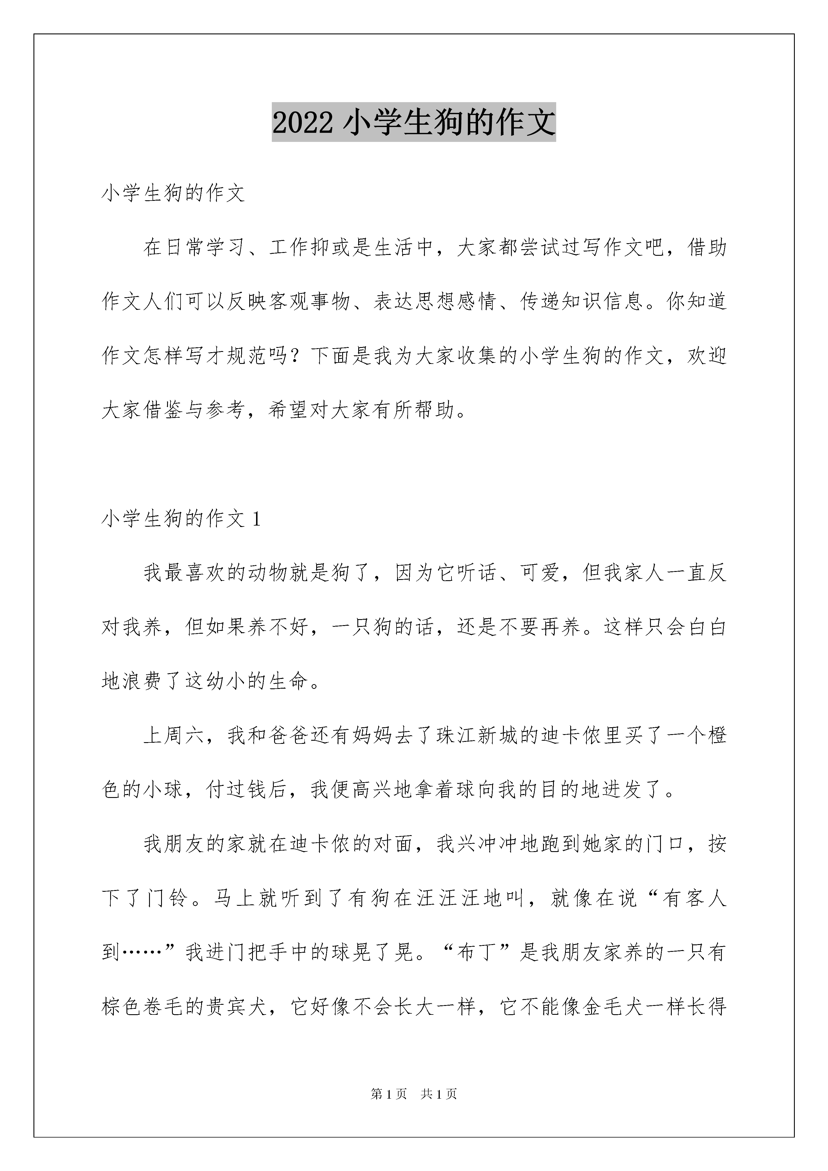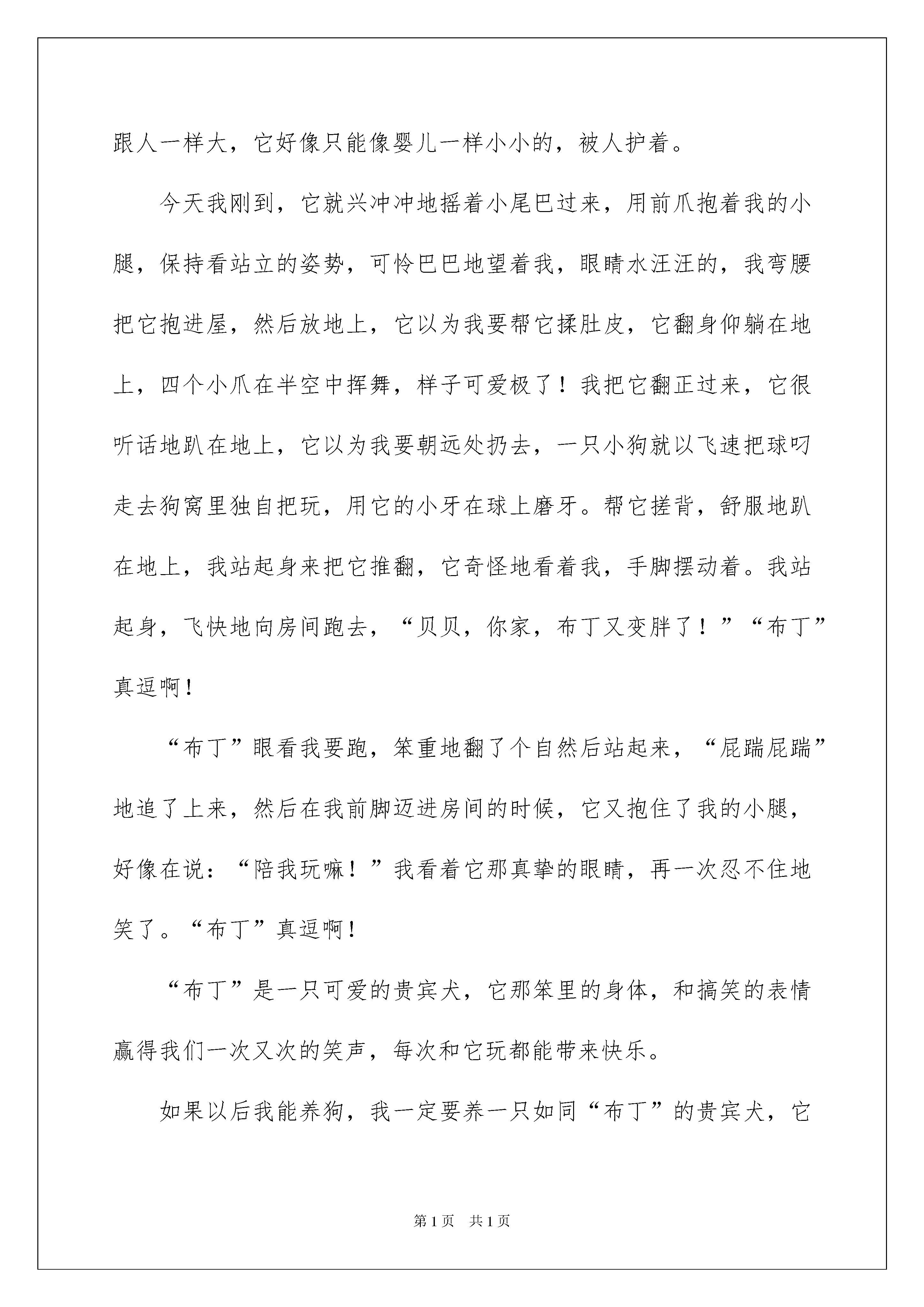 2022小学生狗的作文小学生狗的作文在日常学习、工作抑或是生活中,大家都尝试过写作文吧,借助作文人们可以反映客观事物、表达思想感情、传递知识信息。你知道作文怎样写才规范吗?下面是我为大家收集的小学生狗的作文,欢迎大家借鉴与参考,希望对大家有所帮助。小学生狗的作文1我最喜欢的动物就是狗了,因为它听话、可爱,但我家人一直反对我养,但如果养不好,一只狗的话,还是不要再养。这样只会白白地浪费了这幼小的生命。上周六,我和爸爸还有妈妈去了珠江新城的迪卡侬里买了一个橙色的小球,付过钱后,我便高兴地拿着球向我的目的地进发了。我朋友的家就在迪卡侬的对面,我兴冲冲地跑到她家的门口,按下了门铃。马上就听到了有狗在汪汪汪地叫,就像在说“有客人到……”我进门把手中的球晃了晃。“布丁”是我朋友家养的一只有棕色卷毛的贵宾犬,它好像不会长大一样,它不能像金毛犬一样长得跟人一样大,它好像只能像婴儿一样小小的,被人护着。今天我刚到,它就兴冲冲地摇着小尾巴过来,用前爪抱着我的小腿,保持看站立的姿势,可怜巴巴地望着我,眼睛水汪汪的,我弯腰把它抱进屋,然后放地上,它以为我要帮它揉肚皮,它翻身仰躺在地上,四个小爪在半空中挥舞,样子可爱极了!我把它翻正过来,它很听话地趴在地上,它以为我要朝远处扔去,一只小狗就以飞速把球叼走去狗窝里独自把玩,用它的小牙在球上磨牙。帮它搓背,舒服地趴在地上,我站起身来把它推翻,它奇怪地看着我,手脚摆动着。我站起身,飞快地向房间跑去,“贝贝,你家,布丁又变胖了!”“布丁”真逗啊!“布丁”眼看我要跑,笨重地翻了个自然后站起来,“屁踹屁踹”地追了上来,然后在我前脚迈进房间的时候,它又抱住了我的小腿,好像在说:“陪我玩嘛!”我看着它那真挚的眼睛,再一次忍不住地笑了。“布丁”真逗啊!“布丁”是一只可爱的贵宾犬,它那笨里的身体,和搞笑的表情赢得我们一次又次的笑声,每次和它玩都能带来快乐。如果以后我能养狗,我一定要养一只如同“布丁”的贵宾犬,它叫“果冻”。“布丁”是我的好朋友!虽然我非常喜欢,但是家里还是不养动物,免得浪费一个又一个生命。动物的生命也要珍惜。小学生狗的作文2楼下姐姐家有一只可爱的比熊犬,它有一个非常时尚的名字——琳达!琳达简直就是狗狗家族中的“万人迷”——它拥有一身雪白的绒毛,就像穿着一件高贵的皮草大衣。圆圆的脸蛋上镶嵌着一双巧克力豆似的小眼睛,湿湿的鼻子如同一颗闪着光泽的黑纽扣,特别可爱!两只自然下垂的耳朵当然是“小公主”的小辫儿了!琳达穿着一条粉色的裙子,白白的绒球般的身子在裙摆的衬托下显得韵味十足!琳达可不像其他比熊犬那么文静,每次一听到我敲门的声音,它立马冲过来,用爪子使劲地抓着门,姐姐一打开门,它早已迫不及待地跃到我的脚前,跳着跑着在我的身边绕圈,不停地用嘴巴舔着我的脚丫,还用头蹭我的腿,嘴里还发出“呜呜呜”的声音,在欢迎我的到来呢!琳达特别贪玩!有一次,我拿着一只“史诺比”毛绒玩具。它见了一下子来了劲。先去闻了闻,接着又伸出一条粉红的舌头慢慢地舔着,我突然拎起“史诺比”,琳达“嗖”的窜起来,两只前爪快速扬起,后脚踮得高高的,仰着脖子,眼睛里透出出警惕的目光,似乎在说:“什么情况,这家伙怎么会跳呀?”嘴里发出“吼吼吼”的挑战声,用力一蹬,就敏捷地咬住了“史诺比”的尾巴。然后毫不客气地咬着“敌人”拼命地甩着头,边甩变往前走,那模样,真有打了胜仗凯旋的将军的范儿呢!而我在一边哈哈大笑,用手拍了拍它的脑袋,假装生气,嗔怪到:“谁让你咬的?这是陪你练功的高手!趴下!”它无辜地看着我,不解地在我的鞋子上舔了舔,又蹭了蹭,只好乖乖地趴在垫子上委屈地哼哼着。每次我要回家的时候,琳达总是在门口深情地看着我,一直看着我进了电梯,它才恋恋不舍地用爪子抓着门框,还要吼出几声只有我能听懂的“拜拜!”我喜欢可爱的琳达!小学生狗的作文3狗的自述金倩大家好!我就是狗!我们的家族中形状大小各一;颜色、品种都很丰富;而且生性灵活,是惹人喜爱的动物。我的五官也像人般端正,四肢更是健全。我们走起路来,摇摇摆摆的,快活得不得了。一般情况下,我的长度约8分米,其重量也不会超过35公斤……我们的毛颜色五颜六色,品种更是多的不可计数。我们的毛颜色以黑、黄、白为主,还有的黑黄、黄白、黑白相间……我们的毛颜色与其本性有联系的:黑的紧守家门,凶猛如虎;黄的貌似流浪,来去自如;白的纯真活泼,言听计从……根据人类的多年统计,我们的品种约占世界动物总数的四分之一;其中,“沙皮狗“便是我们家族中的名牌狗种。大约有500个家庭领养了此种狗……我的生性灵活。我们的家族中几乎没有一只是痴痴呆呆,不爱吃也不爱玩的。然而,我的反应十分敏捷。当看