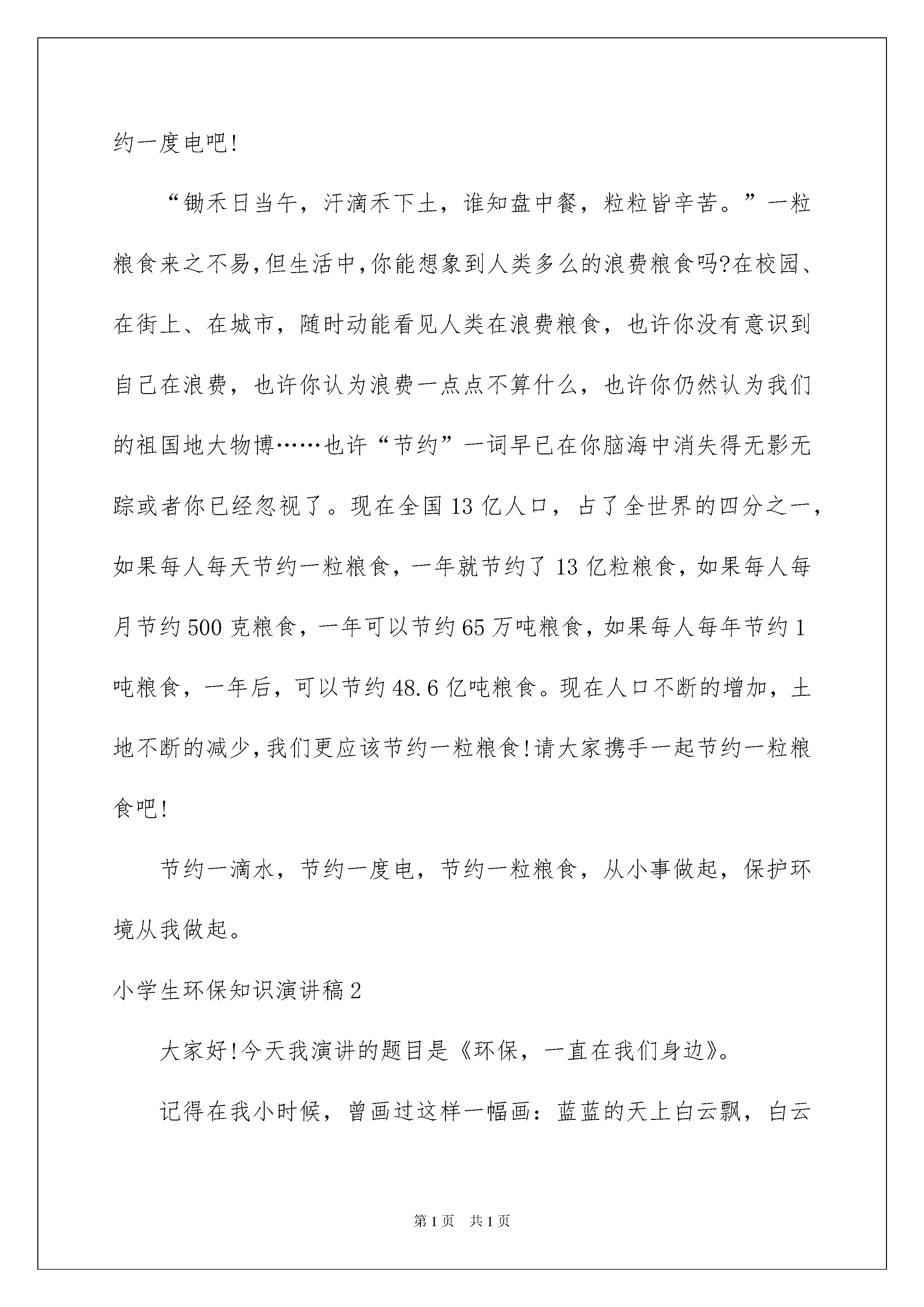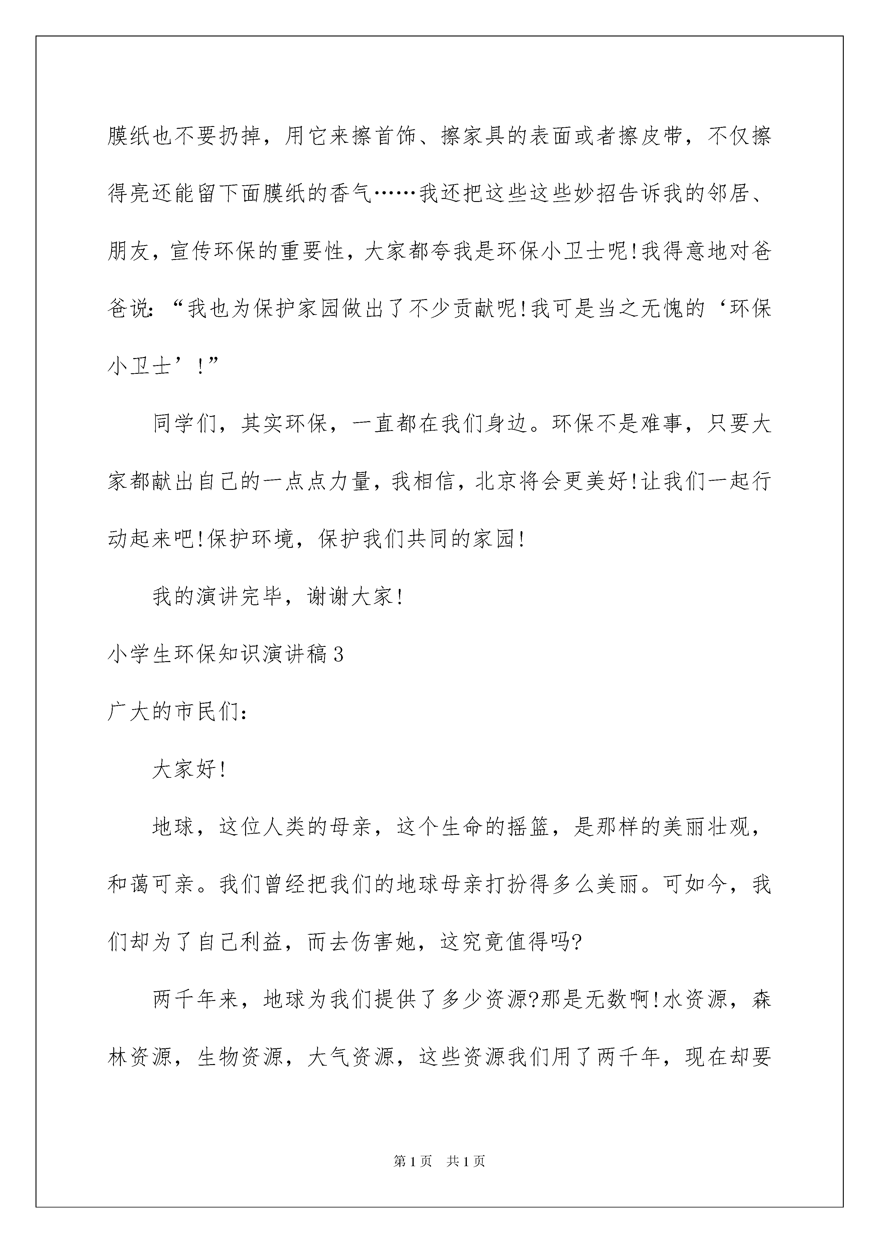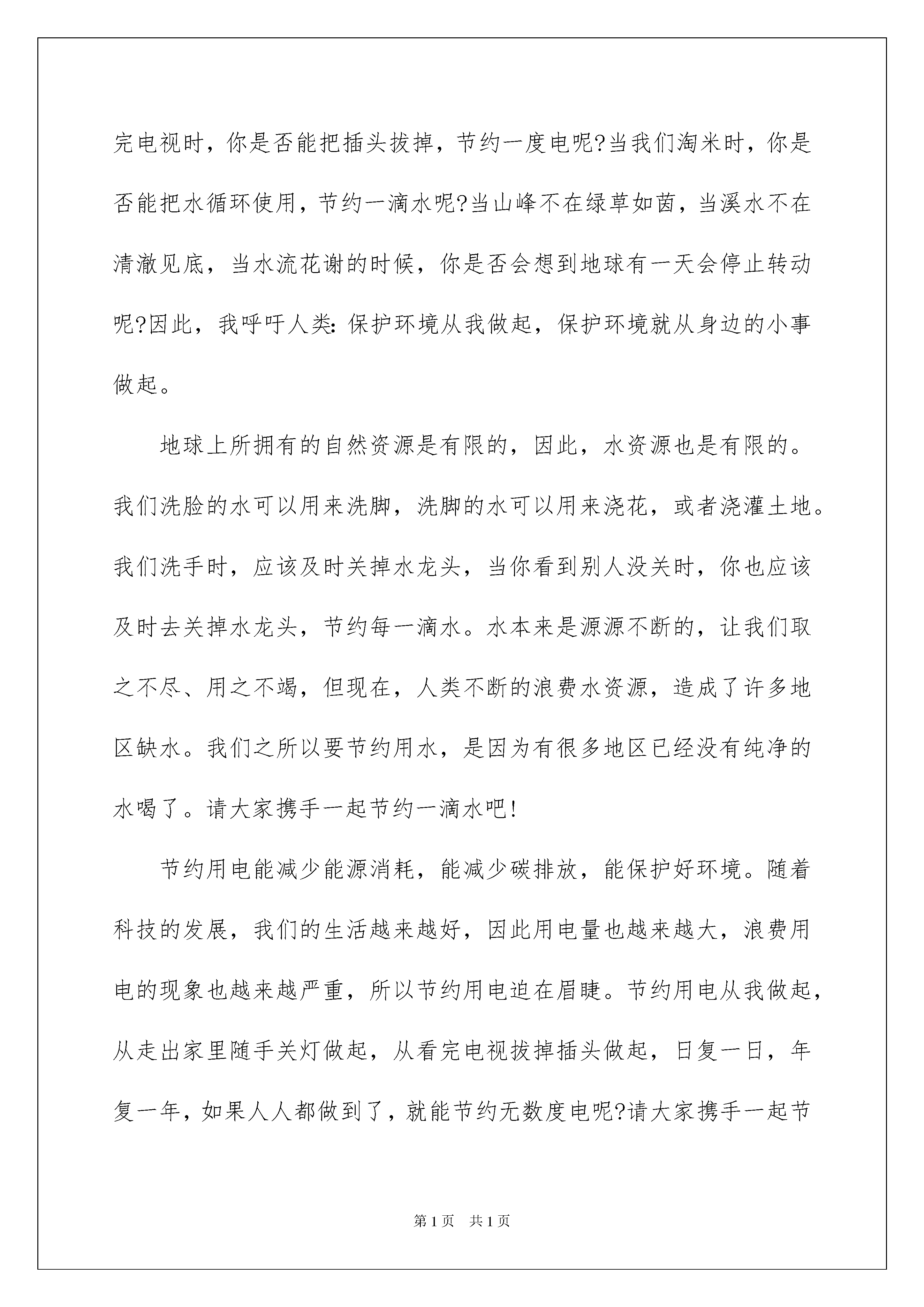 2022小学生环保知识演讲稿小学生环保知识演讲稿演讲稿的写法比较灵活,可以根据会议的内容、一件事事后的感想、需要等情况而有所区别。现如今,越来越多地方需要用到演讲稿,怎么写演讲稿才能避免踩雷呢?下面是我为大家收集的小学生环保知识演讲稿,希望对大家有所帮助。小学生环保知识演讲稿1亲爱的老师、同学们:大家好!在整个历史的长河中,人类文明始终受制于人类对大自然界的认识程度。当我们从这个意义上重新衡量人类文明的功过时,我们便没有足够的信心来赞美今天的人类文明了,至少我们不能盲目地加以赞美。听一下地球的自述吧:“我这时气得不得了,我们为人类做的尽心尽力、毫无所求,为什么人类还要损坏地球呢?我们对人类无私奉献,人类为什么还这么自私、自利呢?”人类啊,醒醒吧,难道你们就不吝惜自己的家园吗?当我们吃饭时,你是否能节约一粒粮食呢?当我们看完电视时,你是否能把插头拔掉,节约一度电呢?当我们淘米时,你是否能把水循环使用,节约一滴水呢?当山峰不在绿草如茵,当溪水不在清澈见底,当水流花谢的时候,你是否会想到地球有一天会停止转动呢?因此,我呼吁人类:保护环境从我做起,保护环境就从身边的小事做起。地球上所拥有的自然资源是有限的,因此,水资源也是有限的。我们洗脸的水可以用来洗脚,洗脚的水可以用来浇花,或者浇灌土地。我们洗手时,应该及时关掉水龙头,当你看到别人没关时,你也应该及时去关掉水龙头,节约每一滴水。水本来是源源不断的,让我们取之不尽、用之不竭,但现在,人类不断的浪费水资源,造成了许多地区缺水。我们之所以要节约用水,是因为有很多地区已经没有纯净的水喝了。请大家携手一起节约一滴水吧!节约用电能减少能源消耗,能减少碳排放,能保护好环境。随着科技的发展,我们的生活越来越好,因此用电量也越来越大,浪费用电的现象也越来越严重,所以节约用电迫在眉睫。节约用电从我做起,从走出家里随手关灯做起,从看完电视拔掉插头做起,日复一日,年复一年,如果人人都做到了,就能节约无数度电呢?请大家携手一起节约一度电吧!“锄禾日当午,汗滴禾下土,谁知盘中餐,粒粒皆辛苦。”一粒粮食来之不易,但生活中,你能想象到人类多么的浪费粮食吗?在校园、在街上、在城市,随时动能看见人类在浪费粮食,也许你没有意识到自己在浪费,也许你认为浪费一点点不算什么,也许你仍然认为我们的祖国地大物博……也许“节约”一词早已在你脑海中消失得无影无踪或者你已经忽视了。现在全国13亿人口,占了全世界的四分之一,如果每人每天节约一粒粮食,一年就节约了13亿粒粮食,如果每人每月节约500克粮食,一年可以节约65万吨粮食,如果每人每年节约1吨粮食,一年后,可以节约48.6亿吨粮食。现在人口不断的增加,土地不断的减少,我们更应该节约一粒粮食!请大家携手一起节约一粒粮食吧!节约一滴水,节约一度电,节约一粒粮食,从小事做起,保护环境从我做起。小学生环保知识演讲稿2大家好!今天我演讲的题目是《环保,一直在我们身边》。记得在我小时候,曾画过这样一幅画:蓝蓝的天上白云飘,白云下面马儿跑;高高的山,绿绿的草,清清的河水潺潺的流。如今,科技飞速发展,人类的生活越来越好,楼房越盖越高。可是,绿色呢?却越来越少。就拿我们的北京来说吧!北京的大气污染极为严重!我曾在报纸上看到这样一则报道:我市大部分地区PM2.5的监测值都达到了7000微克立方米左右,这可是一个非常高的值呀,截止到现在,我市各地区PM2。5的空气质量级别还是严重污染。看到这则报道,我的心不由得震颤了,虽然我不是北京人,但是,我却在这里生活了十二年之久。谁不希望自己生活在一个美好舒适的环境呢?我想:一定要行动起来呀!可是,我又能为北京做些什么呢?爸爸仿佛看穿了我的心思,他摸摸我的头,笑着说:“傻孩子,保护环境不一定要干什么大事业,其实,环保,就在我们身边!我们要从身边的点滴小事做起哦!”我恍然大悟,立马行动了起来,把那些零七八碎的废纸条、废报纸、作业本什么的统统“集结”起来,换了不少钱呢!我用那这些钱,买了许多的花草,放在我的床头,这样不仅美观而且可以净化空气,真是一举两得!为了做出“贡献”,我还学了不少妙招呢!例如:每天的淘米水可以用来洗手擦家具,干净卫生,自然滋润,将废旧报纸铺垫在衣橱的最底层,不仅可以吸潮,还能吸收衣柜中的异味,用过的面膜纸也不要扔掉,用它来擦首饰、擦家具的表面或者擦皮带,不仅擦得亮还能留下面膜纸的香气……我还把这些这些妙招告诉我的邻居、朋友,宣传环保的重要性,大家都夸我是环保小卫士呢!我得意地对爸爸说:“我也为保护家园做出了不少贡献呢!我可是当之无愧的‘环保小卫士’!”同学们,其实环保,一直都在我们身边。环