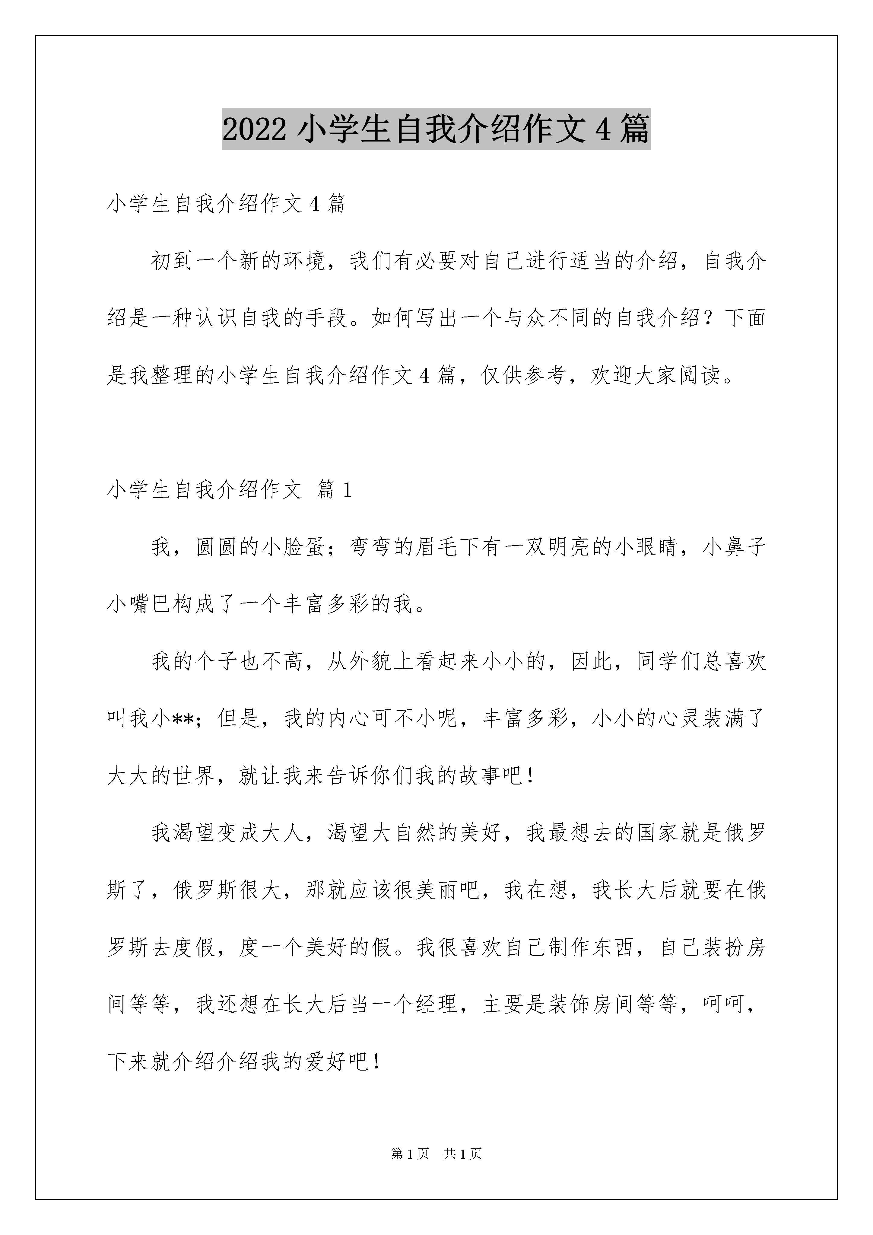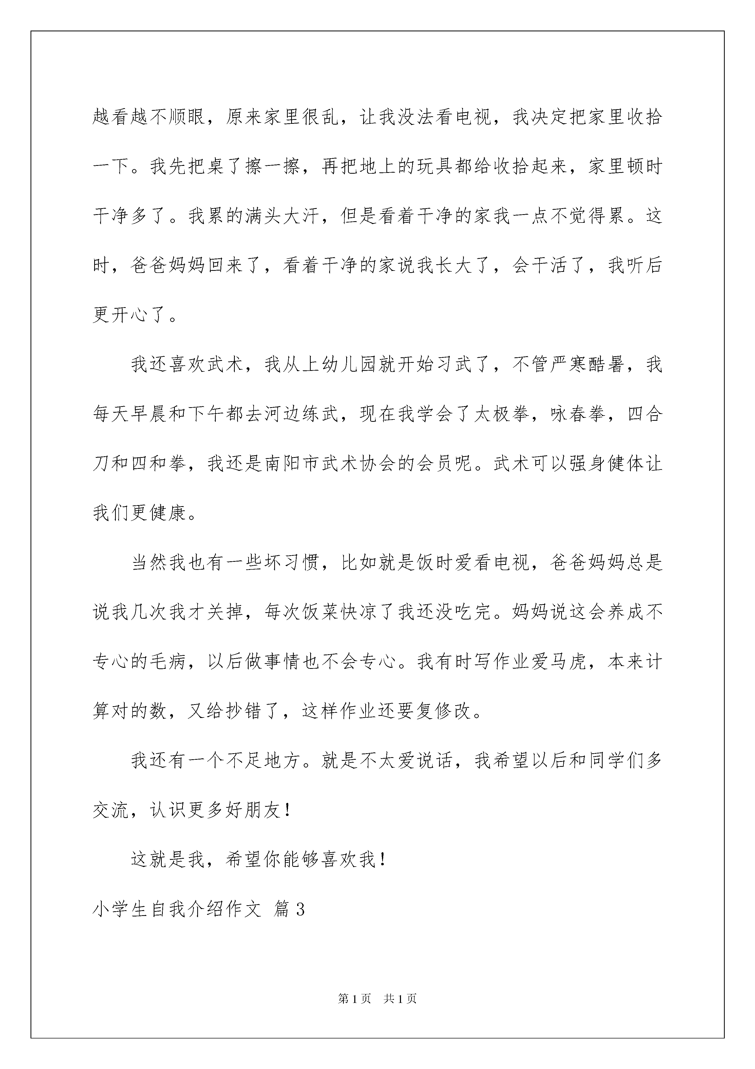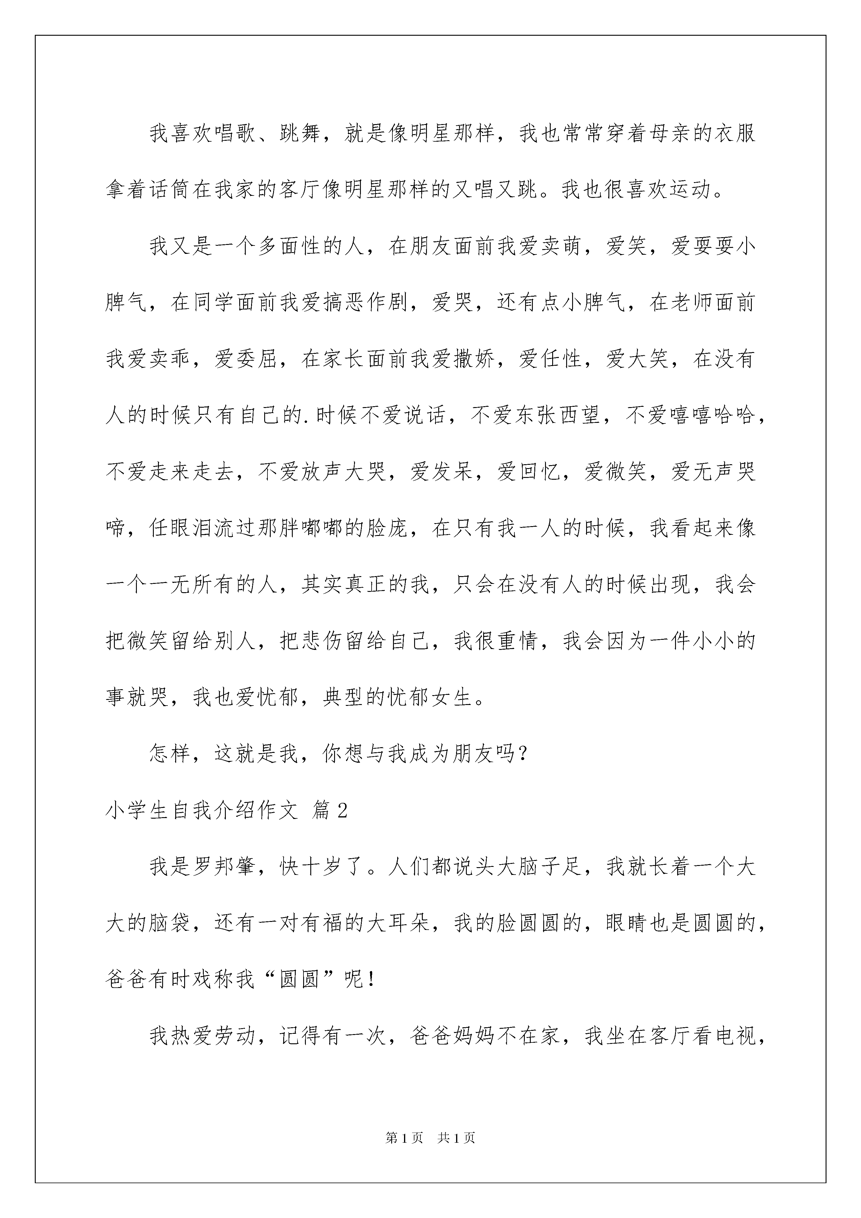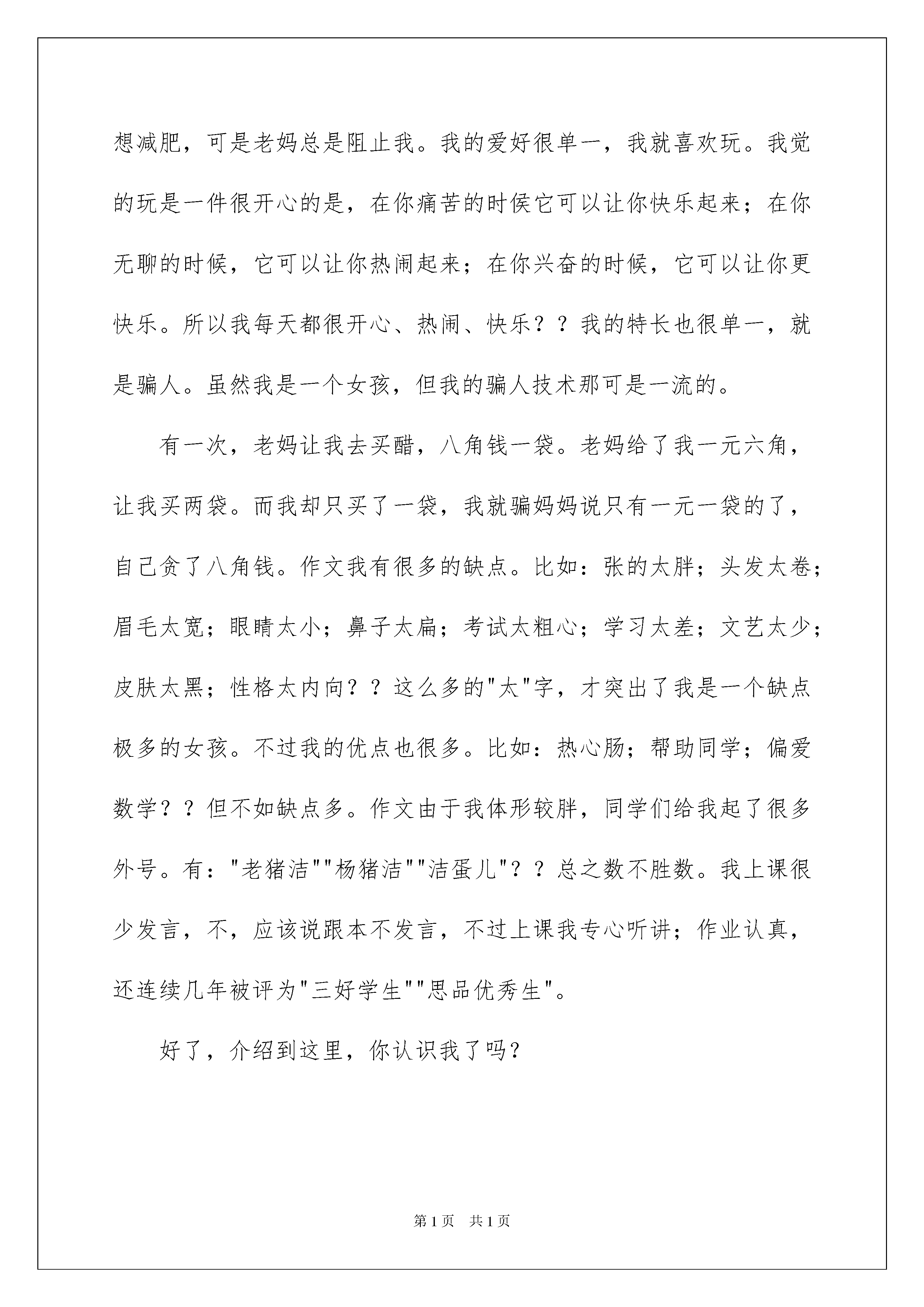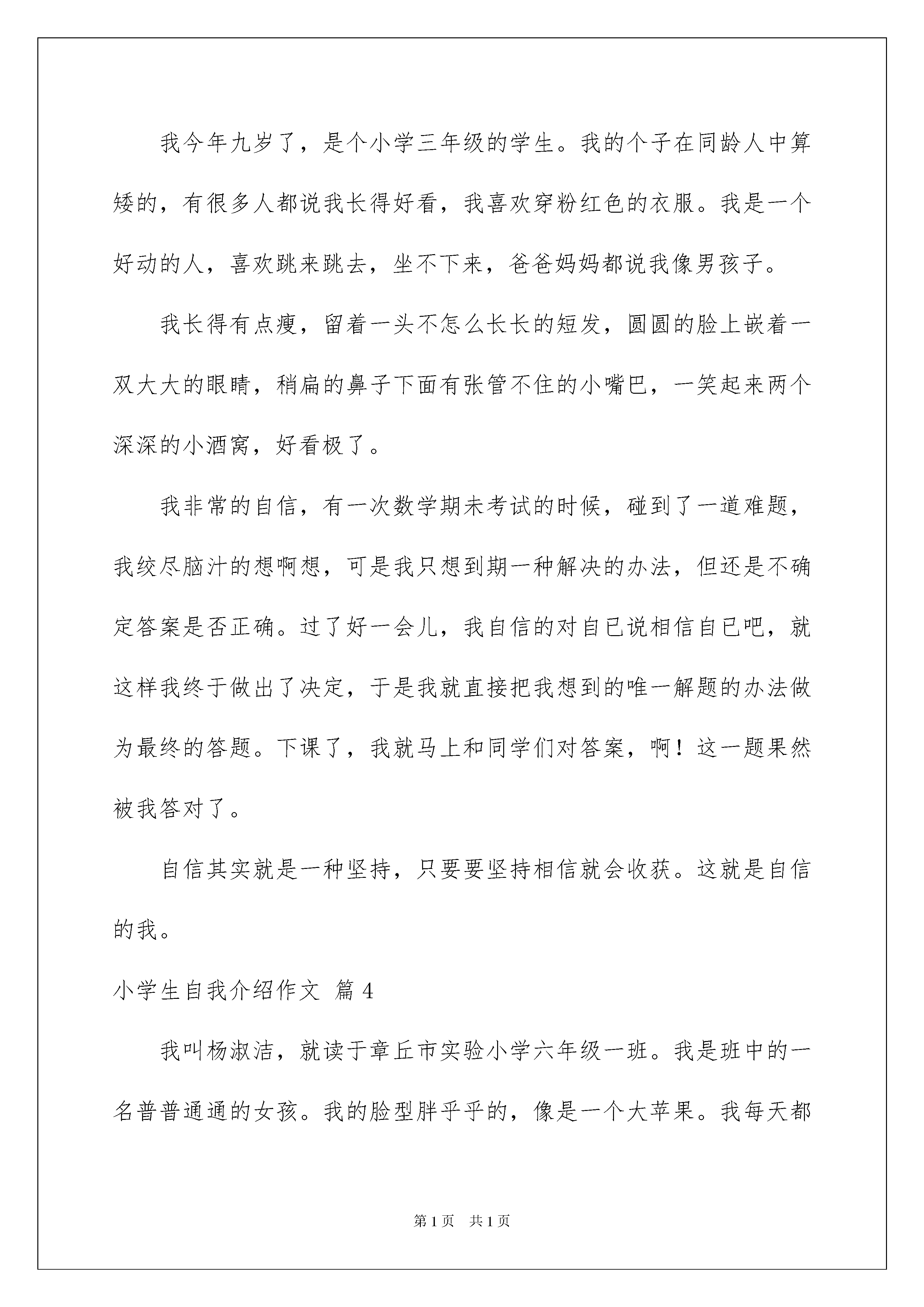 2022小学生自我介绍作文4篇小学生自我介绍作文4篇初到一个新的环境,我们有必要对自己进行适当的介绍,自我介绍是一种认识自我的手段。如何写出一个与众不同的自我介绍?下面是我整理的小学生自我介绍作文4篇,仅供参考,欢迎大家阅读。小学生自我介绍作文篇1我,圆圆的小脸蛋;弯弯的眉毛下有一双明亮的小眼睛,小鼻子小嘴巴构成了一个丰富多彩的我。我的个子也不高,从外貌上看起来小小的,因此,同学们总喜欢叫我小**;但是,我的内心可不小呢,丰富多彩,小小的心灵装满了大大的世界,就让我来告诉你们我的故事吧!我渴望变成大人,渴望大自然的美好,我最想去的国家就是俄罗斯了,俄罗斯很大,那就应该很美丽吧,我在想,我长大后就要在俄罗斯去度假,度一个美好的假。我很喜欢自己制作东西,自己装扮房间等等,我还想在长大后当一个经理,主要是装饰房间等等,呵呵,下来就介绍介绍我的爱好吧!我喜欢唱歌、跳舞,就是像明星那样,我也常常穿着母亲的衣服拿着话筒在我家的客厅像明星那样的又唱又跳。我也很喜欢运动。我又是一个多面性的人,在朋友面前我爱卖萌,爱笑,爱耍耍小脾气,在同学面前我爱搞恶作剧,爱哭,还有点小脾气,在老师面前我爱卖乖,爱委屈,在家长面前我爱撒娇,爱任性,爱大笑,在没有人的时候只有自己的.时候不爱说话,不爱东张西望,不爱嘻嘻哈哈,不爱走来走去,不爱放声大哭,爱发呆,爱回忆,爱微笑,爱无声哭啼,任眼泪流过那胖嘟嘟的脸庞,在只有我一人的时候,我看起来像一个一无所有的人,其实真正的我,只会在没有人的时候出现,我会把微笑留给别人,把悲伤留给自己,我很重情,我会因为一件小小的事就哭,我也爱忧郁,典型的忧郁女生。怎样,这就是我,你想与我成为朋友吗?小学生自我介绍作文篇2我是罗邦肇,快十岁了。人们都说头大脑子足,我就长着一个大大的脑袋,还有一对有福的大耳朵,我的脸圆圆的,眼睛也是圆圆的,爸爸有时戏称我“圆圆”呢!我热爱劳动,记得有一次,爸爸妈妈不在家,我坐在客厅看电视,越看越不顺眼,原来家里很乱,让我没法看电视,我决定把家里收拾一下。我先把桌了擦一擦,再把地上的玩具都给收拾起来,家里顿时干净多了。我累的满头大汗,但是看着干净的家我一点不觉得累。这时,爸爸妈妈回来了,看着干净的家说我长大了,会干活了,我听后更开心了。我还喜欢武术,我从上幼儿园就开始习武了,不管严寒酷暑,我每天早晨和下午都去河边练武,现在我学会了太极拳,咏春拳,四合刀和四和拳,我还是南阳市武术协会的会员呢。武术可以强身健体让我们更健康。当然我也有一些坏习惯,比如就是饭时爱看电视,爸爸妈妈总是说我几次我才关掉,每次饭菜快凉了我还没吃完。妈妈说这会养成不专心的毛病,以后做事情也不会专心。我有时写作业爱马虎,本来计算对的数,又给抄错了,这样作业还要复修改。我还有一个不足地方。就是不太爱说话,我希望以后和同学们多交流,认识更多好朋友!这就是我,希望你能够喜欢我!小学生自我介绍作文篇3我今年九岁了,是个小学三年级的学生。我的个子在同龄人中算矮的,有很多人都说我长得好看,我喜欢穿粉红色的衣服。我是一个好动的人,喜欢跳来跳去,坐不下来,爸爸妈妈都说我像男孩子。我长得有点瘦,留着一头不怎么长长的短发,圆圆的脸上嵌着一双大大的眼睛,稍扁的鼻子下面有张管不住的小嘴巴,一笑起来两个深深的小酒窝,好看极了。我非常的自信,有一次数学期未考试的时候,碰到了一道难题,我绞尽脑汁的想啊想,可是我只想到期一种解决的办法,但还是不确定答案是否正确。过了好一会儿,我自信的对自已说相信自已吧,就这样我终于做出了决定,于是我就直接把我想到的唯一解题的办法做为最终的答题。下课了,我就马上和同学们对答案,啊!这一题果然被我答对了。自信其实就是一种坚持,只要要坚持相信就会收获。这就是自信的我。小学生自我介绍作文篇4我叫杨淑洁,就读于章丘市实验小学六年级一班。我是班中的一名普普通通的女孩。我的脸型胖乎乎的,像是一个大苹果。我每天都想减肥,可是老妈总是阻止我。我的爱好很单一,我就喜欢玩。我觉的玩是一件很开心的是,在你痛苦的时侯它可以让你快乐起来;在你无聊的时候,它可以让你热闹起来;在你兴奋的时候,它可以让你更快乐。所以我每天都很开心、热闹、快乐??我的特长也很单一,就是骗人。虽然我是一个女孩,但我的骗人技术那可是一流的。有一次,老妈让我去买醋,八角钱一袋。老妈给了我一元六角,让我买两袋。而我却只买了一袋,我就骗妈妈说只有一元一袋的了,自己贪了八角钱。作文我有很多的缺点。比如:张的太胖;头发太卷;眉毛太宽;眼睛太小;鼻子太扁;考试太粗心;学习太差;文艺太少;皮肤太黑;性格太内向??这么多的"太"字,才突出了我是一个缺