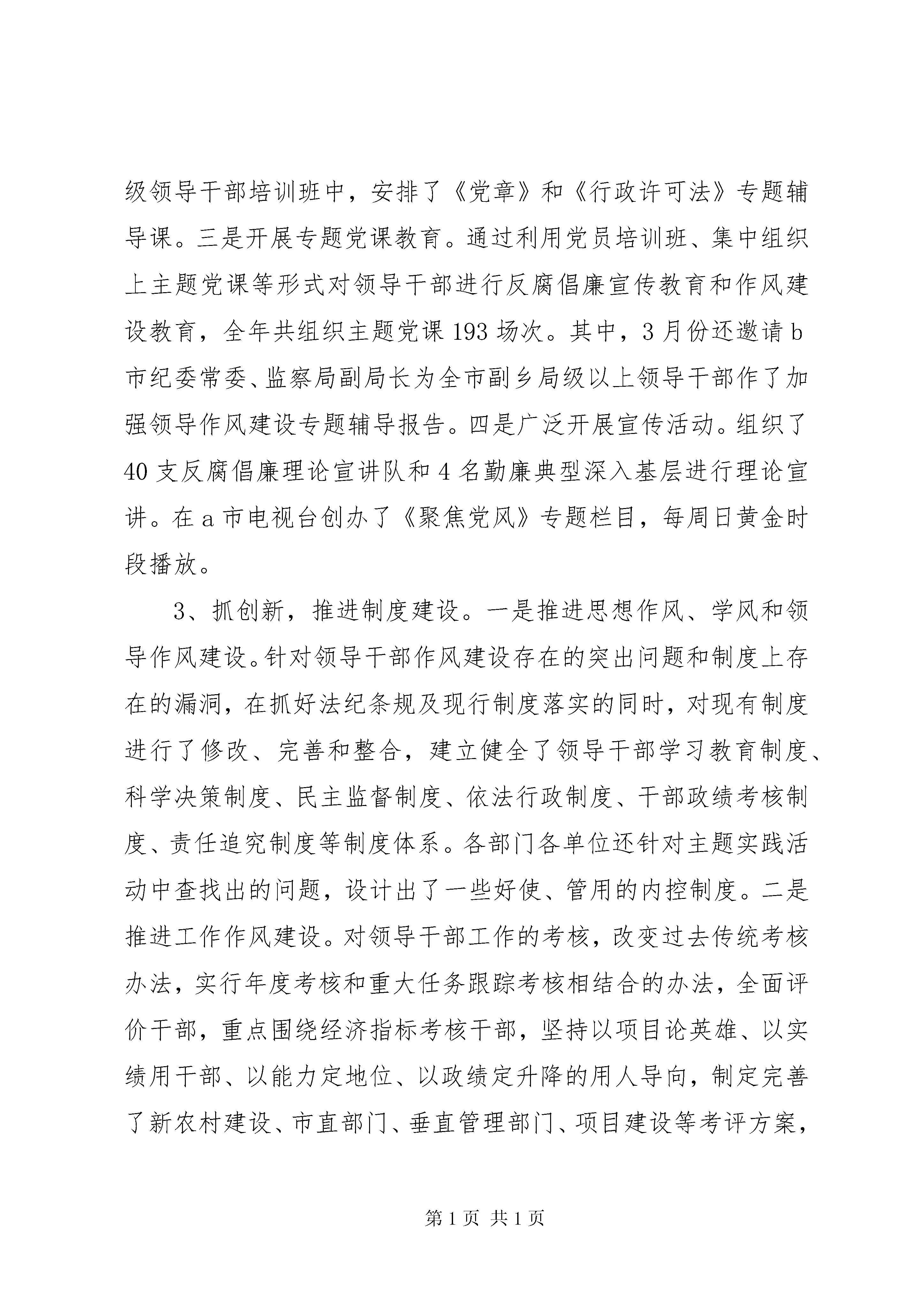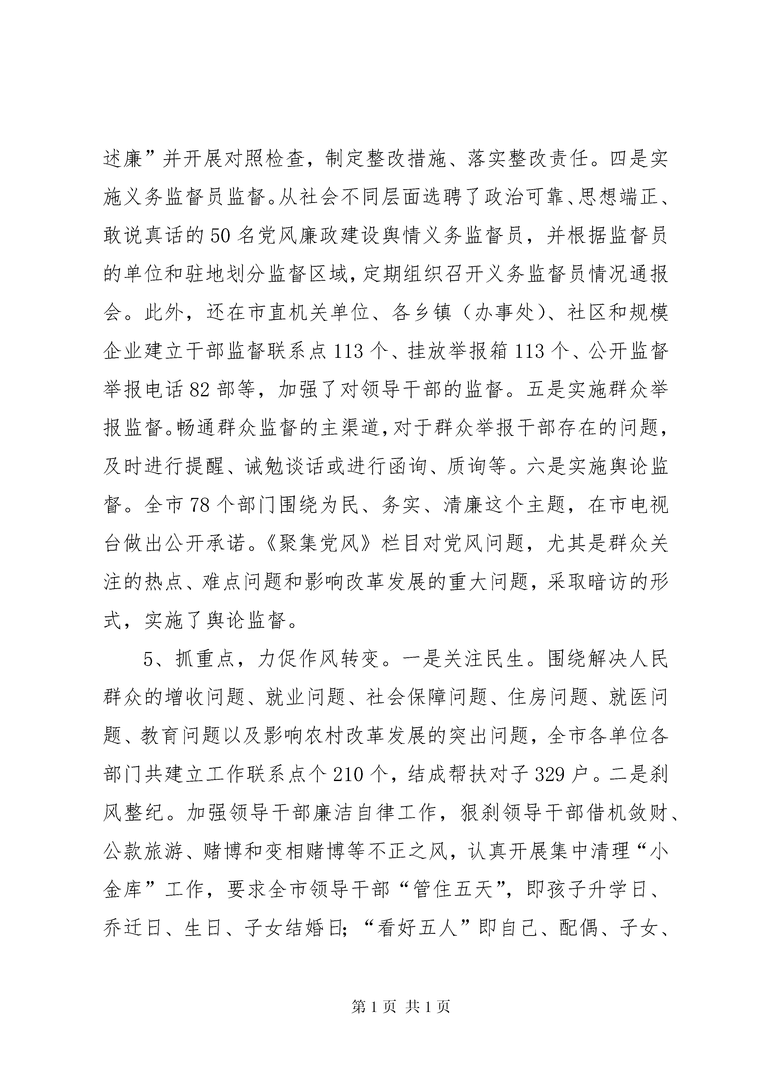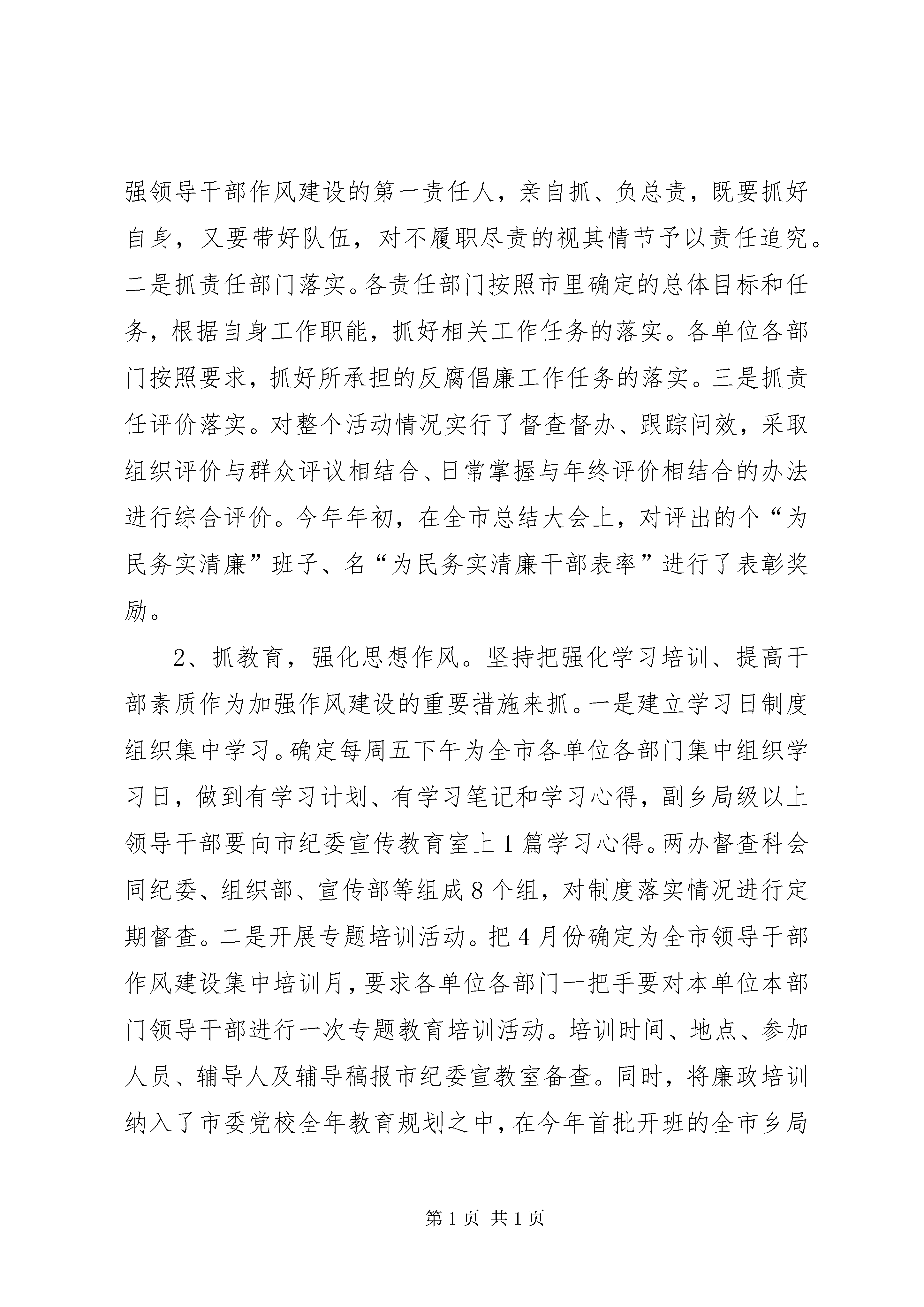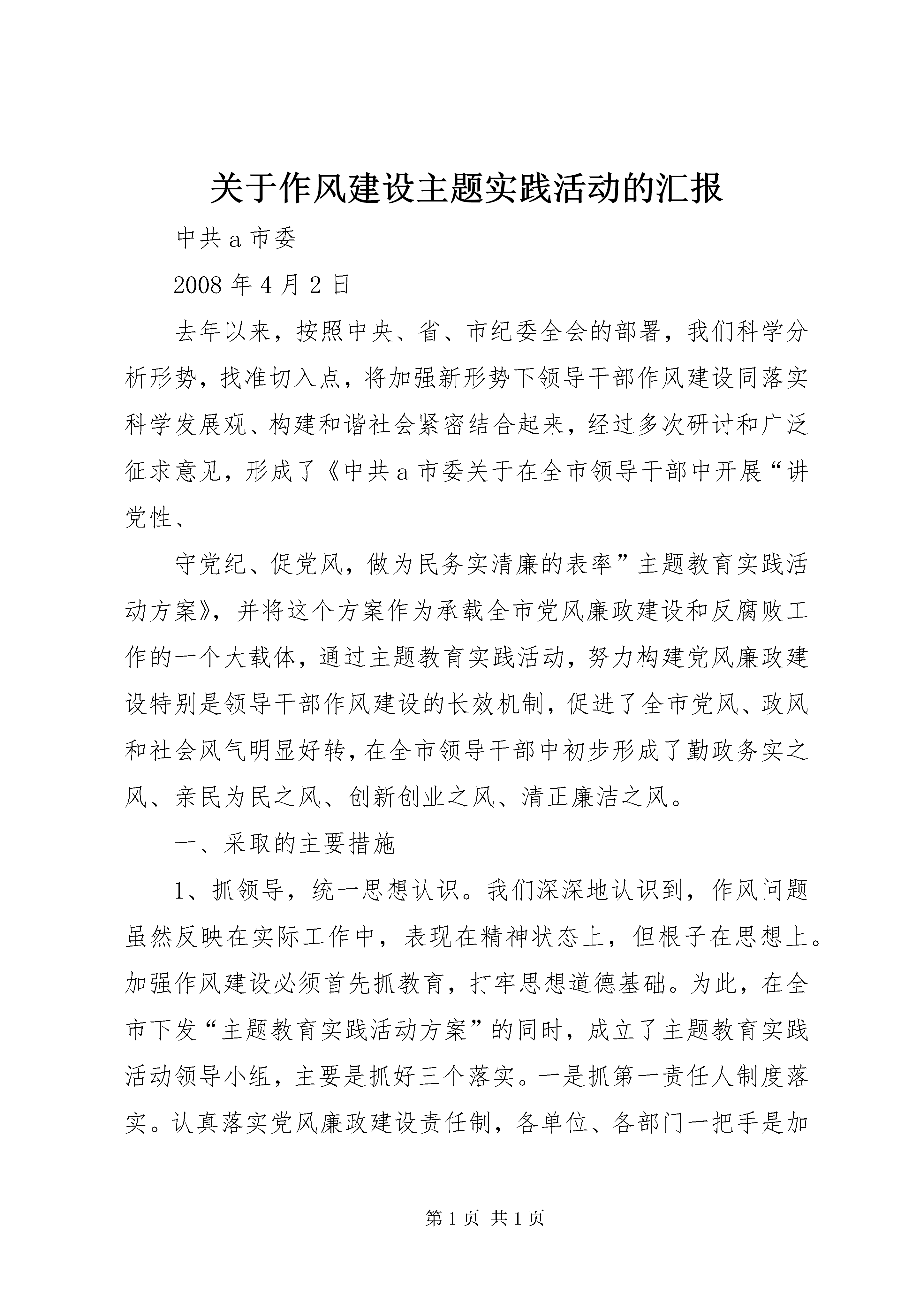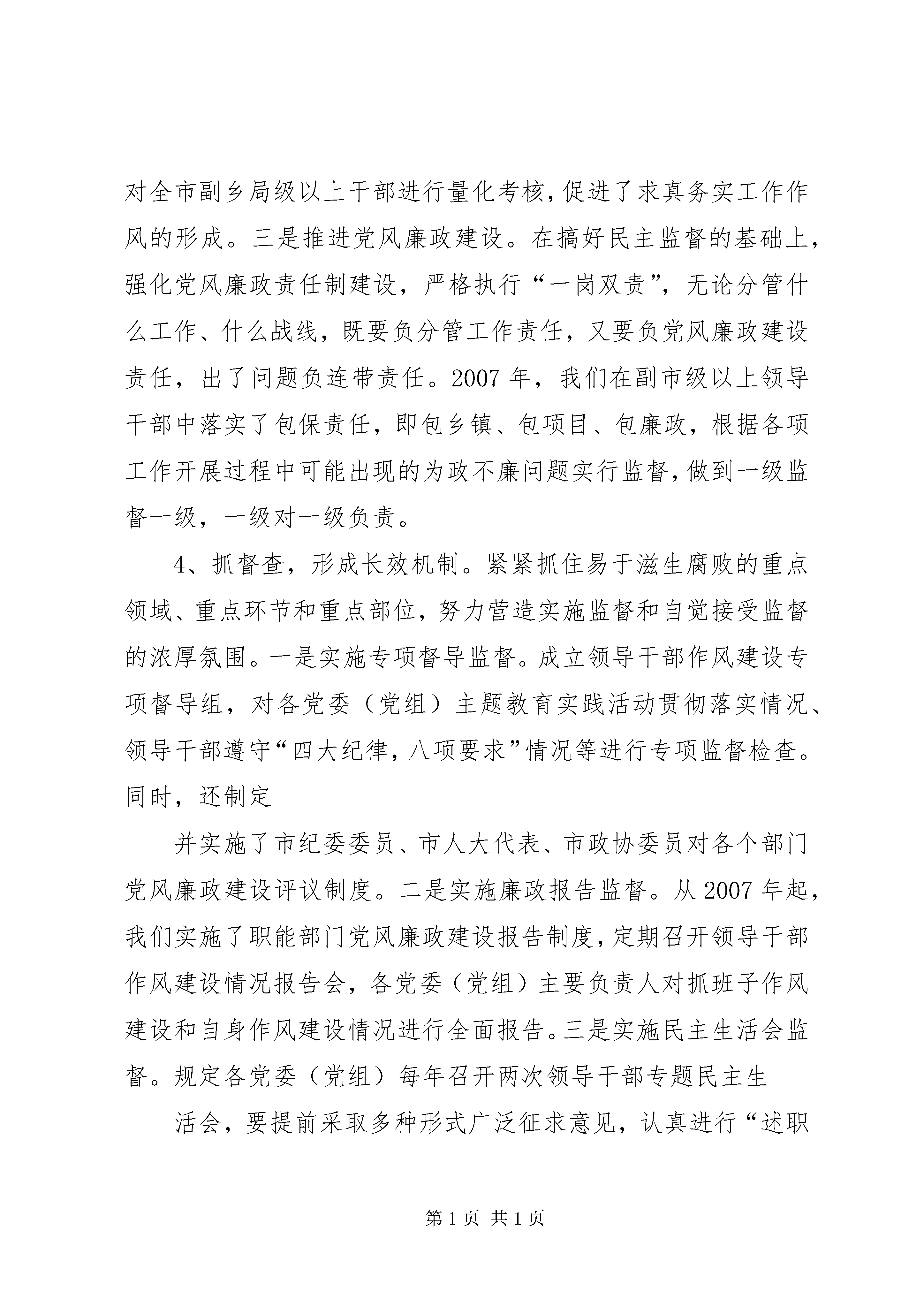 关于作风建设主题实践活动的汇报中共a市委2008年4月2日去年以来,按照中央、省、市纪委全会的部署,我们科学分析形势,找准切入点,将加强新形势下领导干部作风建设同落实科学发展观、构建和谐社会紧密结合起来,经过多次研讨和广泛征求意见,形成了《中共a市委关于在全市领导干部中开展“讲党性、守党纪、促党风,做为民务实清廉的表率”主题教育实践活动方案》,并将这个方案作为承载全市党风廉政建设和反腐败工作的一个大载体,通过主题教育实践活动,努力构建党风廉政建设特别是领导干部作风建设的长效机制,促进了全市党风、政风和社会风气明显好转,在全市领导干部中初步形成了勤政务实之风、亲民为民之风、创新创业之风、清正廉洁之风。一、采取的主要措施1、抓领导,统一思想认识。我们深深地认识到,作风问题虽然反映在实际工作中,表现在精神状态上,但根子在思想上。加强作风建设必须首先抓教育,打牢思想道德基础。为此,在全市下发“主题教育实践活动方案”的同时,成立了主题教育实践活动领导小组,主要是抓好三个落实。一是抓第一责任人制度落实。认真落实党风廉政建设责任制,各单位、各部门一把手是加强领导干部作风建设的第一责任人,亲自抓、负总责,既要抓好自身,又要带好队伍,对不履职尽责的视其情节予以责任追究。二是抓责任部门落实。各责任部门按照市里确定的总体目标和任务,根据自身工作职能,抓好相关工作任务的落实。各单位各部门按照要求,抓好所承担的反腐倡廉工作任务的落实。三是抓责任评价落实。对整个活动情况实行了督查督办、跟踪问效,采取组织评价与群众评议相结合、日常掌握与年终评价相结合的办法进行综合评价。今年年初,在全市总结大会上,对评出的个“为民务实清廉”班子、名“为民务实清廉干部表率”进行了表彰奖励。2、抓教育,强化思想作风。坚持把强化学习培训、提高干部素质作为加强作风建设的重要措施来抓。一是建立学习日制度组织集中学习。确定每周五下午为全市各单位各部门集中组织学习日,做到有学习计划、有学习笔记和学习心得,副乡局级以上领导干部要向市纪委宣传教育室上1篇学习心得。两办督查科会同纪委、组织部、宣传部等组成8个组,对制度落实情况进行定期督查。二是开展专题培训活动。把4月份确定为全市领导干部作风建设集中培训月,要求各单位各部门一把手要对本单位本部门领导干部进行一次专题教育培训活动。培训时间、地点、参加人员、辅导人及辅导稿报市纪委宣教室备查。同时,将廉政培训纳入了市委党校全年教育规划之中,在今年首批开班的全市乡局级领导干部培训班中,安排了《党章》和《行政许可法》专题辅导课。三是开展专题党课教育。通过利用党员培训班、集中组织上主题党课等形式对领导干部进行反腐倡廉宣传教育和作风建设教育,全年共组织主题党课193场次。其中,3月份还邀请b市纪委常委、监察局副局长为全市副乡局级以上领导干部作了加强领导作风建设专题辅导报告。四是广泛开展宣传活动。组织了40支反腐倡廉理论宣讲队和4名勤廉典型深入基层进行理论宣讲。在a市电视台创办了《聚焦党风》专题栏目,每周日黄金时段播放。3、抓创新,推进制度建设。一是推进思想作风、学风和领导作风建设。针对领导干部作风建设存在的突出问题和制度上存在的漏洞,在抓好法纪条规及现行制度落实的同时,对现有制度进行了修改、完善和整合,建立健全了领导干部学习教育制度、科学决策制度、民主监督制度、依法行政制度、干部政绩考核制度、责任追究制度等制度体系。各部门各单位还针对主题实践活动中查找出的问题,设计出了一些好使、管用的内控制度。二是推进工作作风建设。对领导干部工作的考核,改变过去传统考核办法,实行年度考核和重大任务跟踪考核相结合的办法,全面评价干部,重点围绕经济指标考核干部,坚持以项目论英雄、以实绩用干部、以能力定地位、以政绩定升降的用人导向,制定完善了新农村建设、市直部门、垂直管理部门、项目建设等考评方案,对全市副乡局级以上干部进行量化考核,促进了求真务实工作作风的形成。三是推进党风廉政建设。在搞好民主监督的基础上,强化党风廉政责任制建设,严格执行“一岗双责”,无论分管什么工作、什么战线,既要负分管工作责任,又要负党风廉政建设责任,出了问题负连带责任。2007年,我们在副市级以上领导干部中落实了包保责任,即包乡镇、包项目、包廉政,根据各项工作开展过程中可能出现的为政不廉问题实行监督,做到一级监督一级,一级对一级负责。4、抓督查,形成长效机制。紧紧抓住易于滋生腐败的重点领域、重点环节和重点部位,努力营造实施监督和自觉接受监督的浓厚氛围。一是实施专项督导监督。成立领导干部作风建设专项督导组,对各党委(党组)主题教育实践活动贯彻落实情况、领导干部遵守“四大纪律,八项要求”情况等进行专项监督检查。同时,还制定并实施了市纪委委员、市人大代表、市政协委员对各个部门党风廉政建设
