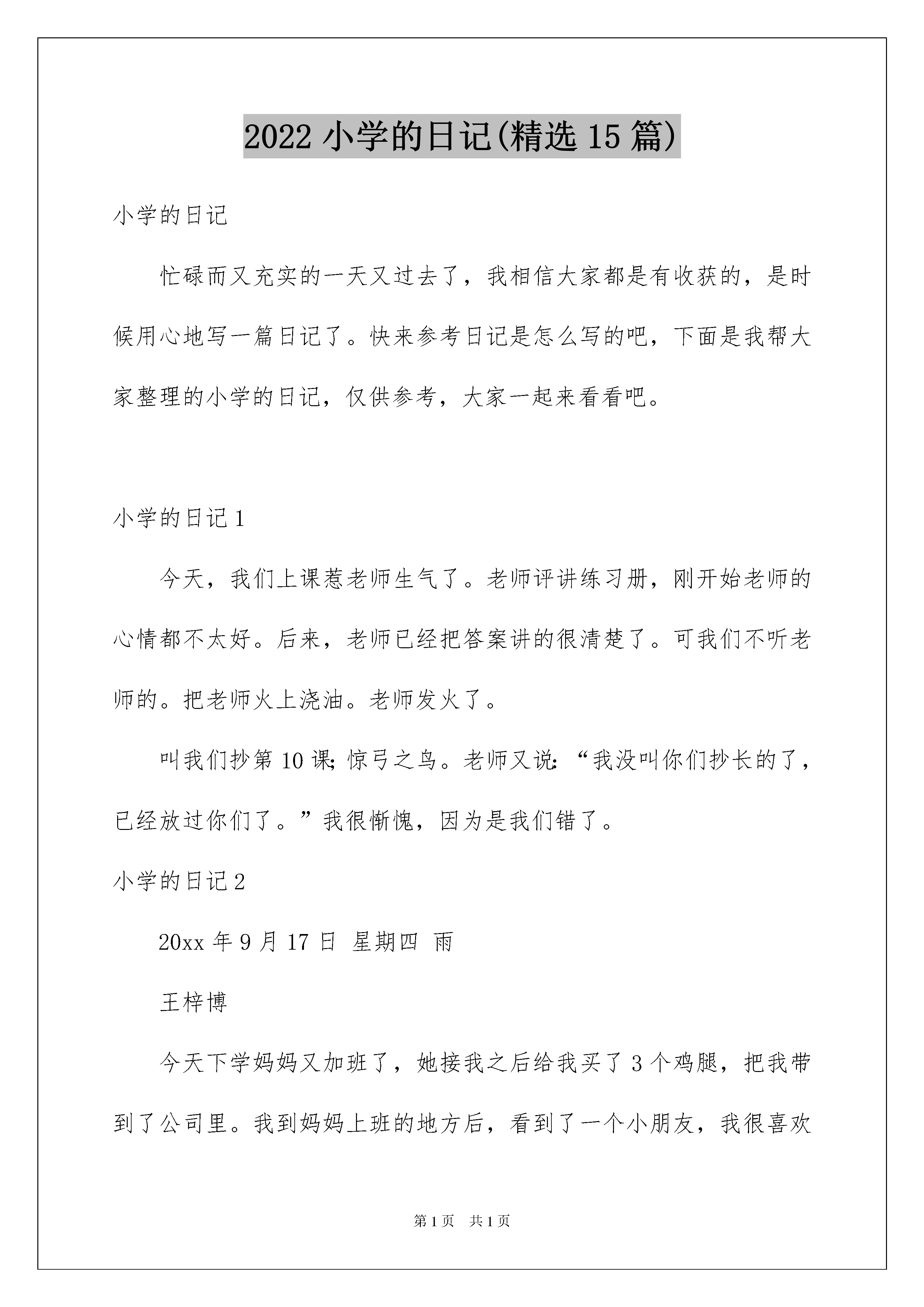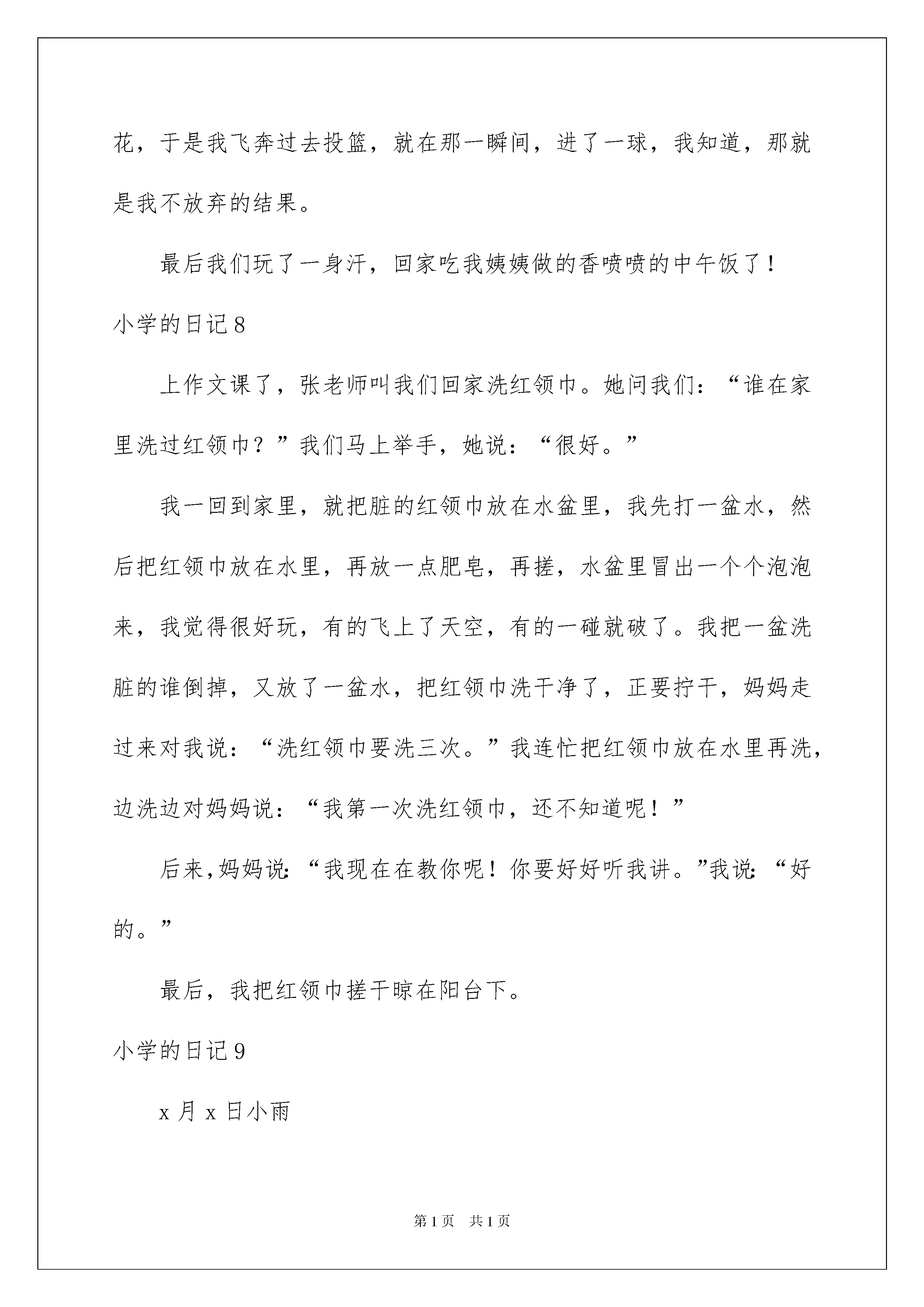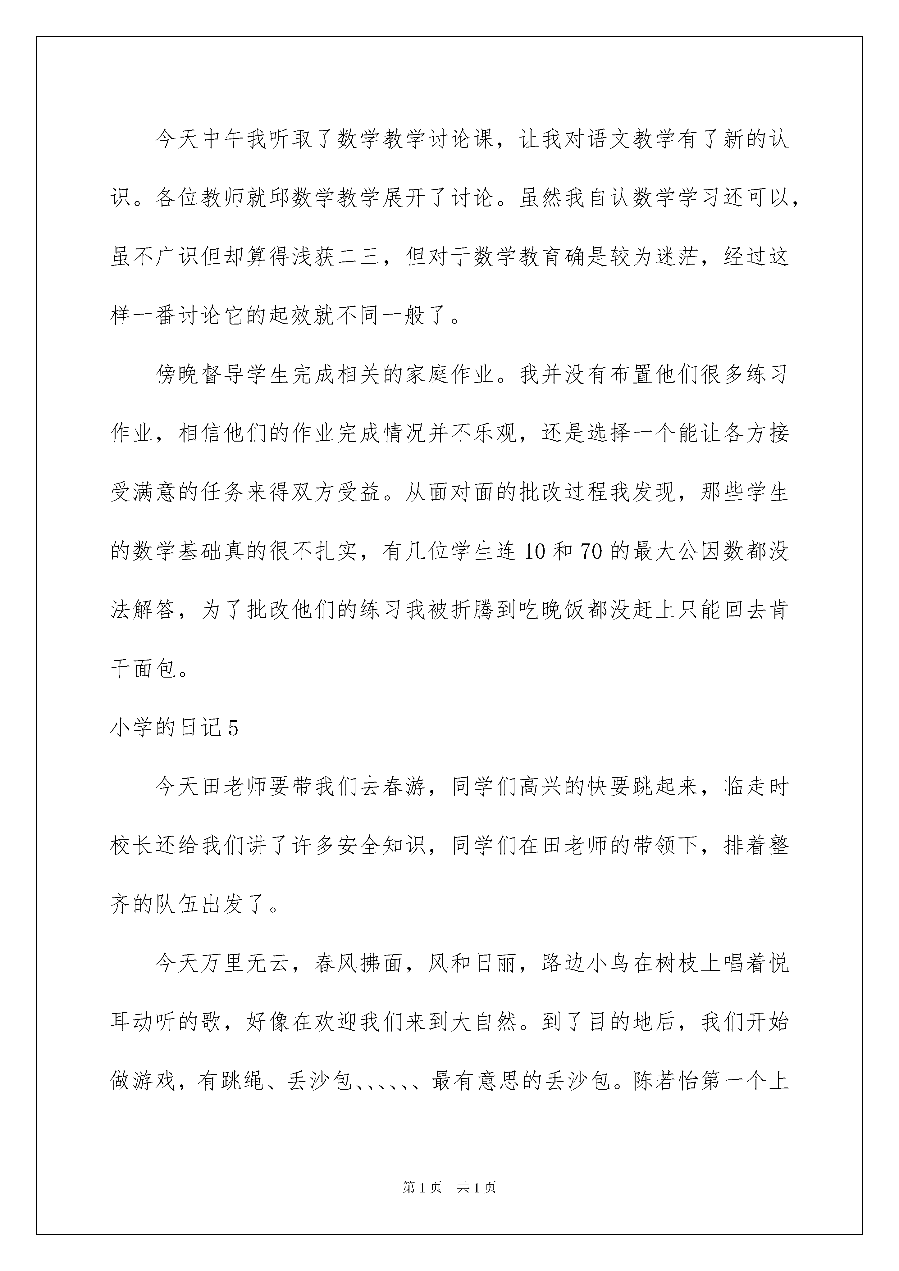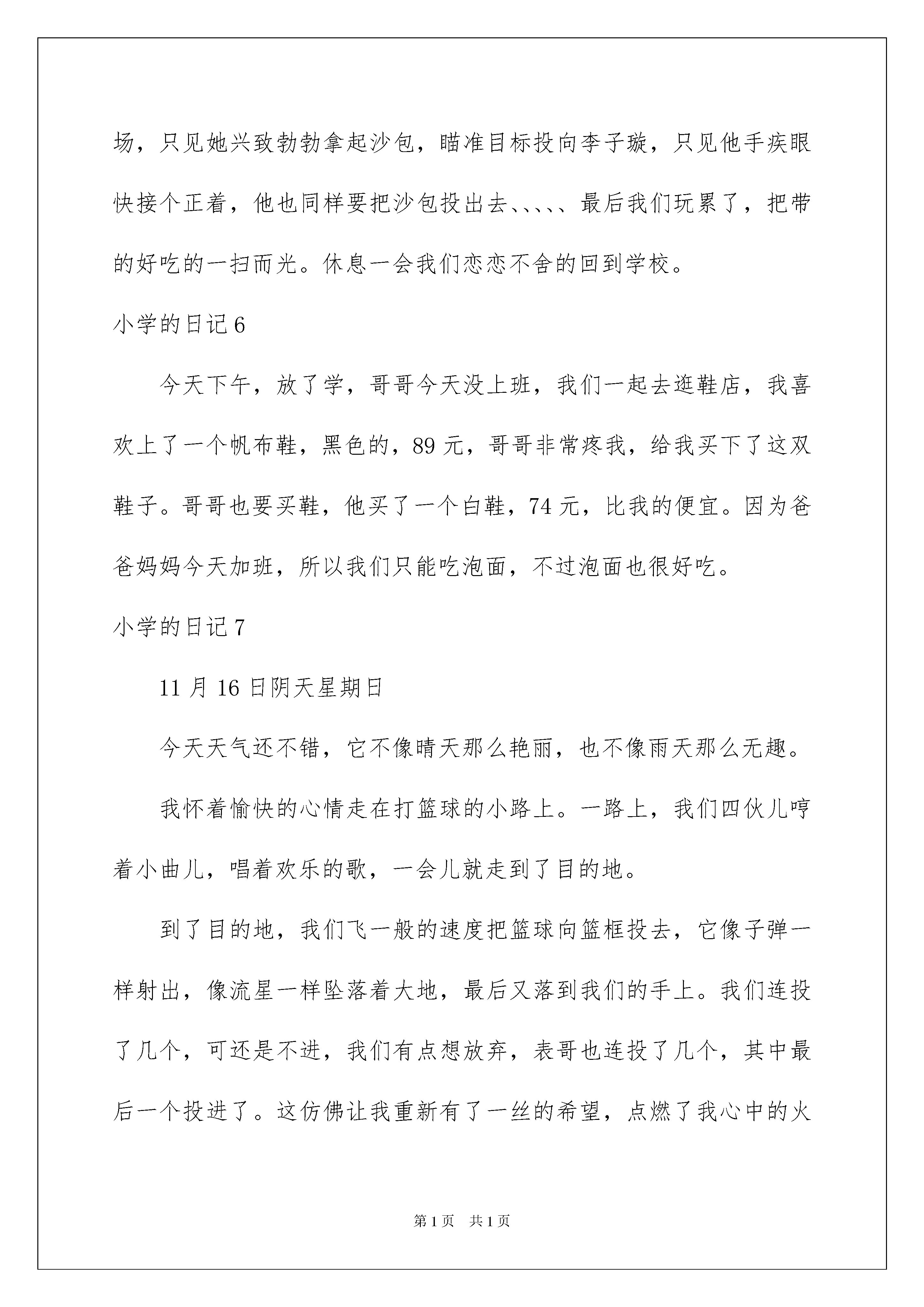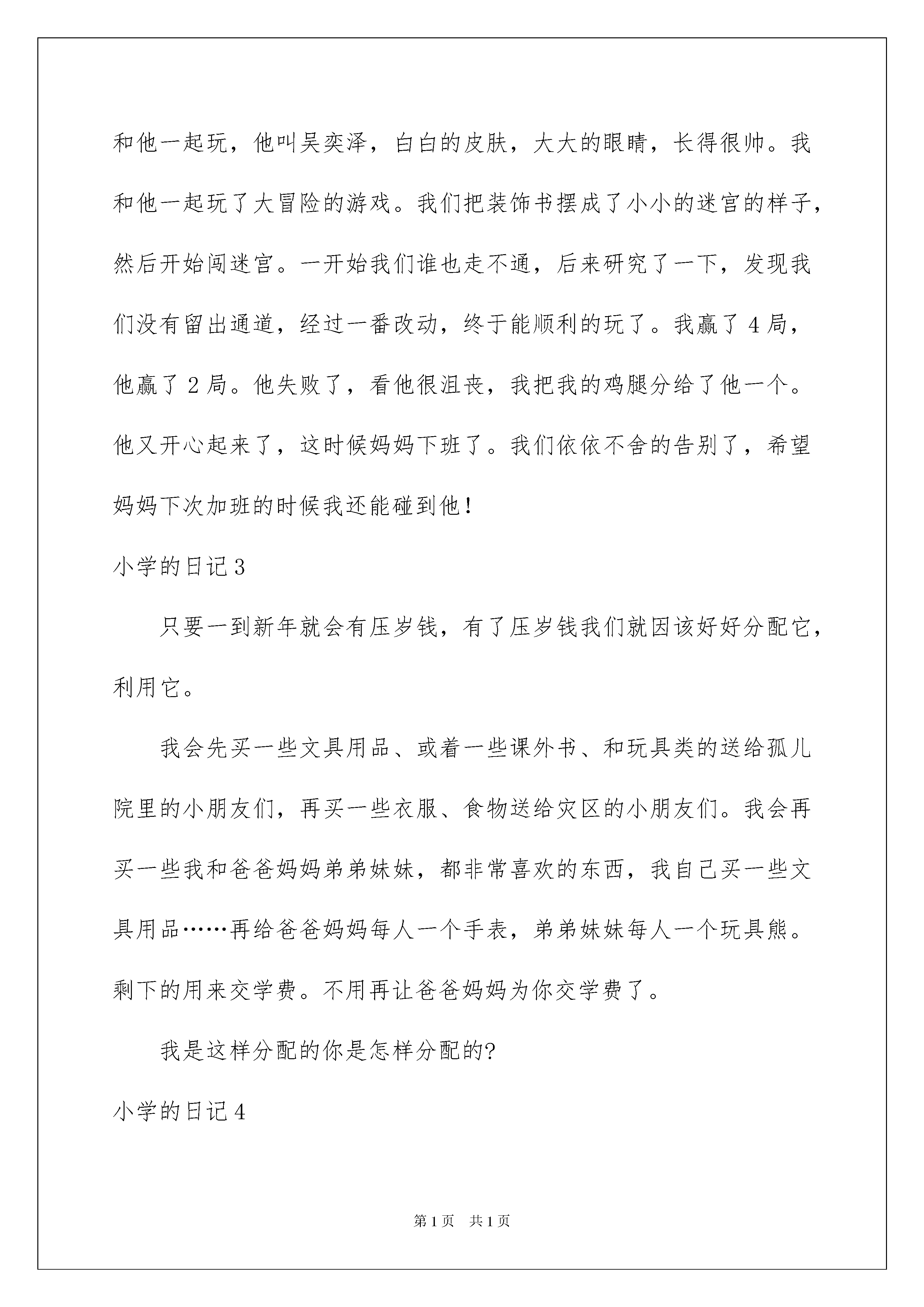 2022小学的日记(精选15篇)小学的日记忙碌而又充实的一天又过去了,我相信大家都是有收获的,是时候用心地写一篇日记了。快来参考日记是怎么写的吧,下面是我帮大家整理的小学的日记,仅供参考,大家一起来看看吧。小学的日记1今天,我们上课惹老师生气了。老师评讲练习册,刚开始老师的心情都不太好。后来,老师已经把答案讲的很清楚了。可我们不听老师的。把老师火上浇油。老师发火了。叫我们抄第10课;惊弓之鸟。老师又说:“我没叫你们抄长的了,已经放过你们了。”我很惭愧,因为是我们错了。小学的日记220xx年9月17日星期四雨王梓博今天下学妈妈又加班了,她接我之后给我买了3个鸡腿,把我带到了公司里。我到妈妈上班的地方后,看到了一个小朋友,我很喜欢和他一起玩,他叫吴奕泽,白白的皮肤,大大的眼睛,长得很帅。我和他一起玩了大冒险的游戏。我们把装饰书摆成了小小的迷宫的样子,然后开始闯迷宫。一开始我们谁也走不通,后来研究了一下,发现我们没有留出通道,经过一番改动,终于能顺利的玩了。我赢了4局,他赢了2局。他失败了,看他很沮丧,我把我的鸡腿分给了他一个。他又开心起来了,这时候妈妈下班了。我们依依不舍的告别了,希望妈妈下次加班的时候我还能碰到他!小学的日记3只要一到新年就会有压岁钱,有了压岁钱我们就因该好好分配它,利用它。我会先买一些文具用品、或着一些课外书、和玩具类的送给孤儿院里的小朋友们,再买一些衣服、食物送给灾区的小朋友们。我会再买一些我和爸爸妈妈弟弟妹妹,都非常喜欢的东西,我自己买一些文具用品……再给爸爸妈妈每人一个手表,弟弟妹妹每人一个玩具熊。剩下的用来交学费。不用再让爸爸妈妈为你交学费了。我是这样分配的你是怎样分配的?小学的日记4今天中午我听取了数学教学讨论课,让我对语文教学有了新的认识。各位教师就邱数学教学展开了讨论。虽然我自认数学学习还可以,虽不广识但却算得浅获二三,但对于数学教育确是较为迷茫,经过这样一番讨论它的起效就不同一般了。傍晚督导学生完成相关的家庭作业。我并没有布置他们很多练习作业,相信他们的作业完成情况并不乐观,还是选择一个能让各方接受满意的任务来得双方受益。从面对面的批改过程我发现,那些学生的数学基础真的很不扎实,有几位学生连10和70的最大公因数都没法解答,为了批改他们的练习我被折腾到吃晚饭都没赶上只能回去肯干面包。小学的日记5今天田老师要带我们去春游,同学们高兴的快要跳起来,临走时校长还给我们讲了许多安全知识,同学们在田老师的带领下,排着整齐的队伍出发了。今天万里无云,春风拂面,风和日丽,路边小鸟在树枝上唱着悦耳动听的歌,好像在欢迎我们来到大自然。到了目的地后,我们开始做游戏,有跳绳、丢沙包、、、、、、最有意思的丢沙包。陈若怡第一个上场,只见她兴致勃勃拿起沙包,瞄准目标投向李子璇,只见他手疾眼快接个正着,他也同样要把沙包投出去、、、、、最后我们玩累了,把带的好吃的一扫而光。休息一会我们恋恋不舍的回到学校。小学的日记6今天下午,放了学,哥哥今天没上班,我们一起去逛鞋店,我喜欢上了一个帆布鞋,黑色的,89元,哥哥非常疼我,给我买下了这双鞋子。哥哥也要买鞋,他买了一个白鞋,74元,比我的便宜。因为爸爸妈妈今天加班,所以我们只能吃泡面,不过泡面也很好吃。小学的日记711月16日阴天星期日今天天气还不错,它不像晴天那么艳丽,也不像雨天那么无趣。我怀着愉快的心情走在打篮球的小路上。一路上,我们四伙儿哼着小曲儿,唱着欢乐的歌,一会儿就走到了目的地。到了目的地,我们飞一般的速度把篮球向篮框投去,它像子弹一样射出,像流星一样坠落着大地,最后又落到我们的手上。我们连投了几个,可还是不进,我们有点想放弃,表哥也连投了几个,其中最后一个投进了。这仿佛让我重新有了一丝的希望,点燃了我心中的火花,于是我飞奔过去投篮,就在那一瞬间,进了一球,我知道,那就是我不放弃的结果。最后我们玩了一身汗,回家吃我姨姨做的香喷喷的中午饭了!小学的日记8上作文课了,张老师叫我们回家洗红领巾。她问我们:“谁在家里洗过红领巾?”我们马上举手,她说:“很好。”我一回到家里,就把脏的红领巾放在水盆里,我先打一盆水,然后把红领巾放在水里,再放一点肥皂,再搓,水盆里冒出一个个泡泡来,我觉得很好玩,有的飞上了天空,有的一碰就破了。我把一盆洗脏的谁倒掉,又放了一盆水,把红领巾洗干净了,正要拧干,妈妈走过来对我说:“洗红领巾要洗三次。”我连忙把红领巾放在水里再洗,边洗边对妈妈说:“我第一次洗红领巾,还不知道呢!”后来,妈妈说:“我现在在教你呢!你要好好听我讲。”我说:“好的。”最后,我把红领巾搓干晾在阳台下。小学的日记9x月x日小雨今日