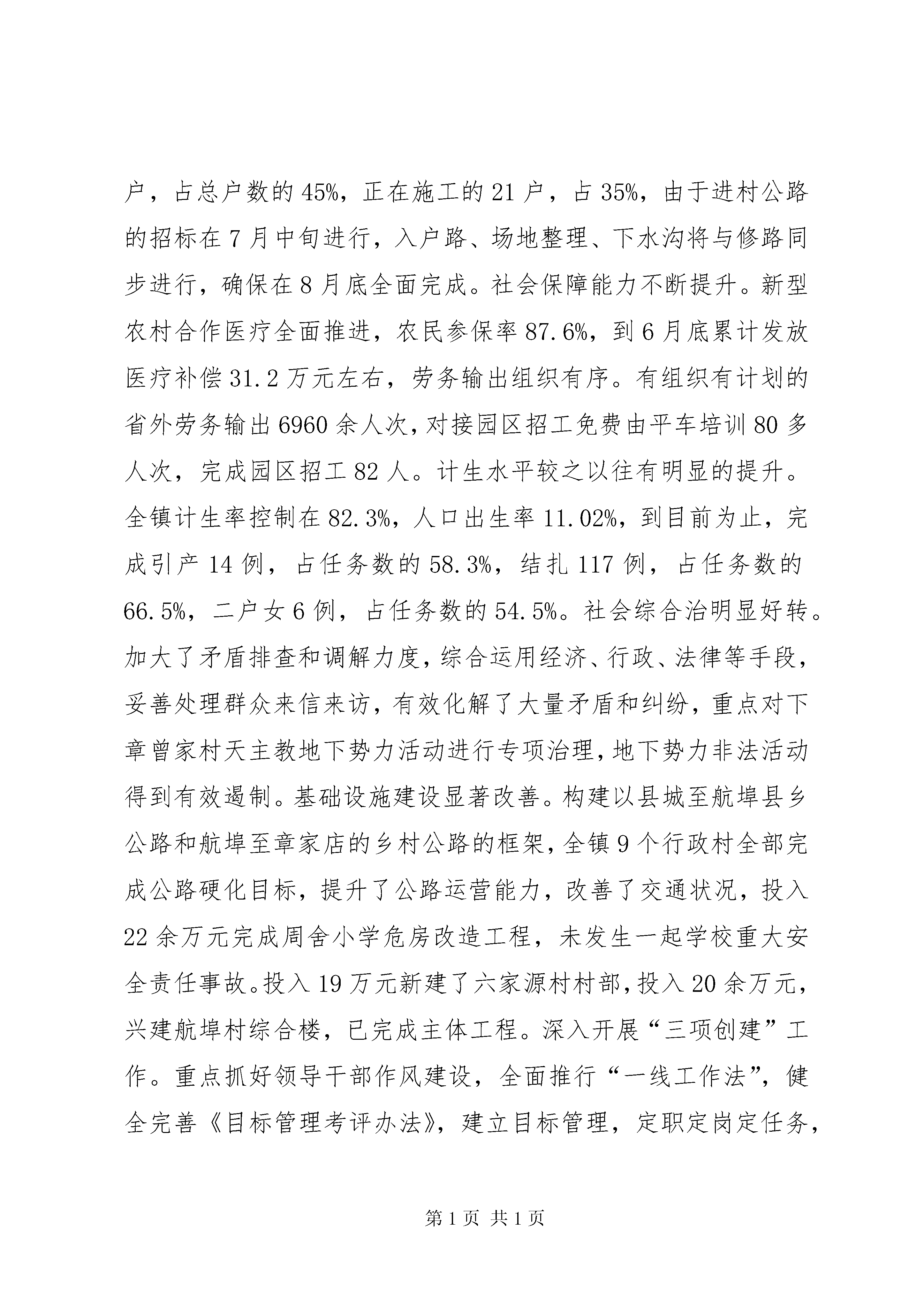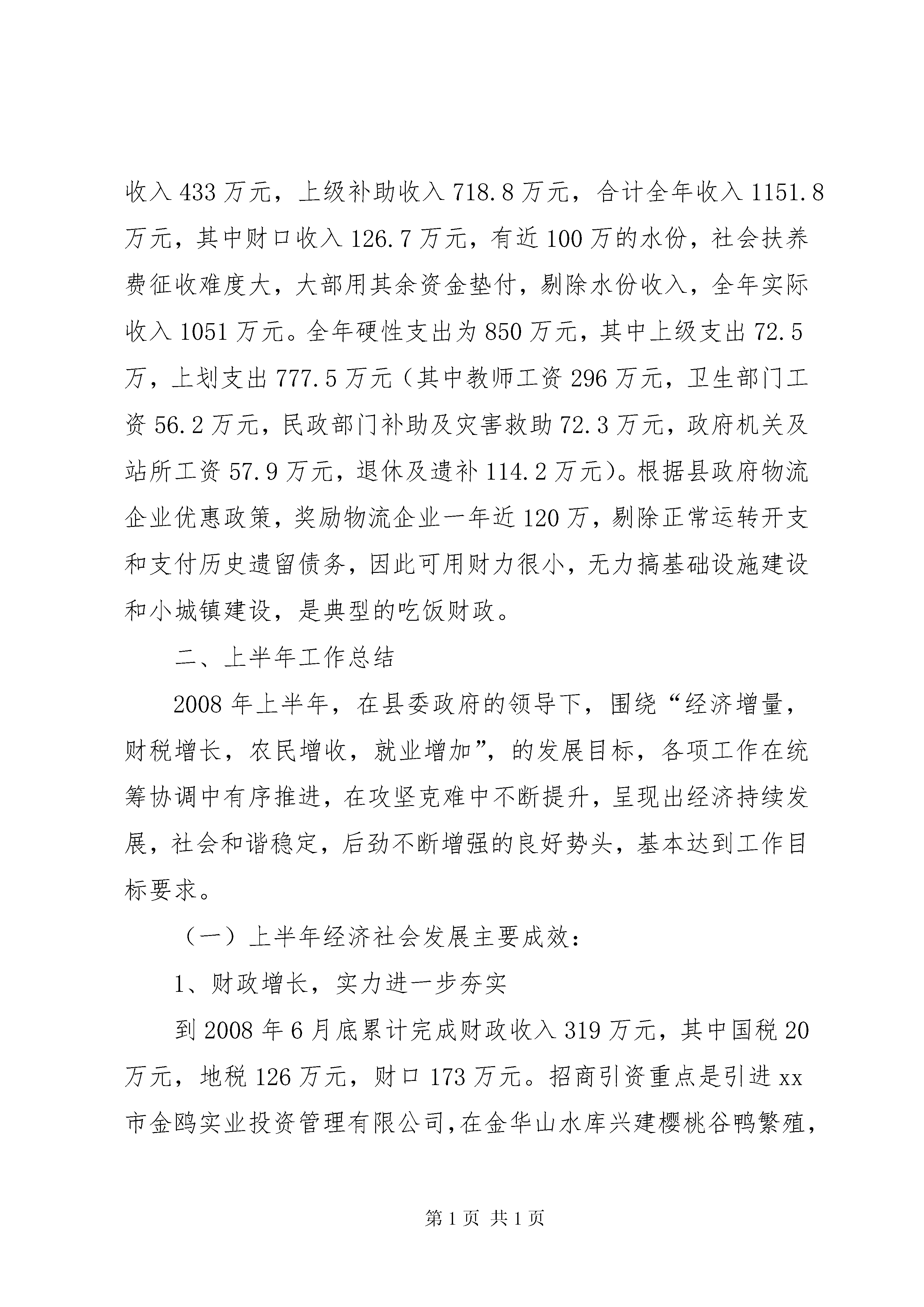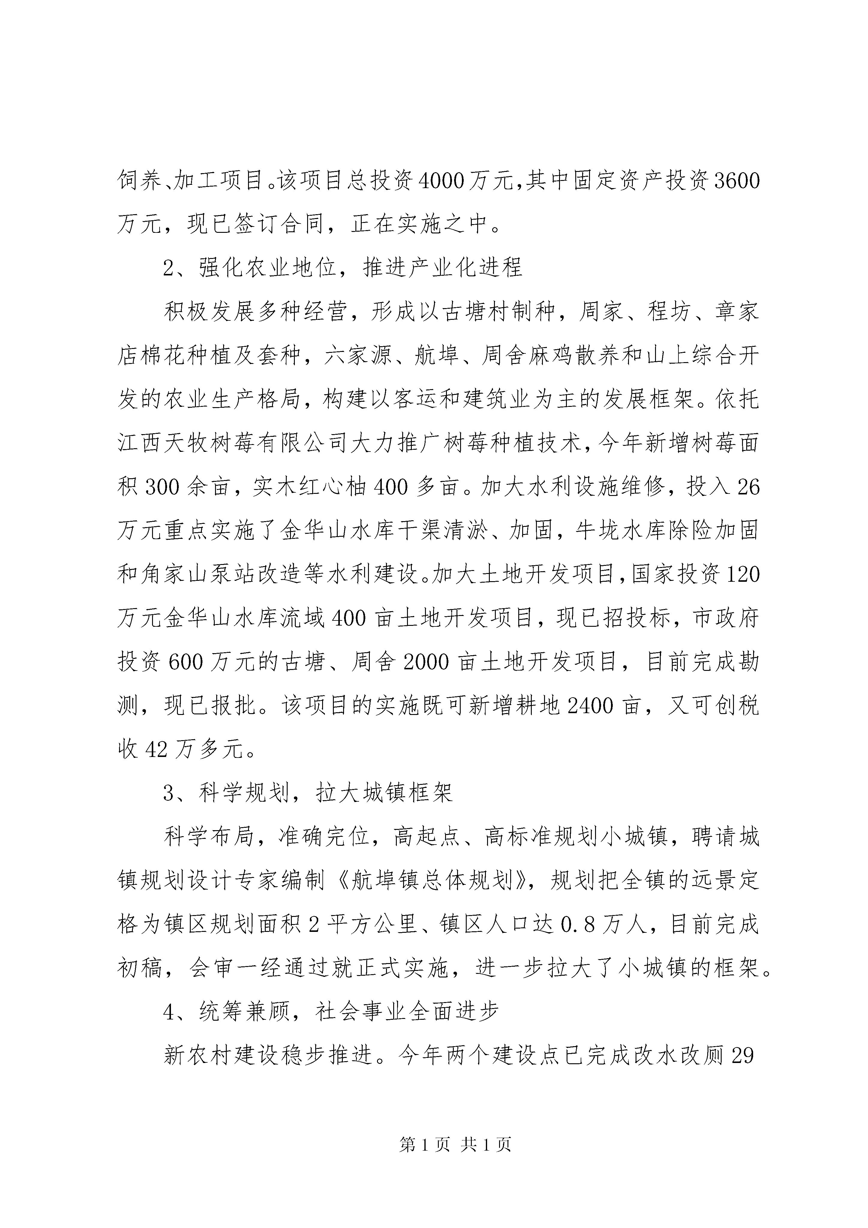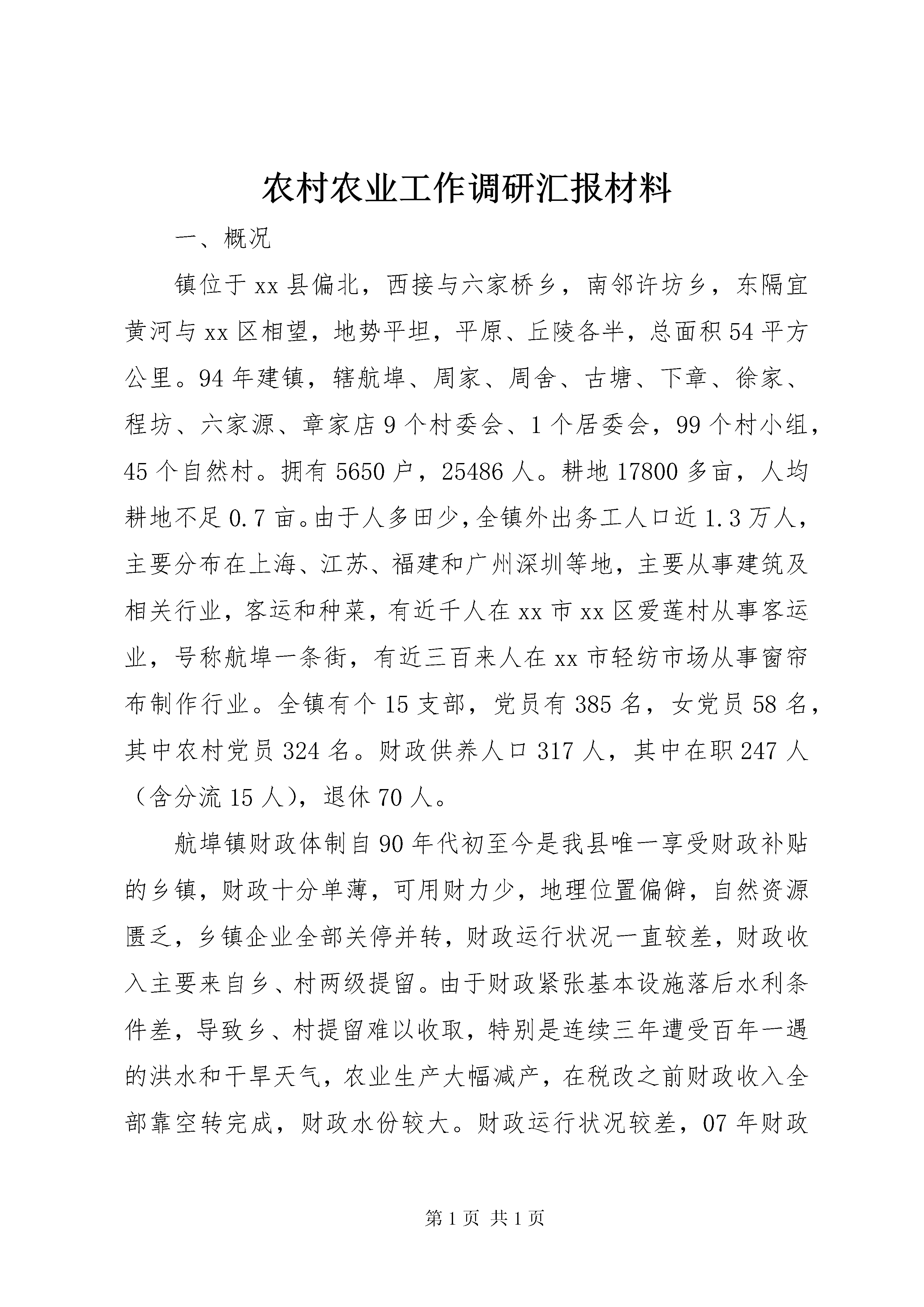 农村农业工作调研汇报材料一、概况镇位于xx县偏北,西接与六家桥乡,南邻许坊乡,东隔宜黄河与xx区相望,地势平坦,平原、丘陵各半,总面积54平方公里。94年建镇,辖航埠、周家、周舍、古塘、下章、徐家、程坊、六家源、章家店9个村委会、1个居委会,99个村小组,45个自然村。拥有5650户,25486人。耕地17800多亩,人均耕地不足0.7亩。由于人多田少,全镇外出务工人口近1.3万人,主要分布在上海、江苏、福建和广州深圳等地,主要从事建筑及相关行业,客运和种菜,有近千人在xx市xx区爱莲村从事客运业,号称航埠一条街,有近三百来人在xx市轻纺市场从事窗帘布制作行业。全镇有个15支部,党员有385名,女党员58名,其中农村党员324名。财政供养人口317人,其中在职247人(含分流15人),退休70人。航埠镇财政体制自90年代初至今是我县唯一享受财政补贴的乡镇,财政十分单薄,可用财力少,地理位置偏僻,自然资源匮乏,乡镇企业全部关停并转,财政运行状况一直较差,财政收入主要来自乡、村两级提留。由于财政紧张基本设施落后水利条件差,导致乡、村提留难以收取,特别是连续三年遭受百年一遇的洪水和干旱天气,农业生产大幅减产,在税改之前财政收入全部靠空转完成,财政水份较大。财政运行状况较差,07年财政收入433万元,上级补助收入718.8万元,合计全年收入1151.8万元,其中财口收入126.7万元,有近100万的水份,社会扶养费征收难度大,大部用其余资金垫付,剔除水份收入,全年实际收入1051万元。全年硬性支出为850万元,其中上级支出72.5万,上划支出777.5万元(其中教师工资296万元,卫生部门工资56.2万元,民政部门补助及灾害救助72.3万元,政府机关及站所工资57.9万元,退休及遗补114.2万元)。根据县政府物流企业优惠政策,奖励物流企业一年近120万,剔除正常运转开支和支付历史遗留债务,因此可用财力很小,无力搞基础设施建设和小城镇建设,是典型的吃饭财政。二、上半年工作总结2008年上半年,在县委政府的领导下,围绕“经济增量,财税增长,农民增收,就业增加”,的发展目标,各项工作在统筹协调中有序推进,在攻坚克难中不断提升,呈现出经济持续发展,社会和谐稳定,后劲不断增强的良好势头,基本达到工作目标要求。(一)上半年经济社会发展主要成效:1、财政增长,实力进一步夯实到2008年6月底累计完成财政收入319万元,其中国税20万元,地税126万元,财口173万元。招商引资重点是引进xx市金鸥实业投资管理有限公司,在金华山水库兴建樱桃谷鸭繁殖,饲养、加工项目。该项目总投资4000万元,其中固定资产投资3600万元,现已签订合同,正在实施之中。2、强化农业地位,推进产业化进程积极发展多种经营,形成以古塘村制种,周家、程坊、章家店棉花种植及套种,六家源、航埠、周舍麻鸡散养和山上综合开发的农业生产格局,构建以客运和建筑业为主的发展框架。依托江西天牧树莓有限公司大力推广树莓种植技术,今年新增树莓面积300余亩,实木红心柚400多亩。加大水利设施维修,投入26万元重点实施了金华山水库干渠清淤、加固,牛垅水库除险加固和角家山泵站改造等水利建设。加大土地开发项目,国家投资120万元金华山水库流域400亩土地开发项目,现已招投标,市政府投资600万元的古塘、周舍2000亩土地开发项目,目前完成勘测,现已报批。该项目的实施既可新增耕地2400亩,又可创税收42万多元。3、科学规划,拉大城镇框架科学布局,准确完位,高起点、高标准规划小城镇,聘请城镇规划设计专家编制《航埠镇总体规划》,规划把全镇的远景定格为镇区规划面积2平方公里、镇区人口达0.8万人,目前完成初稿,会审一经通过就正式实施,进一步拉大了小城镇的框架。4、统筹兼顾,社会事业全面进步新农村建设稳步推进。今年两个建设点已完成改水改厕29户,占总户数的45%,正在施工的21户,占35%,由于进村公路的招标在7月中旬进行,入户路、场地整理、下水沟将与修路同步进行,确保在8月底全面完成。社会保障能力不断提升。新型农村合作医疗全面推进,农民参保率87.6%,到6月底累计发放医疗补偿31.2万元左右,劳务输出组织有序。有组织有计划的省外劳务输出6960余人次,对接园区招工免费由平车培训80多人次,完成园区招工82人。计生水平较之以往有明显的提升。全镇计生率控制在82.3%,人口出生率11.02%,到目前为止,完成引产14例,占任务数的58.3%,结扎117例,占任务数的66.5%,二户女6例,占任务数的54.5%。社会综合治明显好转。加大了矛盾排查和调解力度,综合运用经济、行政、法律等手段,妥善处理群众来信来访,有效化解了大量矛盾和纠纷,重点对下章曾家村天主教地下势力活动进行专项治理,地下势