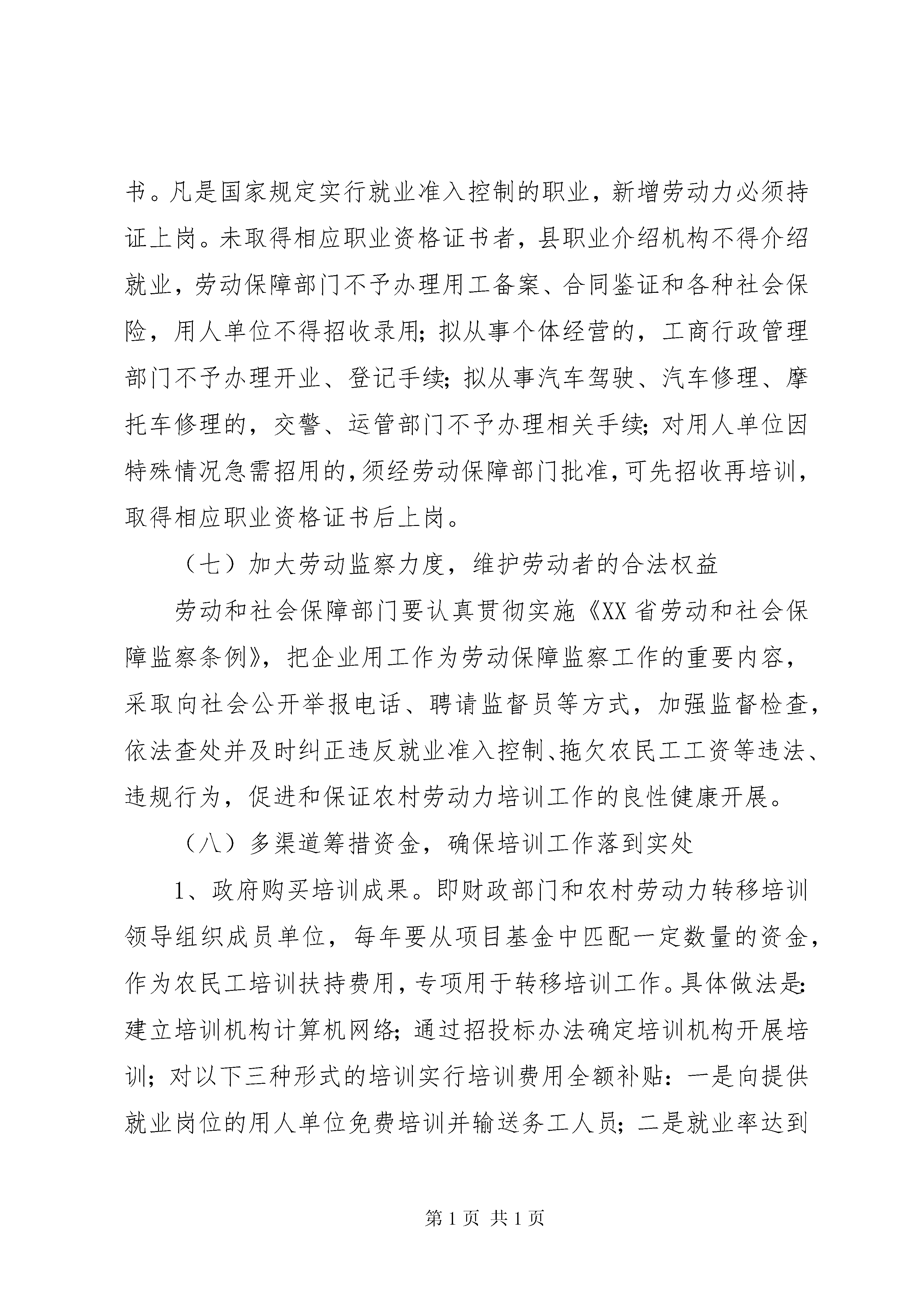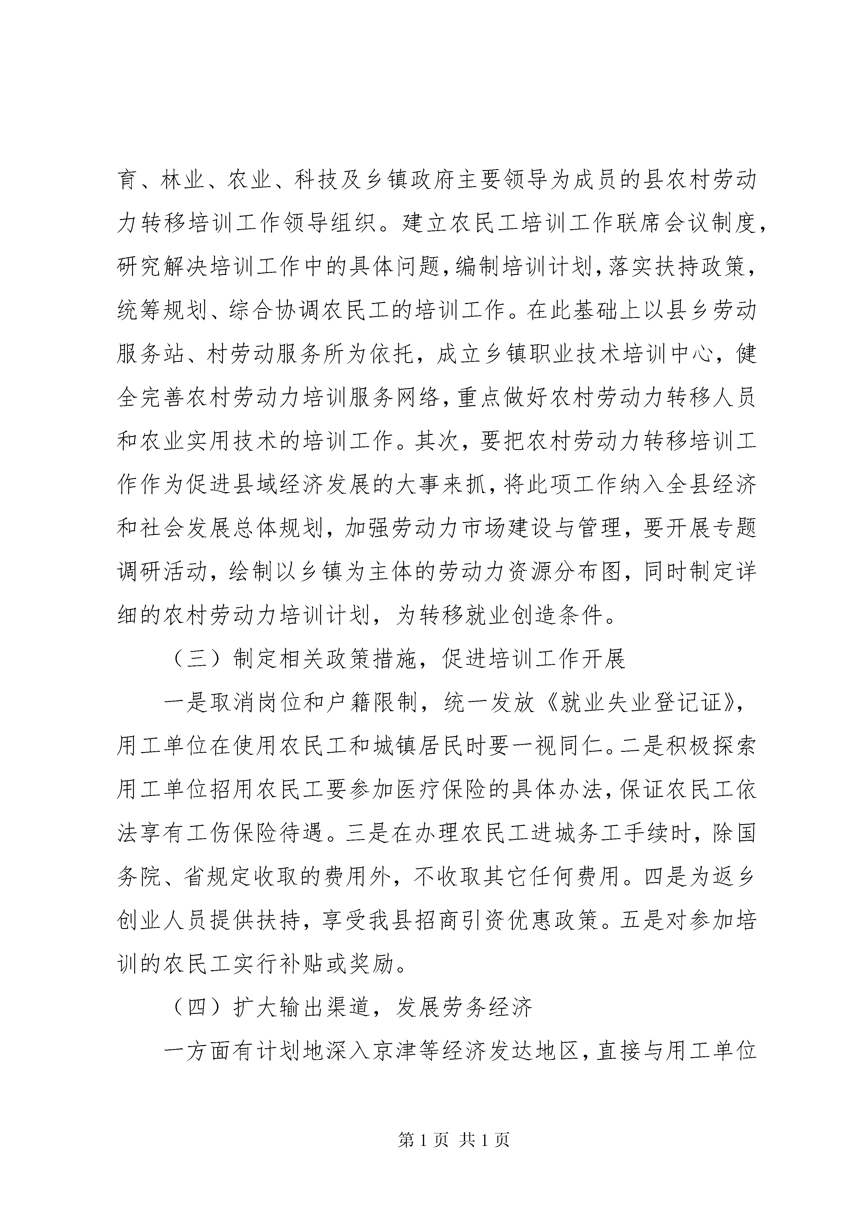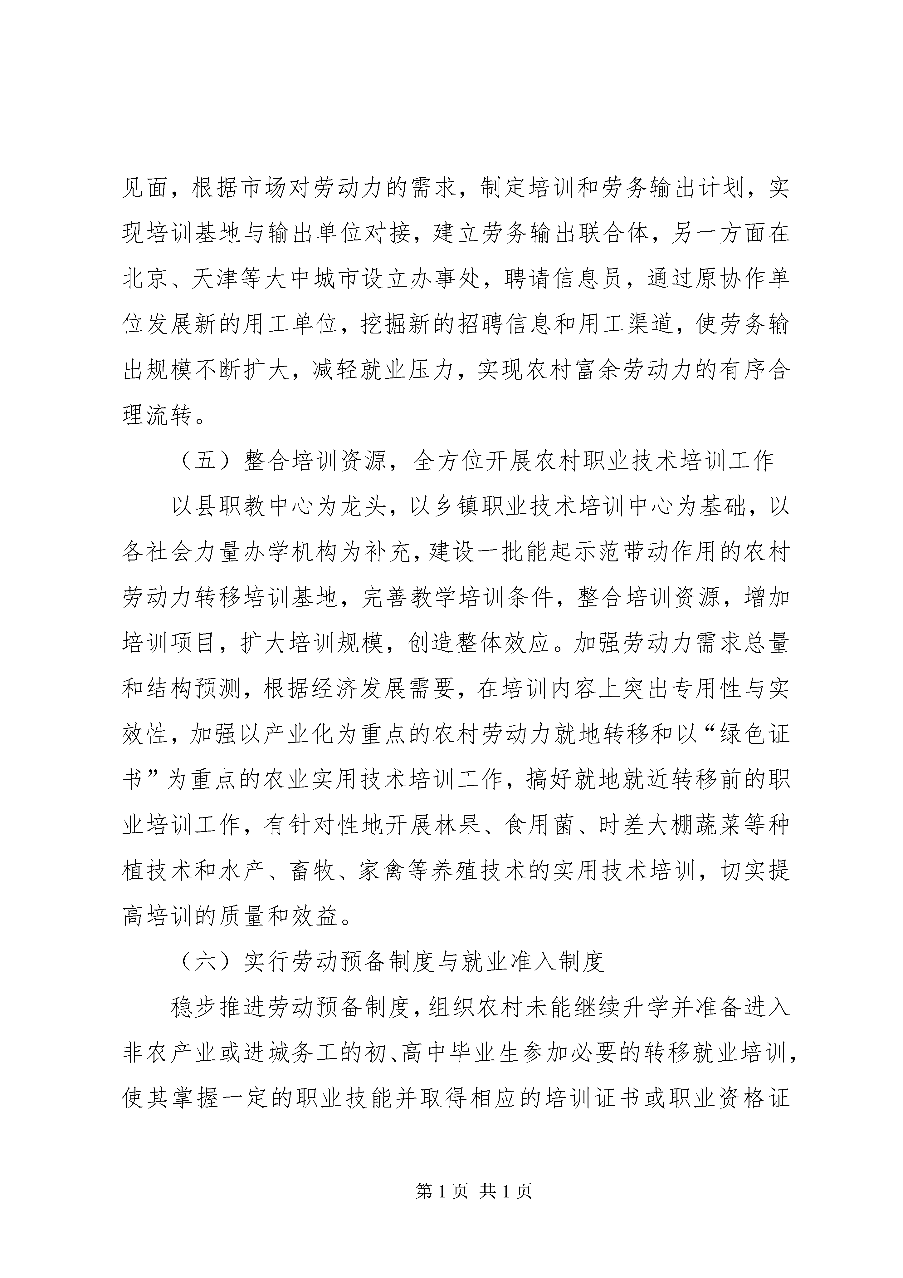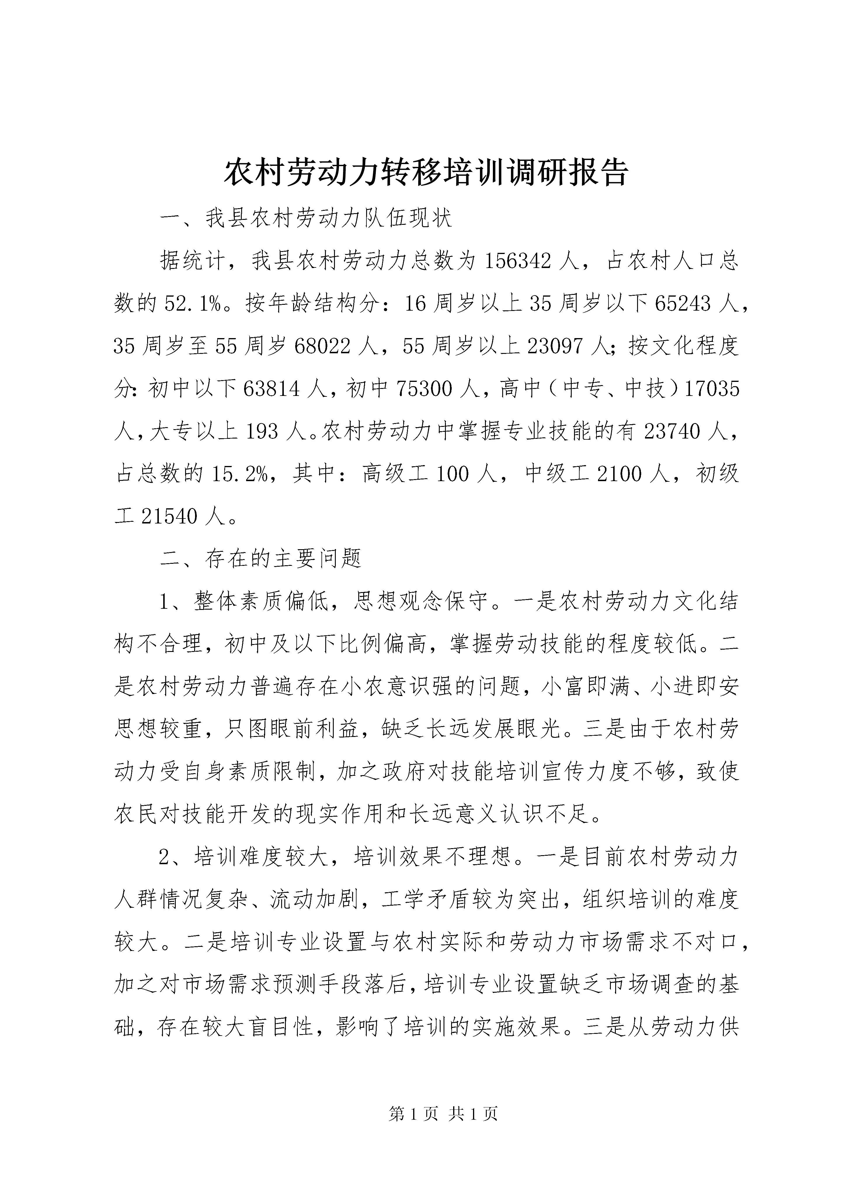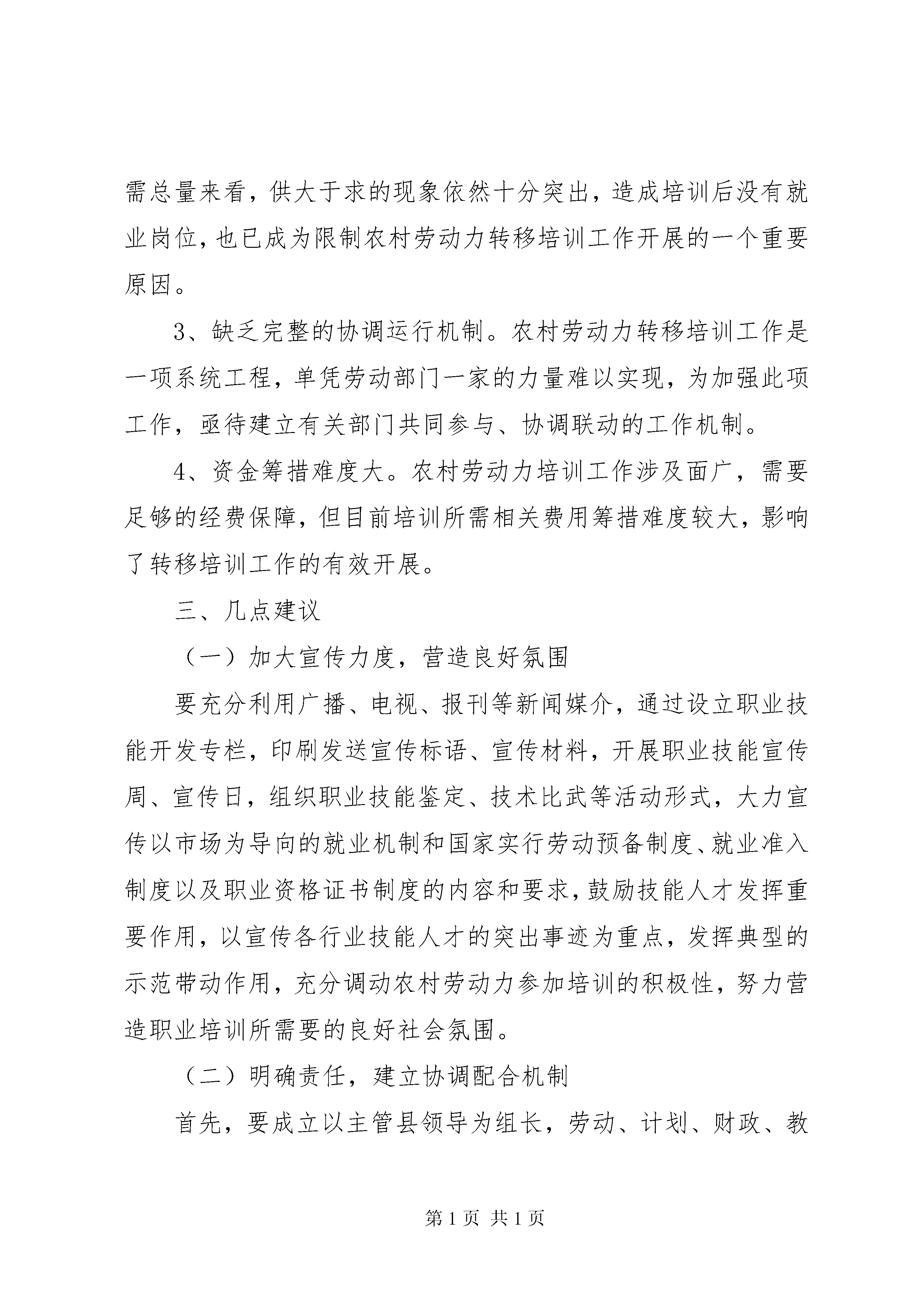 农村劳动力转移培训调研报告一、我县农村劳动力队伍现状据统计,我县农村劳动力总数为156342人,占农村人口总数的52.1%。按年龄结构分:16周岁以上35周岁以下65243人,35周岁至55周岁68022人,55周岁以上23097人;按文化程度分:初中以下63814人,初中75300人,高中(中专、中技)17035人,大专以上193人。农村劳动力中掌握专业技能的有23740人,占总数的15.2%,其中:高级工100人,中级工2100人,初级工21540人。二、存在的主要问题1、整体素质偏低,思想观念保守。一是农村劳动力文化结构不合理,初中及以下比例偏高,掌握劳动技能的程度较低。二是农村劳动力普遍存在小农意识强的问题,小富即满、小进即安思想较重,只图眼前利益,缺乏长远发展眼光。三是由于农村劳动力受自身素质限制,加之政府对技能培训宣传力度不够,致使农民对技能开发的现实作用和长远意义认识不足。2、培训难度较大,培训效果不理想。一是目前农村劳动力人群情况复杂、流动加剧,工学矛盾较为突出,组织培训的难度较大。二是培训专业设置与农村实际和劳动力市场需求不对口,加之对市场需求预测手段落后,培训专业设置缺乏市场调查的基础,存在较大盲目性,影响了培训的实施效果。三是从劳动力供需总量来看,供大于求的现象依然十分突出,造成培训后没有就业岗位,也已成为限制农村劳动力转移培训工作开展的一个重要原因。3、缺乏完整的协调运行机制。农村劳动力转移培训工作是一项系统工程,单凭劳动部门一家的力量难以实现,为加强此项工作,亟待建立有关部门共同参与、协调联动的工作机制。4、资金筹措难度大。农村劳动力培训工作涉及面广,需要足够的经费保障,但目前培训所需相关费用筹措难度较大,影响了转移培训工作的有效开展。三、几点建议(一)加大宣传力度,营造良好氛围要充分利用广播、电视、报刊等新闻媒介,通过设立职业技能开发专栏,印刷发送宣传标语、宣传材料,开展职业技能宣传周、宣传日,组织职业技能鉴定、技术比武等活动形式,大力宣传以市场为导向的就业机制和国家实行劳动预备制度、就业准入制度以及职业资格证书制度的内容和要求,鼓励技能人才发挥重要作用,以宣传各行业技能人才的突出事迹为重点,发挥典型的示范带动作用,充分调动农村劳动力参加培训的积极性,努力营造职业培训所需要的良好社会氛围。(二)明确责任,建立协调配合机制首先,要成立以主管县领导为组长,劳动、计划、财政、教育、林业、农业、科技及乡镇政府主要领导为成员的县农村劳动力转移培训工作领导组织。建立农民工培训工作联席会议制度,研究解决培训工作中的具体问题,编制培训计划,落实扶持政策,统筹规划、综合协调农民工的培训工作。在此基础上以县乡劳动服务站、村劳动服务所为依托,成立乡镇职业技术培训中心,健全完善农村劳动力培训服务网络,重点做好农村劳动力转移人员和农业实用技术的培训工作。其次,要把农村劳动力转移培训工作作为促进县域经济发展的大事来抓,将此项工作纳入全县经济和社会发展总体规划,加强劳动力市场建设与管理,要开展专题调研活动,绘制以乡镇为主体的劳动力资源分布图,同时制定详细的农村劳动力培训计划,为转移就业创造条件。(三)制定相关政策措施,促进培训工作开展一是取消岗位和户籍限制,统一发放《就业失业登记证》,用工单位在使用农民工和城镇居民时要一视同仁。二是积极探索用工单位招用农民工要参加医疗保险的具体办法,保证农民工依法享有工伤保险待遇。三是在办理农民工进城务工手续时,除国务院、省规定收取的费用外,不收取其它任何费用。四是为返乡创业人员提供扶持,享受我县招商引资优惠政策。五是对参加培训的农民工实行补贴或奖励。(四)扩大输出渠道,发展劳务经济一方面有计划地深入京津等经济发达地区,直接与用工单位见面,根据市场对劳动力的需求,制定培训和劳务输出计划,实现培训基地与输出单位对接,建立劳务输出联合体,另一方面在北京、天津等大中城市设立办事处,聘请信息员,通过原协作单位发展新的用工单位,挖掘新的招聘信息和用工渠道,使劳务输出规模不断扩大,减轻就业压力,实现农村富余劳动力的有序合理流转。(五)整合培训资源,全方位开展农村职业技术培训工作以县职教中心为龙头,以乡镇职业技术培训中心为基础,以各社会力量办学机构为补充,建设一批能起示范带动作用的农村劳动力转移培训基地,完善教学培训条件,整合培训资源,增加培训项目,扩大培训规模,创造整体效应。加强劳动力需求总量和结构预测,根据经济发展需要,在培训内容上突出专用性与实效性,加强以产业化为重点的农村劳动力就地转移和以“绿色证书”为重点的农业实用技术培训工作,搞好就地就近转移前的职业培训工作,有针对性地开展林果、食用菌、时差大棚蔬菜等种植技术和水产、畜牧、家禽等养殖技术的实用技术培训,切实提高培训的质量和