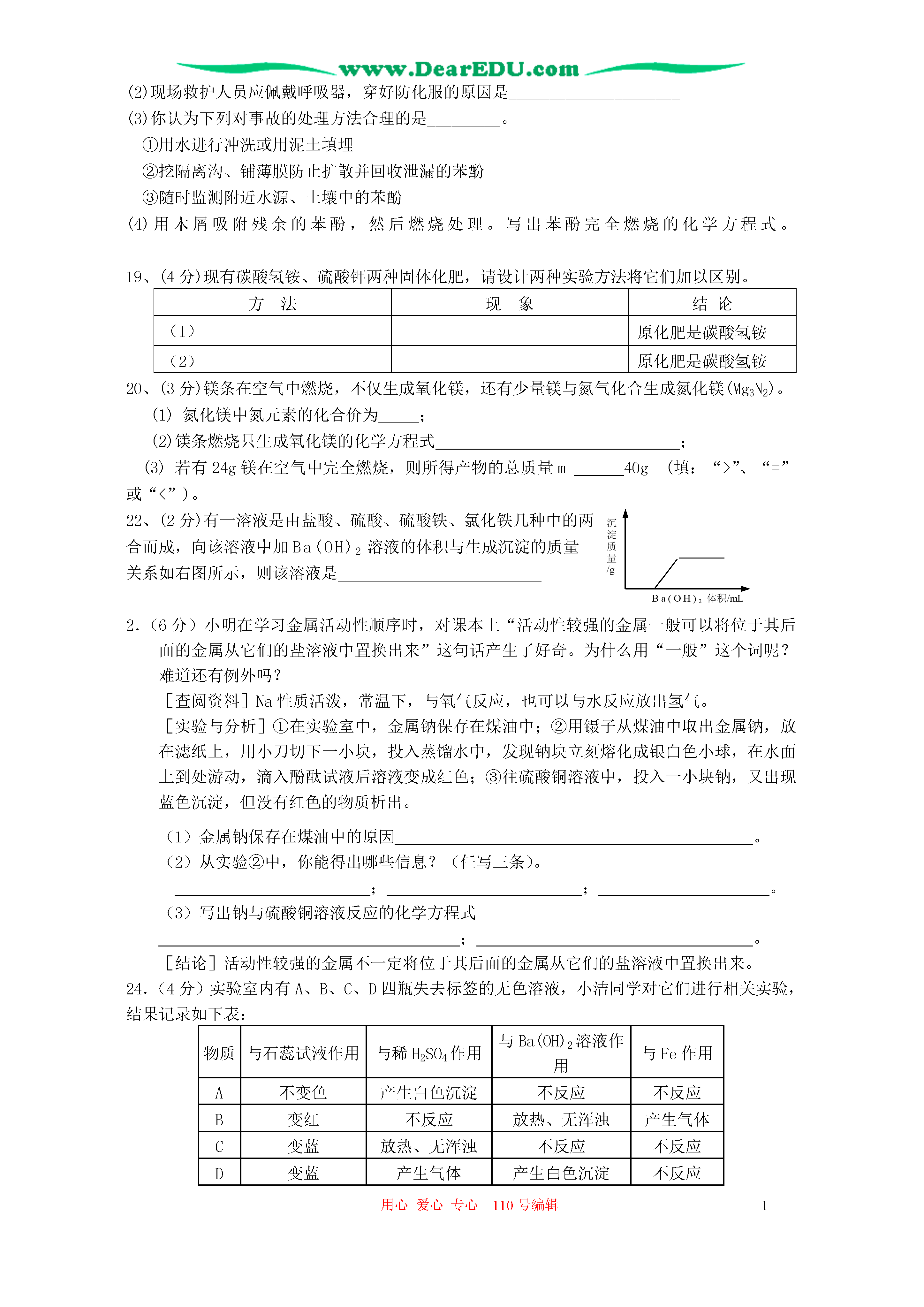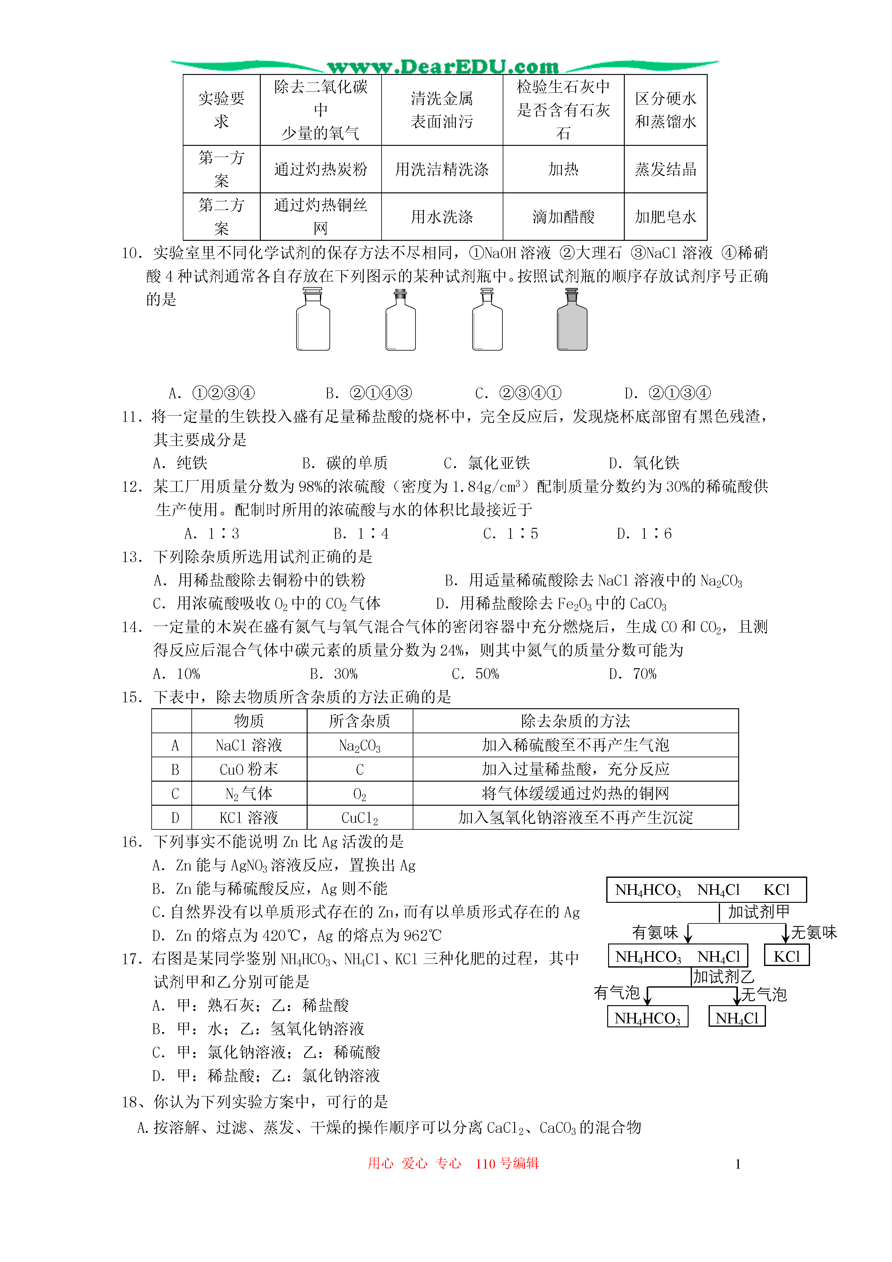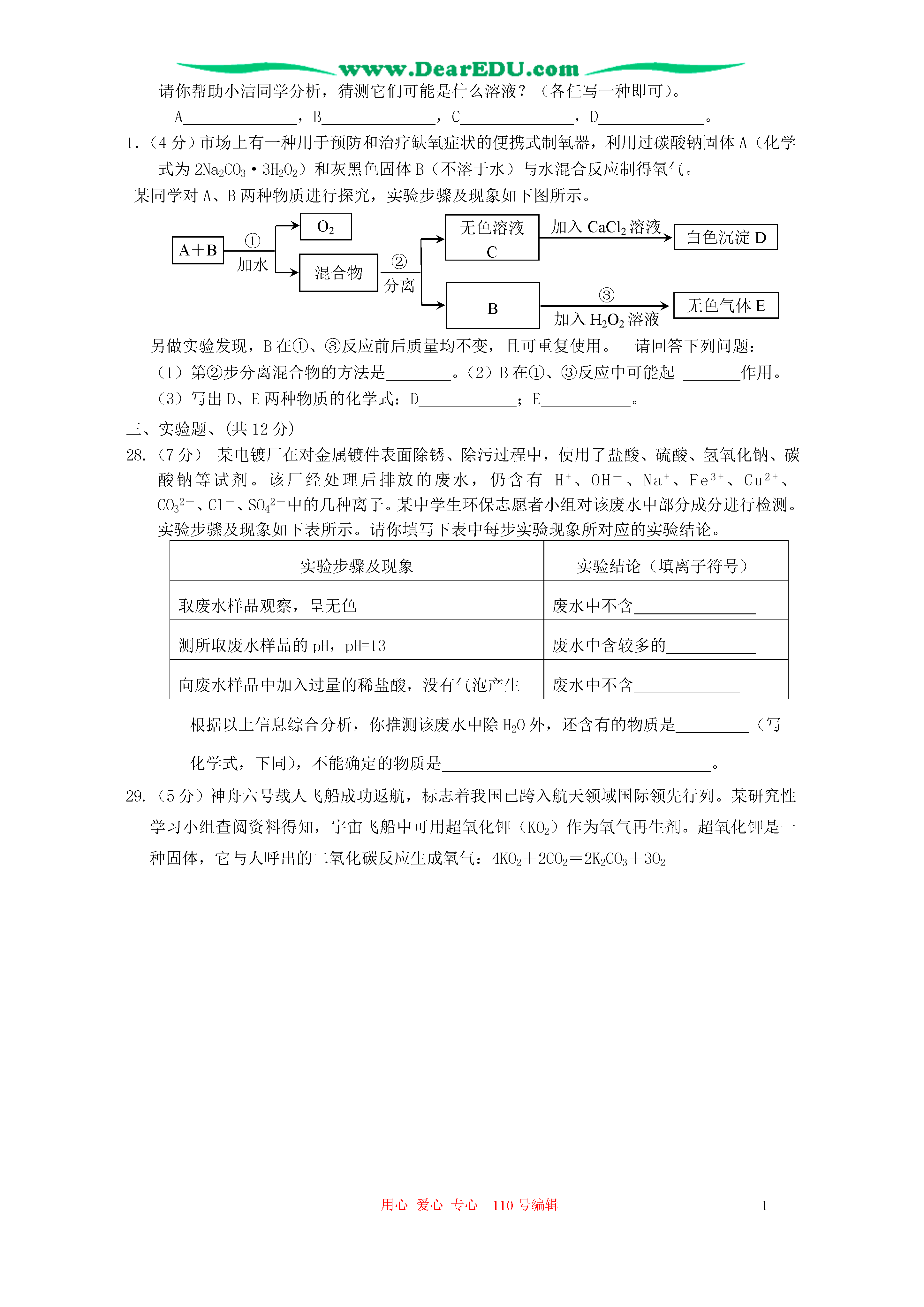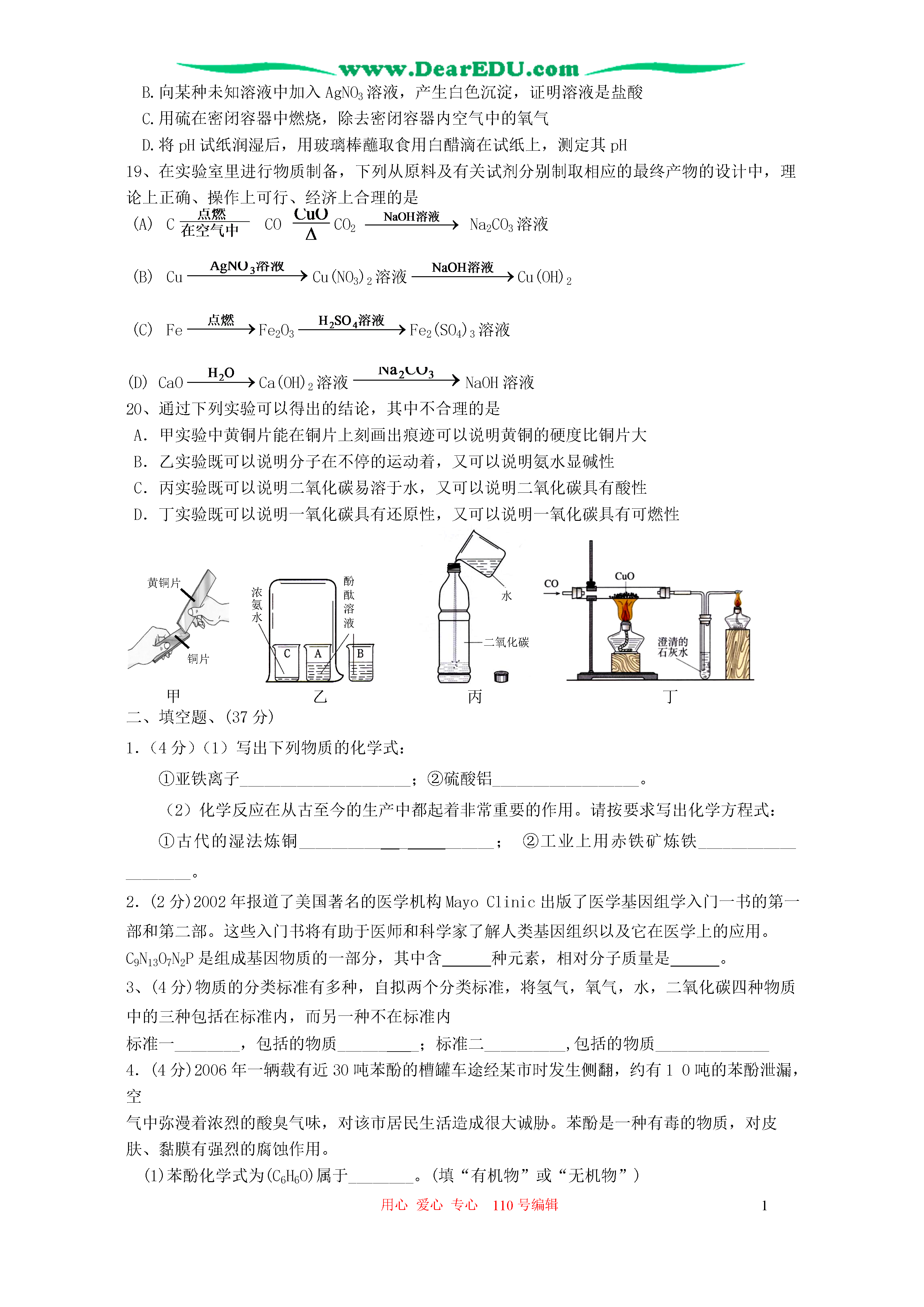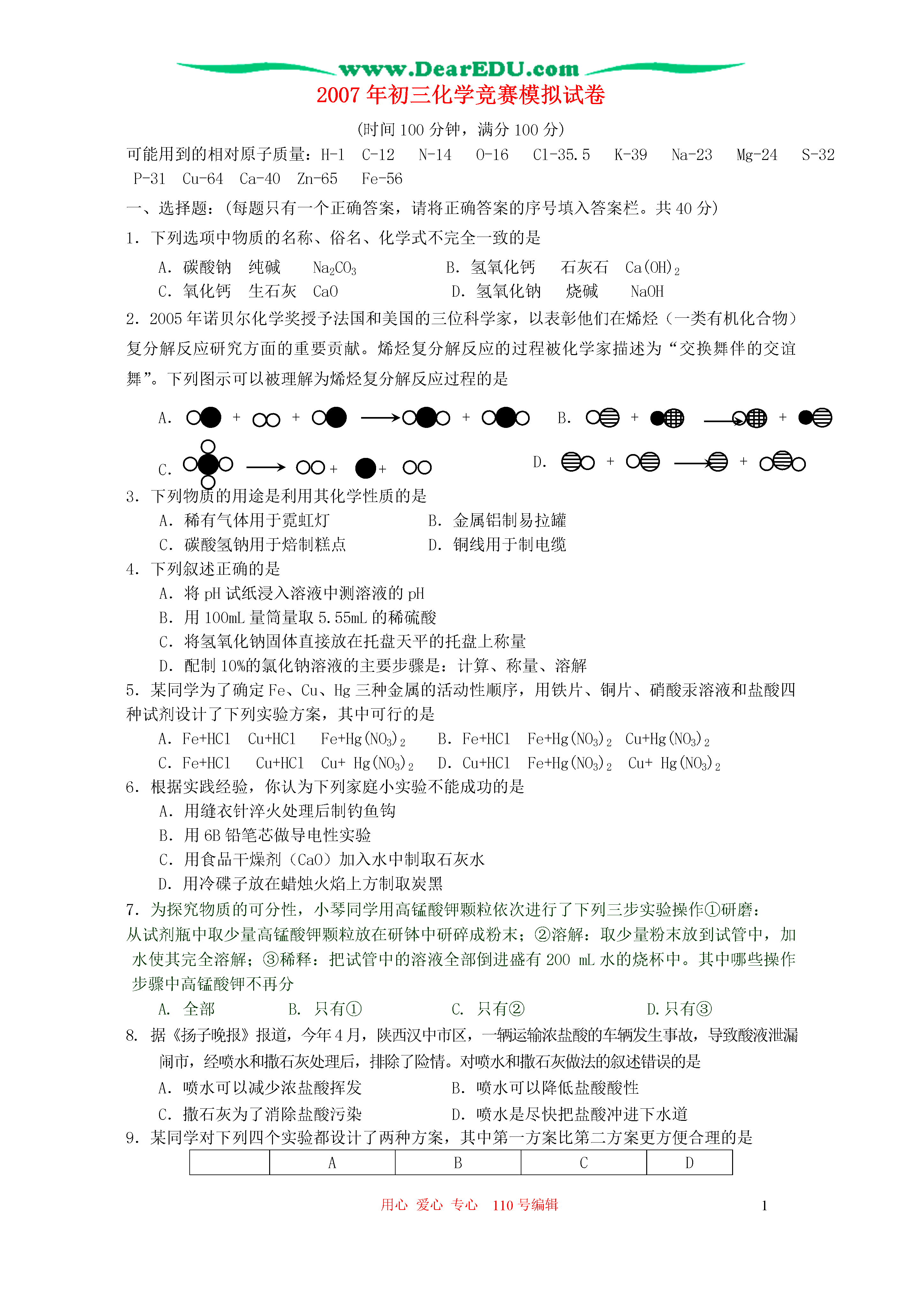 用心爱心专心110号编辑12007年初三化学竞赛模拟试卷(时间100分钟,满分100分)可能用到的相对原子质量:H-lC-12N-14O-16Cl-35.5K-39Na-23Mg-24S-32P-31Cu-64Ca-40Zn-65Fe-56一、选择题:(每题只有一个正确答案,请将正确答案的序号填入答案栏。共40分)1.下列选项中物质的名称、俗名、化学式不完全一致的是A.碳酸钠纯碱Na2CO3B.氢氧化钙石灰石Ca(OH)2C.氧化钙生石灰CaOD.氢氧化钠烧碱NaOH2.2005年诺贝尔化学奖授予法国和美国的三位科学家,以表彰他们在烯烃(一类有机化合物)复分解反应研究方面的重要贡献。烯烃复分解反应的过程被化学家描述为“交换舞伴的交谊舞”。下列图示可以被理解为烯烃复分解反应过程的是A.+++B.++C.++D.++3.下列物质的用途是利用其化学性质的是A.稀有气体用于霓虹灯B.金属铝制易拉罐C.碳酸氢钠用于焙制糕点D.铜线用于制电缆4.下列叙述正确的是A.将pH试纸浸入溶液中测溶液的pHB.用100mL量筒量取5.55mL的稀硫酸C.将氢氧化钠固体直接放在托盘天平的托盘上称量D.配制10%的氯化钠溶液的主要步骤是:计算、称量、溶解5.某同学为了确定Fe、Cu、Hg三种金属的活动性顺序,用铁片、铜片、硝酸汞溶液和盐酸四种试剂设计了下列实验方案,其中可行的是A.Fe+HClCu+HClFe+Hg(NO3)2B.Fe+HClFe+Hg(NO3)2Cu+Hg(NO3)2C.Fe+HClCu+HClCu+Hg(NO3)2D.Cu+HClFe+Hg(NO3)2Cu+Hg(NO3)26.根据实践经验,你认为下列家庭小实验不能成功的是A.用缝衣针淬火处理后制钓鱼钩B.用6B铅笔芯做导电性实验C.用食品干燥剂(CaO)加入水中制取石灰水D.用冷碟子放在蜡烛火焰上方制取炭黑7.为探究物质的可分性,小琴同学用高锰酸钾颗粒依次进行了下列三步实验操作①研磨:从试剂瓶中取少量高锰酸钾颗粒放在研钵中研碎成粉末;②溶解:取少量粉末放到试管中,加水使其完全溶解;③稀释:把试管中的溶液全部倒进盛有200mL水的烧杯中。其中哪些操作步骤中高锰酸钾不再分A.全部B.只有①C.只有②D.只有③8.据《扬子晚报》报道,今年4月,陕西汉中市区,一辆运输浓盐酸的车辆发生事故,导致酸液泄漏闹市,经喷水和撒石灰处理后,排除了险情。对喷水和撒石灰做法的叙述错误的是A.喷水可以减少浓盐酸挥发B.喷水可以降低盐酸酸性C.撒石灰为了消除盐酸污染D.喷水是尽快把盐酸冲进下水道9.某同学对下列四个实验都设计了两种方案,其中第一方案比第二方案更方便合理的是ABCD实验要求除去二氧化碳中少量的氧气清洗金属表面油污检验生石灰中是否含有石灰石区分硬水和蒸馏水第一方案通过灼热炭粉用洗洁精洗涤加热蒸发结晶第二方案通过灼热铜丝网用水洗涤滴加醋酸加肥皂水10.实验室里不同化学试剂的保存方法不尽相同,①NaOH溶液②大理石③NaCl溶液④稀硝酸4种试剂通常各自存放在下列图示的某种试剂瓶中。按照试剂瓶的顺序存放试剂序号正确的是A.①②③④B.②①④③C.②③④①D.②①③④11.将一定量的生铁投入盛有足量稀盐酸的烧杯中,完全反应后,发现烧杯底部留有黑色残渣,其主要成分是A.纯铁B.碳的单质C.氯化亚铁D.氧化铁12.某工厂用质量分数为98%的浓硫酸(密度为1.84g/cm3)配制质量分数约为30%的稀硫酸供生产使用。配制时所用的浓硫酸与水的体积比最接近于A.1∶3B.1∶4C.1∶5D.1∶613.下列除杂质所选用试剂正确的是A.用稀盐酸除去铜粉中的铁粉B.用适量稀硫酸除去NaCl溶液中的Na2CO3C.用浓硫酸吸收O2中的CO2气体D.用稀盐酸除去Fe2O3中的CaCO314.一定量的木炭在盛有氮气与氧气混合气体的密闭容器中充分燃烧后,生成CO和CO2,且测得反应后混合气体中碳元素的质量分数为24%,则其中氮气的质量分数可能为A.10%B.30%C.50%D.70%15.下表中,除去物质所含杂质的方法正确的是物质所含杂质除去杂质的方法ANaCl溶液Na2CO3加入稀硫酸至不再产生气泡BCuO粉末C加入过量稀盐酸,充分反应CN2气体O2将气体缓缓通过灼热的铜网DKCl溶液CuCl2加入氢氧化钠溶液至不再产生沉淀16.下列事实不能说明Zn比Ag活泼的是A.Zn能与AgNO3溶液反应,置换出AgNH4HCO3NH4ClKClKCl加试剂甲NH4HCO3NH4ClNH4HCO3NH4Cl加试剂乙无氨味有氨味有气泡无气泡B.Zn能与稀硫酸反应,Ag则不能C.自然界没有以单质形式存
