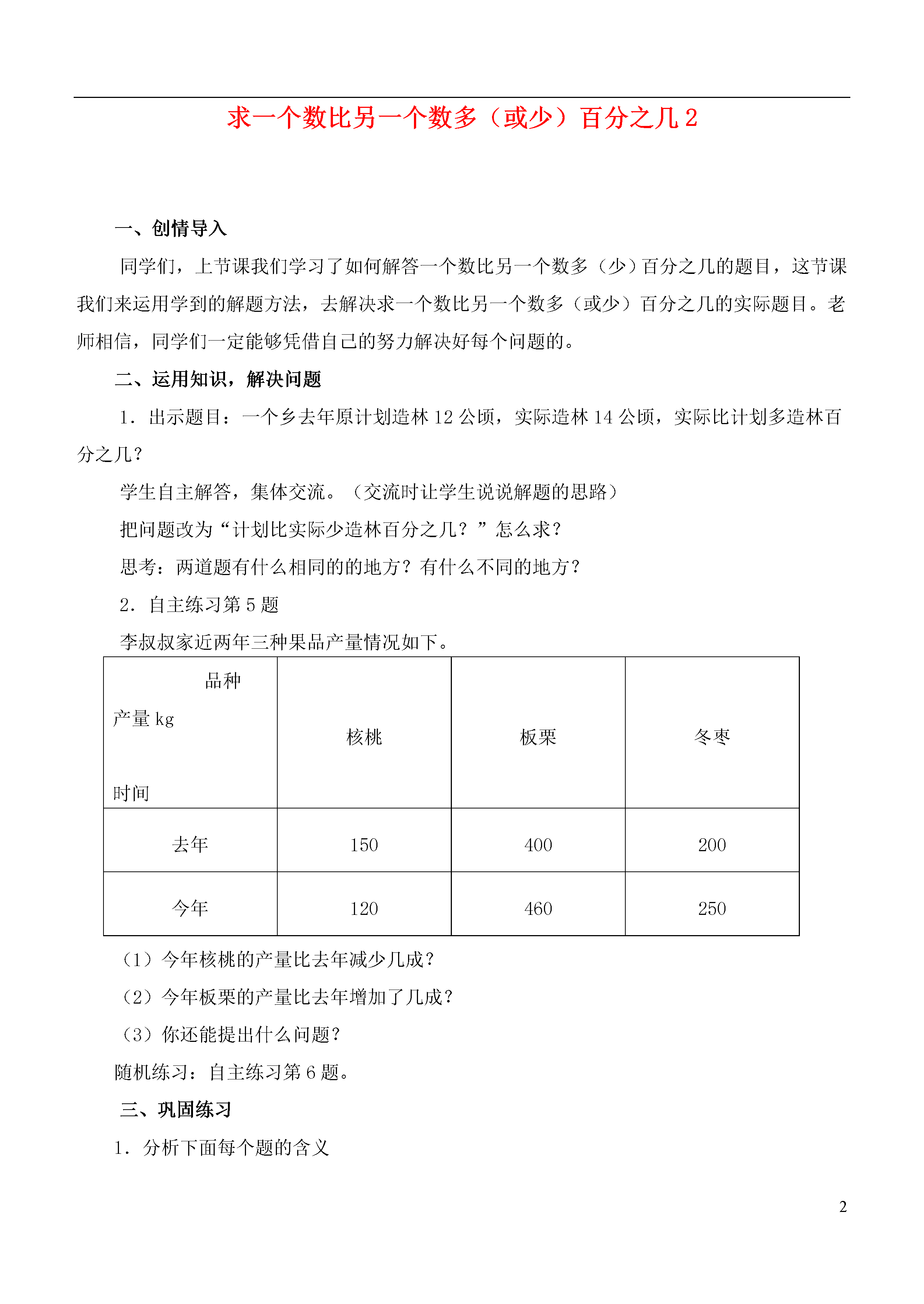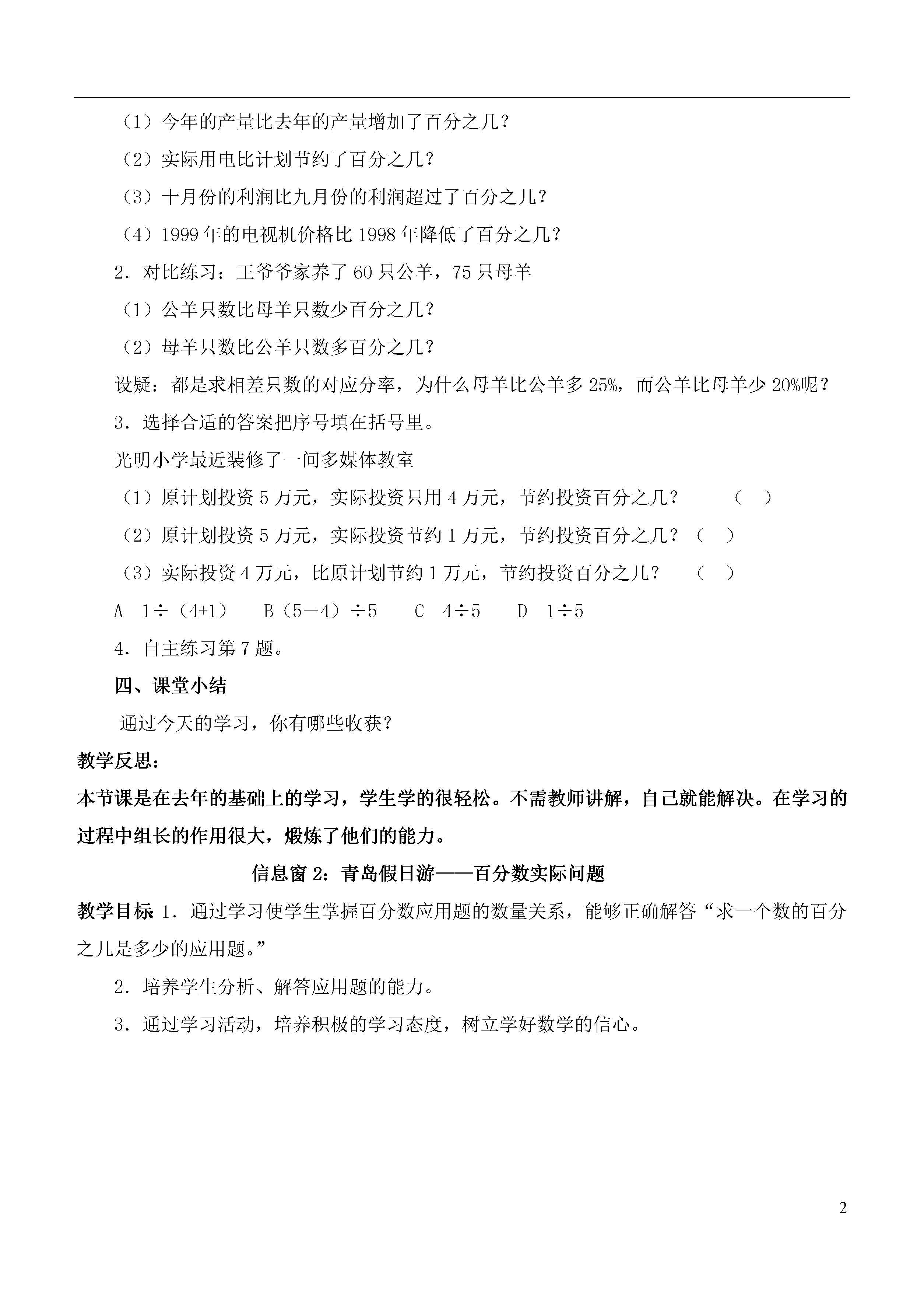 2求一个数比另一个数多(或少)百分之几2一、创情导入同学们,上节课我们学习了如何解答一个数比另一个数多(少)百分之几的题目,这节课我们来运用学到的解题方法,去解决求一个数比另一个数多(或少)百分之几的实际题目。老师相信,同学们一定能够凭借自己的努力解决好每个问题的。二、运用知识,解决问题1.出示题目:一个乡去年原计划造林12公顷,实际造林14公顷,实际比计划多造林百分之几?学生自主解答,集体交流。(交流时让学生说说解题的思路)把问题改为“计划比实际少造林百分之几?”怎么求?思考:两道题有什么相同的的地方?有什么不同的地方?2.自主练习第5题李叔叔家近两年三种果品产量情况如下。品种产量kg时间核桃板栗冬枣去年150400200今年120460250(1)今年核桃的产量比去年减少几成?(2)今年板栗的产量比去年增加了几成?(3)你还能提出什么问题?随机练习:自主练习第6题。三、巩固练习1.分析下面每个题的含义(1)今年的产量比去年的产量增加了百分之几?(2)实际用电比计划节约了百分之几?(3)十月份的利润比九月份的利润超过了百分之几?(4)1999年的电视机价格比1998年降低了百分之几?2.对比练习:王爷爷家养了60只公羊,75只母羊(1)公羊只数比母羊只数少百分之几?(2)母羊只数比公羊只数多百分之几?设疑:都是求相差只数的对应分率,为什么母羊比公羊多25%,而公羊比母羊少20%呢?3.选择合适的答案把序号填在括号里。光明小学最近装修了一间多媒体教室(1)原计划投资5万元,实际投资只用4万元,节约投资百分之几?()(2)原计划投资5万元,实际投资节约1万元,节约投资百分之几?()(3)实际投资4万元,比原计划节约1万元,节约投资百分之几?()A1÷(4+1)B(5-4)÷5C4÷5D1÷54.自主练习第7题。四、课堂小结通过今天的学习,你有哪些收获?教学反思:本节课是在去年的基础上的学习,学生学的很轻松。不需教师讲解,自己就能解决。在学习的过程中组长的作用很大,煅炼了他们的能力。信息窗2:青岛假日游——百分数实际问题教学目标:1.通过学习使学生掌握百分数应用题的数量关系,能够正确解答“求一个数的百分之几是多少的应用题。”2.培养学生分析、解答应用题的能力。3.通过学习活动,培养积极的学习态度,树立学好数学的信心。