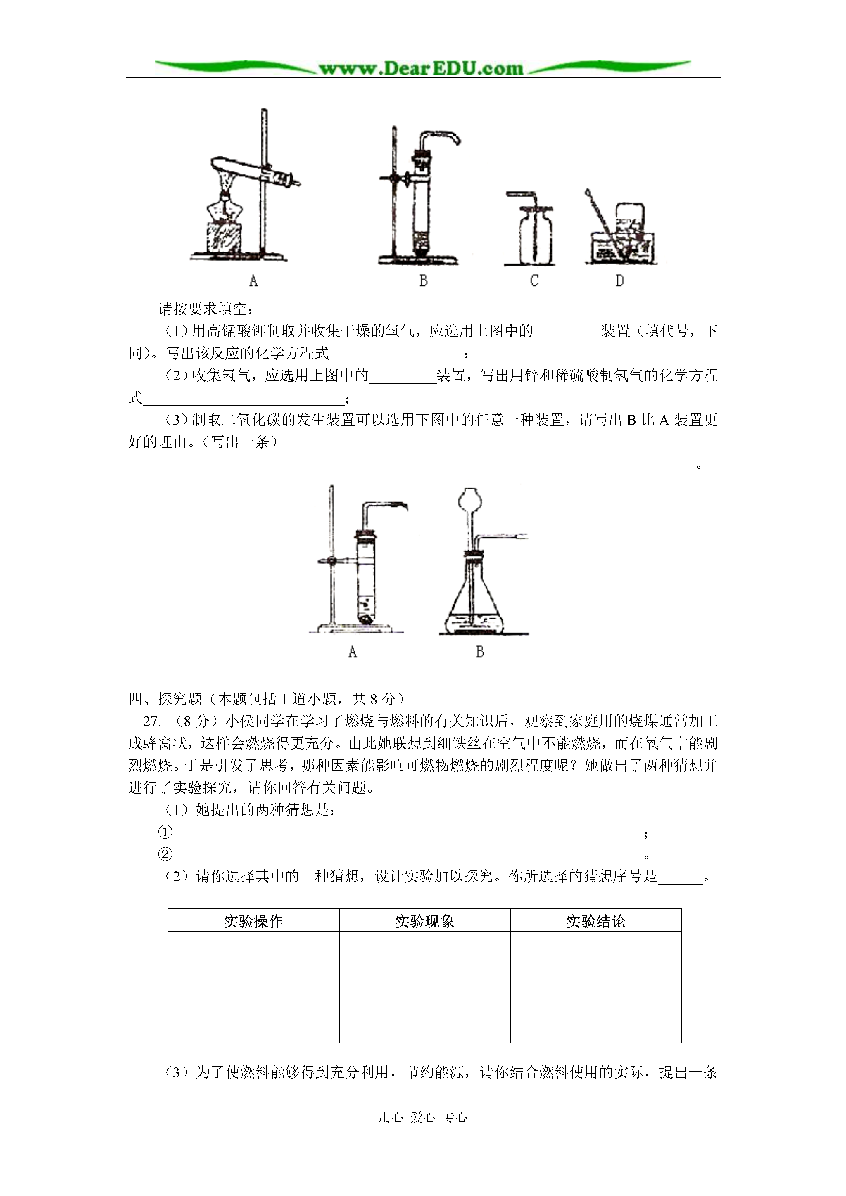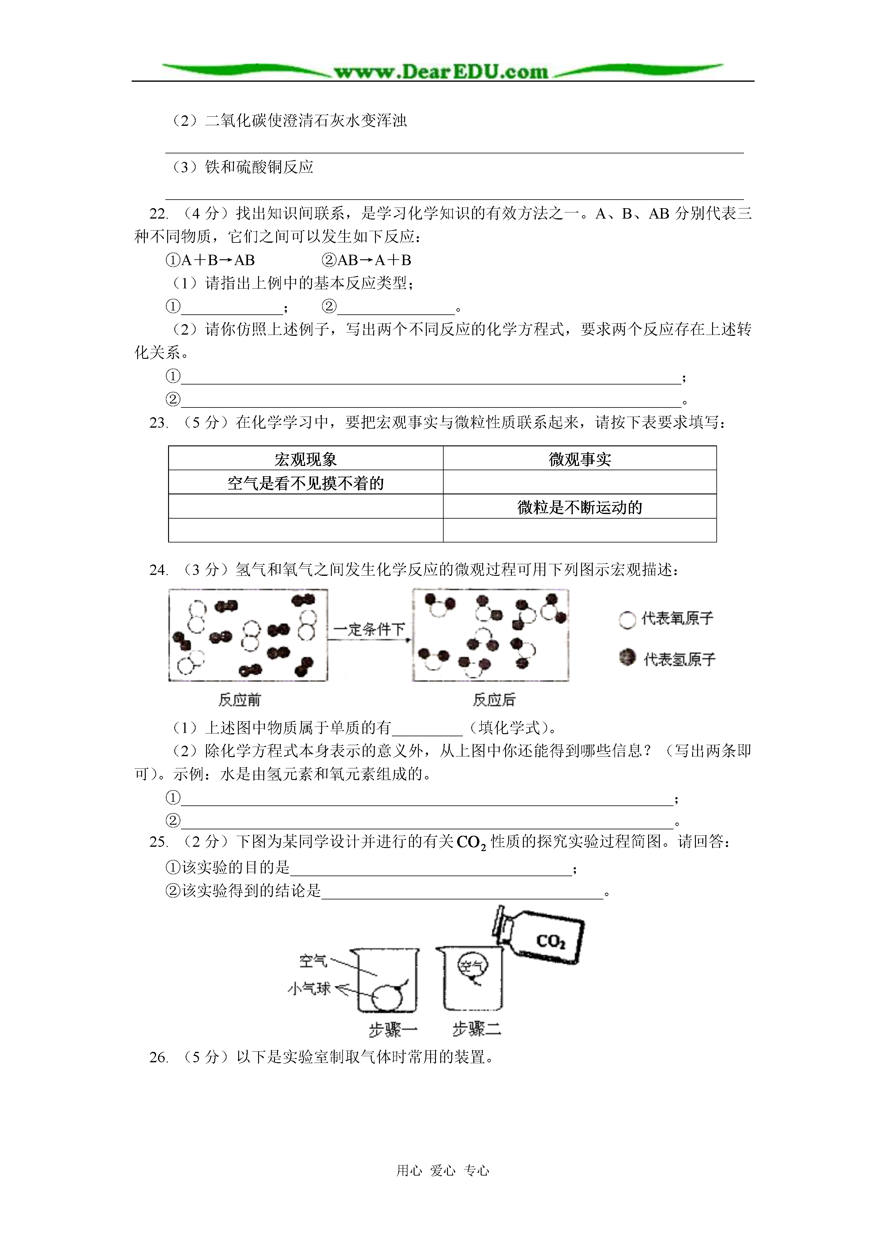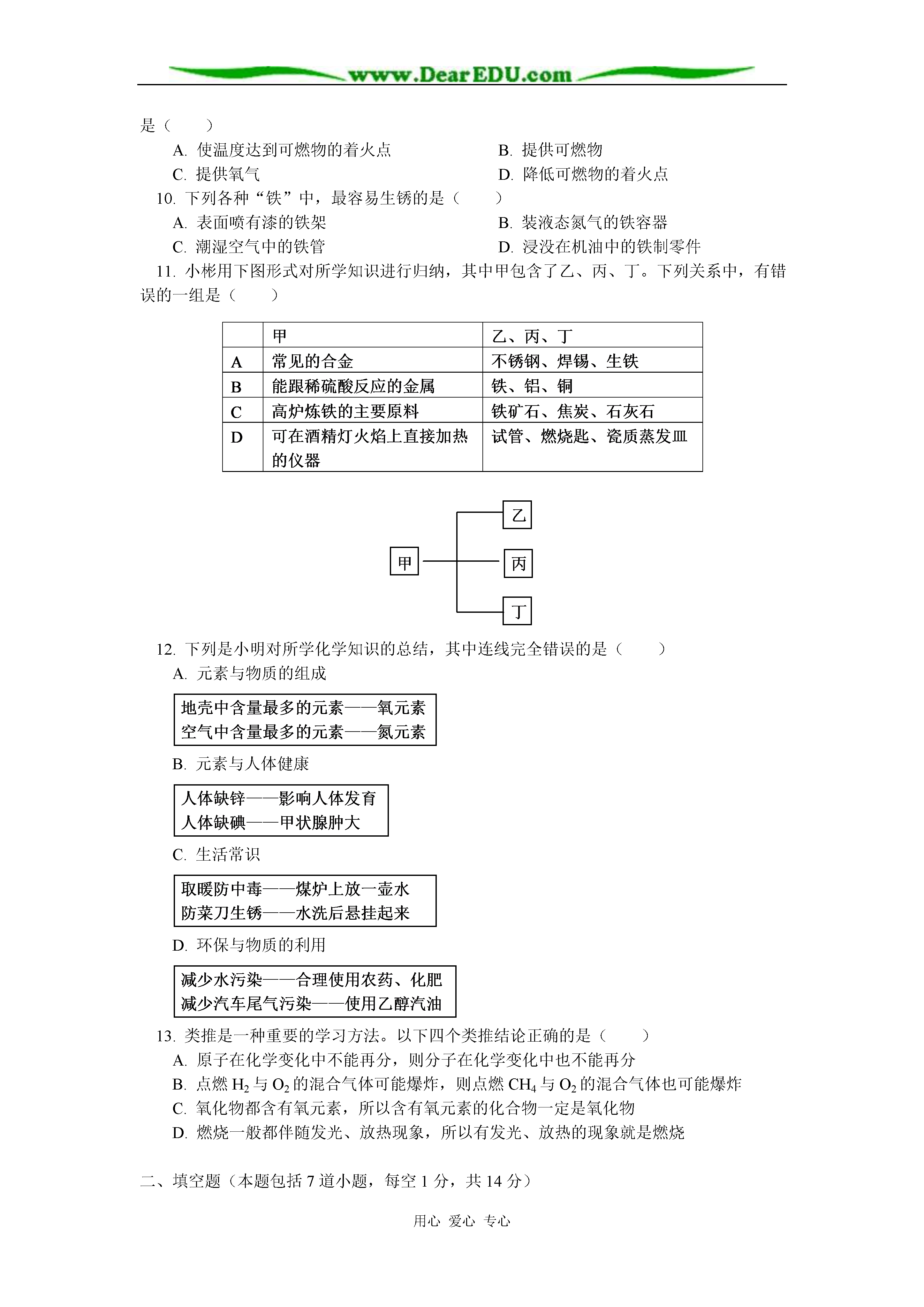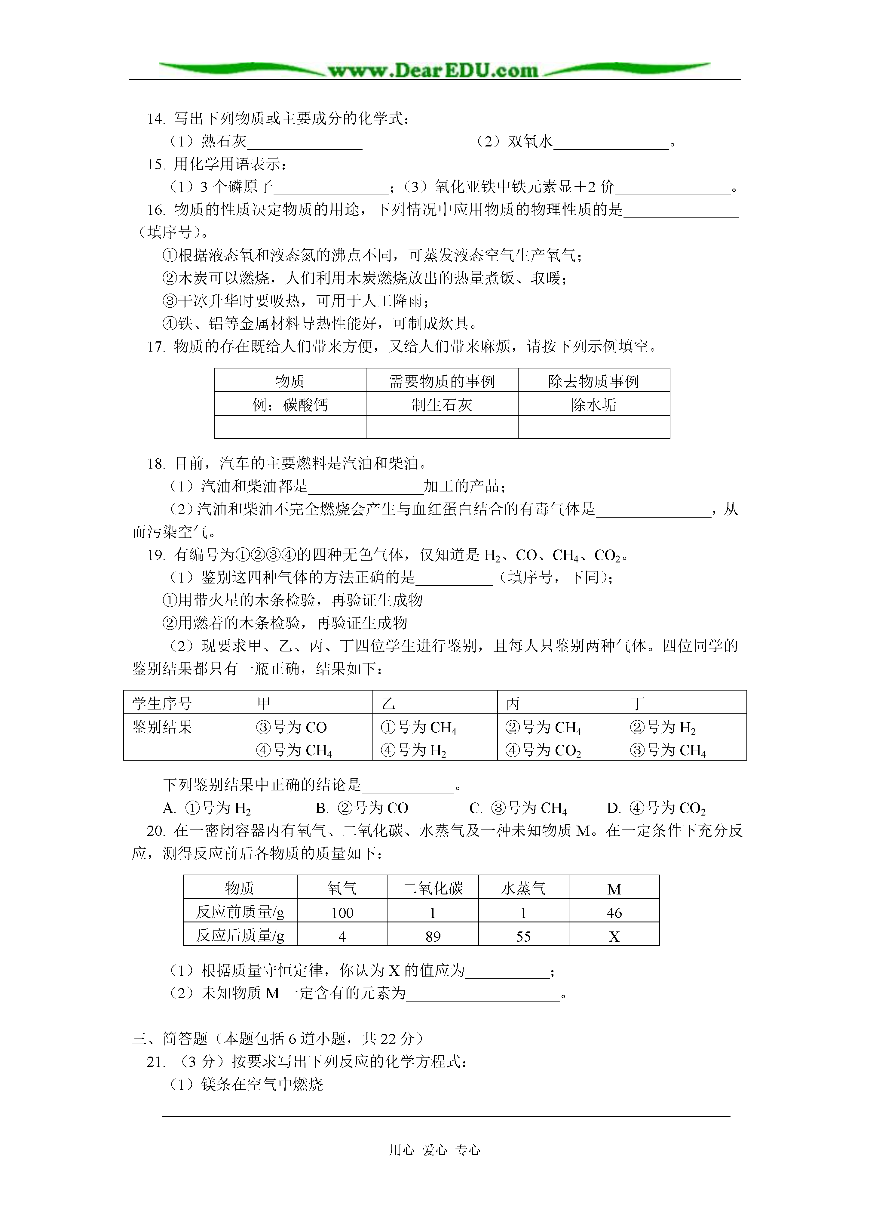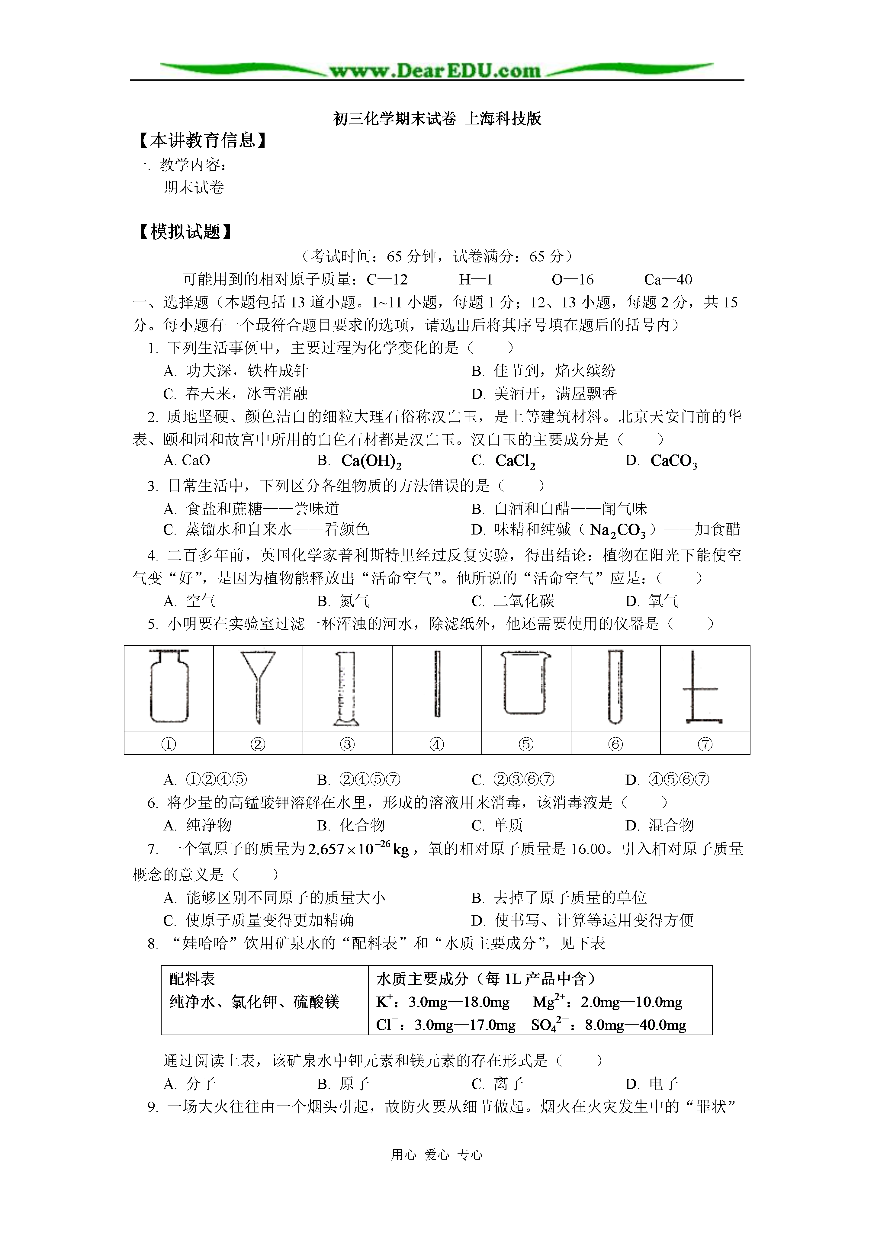 用心爱心专心初三化学期末试卷上海科技版【本讲教育信息】一.教学内容:期末试卷【模拟试题】(考试时间:65分钟,试卷满分:65分)可能用到的相对原子质量:C—12H—1O—16Ca—40一、选择题(本题包括13道小题。1~11小题,每题1分;12、13小题,每题2分,共15分。每小题有一个最符合题目要求的选项,请选出后将其序号填在题后的括号内)1.下列生活事例中,主要过程为化学变化的是()A.功夫深,铁杵成针B.佳节到,焰火缤纷C.春天来,冰雪消融D.美酒开,满屋飘香2.质地坚硬、颜色洁白的细粒大理石俗称汉白玉,是上等建筑材料。北京天安门前的华表、颐和园和故宫中所用的白色石材都是汉白玉。汉白玉的主要成分是()A.CaOB.C.D.3.日常生活中,下列区分各组物质的方法错误的是()A.食盐和蔗糖——尝味道B.白酒和白醋——闻气味C.蒸馏水和自来水——看颜色D.味精和纯碱()——加食醋4.二百多年前,英国化学家普利斯特里经过反复实验,得出结论:植物在阳光下能使空气变“好”,是因为植物能释放出“活命空气”。他所说的“活命空气”应是:()A.空气B.氮气C.二氧化碳D.氧气5.小明要在实验室过滤一杯浑浊的河水,除滤纸外,他还需要使用的仪器是()①②③④⑤⑥⑦A.①②④⑤B.②④⑤⑦C.②③⑥⑦D.④⑤⑥⑦6.将少量的高锰酸钾溶解在水里,形成的溶液用来消毒,该消毒液是()A.纯净物B.化合物C.单质D.混合物7.一个氧原子的质量为,氧的相对原子质量是16.00。引入相对原子质量概念的意义是()A.能够区别不同原子的质量大小B.去掉了原子质量的单位C.使原子质量变得更加精确D.使书写、计算等运用变得方便8.“娃哈哈”饮用矿泉水的“配料表”和“水质主要成分”,见下表通过阅读上表,该矿泉水中钾元素和镁元素的存在形式是()A.分子B.原子C.离子D.电子9.一场大火往往由一个烟头引起,故防火要从细节做起。烟火在火灾发生中的“罪状”是()A.使温度达到可燃物的着火点B.提供可燃物C.提供氧气D.降低可燃物的着火点10.下列各种“铁”中,最容易生锈的是()A.表面喷有漆的铁架B.装液态氮气的铁容器C.潮湿空气中的铁管D.浸没在机油中的铁制零件11.小彬用下图形式对所学知识进行归纳,其中甲包含了乙、丙、丁。下列关系中,有错误的一组是()12.下列是小明对所学化学知识的总结,其中连线完全错误的是()A.元素与物质的组成B.元素与人体健康C.生活常识D.环保与物质的利用13.类推是一种重要的学习方法。以下四个类推结论正确的是()A.原子在化学变化中不能再分,则分子在化学变化中也不能再分B.点燃H2与O2的混合气体可能爆炸,则点燃CH4与O2的混合气体也可能爆炸C.氧化物都含有氧元素,所以含有氧元素的化合物一定是氧化物D.燃烧一般都伴随发光、放热现象,所以有发光、放热的现象就是燃烧二、填空题(本题包括7道小题,每空1分,共14分)14.写出下列物质或主要成分的化学式:(1)熟石灰_______________(2)双氧水_______________。15.用化学用语表示:(1)3个磷原子_______________;(3)氧化亚铁中铁元素显+2价_______________。16.物质的性质决定物质的用途,下列情况中应用物质的物理性质的是_______________(填序号)。①根据液态氧和液态氮的沸点不同,可蒸发液态空气生产氧气;②木炭可以燃烧,人们利用木炭燃烧放出的热量煮饭、取暖;③干冰升华时要吸热,可用于人工降雨;④铁、铝等金属材料导热性能好,可制成炊具。17.物质的存在既给人们带来方便,又给人们带来麻烦,请按下列示例填空。物质需要物质的事例除去物质事例例:碳酸钙制生石灰除水垢18.目前,汽车的主要燃料是汽油和柴油。(1)汽油和柴油都是_______________加工的产品;(2)汽油和柴油不完全燃烧会产生与血红蛋白结合的有毒气体是_______________,从而污染空气。19.有编号为①②③④的四种无色气体,仅知道是H2、CO、CH4、CO2。(1)鉴别这四种气体的方法正确的是__________(填序号,下同);①用带火星的木条检验,再验证生成物②用燃着的木条检验,再验证生成物(2)现要求甲、乙、丙、丁四位学生进行鉴别,且每人只鉴别两种气体。四位同学的鉴别结果都只有一瓶正确,结果如下:学生序号甲乙丙丁鉴别结果③号为CO④号为CH4①号为CH4④号为H2②号为CH4④号为CO2②号为H2③号为CH4下列鉴别结果中正确的结论是____________。A.①号为H2B.②号