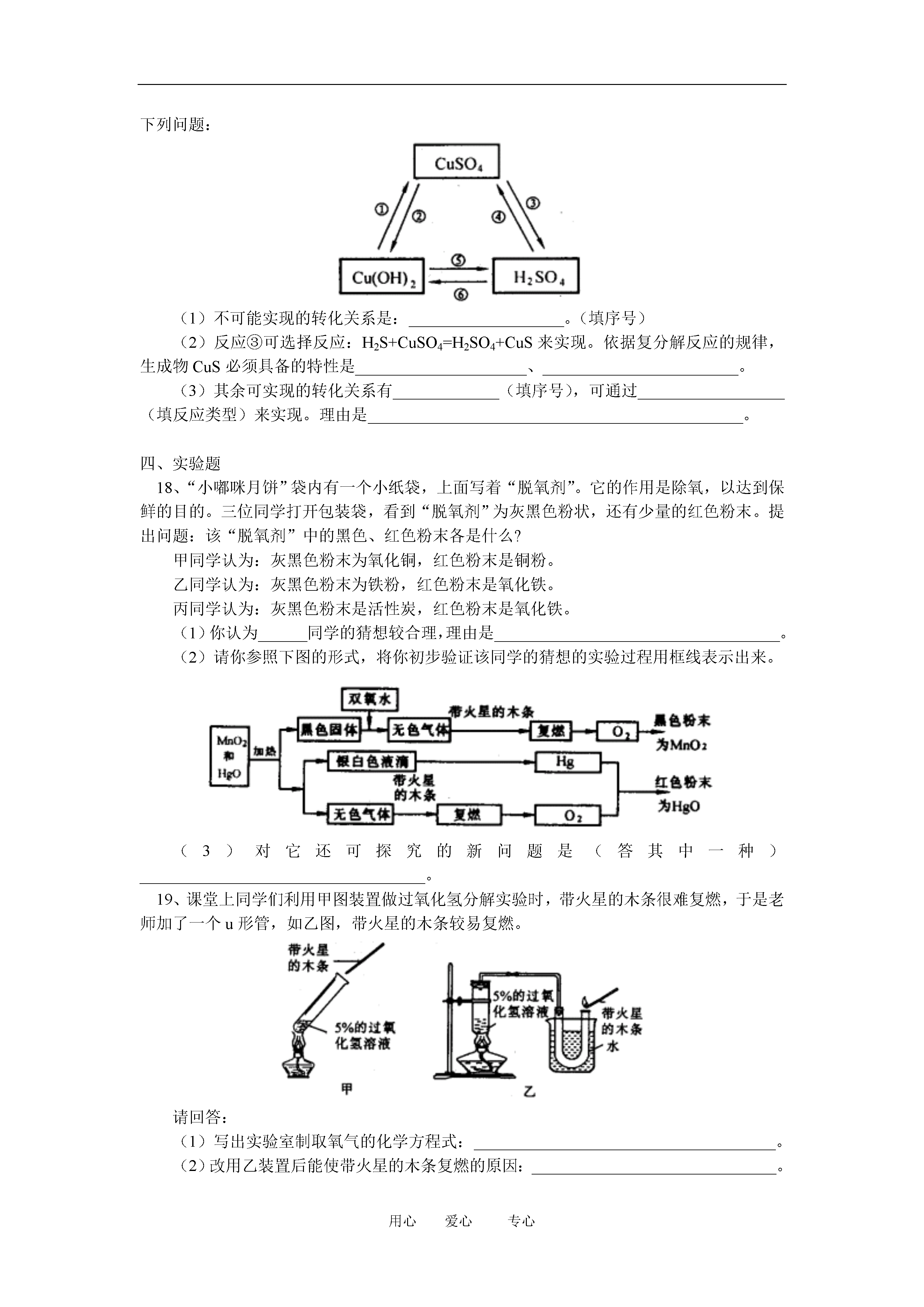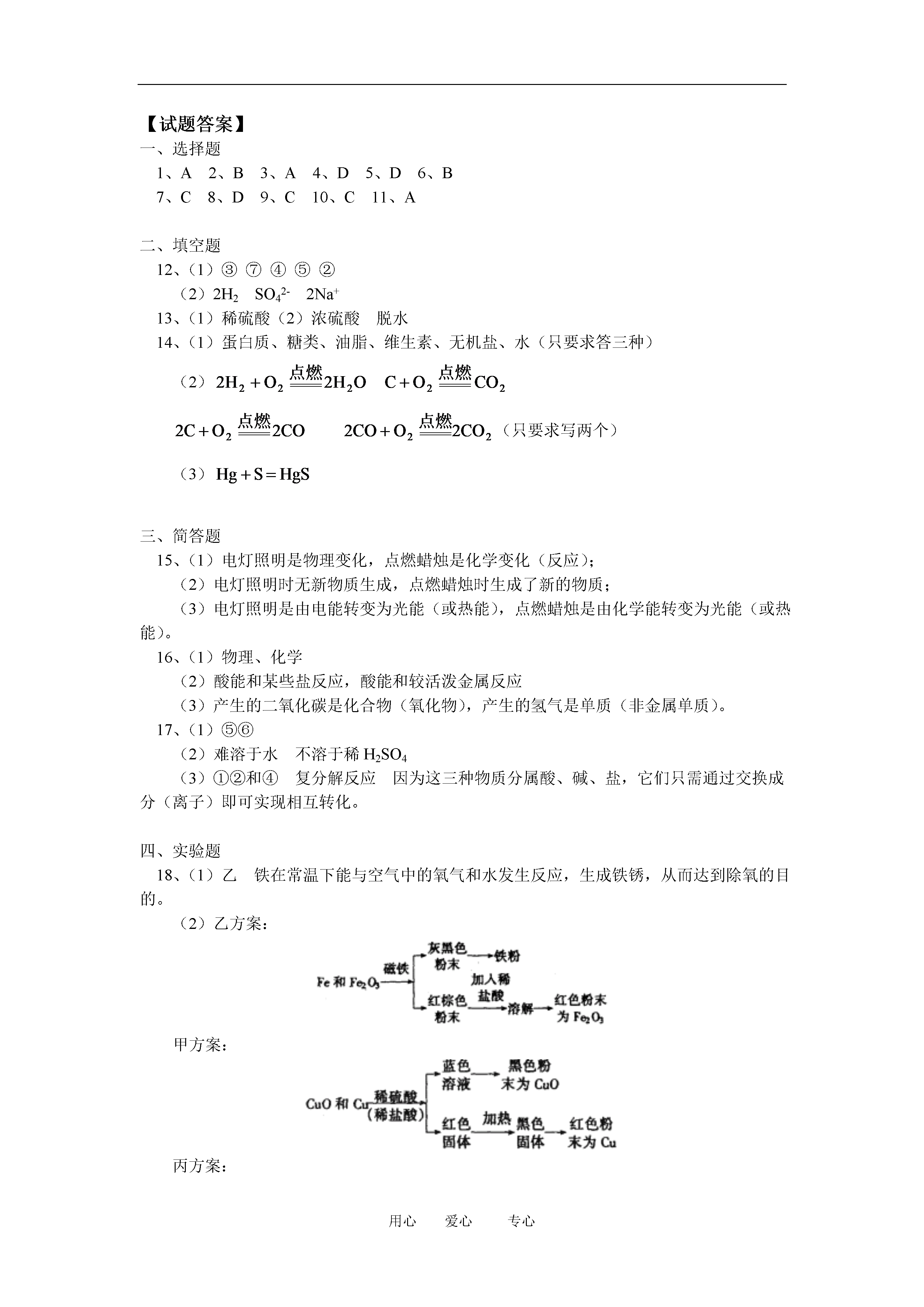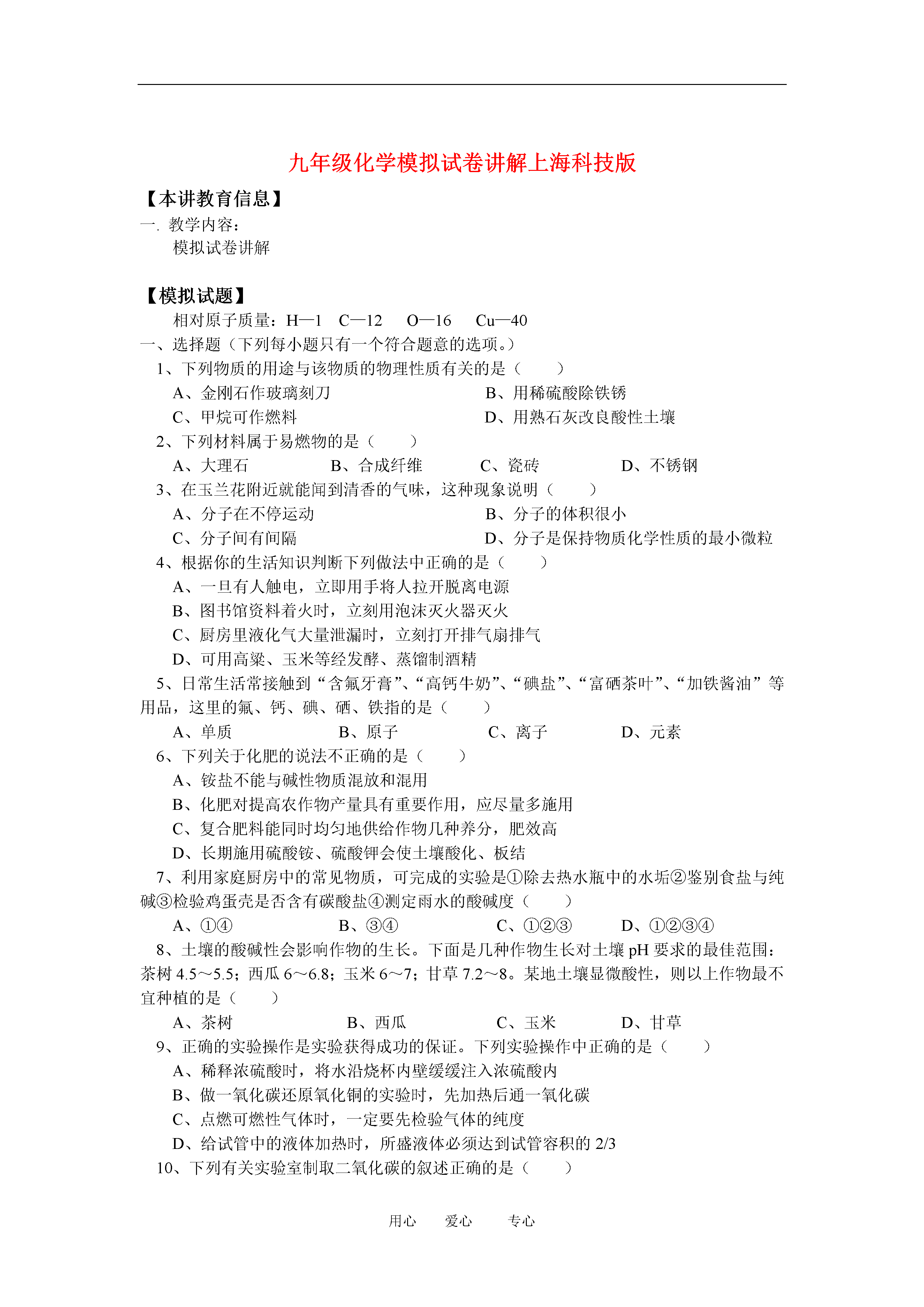 用心爱心专心九年级化学模拟试卷讲解上海科技版【本讲教育信息】一.教学内容:模拟试卷讲解【模拟试题】相对原子质量:H—1C—12O—16Cu—40一、选择题(下列每小题只有一个符合题意的选项。)1、下列物质的用途与该物质的物理性质有关的是()A、金刚石作玻璃刻刀B、用稀硫酸除铁锈C、甲烷可作燃料D、用熟石灰改良酸性土壤2、下列材料属于易燃物的是()A、大理石B、合成纤维C、瓷砖D、不锈钢3、在玉兰花附近就能闻到清香的气味,这种现象说明()A、分子在不停运动B、分子的体积很小C、分子间有间隔D、分子是保持物质化学性质的最小微粒4、根据你的生活知识判断下列做法中正确的是()A、一旦有人触电,立即用手将人拉开脱离电源B、图书馆资料着火时,立刻用泡沫灭火器灭火C、厨房里液化气大量泄漏时,立刻打开排气扇排气D、可用高粱、玉米等经发酵、蒸馏制酒精5、日常生活常接触到“含氟牙膏”、“高钙牛奶”、“碘盐”、“富硒茶叶”、“加铁酱油”等用品,这里的氟、钙、碘、硒、铁指的是()A、单质B、原子C、离子D、元素6、下列关于化肥的说法不正确的是()A、铵盐不能与碱性物质混放和混用B、化肥对提高农作物产量具有重要作用,应尽量多施用C、复合肥料能同时均匀地供给作物几种养分,肥效高D、长期施用硫酸铵、硫酸钾会使土壤酸化、板结7、利用家庭厨房中的常见物质,可完成的实验是①除去热水瓶中的水垢②鉴别食盐与纯碱③检验鸡蛋壳是否含有碳酸盐④测定雨水的酸碱度()A、①④B、③④C、①②③D、①②③④8、土壤的酸碱性会影响作物的生长。下面是几种作物生长对土壤pH要求的最佳范围:茶树4.5~5.5;西瓜6~6.8;玉米6~7;甘草7.2~8。某地土壤显微酸性,则以上作物最不宜种植的是()A、茶树B、西瓜C、玉米D、甘草9、正确的实验操作是实验获得成功的保证。下列实验操作中正确的是()A、稀释浓硫酸时,将水沿烧杯内壁缓缓注入浓硫酸内B、做一氧化碳还原氧化铜的实验时,先加热后通一氧化碳C、点燃可燃性气体时,一定要先检验气体的纯度D、给试管中的液体加热时,所盛液体必须达到试管容积的2/310、下列有关实验室制取二氧化碳的叙述正确的是()A、用稀硫酸与大理石反应来制取B、加热石灰石使其分解来制取C、用稀盐酸与石灰石反应来制取D、用向下排空气法来收集二氧化碳气体11、下列关于氢氧化钠的性质叙述不正确的是()A、氢氧化钠溶液能使紫色石蕊试液变红B、可作某些气体的干燥剂C、广泛用于肥皂、石油、造纸等工业D、对皮肤、衣服有强烈腐蚀作用二、填空题12、(1)有下列的物质:①烧碱②石墨③活性炭④纯碱⑤甲烷⑥金刚石⑦干冰⑧大理石,请按下列要求填空(填序号)可做冰箱除臭剂的是_______;能用于人工降雨的是______;能用来蒸馒头的盐是______;瓦斯的主要成分是_______;可用做干电池电极的是________。(2)用化学符号表示:2个氢分子_______;1个硫酸根离子______;2个钠离子_______。13、化学晚会上小豆把一张白纸的正反两面向大家展示清楚,然后把白纸用电吹风的热风吹片刻,不一会,白纸上出现了一只小黑猫,大家惊奇不已。你知道这是怎么回事吗?请你用学过的化学知识来解释:(1)小豆事先用________________画了一只猫;(2)使白纸出现黑猫的物质是______________;表现该物质具有_________________性。14、(1)妈妈为东东准备的每天食品为:奶类、豆类、鱼肉类、水果、蔬菜、面食等,这些食品中含有_____________、____________、___________等人体所需营养素(只需填写三种即可),可以保证营养均衡。(2)经过一年的学习,我们初步认识了一些身边简单的物质,如:木炭、氧气、氢气、一氧化碳、二氧化碳、水等,请从上述物质中选取适当的物质写出两个燃烧的化学方程式:①_________________________________;②______________________________________。(3)小明发烧去医院打吊针时看到一个小朋友不小心把体温计打碎了,护士就在撒落的汞上撒了一些硫粉,使之变成硫化汞(HgS)固体,防止汞挥发对人体造成危害。该反应的化学方程式为:_______________________________________________。三、简答题15、电灯可以照明,但在停电的时候,我们可以点燃蜡烛照明,请你就这两种照明方法,从你所学过的化学知识,找出二者3个方面的差异:①_________________②___________________③
