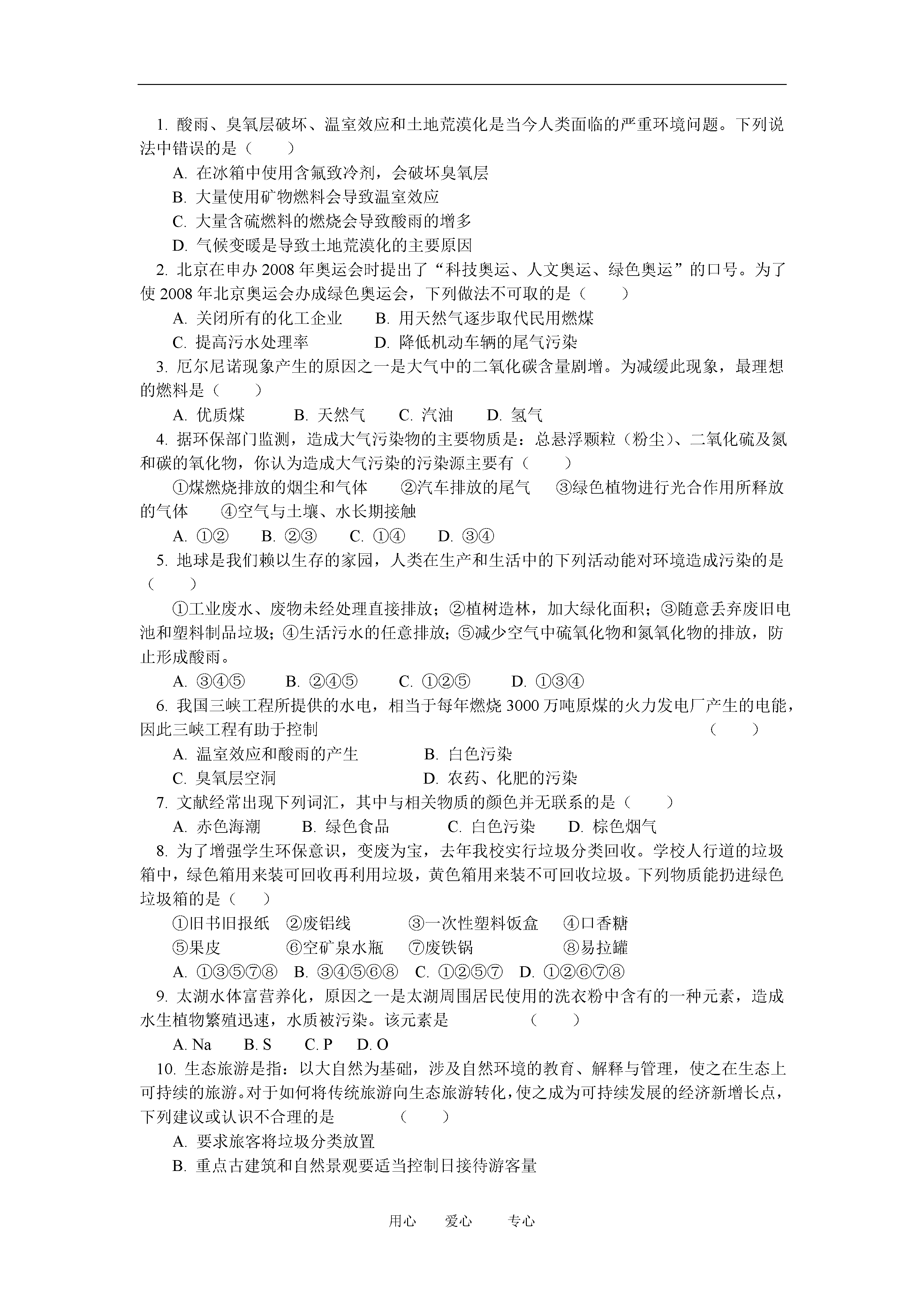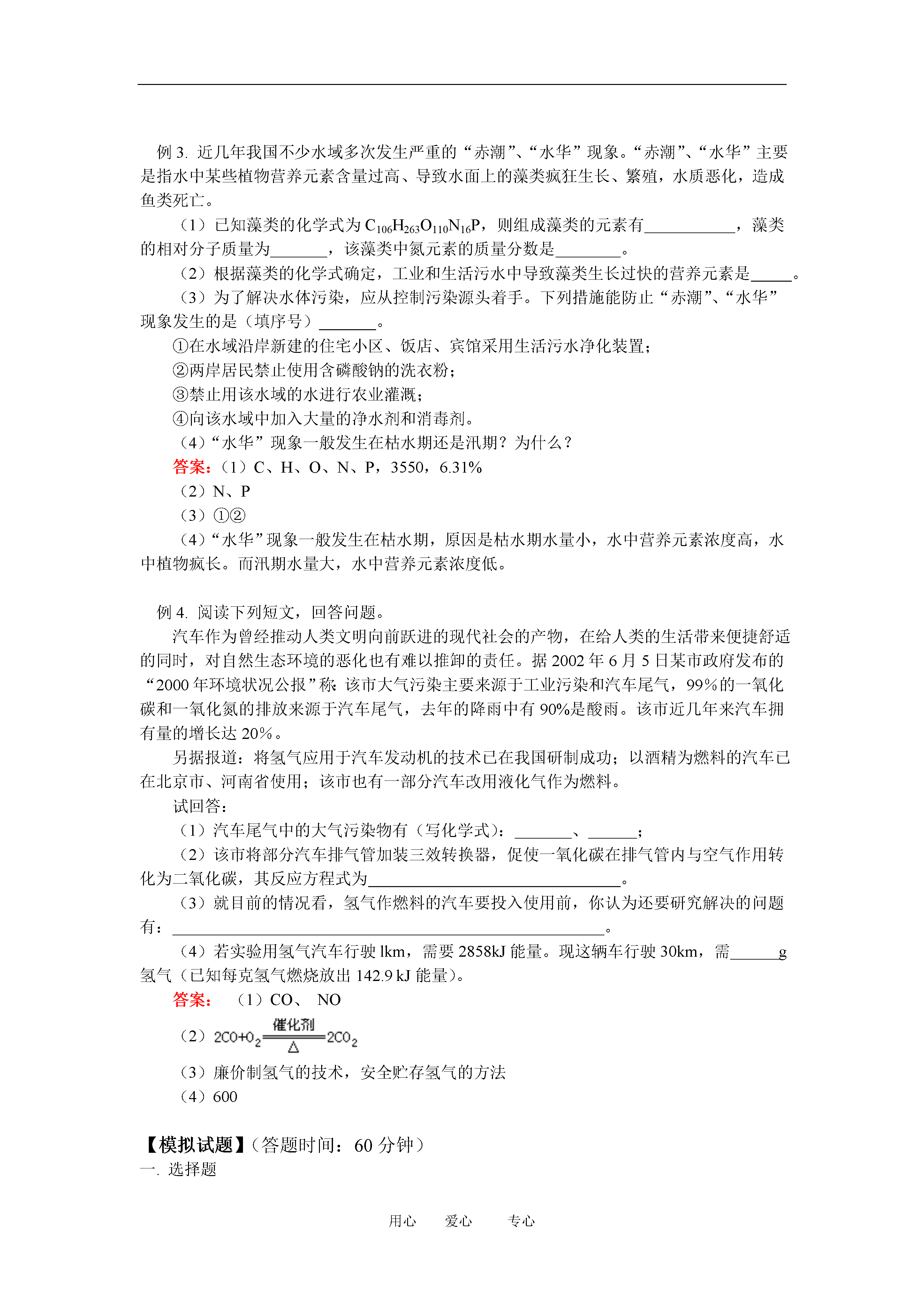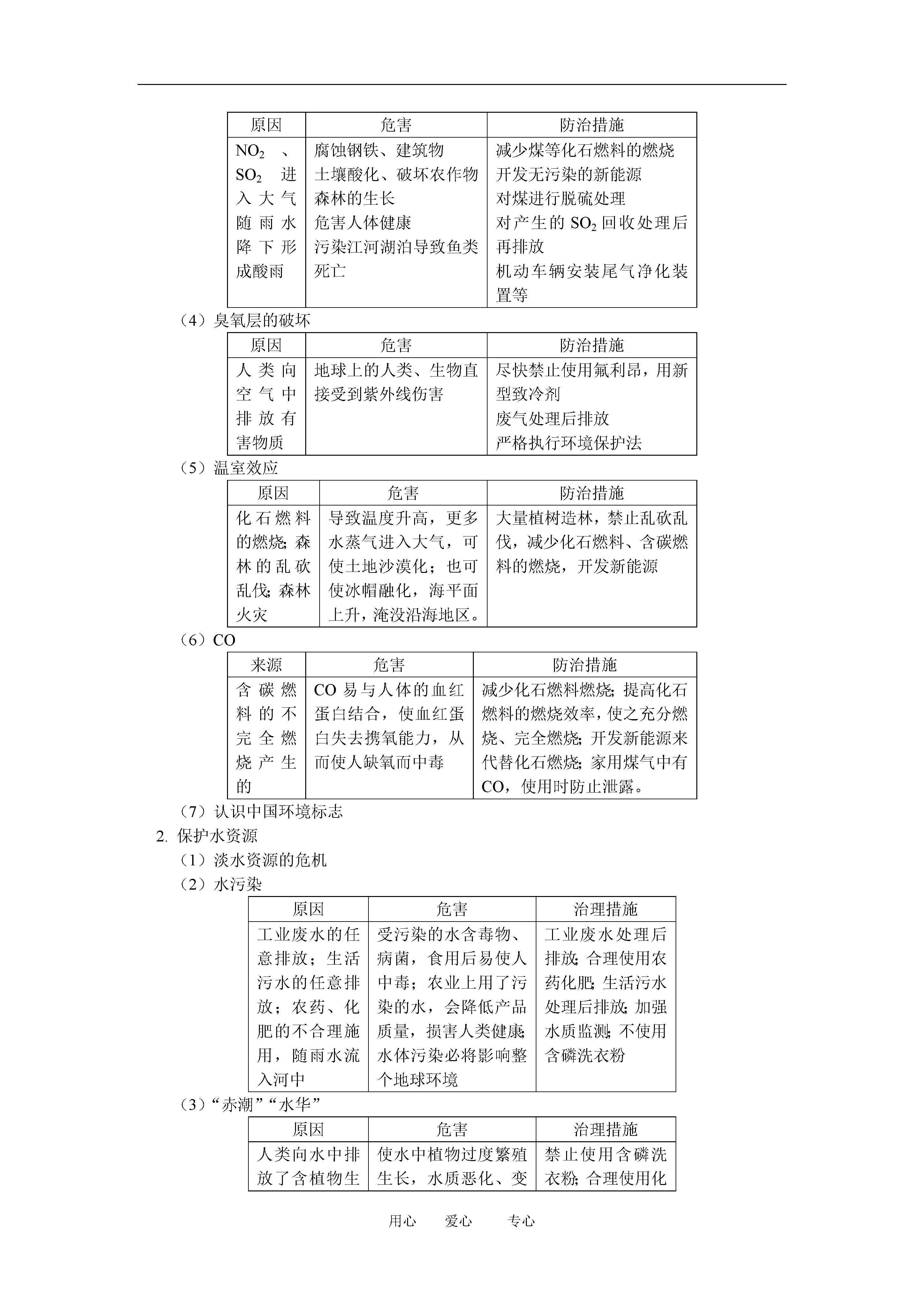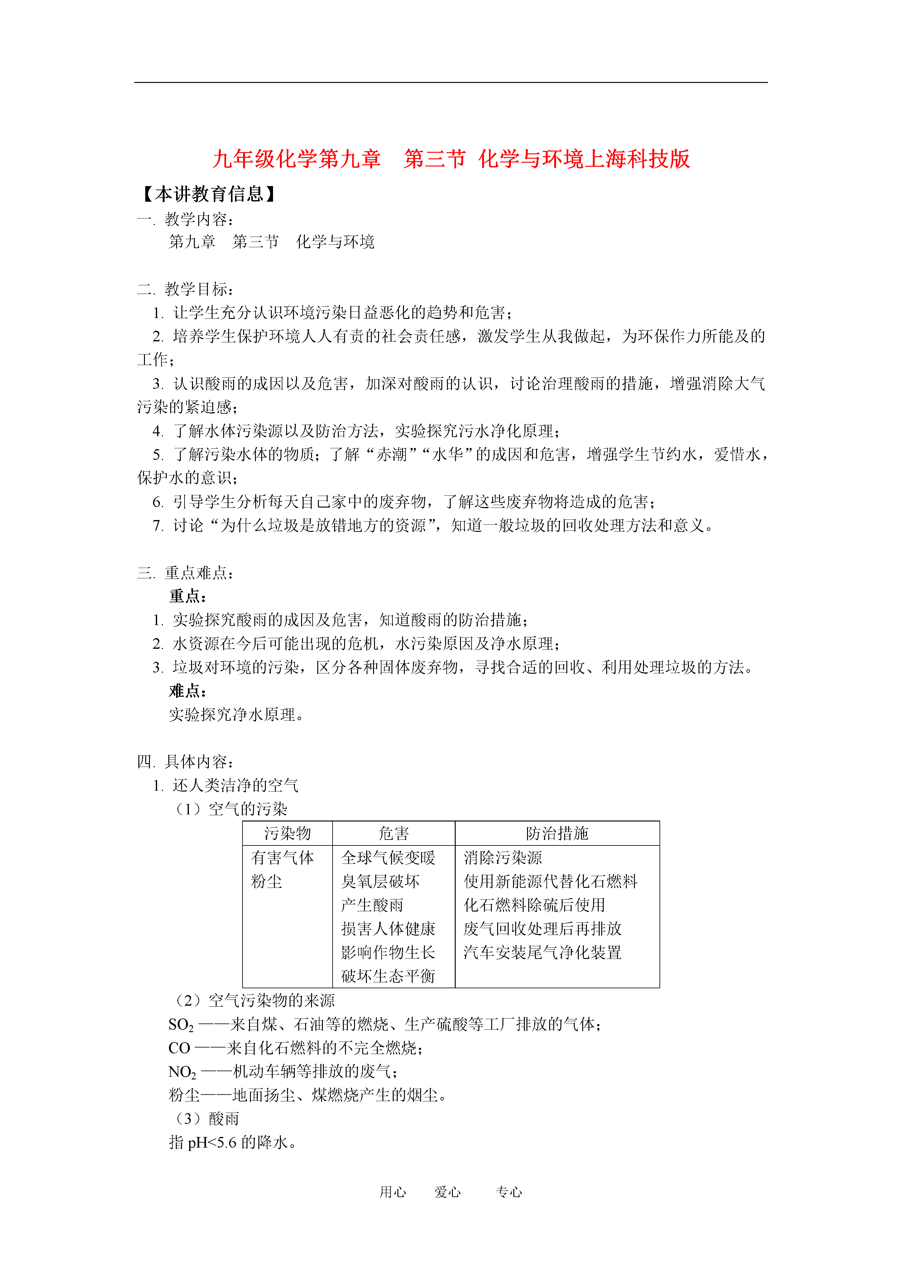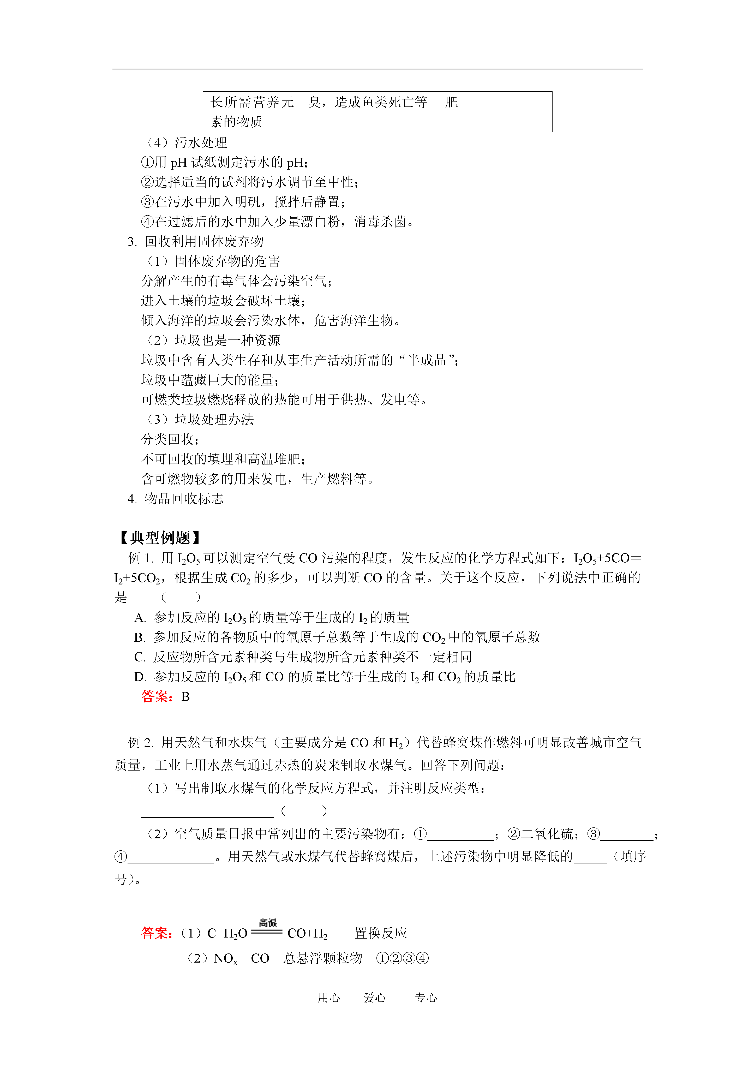 用心爱心专心九年级化学第九章第三节化学与环境上海科技版【本讲教育信息】一.教学内容:第九章第三节化学与环境二.教学目标:1.让学生充分认识环境污染日益恶化的趋势和危害;2.培养学生保护环境人人有责的社会责任感,激发学生从我做起,为环保作力所能及的工作;3.认识酸雨的成因以及危害,加深对酸雨的认识,讨论治理酸雨的措施,增强消除大气污染的紧迫感;4.了解水体污染源以及防治方法,实验探究污水净化原理;5.了解污染水体的物质;了解“赤潮”“水华”的成因和危害,增强学生节约水,爱惜水,保护水的意识;6.引导学生分析每天自己家中的废弃物,了解这些废弃物将造成的危害;7.讨论“为什么垃圾是放错地方的资源”,知道一般垃圾的回收处理方法和意义。三.重点难点:重点:1.实验探究酸雨的成因及危害,知道酸雨的防治措施;2.水资源在今后可能出现的危机,水污染原因及净水原理;3.垃圾对环境的污染,区分各种固体废弃物,寻找合适的回收、利用处理垃圾的方法。难点:实验探究净水原理。四.具体内容:1.还人类洁净的空气(1)空气的污染污染物危害防治措施有害气体粉尘全球气候变暖臭氧层破坏产生酸雨损害人体健康影响作物生长破坏生态平衡消除污染源使用新能源代替化石燃料化石燃料除硫后使用废气回收处理后再排放汽车安装尾气净化装置(2)空气污染物的来源SO2——来自煤、石油等的燃烧、生产硫酸等工厂排放的气体;CO——来自化石燃料的不完全燃烧;NO2——机动车辆等排放的废气;粉尘——地面扬尘、煤燃烧产生的烟尘。(3)酸雨指pH<5.6的降水。原因危害防治措施NO2、SO2进入大气随雨水降下形成酸雨腐蚀钢铁、建筑物土壤酸化、破坏农作物森林的生长危害人体健康污染江河湖泊导致鱼类死亡减少煤等化石燃料的燃烧开发无污染的新能源对煤进行脱硫处理对产生的SO2回收处理后再排放机动车辆安装尾气净化装置等(4)臭氧层的破坏原因危害防治措施人类向空气中排放有害物质地球上的人类、生物直接受到紫外线伤害尽快禁止使用氟利昂,用新型致冷剂废气处理后排放严格执行环境保护法(5)温室效应原因危害防治措施化石燃料的燃烧;森林的乱砍乱伐;森林火灾导致温度升高,更多水蒸气进入大气,可使土地沙漠化;也可使冰帽融化,海平面上升,淹没沿海地区。大量植树造林,禁止乱砍乱伐,减少化石燃料、含碳燃料的燃烧,开发新能源(6)CO来源危害防治措施含碳燃料的不完全燃烧产生的CO易与人体的血红蛋白结合,使血红蛋白失去携氧能力,从而使人缺氧而中毒减少化石燃料燃烧;提高化石燃料的燃烧效率,使之充分燃烧、完全燃烧;开发新能源来代替化石燃烧;家用煤气中有CO,使用时防止泄露。(7)认识中国环境标志2.保护水资源(1)淡水资源的危机(2)水污染原因危害治理措施工业废水的任意排放;生活污水的任意排放;农药、化肥的不合理施用,随雨水流入河中受污染的水含毒物、病菌,食用后易使人中毒;农业上用了污染的水,会降低产品质量,损害人类健康;水体污染必将影响整个地球环境工业废水处理后排放;合理使用农药化肥;生活污水处理后排放;加强水质监测;不使用含磷洗衣粉(3)“赤潮”“水华”原因危害治理措施人类向水中排放了含植物生长所需营养元素的物质使水中植物过度繁殖生长,水质恶化、变臭,造成鱼类死亡等禁止使用含磷洗衣粉;合理使用化肥(4)污水处理①用pH试纸测定污水的pH;②选择适当的试剂将污水调节至中性;③在污水中加入明矾,搅拌后静置;④在过滤后的水中加入少量漂白粉,消毒杀菌。3.回收利用固体废弃物(1)固体废弃物的危害分解产生的有毒气体会污染空气;进入土壤的垃圾会破坏土壤;倾入海洋的垃圾会污染水体,危害海洋生物。(2)垃圾也是一种资源垃圾中含有人类生存和从事生产活动所需的“半成品”;垃圾中蕴藏巨大的能量;可燃类垃圾燃烧释放的热能可用于供热、发电等。(3)垃圾处理办法分类回收;不可回收的填埋和高温堆肥;含可燃物较多的用来发电,生产燃料等。4.物品回收标志【典型例题】例1.用I2O5可以测定空气受CO污染的程度,发生反应的化学方程式如下:I2O5+5CO=I2+5CO2,根据生成C02的多少,可以判断CO的含量。关于这个反应,下列说法中正确的是()A.参加反应的I2O5的质量等于生成的I2的质量B.参加反应的各物质中的氧原子总数等于生成的CO2中的氧原子总数C.反应物所含元素种类与生成物所含元素种类不一定相同D.参加反应的I2O5和CO的质量比等于生成的I2和CO2的质量比答案:B例2.用天然气和水煤气(主要成分是CO和H2)代替蜂窝煤作燃料可明显改善城市空气质量,工业上用水蒸气通过赤热