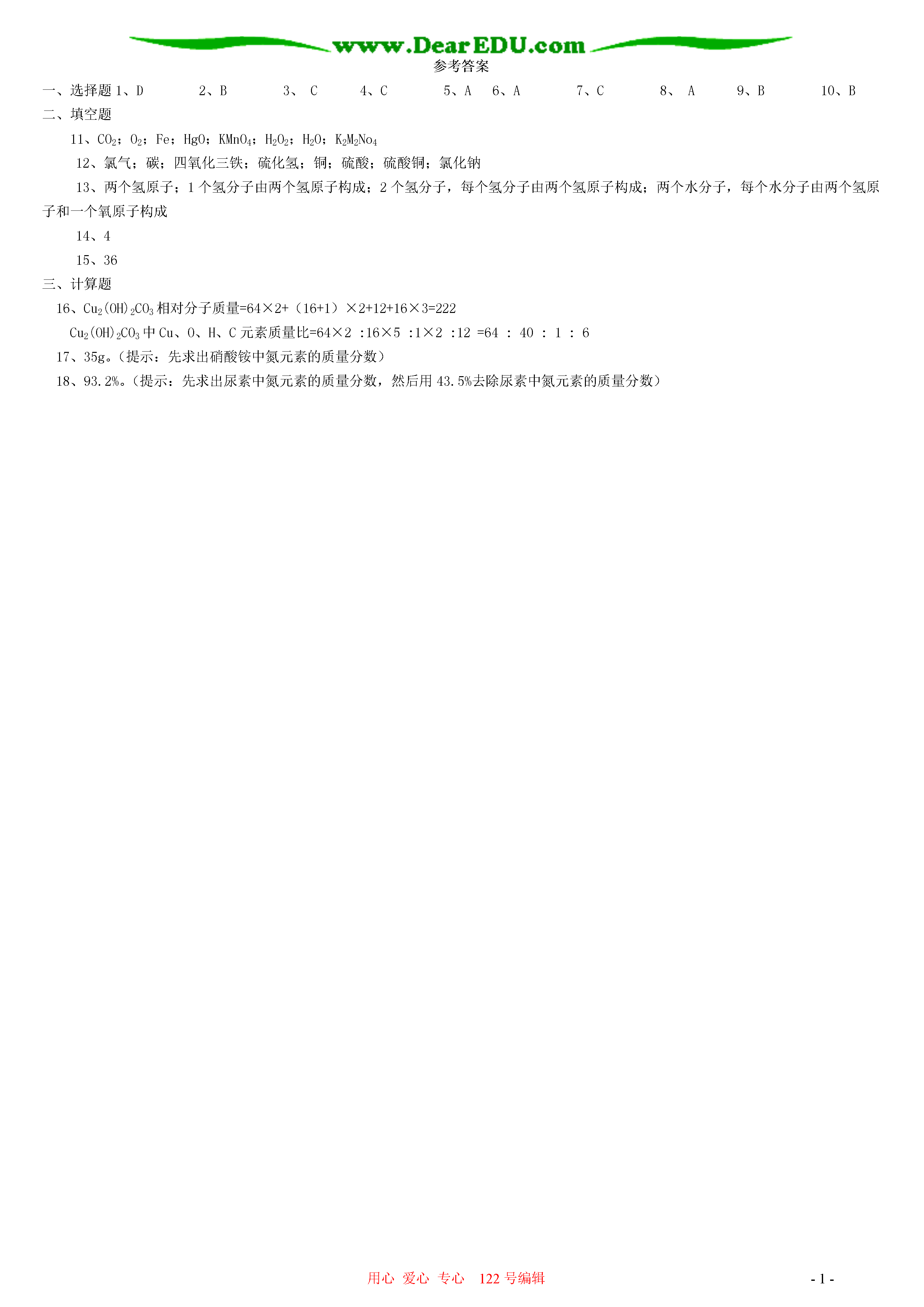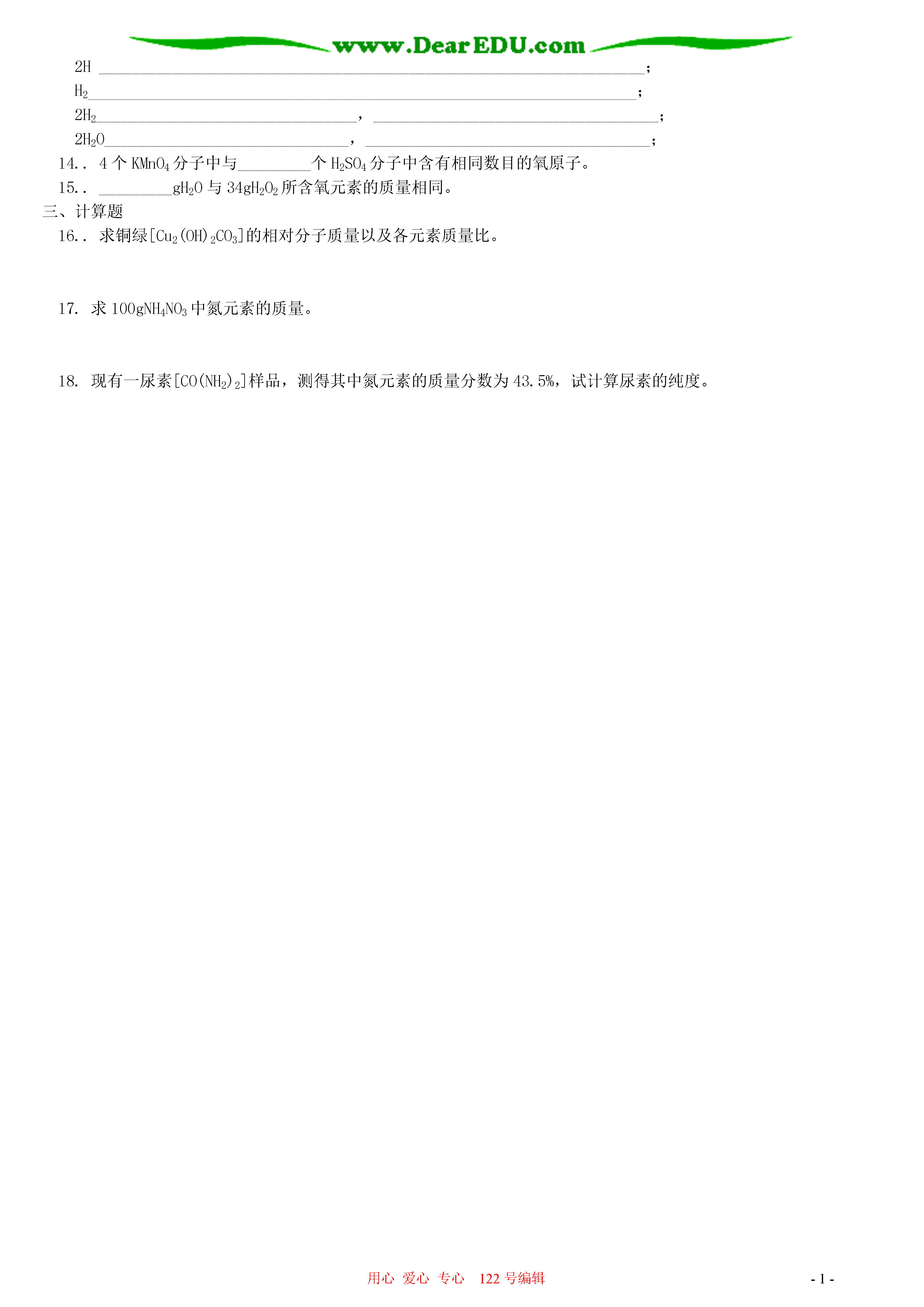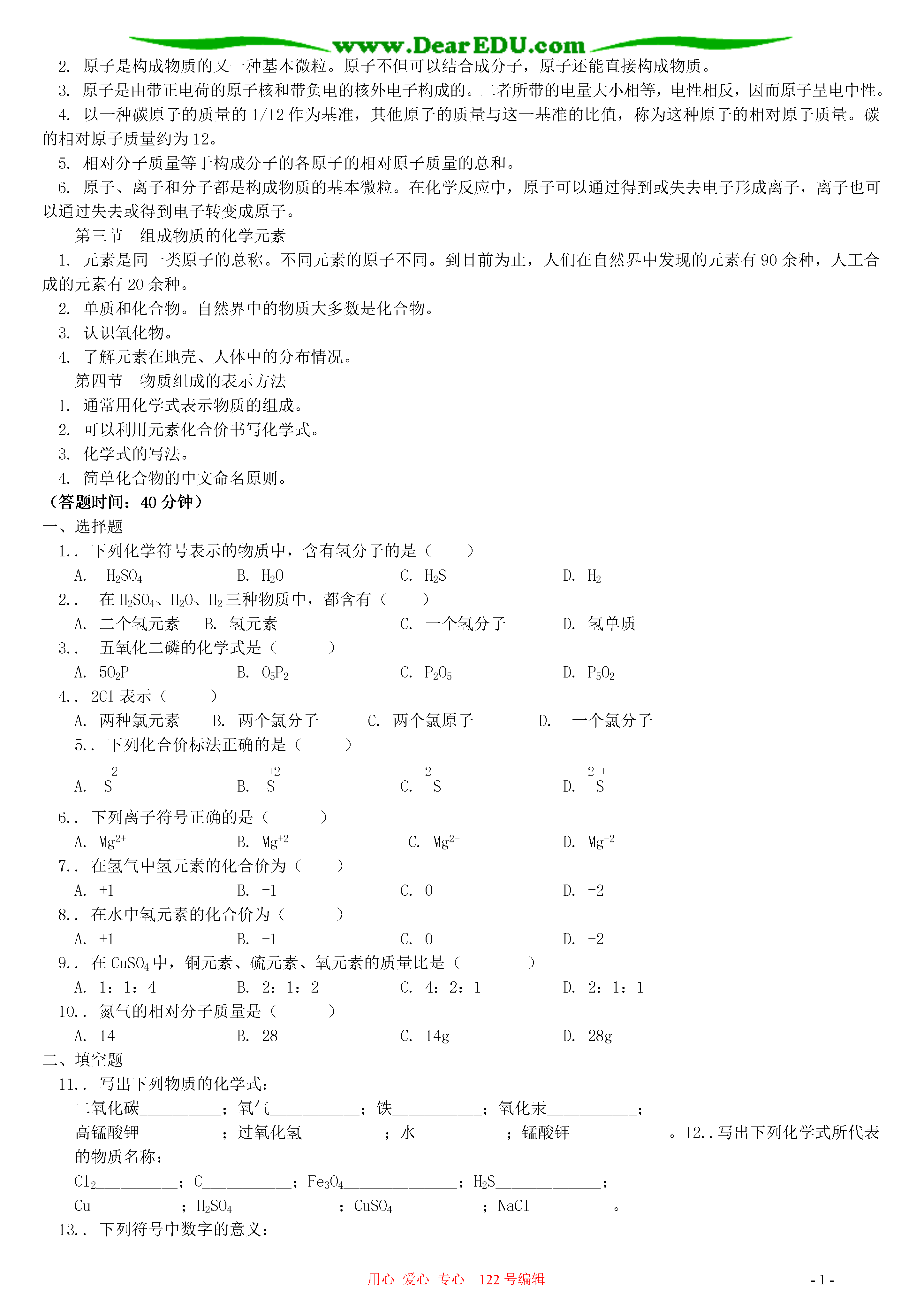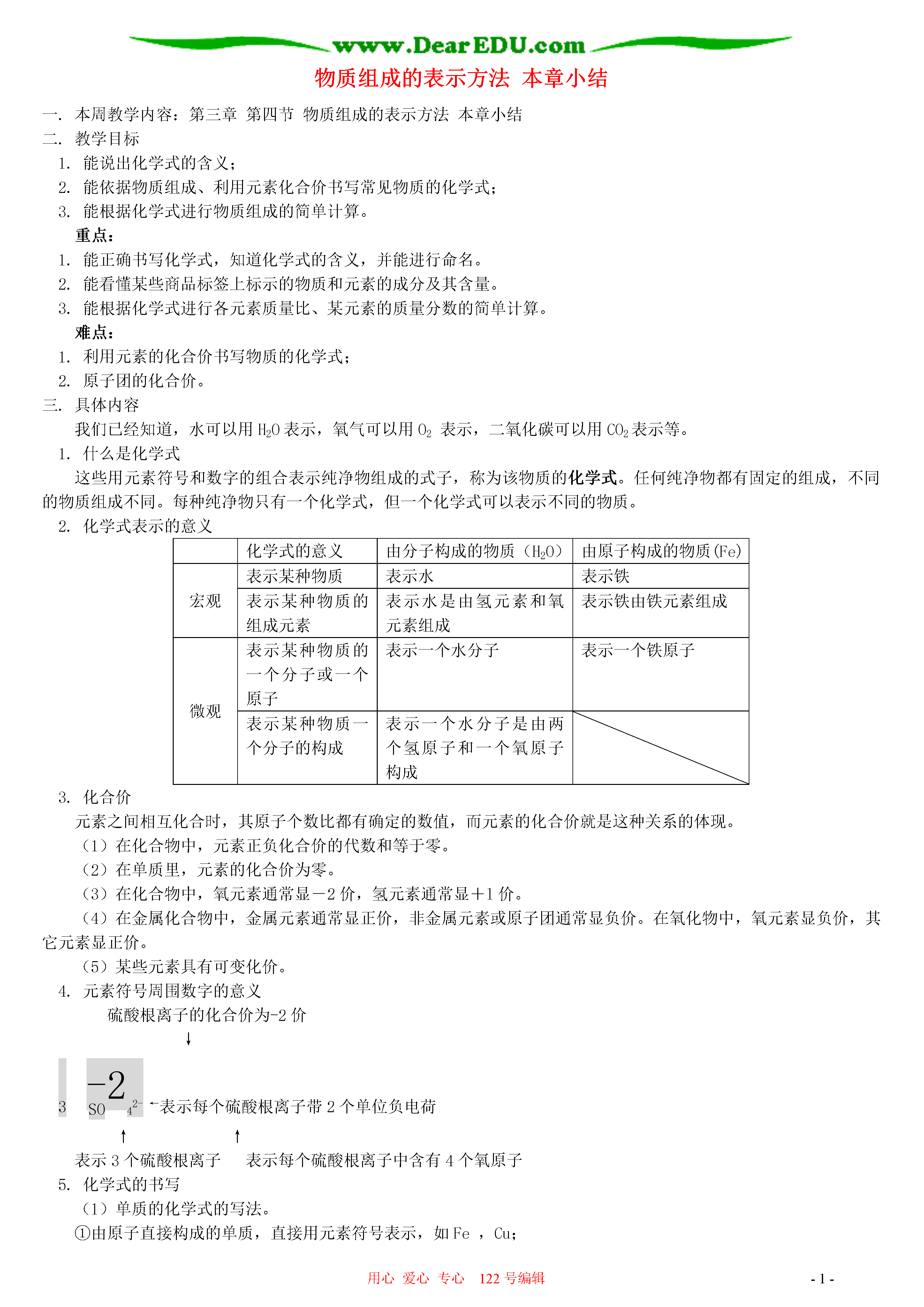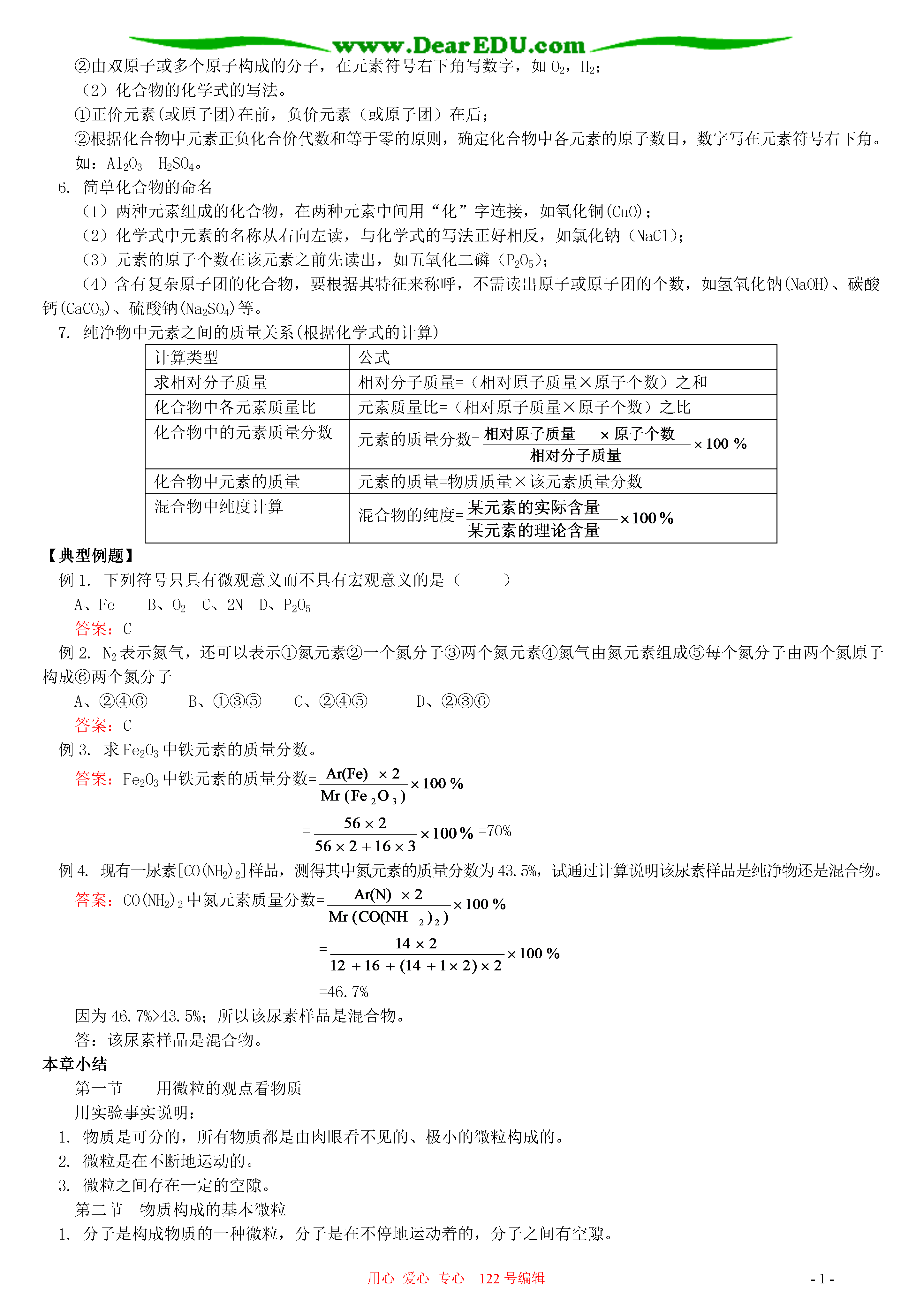 用心爱心专心122号编辑-1-物质组成的表示方法本章小结一.本周教学内容:第三章第四节物质组成的表示方法本章小结二.教学目标1.能说出化学式的含义;2.能依据物质组成、利用元素化合价书写常见物质的化学式;3.能根据化学式进行物质组成的简单计算。重点:1.能正确书写化学式,知道化学式的含义,并能进行命名。2.能看懂某些商品标签上标示的物质和元素的成分及其含量。3.能根据化学式进行各元素质量比、某元素的质量分数的简单计算。难点:1.利用元素的化合价书写物质的化学式;2.原子团的化合价。三.具体内容我们已经知道,水可以用H2O表示,氧气可以用O2表示,二氧化碳可以用CO2表示等。1.什么是化学式这些用元素符号和数字的组合表示纯净物组成的式子,称为该物质的化学式。任何纯净物都有固定的组成,不同的物质组成不同。每种纯净物只有一个化学式,但一个化学式可以表示不同的物质。2.化学式表示的意义化学式的意义由分子构成的物质(H2O)由原子构成的物质(Fe)宏观表示某种物质表示水表示铁表示某种物质的组成元素表示水是由氢元素和氧元素组成表示铁由铁元素组成微观表示某种物质的一个分子或一个原子表示一个水分子表示一个铁原子表示某种物质一个分子的构成表示一个水分子是由两个氢原子和一个氧原子构成3.化合价元素之间相互化合时,其原子个数比都有确定的数值,而元素的化合价就是这种关系的体现。(1)在化合物中,元素正负化合价的代数和等于零。(2)在单质里,元素的化合价为零。(3)在化合物中,氧元素通常显-2价,氢元素通常显+l价。(4)在金属化合物中,金属元素通常显正价,非金属元素或原子团通常显负价。在氧化物中,氧元素显负价,其它元素显正价。(5)某些元素具有可变化价。4.元素符号周围数字的意义硫酸根离子的化合价为-2价↓342-←表示每个硫酸根离子带2个单位负电荷↑↑表示3个硫酸根离子表示每个硫酸根离子中含有4个氧原子5.化学式的书写(1)单质的化学式的写法。①由原子直接构成的单质,直接用元素符号表示,如Fe,Cu;②由双原子或多个原子构成的分子,在元素符号右下角写数字,如O2,H2;(2)化合物的化学式的写法。①正价元素(或原子团)在前,负价元素(或原子团)在后;②根据化合物中元素正负化合价代数和等于零的原则,确定化合物中各元素的原子数目,数字写在元素符号右下角。如:Al2O3H2SO4。6.简单化合物的命名(1)两种元素组成的化合物,在两种元素中间用“化”字连接,如氧化铜(CuO);(2)化学式中元素的名称从右向左读,与化学式的写法正好相反,如氯化钠(NaCl);(3)元素的原子个数在该元素之前先读出,如五氧化二磷(P2O5);(4)含有复杂原子团的化合物,要根据其特征来称呼,不需读出原子或原子团的个数,如氢氧化钠(NaOH)、碳酸钙(CaCO3)、硫酸钠(Na2SO4)等。7.纯净物中元素之间的质量关系(根据化学式的计算)计算类型公式求相对分子质量相对分子质量=(相对原子质量×原子个数)之和化合物中各元素质量比元素质量比=(相对原子质量×原子个数)之比化合物中的元素质量分数元素的质量分数=化合物中元素的质量元素的质量=物质质量×该元素质量分数混合物中纯度计算混合物的纯度=【典型例题】例1.下列符号只具有微观意义而不具有宏观意义的是()A、FeB、O2C、2ND、P2O5答案:C例2.N2表示氮气,还可以表示①氮元素②一个氮分子③两个氮元素④氮气由氮元素组成⑤每个氮分子由两个氮原子构成⑥两个氮分子A、②④⑥B、①③⑤C、②④⑤D、②③⑥答案:C例3.求Fe2O3中铁元素的质量分数。答案:Fe2O3中铁元素的质量分数===70%例4.现有一尿素[CO(NH2)2]样品,测得其中氮元素的质量分数为43.5%,试通过计算说明该尿素样品是纯净物还是混合物。答案:CO(NH2)2中氮元素质量分数===46.7%因为46.7%>43.5%;所以该尿素样品是混合物。答:该尿素样品是混合物。本章小结第一节用微粒的观点看物质用实验事实说明:1.物质是可分的,所有物质都是由肉眼看不见的、极小的微粒构成的。2.微粒是在不断地运动的。3.微粒之间存在一定的空隙。第二节物质构成的基本微粒1.分子是构成物质的一种微粒,分子是在不停地运动着的,分子之间有空隙。2.原子是构成物质的又一种基本微粒。原子不但可以结合成分子,原子还能直接构成物质。3.原子是由带正电荷的原子核和带负电的核外电子构成的。二者所带的电量大小相等,电性相反,因而原子呈电中性。4.以一种碳原子的质量的1/12作为基准,其他原子的质量与这一基准的比值,称为这种原子的相对原子质量。碳