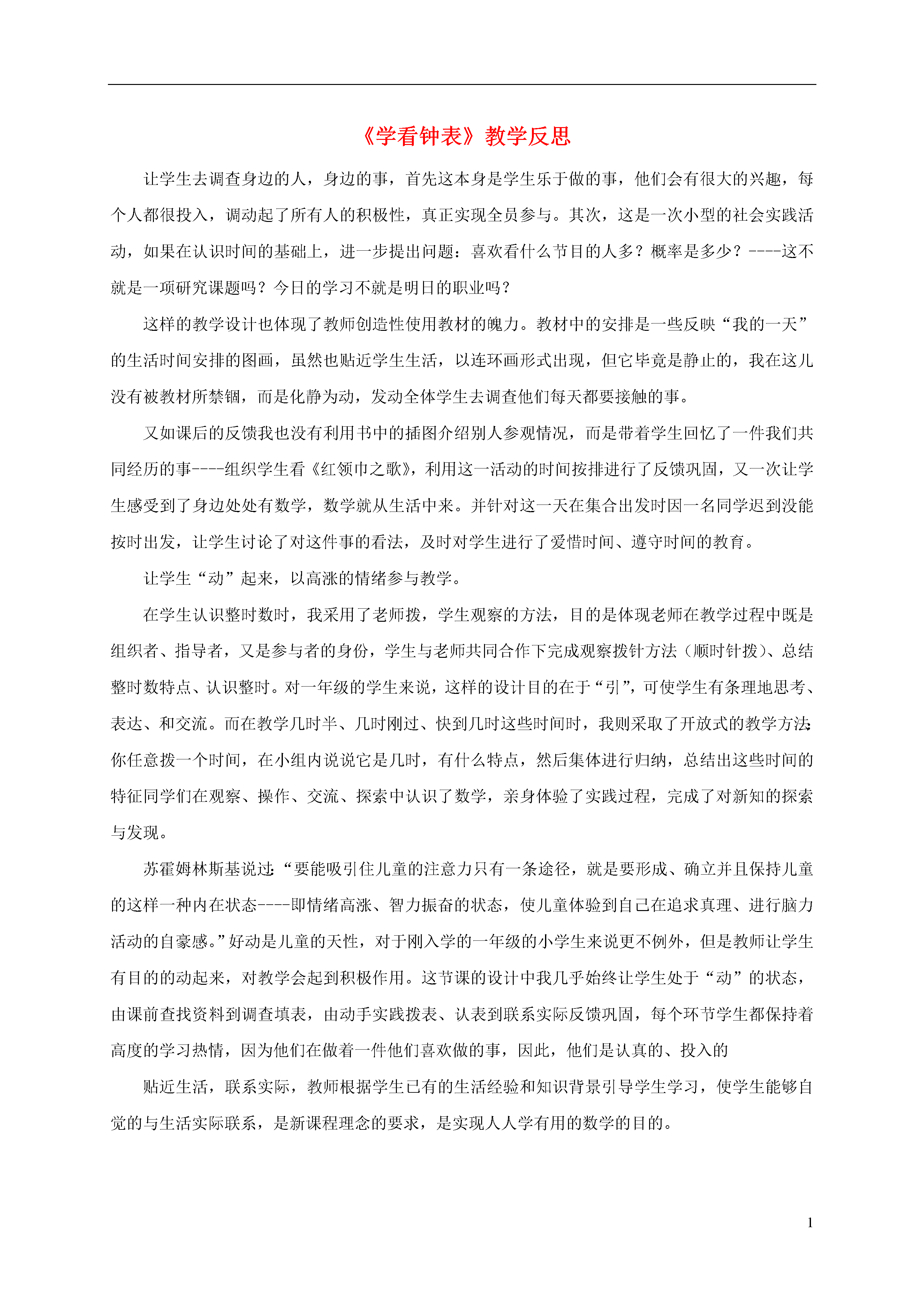 1《学看钟表》教学反思让学生去调查身边的人,身边的事,首先这本身是学生乐于做的事,他们会有很大的兴趣,每个人都很投入,调动起了所有人的积极性,真正实现全员参与。其次,这是一次小型的社会实践活动,如果在认识时间的基础上,进一步提出问题:喜欢看什么节目的人多?概率是多少?----这不就是一项研究课题吗?今日的学习不就是明日的职业吗?这样的教学设计也体现了教师创造性使用教材的魄力。教材中的安排是一些反映“我的一天”的生活时间安排的图画,虽然也贴近学生生活,以连环画形式出现,但它毕竟是静止的,我在这儿没有被教材所禁锢,而是化静为动,发动全体学生去调查他们每天都要接触的事。又如课后的反馈我也没有利用书中的插图介绍别人参观情况,而是带着学生回忆了一件我们共同经历的事----组织学生看《红领巾之歌》,利用这一活动的时间按排进行了反馈巩固,又一次让学生感受到了身边处处有数学,数学就从生活中来。并针对这一天在集合出发时因一名同学迟到没能按时出发,让学生讨论了对这件事的看法,及时对学生进行了爱惜时间、遵守时间的教育。让学生“动”起来,以高涨的情绪参与教学。在学生认识整时数时,我采用了老师拨,学生观察的方法,目的是体现老师在教学过程中既是组织者、指导者,又是参与者的身份,学生与老师共同合作下完成观察拨针方法(顺时针拨)、总结整时数特点、认识整时。对一年级的学生来说,这样的设计目的在于“引”,可使学生有条理地思考、表达、和交流。而在教学几时半、几时刚过、快到几时这些时间时,我则采取了开放式的教学方法:你任意拨一个时间,在小组内说说它是几时,有什么特点,然后集体进行归纳,总结出这些时间的特征同学们在观察、操作、交流、探索中认识了数学,亲身体验了实践过程,完成了对新知的探索与发现。苏霍姆林斯基说过:“要能吸引住儿童的注意力只有一条途径,就是要形成、确立并且保持儿童的这样一种内在状态----即情绪高涨、智力振奋的状态,使儿童体验到自己在追求真理、进行脑力活动的自豪感。”好动是儿童的天性,对于刚入学的一年级的小学生来说更不例外,但是教师让学生有目的的动起来,对教学会起到积极作用。这节课的设计中我几乎始终让学生处于“动”的状态,由课前查找资料到调查填表,由动手实践拨表、认表到联系实际反馈巩固,每个环节学生都保持着高度的学习热情,因为他们在做着一件他们喜欢做的事,因此,他们是认真的、投入的贴近生活,联系实际,教师根据学生已有的生活经验和知识背景引导学生学习,使学生能够自觉的与生活实际联系,是新课程理念的要求,是实现人人学有用的数学的目的。