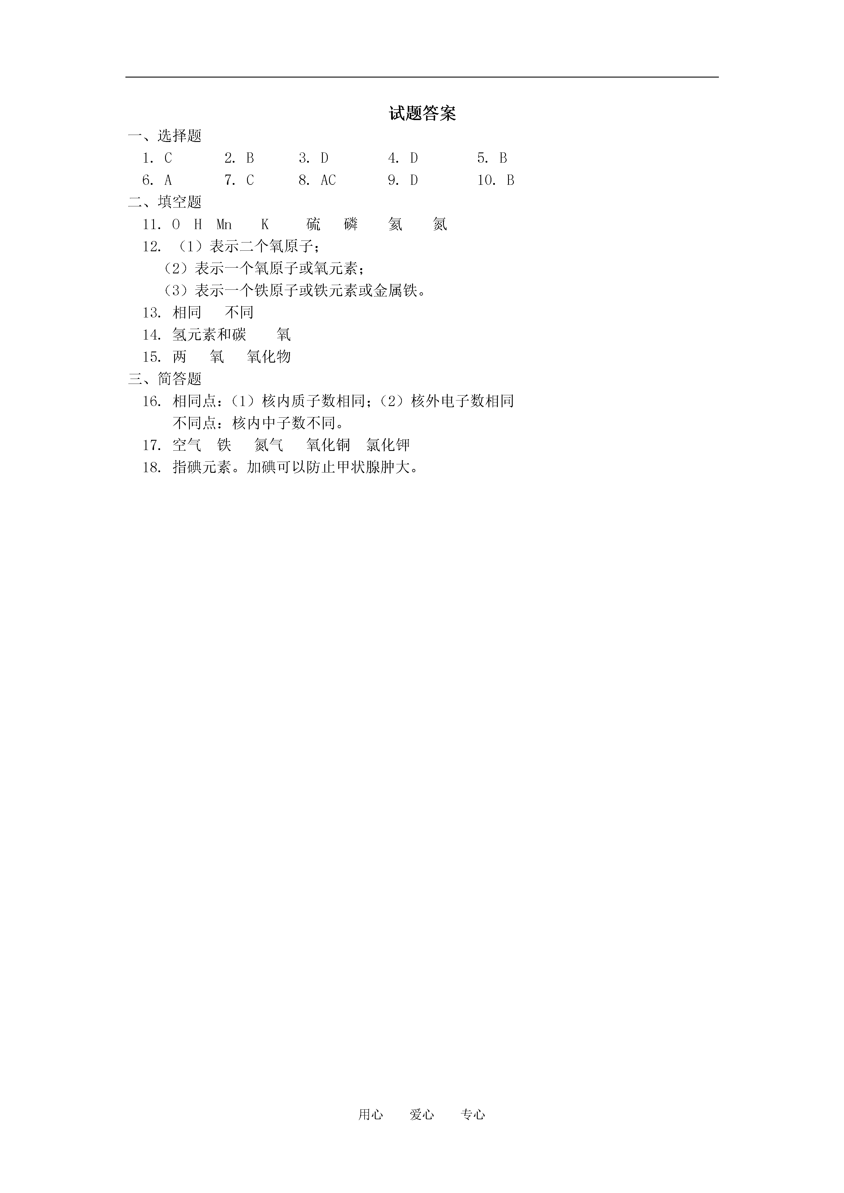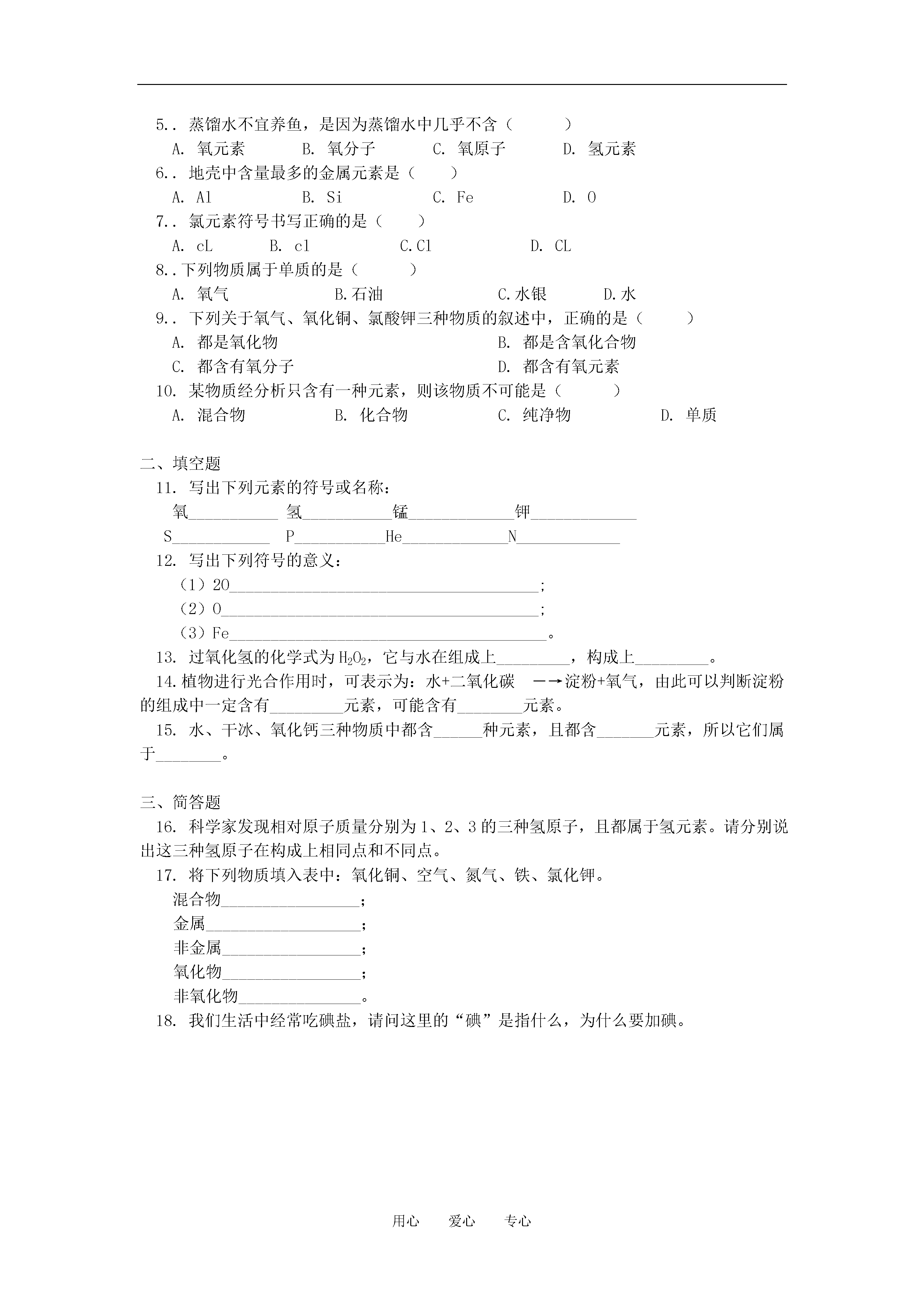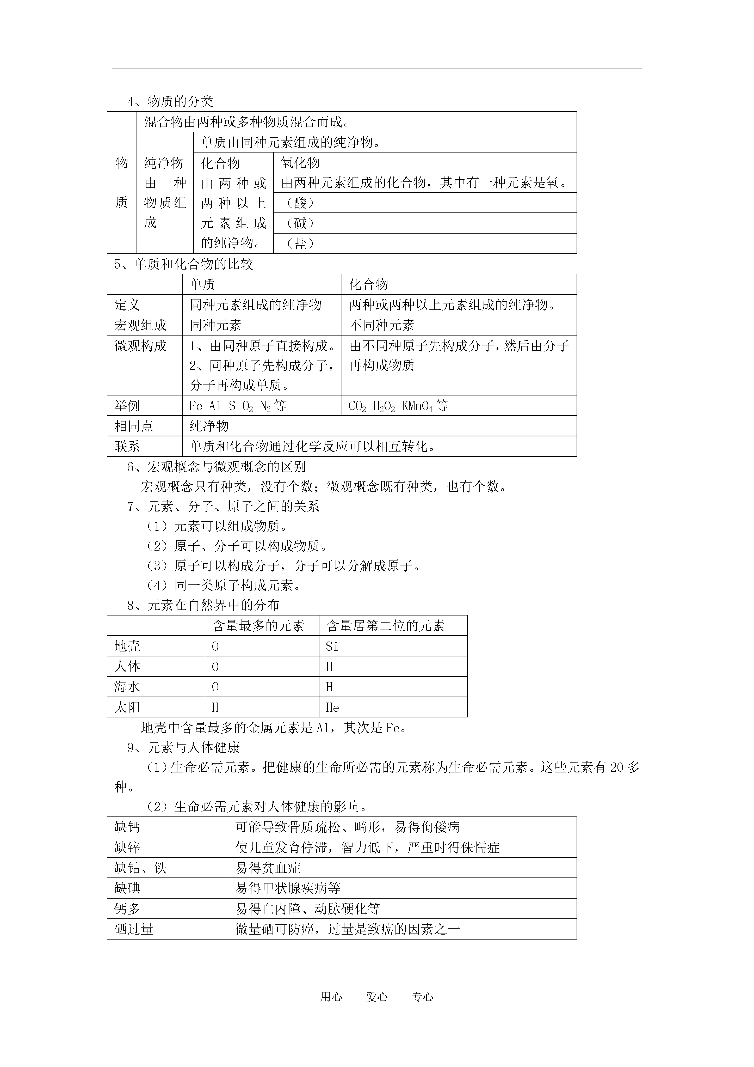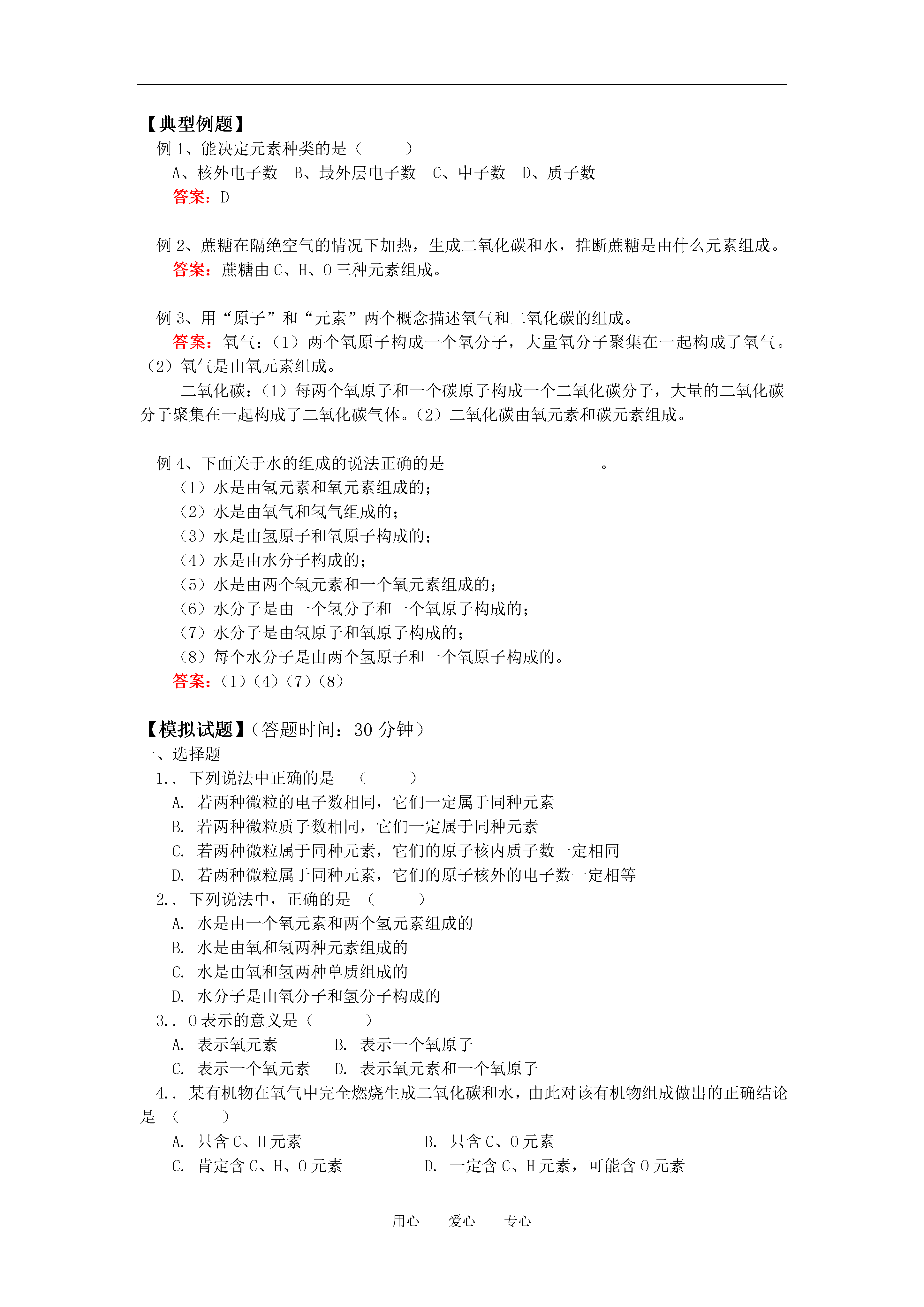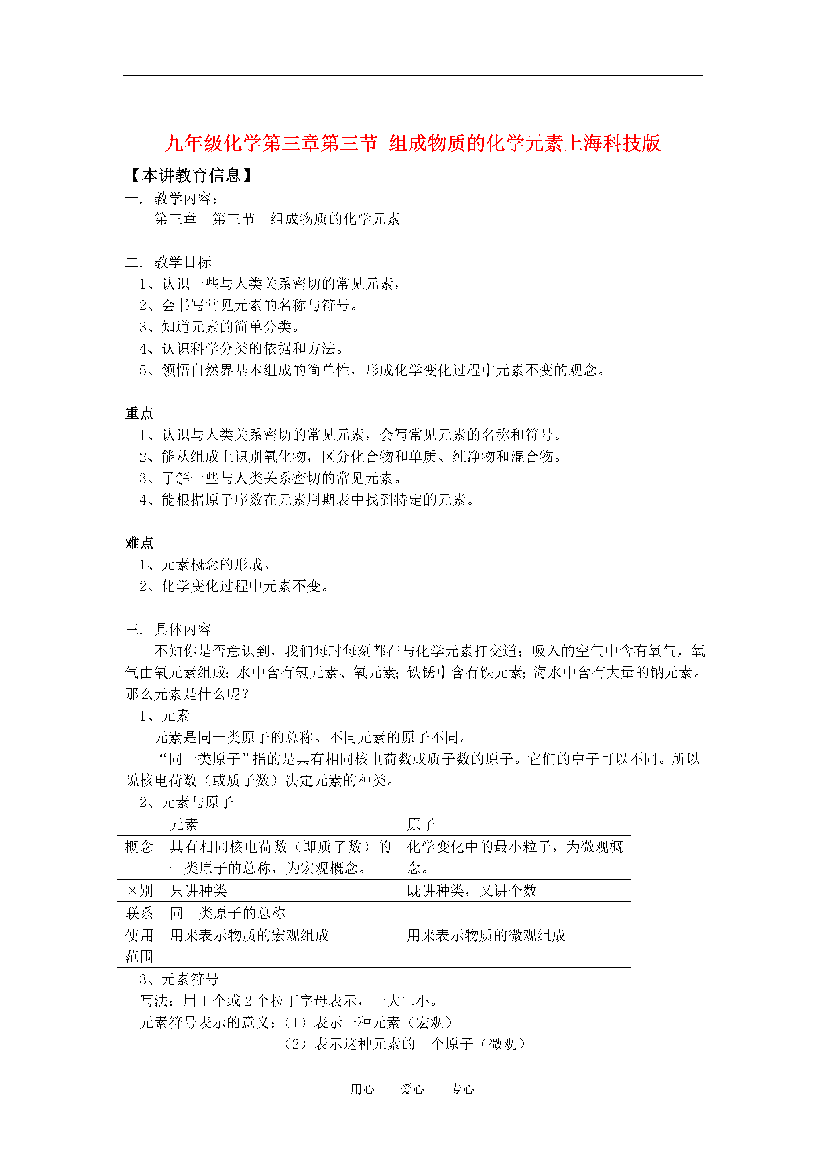 用心爱心专心九年级化学第三章第三节组成物质的化学元素上海科技版【本讲教育信息】一.教学内容:第三章第三节组成物质的化学元素二.教学目标1、认识一些与人类关系密切的常见元素,2、会书写常见元素的名称与符号。3、知道元素的简单分类。4、认识科学分类的依据和方法。5、领悟自然界基本组成的简单性,形成化学变化过程中元素不变的观念。重点1、认识与人类关系密切的常见元素,会写常见元素的名称和符号。2、能从组成上识别氧化物,区分化合物和单质、纯净物和混合物。3、了解一些与人类关系密切的常见元素。4、能根据原子序数在元素周期表中找到特定的元素。难点1、元素概念的形成。2、化学变化过程中元素不变。三.具体内容不知你是否意识到,我们每时每刻都在与化学元素打交道;吸入的空气中含有氧气,氧气由氧元素组成;水中含有氢元素、氧元素;铁锈中含有铁元素;海水中含有大量的钠元素。那么元素是什么呢?1、元素元素是同一类原子的总称。不同元素的原子不同。“同一类原子”指的是具有相同核电荷数或质子数的原子。它们的中子可以不同。所以说核电荷数(或质子数)决定元素的种类。2、元素与原子元素原子概念具有相同核电荷数(即质子数)的一类原子的总称,为宏观概念。化学变化中的最小粒子,为微观概念。区别只讲种类既讲种类,又讲个数联系同一类原子的总称使用范围用来表示物质的宏观组成用来表示物质的微观组成3、元素符号写法:用1个或2个拉丁字母表示,一大二小。元素符号表示的意义:(1)表示一种元素(宏观)(2)表示这种元素的一个原子(微观)4、物质的分类物质混合物由两种或多种物质混合而成。纯净物由一种物质组成单质由同种元素组成的纯净物。化合物由两种或两种以上元素组成的纯净物。氧化物由两种元素组成的化合物,其中有一种元素是氧。(酸)(碱)(盐)5、单质和化合物的比较单质化合物定义同种元素组成的纯净物两种或两种以上元素组成的纯净物。宏观组成同种元素不同种元素微观构成1、由同种原子直接构成。2、同种原子先构成分子,分子再构成单质。由不同种原子先构成分子,然后由分子再构成物质举例FeAlSO2N2等CO2H2O2KMnO4等相同点纯净物联系单质和化合物通过化学反应可以相互转化。6、宏观概念与微观概念的区别宏观概念只有种类,没有个数;微观概念既有种类,也有个数。7、元素、分子、原子之间的关系(1)元素可以组成物质。(2)原子、分子可以构成物质。(3)原子可以构成分子,分子可以分解成原子。(4)同一类原子构成元素。8、元素在自然界中的分布含量最多的元素含量居第二位的元素地壳OSi人体OH海水OH太阳HHe地壳中含量最多的金属元素是Al,其次是Fe。9、元素与人体健康(1)生命必需元素。把健康的生命所必需的元素称为生命必需元素。这些元素有20多种。(2)生命必需元素对人体健康的影响。缺钙可能导致骨质疏松、畸形,易得佝偻病缺锌使儿童发育停滞,智力低下,严重时得侏懦症缺钴、铁易得贫血症缺碘易得甲状腺疾病等钙多易得白内障、动脉硬化等硒过量微量硒可防癌,过量是致癌的因素之一【典型例题】例1、能决定元素种类的是()A、核外电子数B、最外层电子数C、中子数D、质子数答案:D例2、蔗糖在隔绝空气的情况下加热,生成二氧化碳和水,推断蔗糖是由什么元素组成。答案:蔗糖由C、H、O三种元素组成。例3、用“原子”和“元素”两个概念描述氧气和二氧化碳的组成。答案:氧气:(1)两个氧原子构成一个氧分子,大量氧分子聚集在一起构成了氧气。(2)氧气是由氧元素组成。二氧化碳:(1)每两个氧原子和一个碳原子构成一个二氧化碳分子,大量的二氧化碳分子聚集在一起构成了二氧化碳气体。(2)二氧化碳由氧元素和碳元素组成。例4、下面关于水的组成的说法正确的是___________________。(1)水是由氢元素和氧元素组成的;(2)水是由氧气和氢气组成的;(3)水是由氢原子和氧原子构成的;(4)水是由水分子构成的;(5)水是由两个氢元素和一个氧元素组成的;(6)水分子是由一个氢分子和一个氧原子构成的;(7)水分子是由氢原子和氧原子构成的;(8)每个水分子是由两个氢原子和一个氧原子构成的。答案:(1)(4)(7)(8)【模拟试题】(答题时间:30分钟)一、选择题1..下列说法中正确的是()A.若两种微粒的电子数相同,它们一定属于同种元素B.若两种微粒质子数相同,它们一定属于同种元素C.若两种微粒属于同种元素,它们的原子核内质子数一定相同D.若两种微粒属于同种元素,它们的原子核外的电子数一定相等2..下列说法中,正确的是()A.水是由一个氧元素和两个氢元素组成的B.水是由