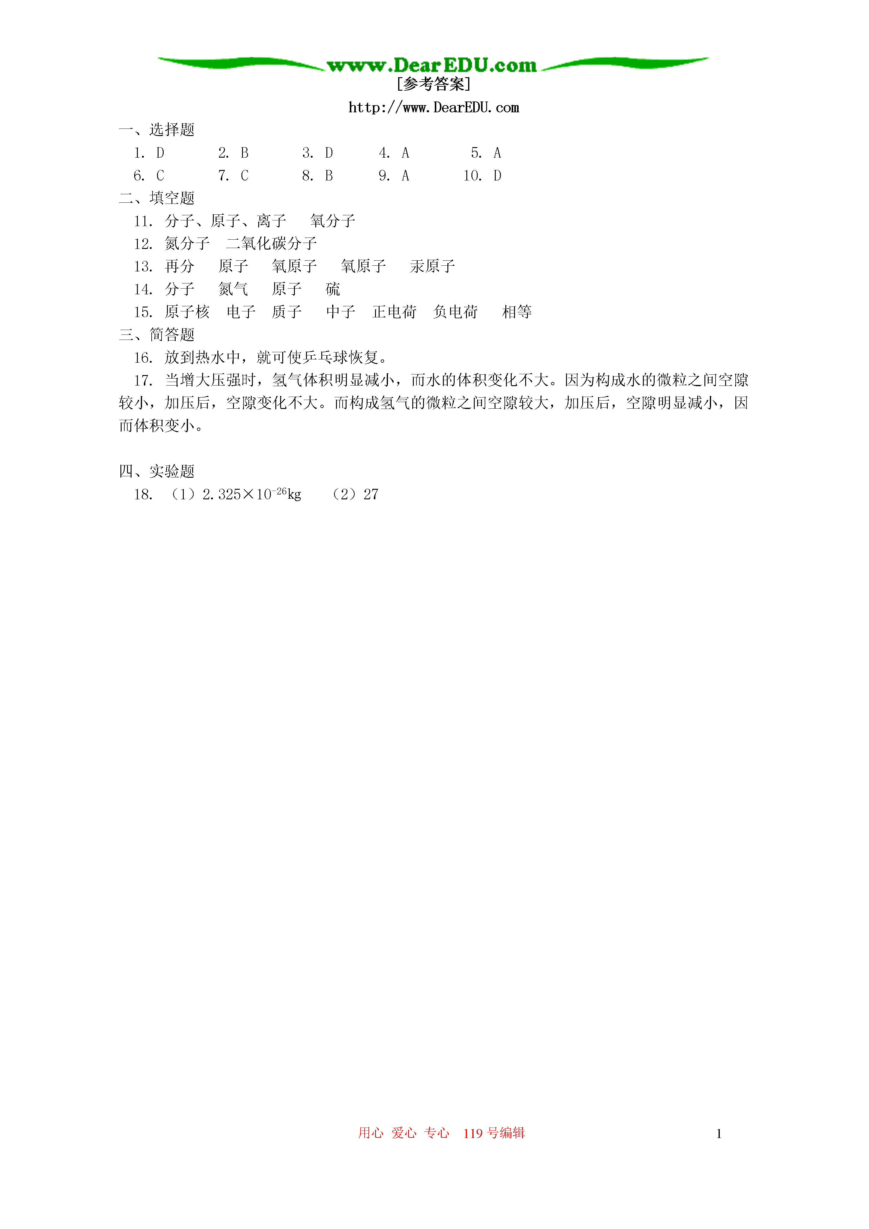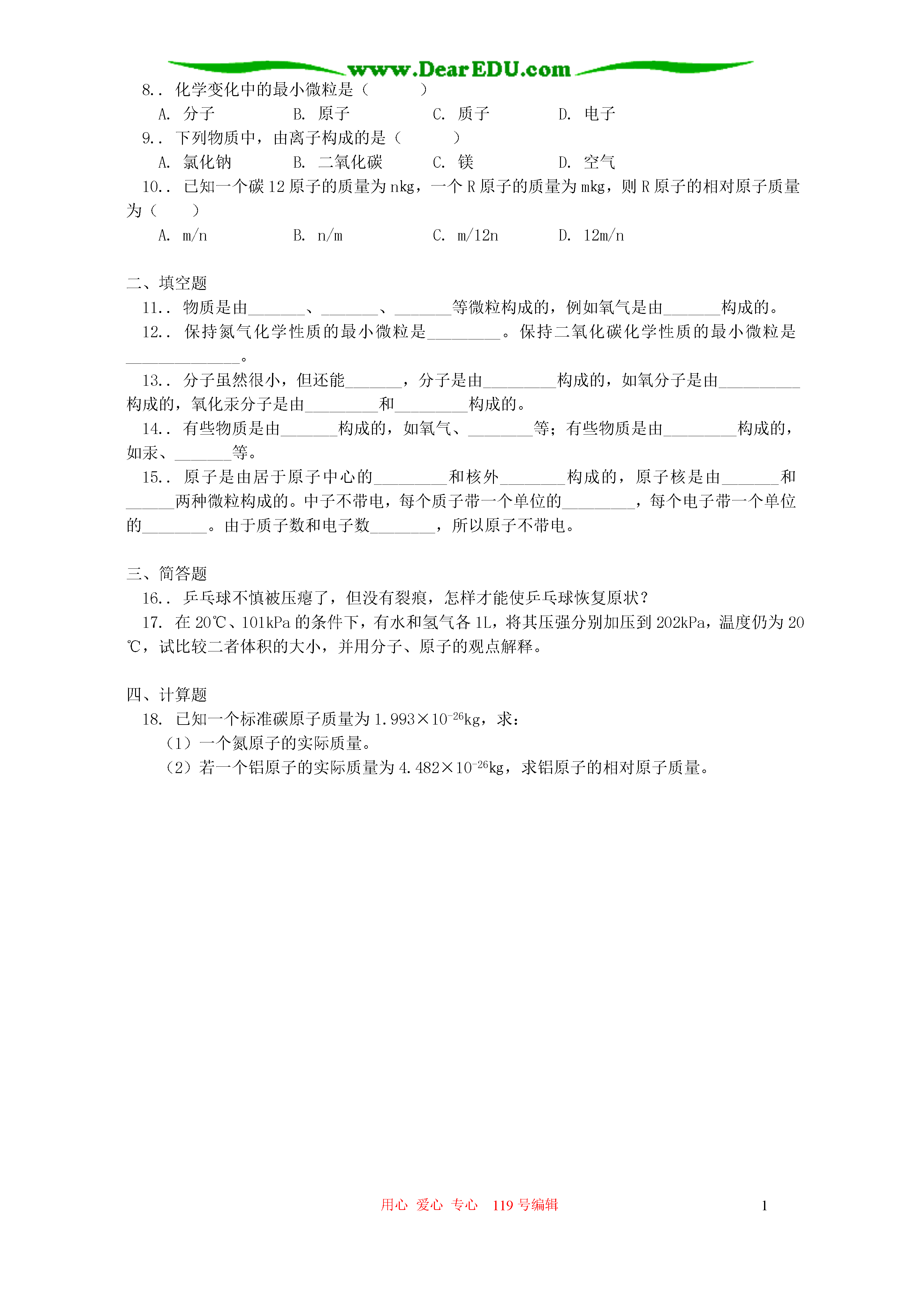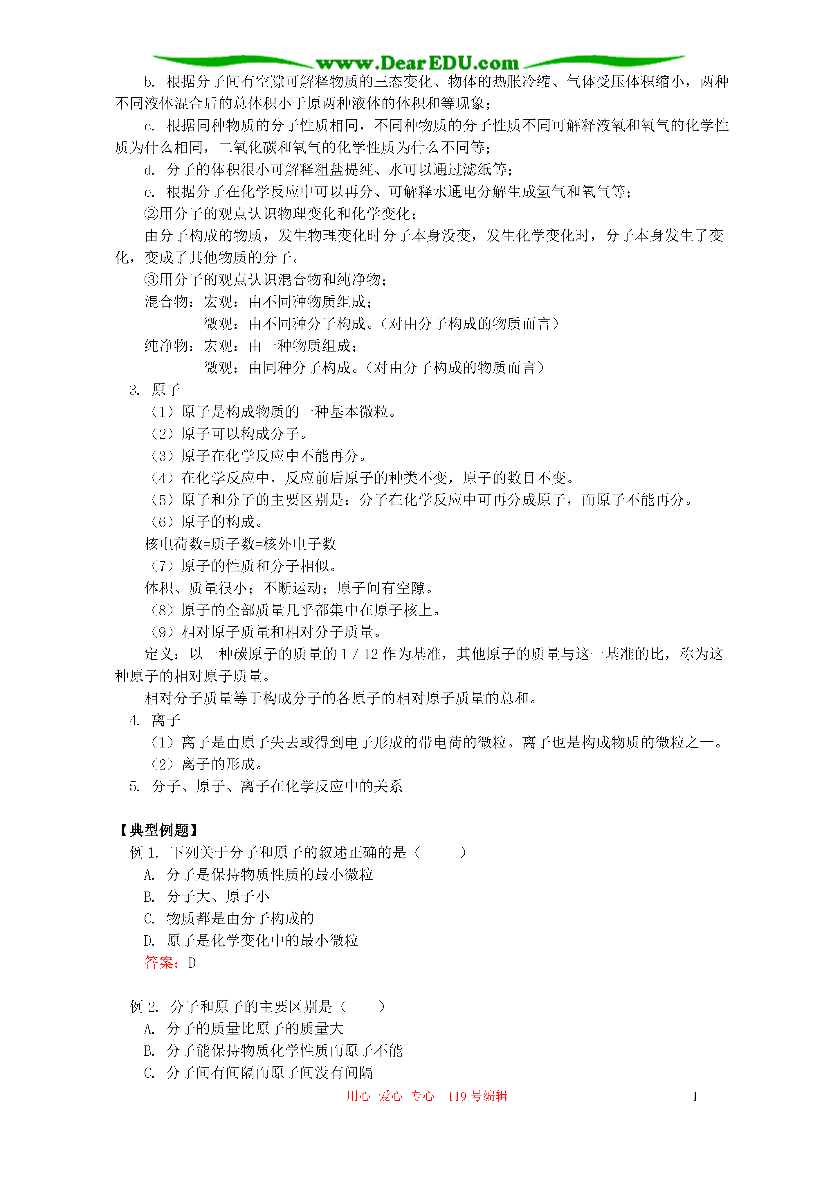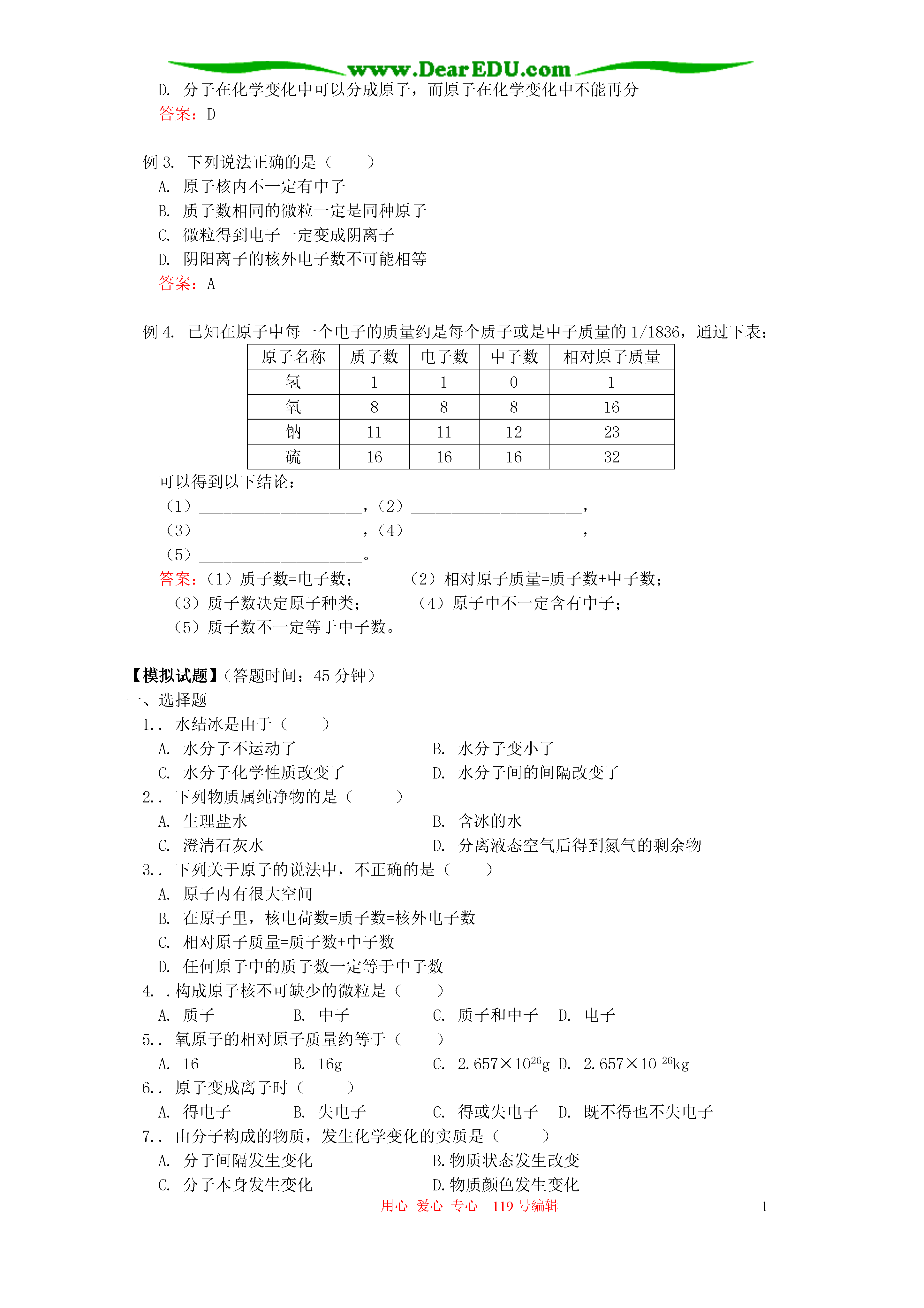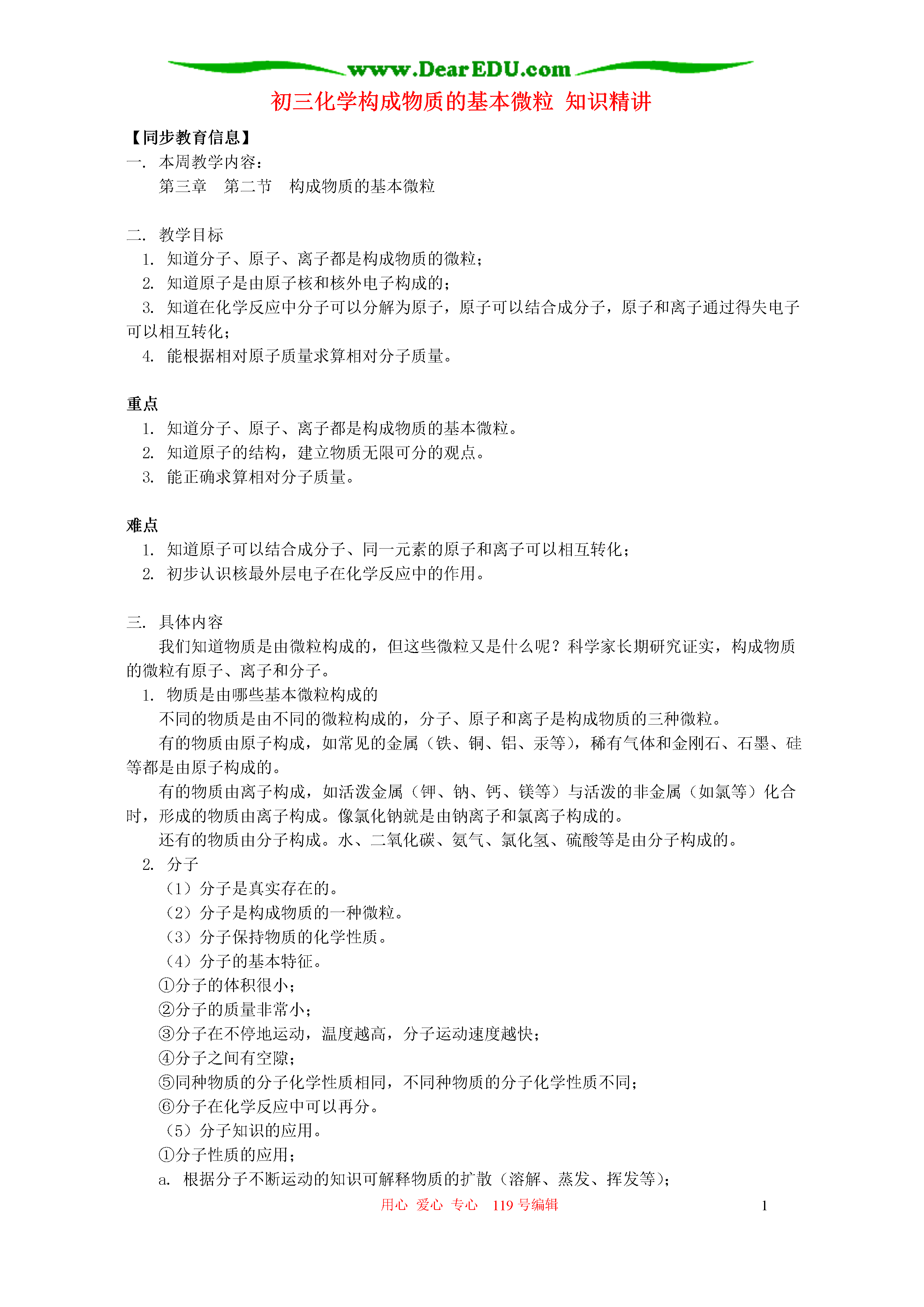 用心爱心专心119号编辑1初三化学构成物质的基本微粒知识精讲【同步教育信息】一.本周教学内容:第三章第二节构成物质的基本微粒二.教学目标1.知道分子、原子、离子都是构成物质的微粒;2.知道原子是由原子核和核外电子构成的;3.知道在化学反应中分子可以分解为原子,原子可以结合成分子,原子和离子通过得失电子可以相互转化;4.能根据相对原子质量求算相对分子质量。重点1.知道分子、原子、离子都是构成物质的基本微粒。2.知道原子的结构,建立物质无限可分的观点。3.能正确求算相对分子质量。难点1.知道原子可以结合成分子、同一元素的原子和离子可以相互转化;2.初步认识核最外层电子在化学反应中的作用。三.具体内容我们知道物质是由微粒构成的,但这些微粒又是什么呢?科学家长期研究证实,构成物质的微粒有原子、离子和分子。1.物质是由哪些基本微粒构成的不同的物质是由不同的微粒构成的,分子、原子和离子是构成物质的三种微粒。有的物质由原子构成,如常见的金属(铁、铜、铝、汞等),稀有气体和金刚石、石墨、硅等都是由原子构成的。有的物质由离子构成,如活泼金属(钾、钠、钙、镁等)与活泼的非金属(如氯等)化合时,形成的物质由离子构成。像氯化钠就是由钠离子和氯离子构成的。还有的物质由分子构成。水、二氧化碳、氨气、氯化氢、硫酸等是由分子构成的。2.分子(1)分子是真实存在的。(2)分子是构成物质的一种微粒。(3)分子保持物质的化学性质。(4)分子的基本特征。①分子的体积很小;②分子的质量非常小;③分子在不停地运动,温度越高,分子运动速度越快;④分子之间有空隙;⑤同种物质的分子化学性质相同,不同种物质的分子化学性质不同;⑥分子在化学反应中可以再分。(5)分子知识的应用。①分子性质的应用;a.根据分子不断运动的知识可解释物质的扩散(溶解、蒸发、挥发等);b.根据分子间有空隙可解释物质的三态变化、物体的热胀冷缩、气体受压体积缩小,两种不同液体混合后的总体积小于原两种液体的体积和等现象;c.根据同种物质的分子性质相同,不同种物质的分子性质不同可解释液氧和氧气的化学性质为什么相同,二氧化碳和氧气的化学性质为什么不同等;d.分子的体积很小可解释粗盐提纯、水可以通过滤纸等;e.根据分子在化学反应中可以再分、可解释水通电分解生成氢气和氧气等;②用分子的观点认识物理变化和化学变化;由分子构成的物质,发生物理变化时分子本身没变,发生化学变化时,分子本身发生了变化,变成了其他物质的分子。③用分子的观点认识混合物和纯净物;混合物:宏观:由不同种物质组成;微观:由不同种分子构成。(对由分子构成的物质而言)纯净物:宏观:由一种物质组成;微观:由同种分子构成。(对由分子构成的物质而言)3.原子(1)原子是构成物质的一种基本微粒。(2)原子可以构成分子。(3)原子在化学反应中不能再分。(4)在化学反应中,反应前后原子的种类不变,原子的数目不变。(5)原子和分子的主要区别是:分子在化学反应中可再分成原子,而原子不能再分。(6)原子的构成。核电荷数=质子数=核外电子数(7)原子的性质和分子相似。体积、质量很小;不断运动;原子间有空隙。(8)原子的全部质量几乎都集中在原子核上。(9)相对原子质量和相对分子质量。定义:以一种碳原子的质量的l/12作为基准,其他原子的质量与这一基准的比,称为这种原子的相对原子质量。相对分子质量等于构成分子的各原子的相对原子质量的总和。4.离子(1)离子是由原子失去或得到电子形成的带电荷的微粒。离子也是构成物质的微粒之一。(2)离子的形成。5.分子、原子、离子在化学反应中的关系【典型例题】例1.下列关于分子和原子的叙述正确的是()A.分子是保持物质性质的最小微粒B.分子大、原子小C.物质都是由分子构成的D.原子是化学变化中的最小微粒答案:D例2.分子和原子的主要区别是()A.分子的质量比原子的质量大B.分子能保持物质化学性质而原子不能C.分子间有间隔而原子间没有间隔D.分子在化学变化中可以分成原子,而原子在化学变化中不能再分答案:D例3.下列说法正确的是()A.原子核内不一定有中子B.质子数相同的微粒一定是同种原子C.微粒得到电子一定变成阴离子D.阴阳离子的核外电子数不可能相等答案:A例4.已知在原子中每一个电子的质量约是每个质子或是中子质量的1/1836,通过下表:原子名称质子数电子数中子数相对原子质量氢1101氧88816钠11111223硫16161632可以得到以下结论:(1)____________________,(2)_____________________,(3)__