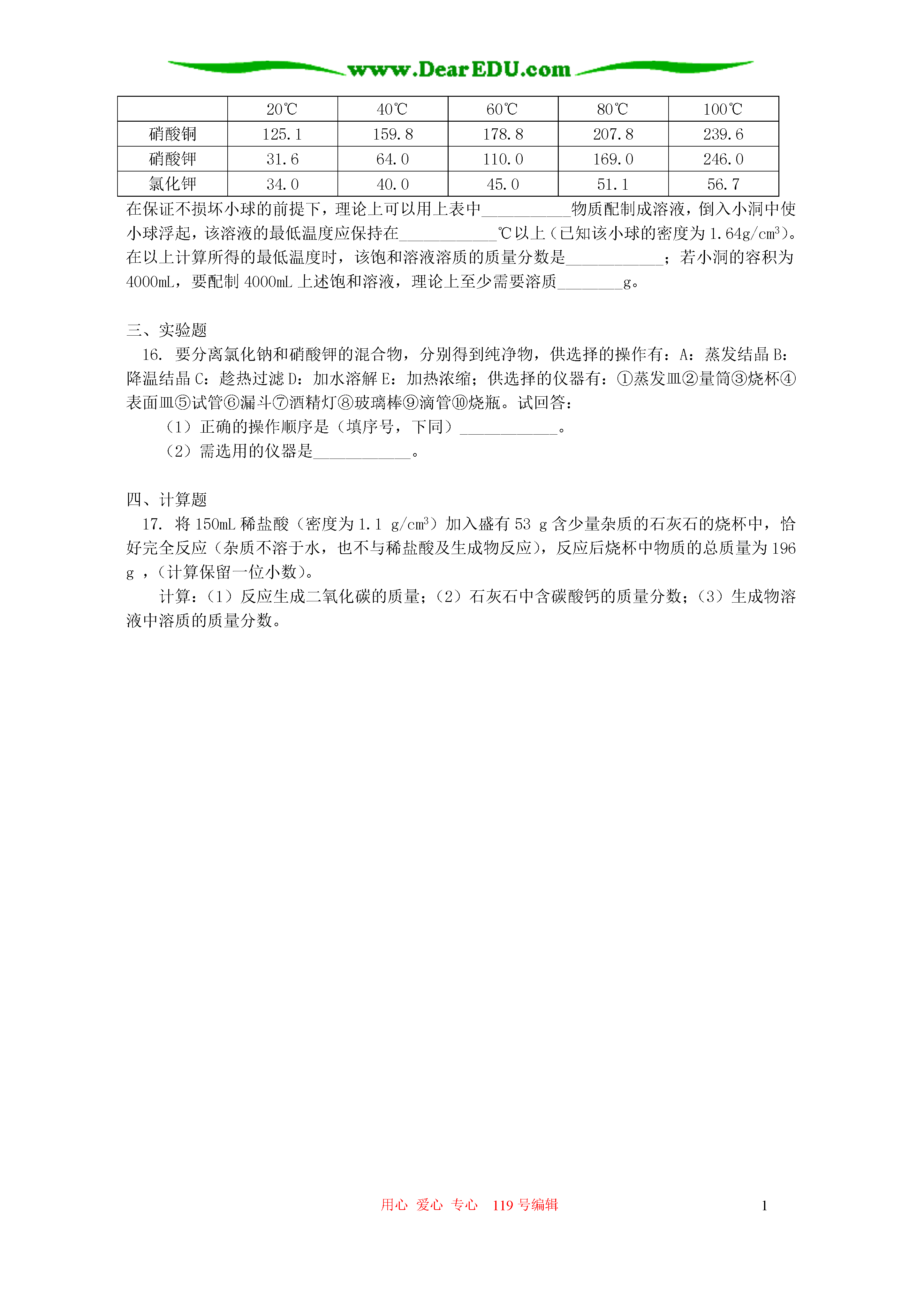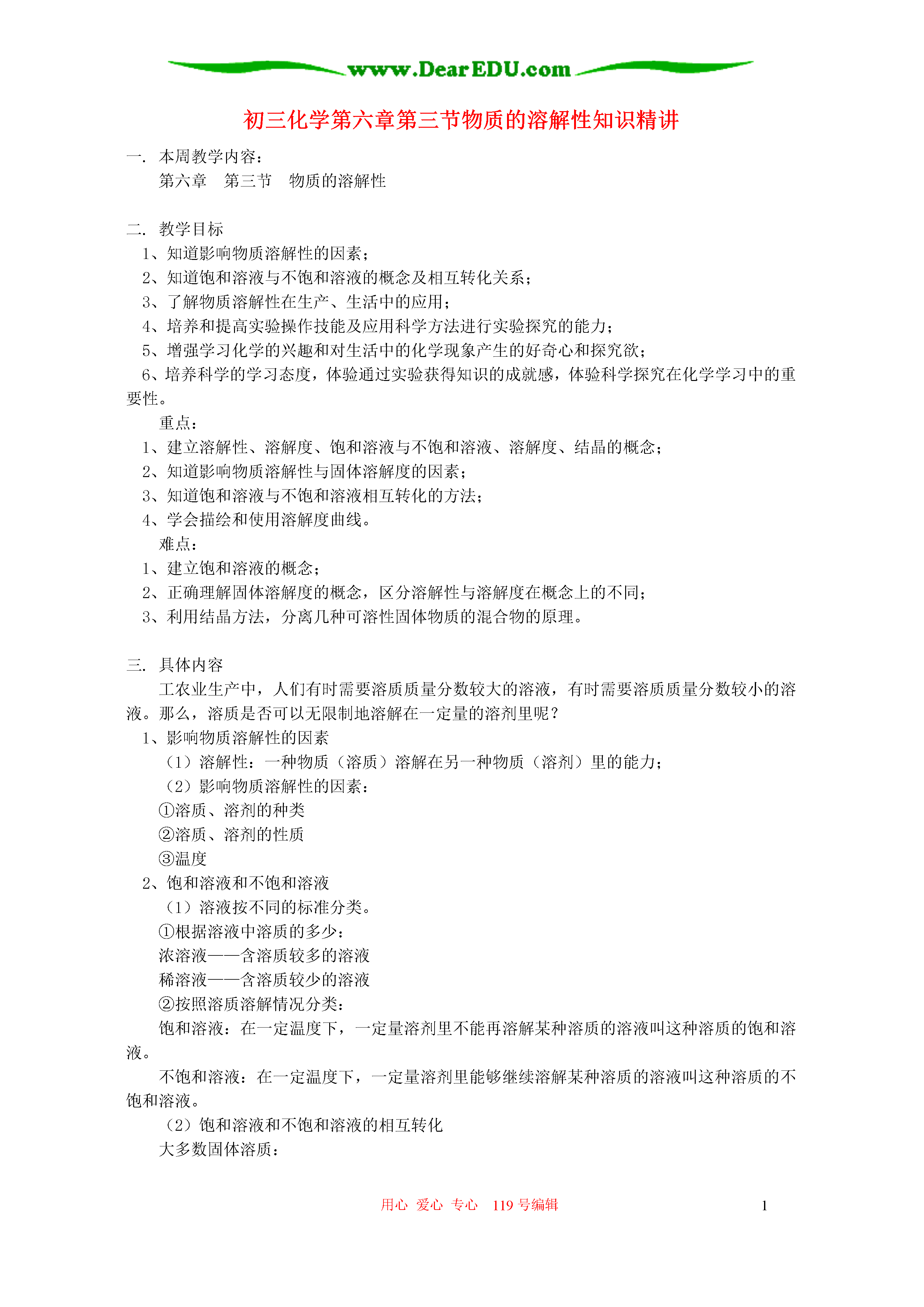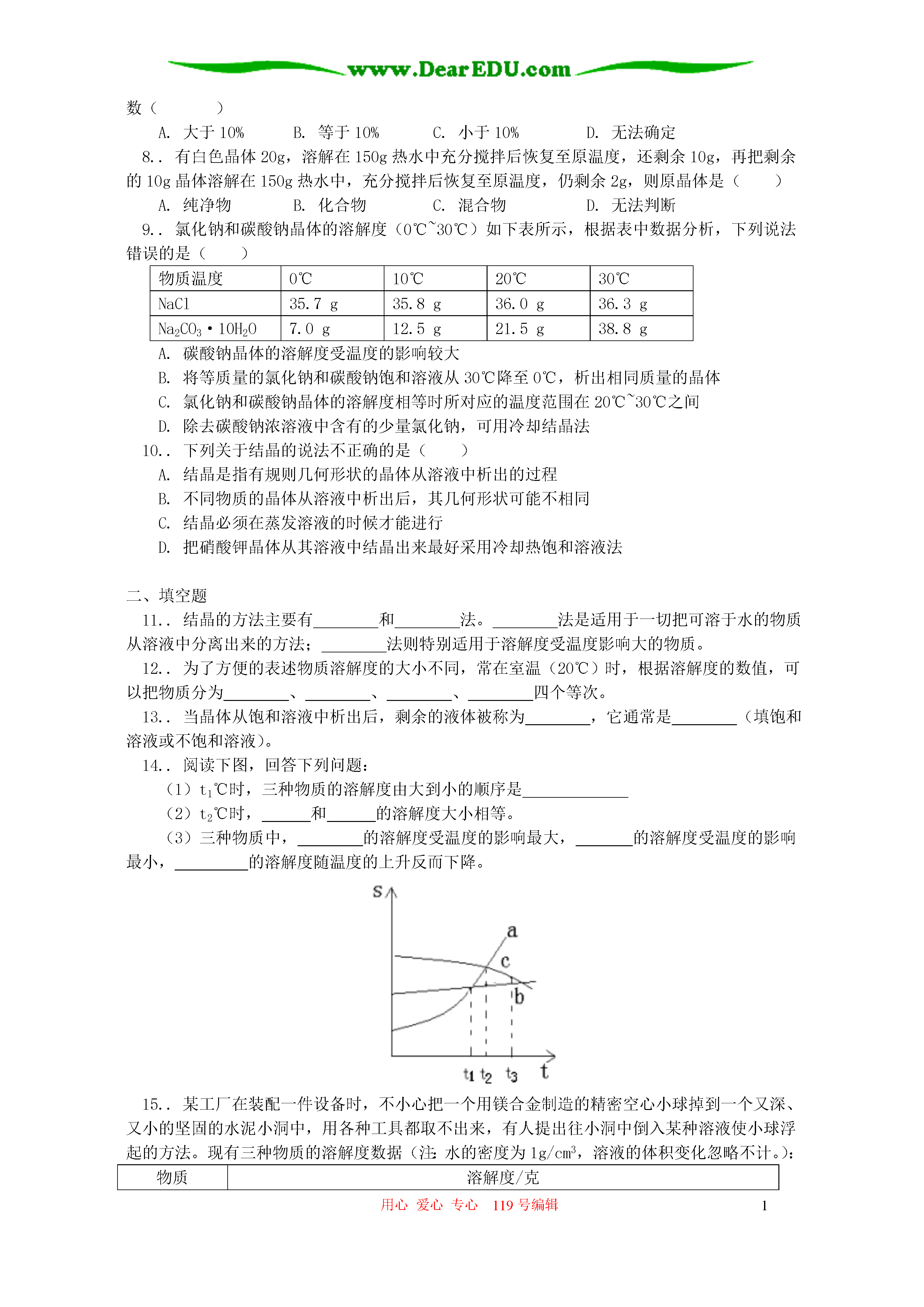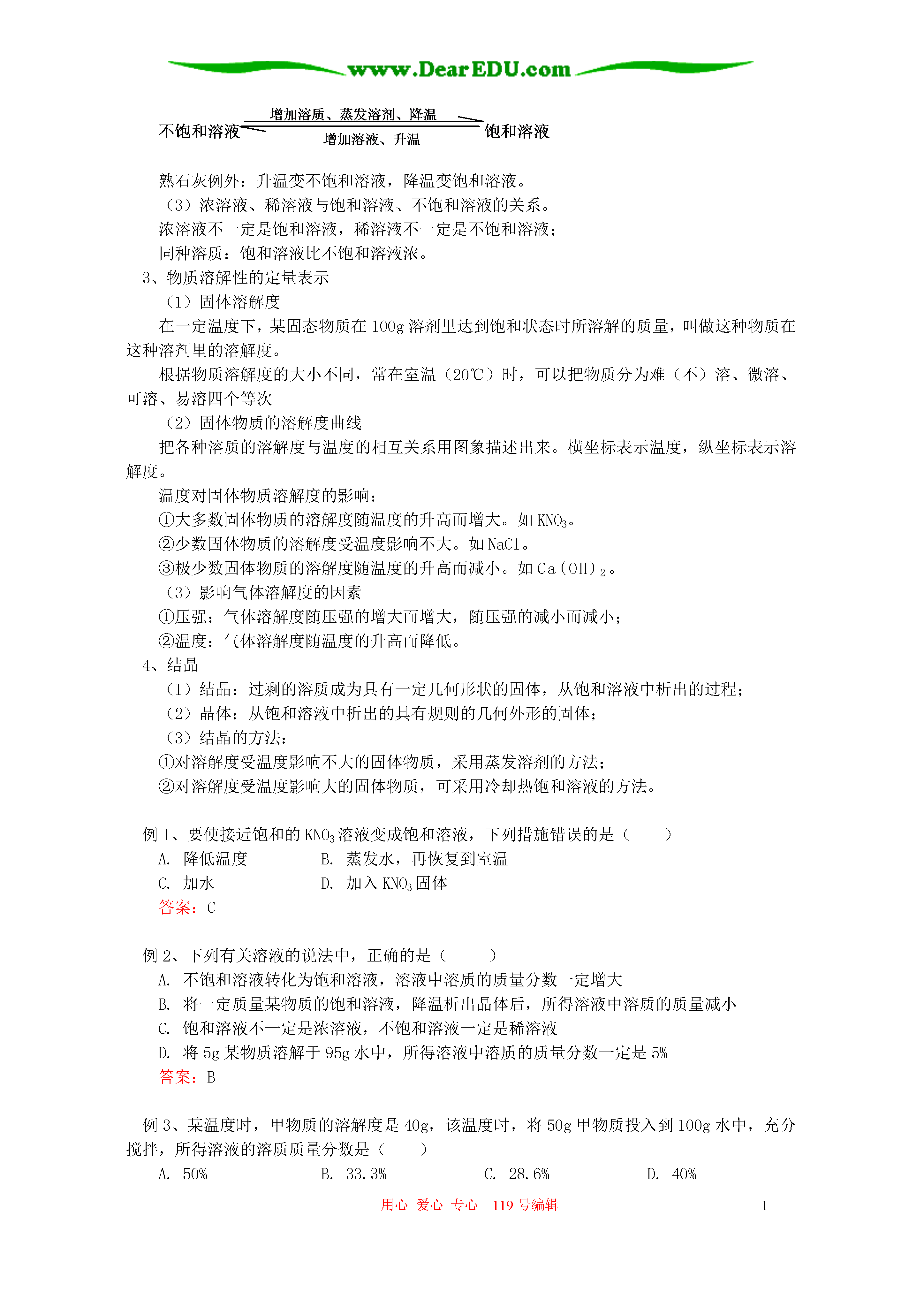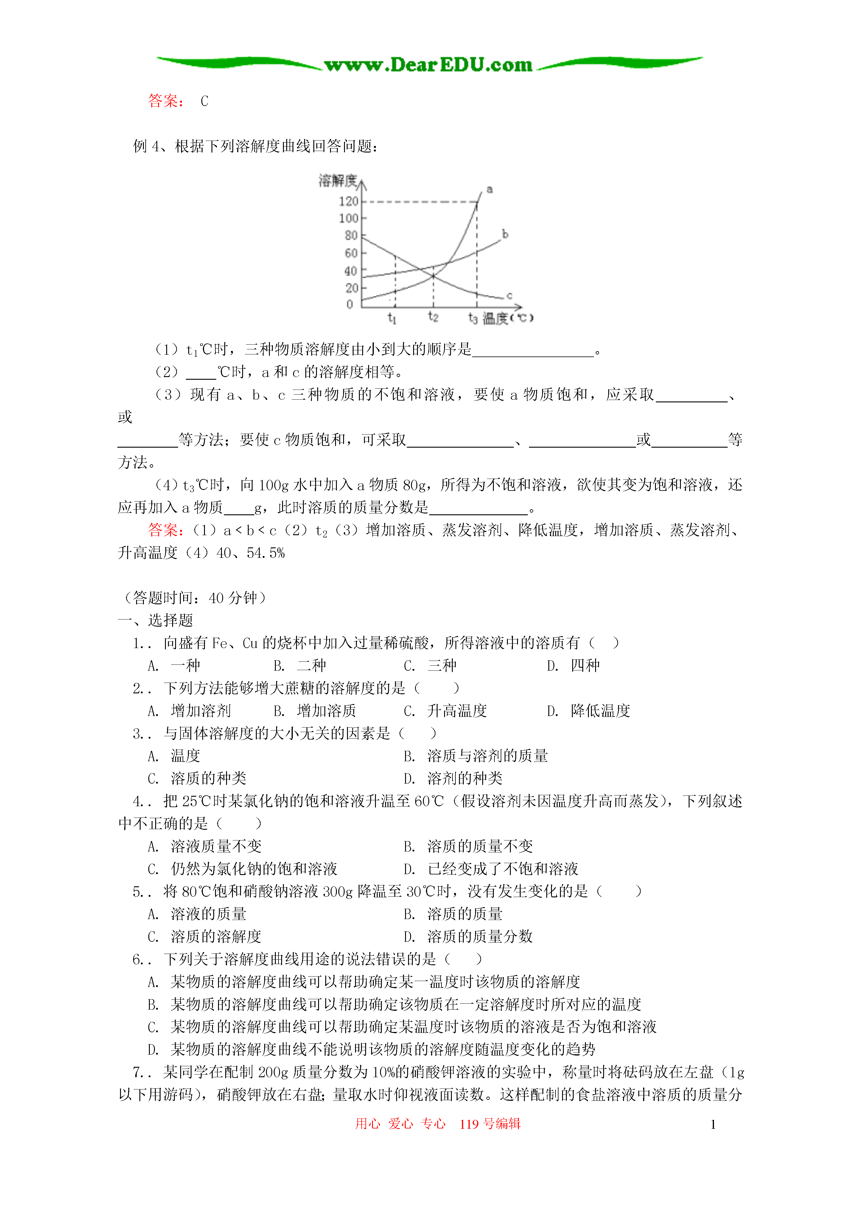 用心爱心专心119号编辑1初三化学第六章第三节物质的溶解性知识精讲一.本周教学内容:第六章第三节物质的溶解性二.教学目标1、知道影响物质溶解性的因素;2、知道饱和溶液与不饱和溶液的概念及相互转化关系;3、了解物质溶解性在生产、生活中的应用;4、培养和提高实验操作技能及应用科学方法进行实验探究的能力;5、增强学习化学的兴趣和对生活中的化学现象产生的好奇心和探究欲;6、培养科学的学习态度,体验通过实验获得知识的成就感,体验科学探究在化学学习中的重要性。重点:1、建立溶解性、溶解度、饱和溶液与不饱和溶液、溶解度、结晶的概念;2、知道影响物质溶解性与固体溶解度的因素;3、知道饱和溶液与不饱和溶液相互转化的方法;4、学会描绘和使用溶解度曲线。难点:1、建立饱和溶液的概念;2、正确理解固体溶解度的概念,区分溶解性与溶解度在概念上的不同;3、利用结晶方法,分离几种可溶性固体物质的混合物的原理。三.具体内容工农业生产中,人们有时需要溶质质量分数较大的溶液,有时需要溶质质量分数较小的溶液。那么,溶质是否可以无限制地溶解在一定量的溶剂里呢?1、影响物质溶解性的因素(1)溶解性:一种物质(溶质)溶解在另一种物质(溶剂)里的能力;(2)影响物质溶解性的因素:①溶质、溶剂的种类②溶质、溶剂的性质③温度2、饱和溶液和不饱和溶液(1)溶液按不同的标准分类。①根据溶液中溶质的多少:浓溶液——含溶质较多的溶液稀溶液——含溶质较少的溶液②按照溶质溶解情况分类:饱和溶液:在一定温度下,一定量溶剂里不能再溶解某种溶质的溶液叫这种溶质的饱和溶液。不饱和溶液:在一定温度下,一定量溶剂里能够继续溶解某种溶质的溶液叫这种溶质的不饱和溶液。(2)饱和溶液和不饱和溶液的相互转化大多数固体溶质:熟石灰例外:升温变不饱和溶液,降温变饱和溶液。(3)浓溶液、稀溶液与饱和溶液、不饱和溶液的关系。浓溶液不一定是饱和溶液,稀溶液不一定是不饱和溶液;同种溶质:饱和溶液比不饱和溶液浓。3、物质溶解性的定量表示(1)固体溶解度在一定温度下,某固态物质在100g溶剂里达到饱和状态时所溶解的质量,叫做这种物质在这种溶剂里的溶解度。根据物质溶解度的大小不同,常在室温(20℃)时,可以把物质分为难(不)溶、微溶、可溶、易溶四个等次(2)固体物质的溶解度曲线把各种溶质的溶解度与温度的相互关系用图象描述出来。横坐标表示温度,纵坐标表示溶解度。温度对固体物质溶解度的影响:①大多数固体物质的溶解度随温度的升高而增大。如KNO3。②少数固体物质的溶解度受温度影响不大。如NaCl。③极少数固体物质的溶解度随温度的升高而减小。如Ca(OH)2。(3)影响气体溶解度的因素①压强:气体溶解度随压强的增大而增大,随压强的减小而减小;②温度:气体溶解度随温度的升高而降低。4、结晶(1)结晶:过剩的溶质成为具有一定几何形状的固体,从饱和溶液中析出的过程;(2)晶体:从饱和溶液中析出的具有规则的几何外形的固体;(3)结晶的方法:①对溶解度受温度影响不大的固体物质,采用蒸发溶剂的方法;②对溶解度受温度影响大的固体物质,可采用冷却热饱和溶液的方法。例1、要使接近饱和的KNO3溶液变成饱和溶液,下列措施错误的是()A.降低温度B.蒸发水,再恢复到室温C.加水D.加入KNO3固体答案:C例2、下列有关溶液的说法中,正确的是()A.不饱和溶液转化为饱和溶液,溶液中溶质的质量分数一定增大B.将一定质量某物质的饱和溶液,降温析出晶体后,所得溶液中溶质的质量减小C.饱和溶液不一定是浓溶液,不饱和溶液一定是稀溶液D.将5g某物质溶解于95g水中,所得溶液中溶质的质量分数一定是5%答案:B例3、某温度时,甲物质的溶解度是40g,该温度时,将50g甲物质投入到100g水中,充分搅拌,所得溶液的溶质质量分数是()A.50%B.33.3%C.28.6%D.40%答案:C例4、根据下列溶解度曲线回答问题:(1)t1℃时,三种物质溶解度由小到大的顺序是。(2)℃时,a和c的溶解度相等。(3)现有a、b、c三种物质的不饱和溶液,要使a物质饱和,应采取、或等方法;要使c物质饱和,可采取、或等方法。(4)t3℃时,向100g水中加入a物质80g,所得为不饱和溶液,欲使其变为饱和溶液,还应再加入a物质g,此时溶质的质量分数是。答案:(1)a﹤b﹤c(2)t2(3)增加溶质、蒸发溶剂、降低温度,增加溶质、蒸发溶剂、升高温度(4)40、54.5%(答题时间:40分钟)一、选择题1..向盛有Fe、Cu的烧杯中加入过量稀硫酸,所得溶液中的溶质有()A.一种B.二种C.三种D.四种2.