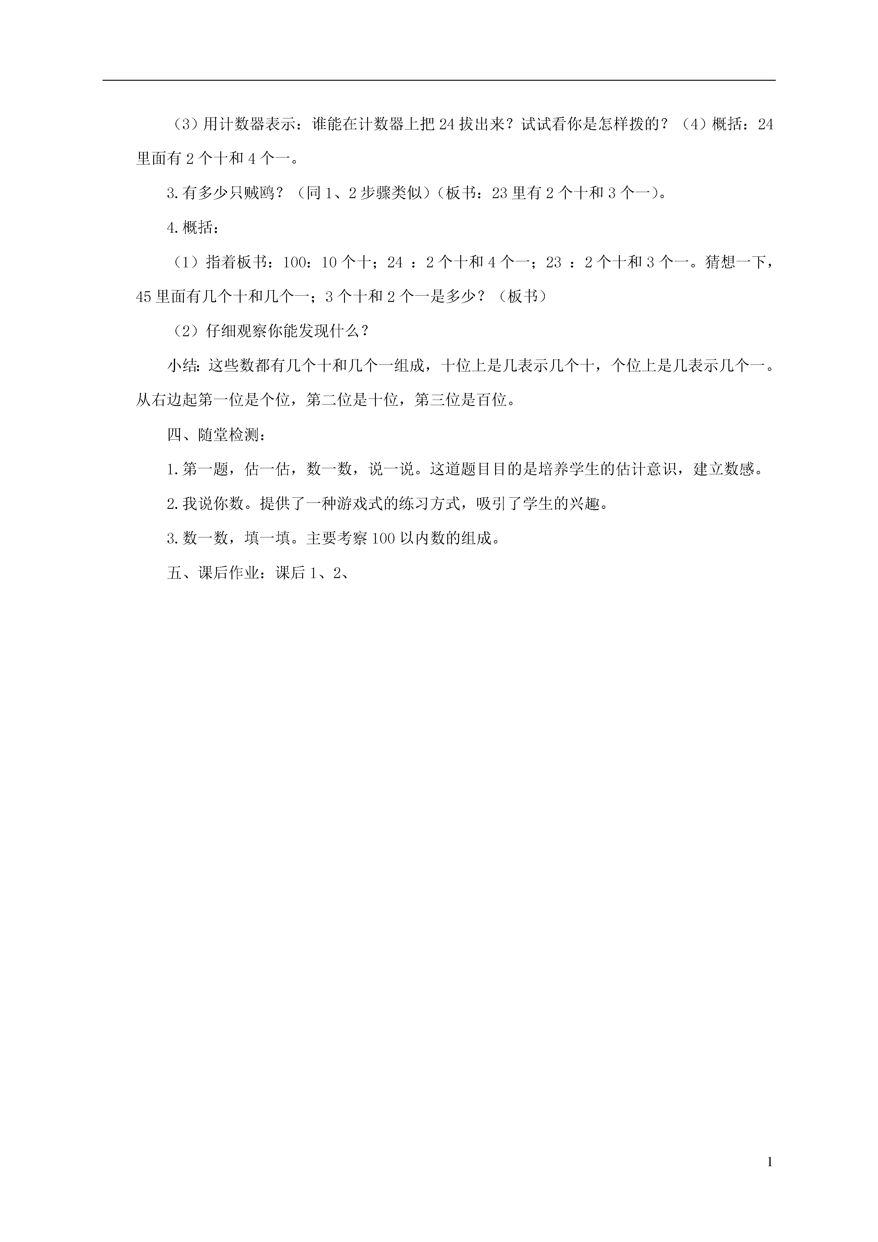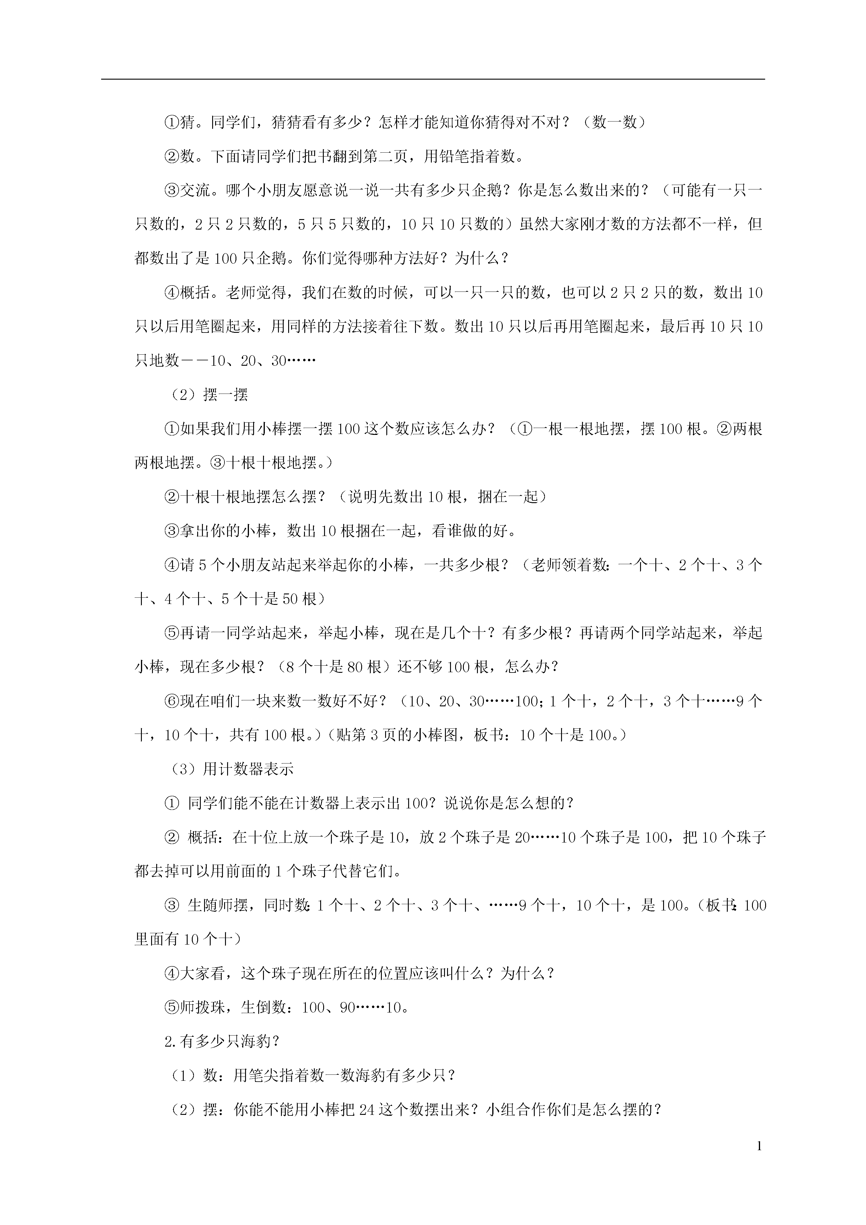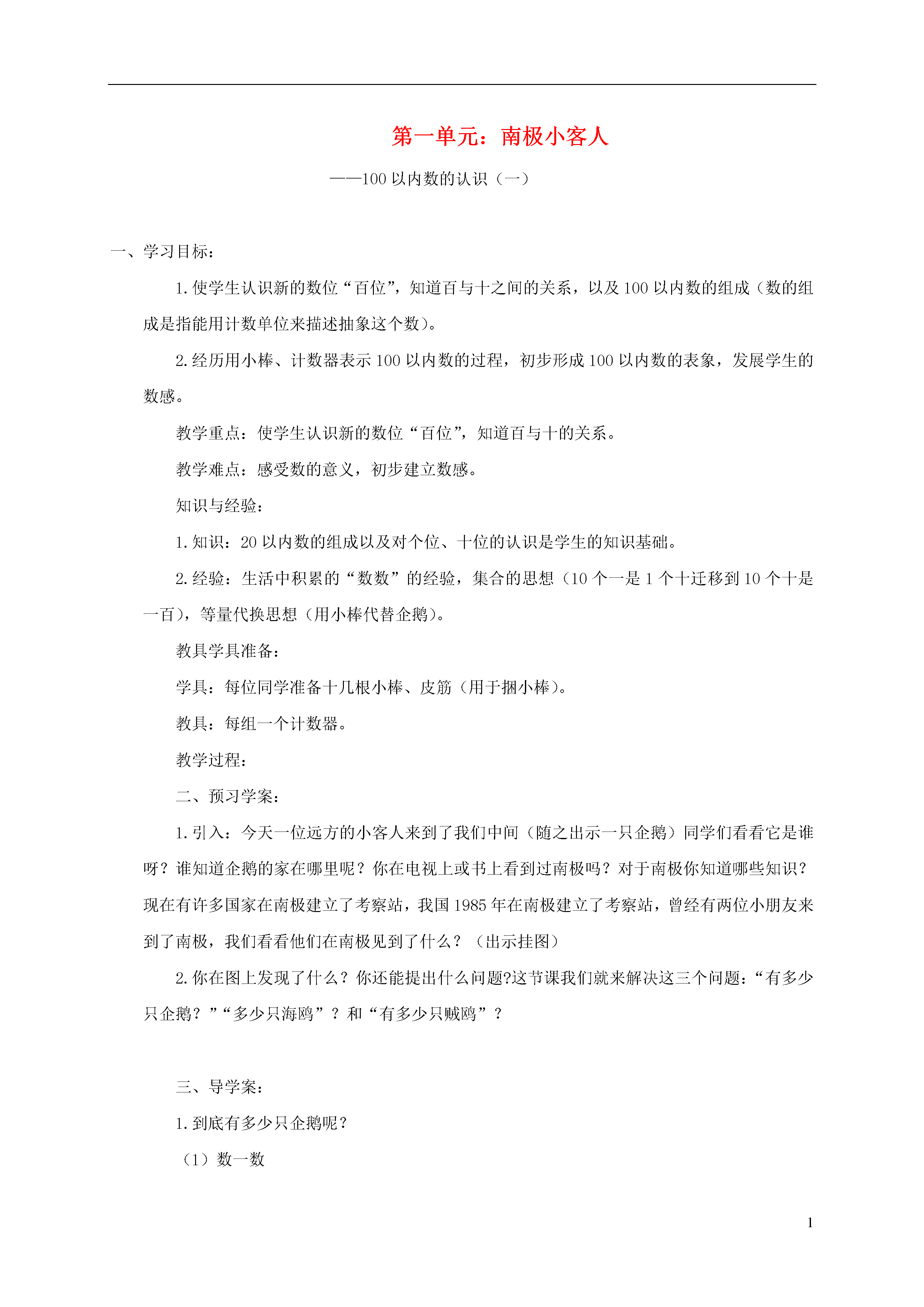 1第一单元:南极小客人——100以内数的认识(一)一、学习目标:1.使学生认识新的数位“百位”,知道百与十之间的关系,以及100以内数的组成(数的组成是指能用计数单位来描述抽象这个数)。2.经历用小棒、计数器表示100以内数的过程,初步形成100以内数的表象,发展学生的数感。教学重点:使学生认识新的数位“百位”,知道百与十的关系。教学难点:感受数的意义,初步建立数感。知识与经验:1.知识:20以内数的组成以及对个位、十位的认识是学生的知识基础。2.经验:生活中积累的“数数”的经验,集合的思想(10个一是1个十迁移到10个十是一百),等量代换思想(用小棒代替企鹅)。教具学具准备:学具:每位同学准备十几根小棒、皮筋(用于捆小棒)。教具:每组一个计数器。教学过程:二、预习学案:1.引入:今天一位远方的小客人来到了我们中间(随之出示一只企鹅)同学们看看它是谁呀?谁知道企鹅的家在哪里呢?你在电视上或书上看到过南极吗?对于南极你知道哪些知识?现在有许多国家在南极建立了考察站,我国1985年在南极建立了考察站,曾经有两位小朋友来到了南极,我们看看他们在南极见到了什么?(出示挂图)2.你在图上发现了什么?你还能提出什么问题?这节课我们就来解决这三个问题:“有多少只企鹅?”“多少只海鸥”?和“有多少只贼鸥”?三、导学案:1.到底有多少只企鹅呢?(1)数一数①猜。同学们,猜猜看有多少?怎样才能知道你猜得对不对?(数一数)②数。下面请同学们把书翻到第二页,用铅笔指着数。③交流。哪个小朋友愿意说一说一共有多少只企鹅?你是怎么数出来的?(可能有一只一只数的,2只2只数的,5只5只数的,10只10只数的)虽然大家刚才数的方法都不一样,但都数出了是100只企鹅。你们觉得哪种方法好?为什么?④概括。老师觉得,我们在数的时候,可以一只一只的数,也可以2只2只的数,数出10只以后用笔圈起来,用同样的方法接着往下数。数出10只以后再用笔圈起来,最后再10只10只地数--10、20、30……(2)摆一摆①如果我们用小棒摆一摆100这个数应该怎么办?(①一根一根地摆,摆100根。②两根两根地摆。③十根十根地摆。)②十根十根地摆怎么摆?(说明先数出10根,捆在一起)③拿出你的小棒,数出10根捆在一起,看谁做的好。④请5个小朋友站起来举起你的小棒,一共多少根?(老师领着数:一个十、2个十、3个十、4个十、5个十是50根)⑤再请一同学站起来,举起小棒,现在是几个十?有多少根?再请两个同学站起来,举起小棒,现在多少根?(8个十是80根)还不够100根,怎么办?⑥现在咱们一块来数一数好不好?(10、20、30……100;1个十,2个十,3个十……9个十,10个十,共有100根。)(贴的小棒图,板书:10个十是100。)(3)用计数器表示①同学们能不能在计数器上表示出100?说说你是怎么想的?②概括:在十位上放一个珠子是10,放2个珠子是20……10个珠子是100,把10个珠子都去掉可以用前面的1个珠子代替它们。③生随师摆,同时数:1个十、2个十、3个十、……9个十,10个十,是100。(板书:100里面有10个十)④大家看,这个珠子现在所在的位置应该叫什么?为什么?⑤师拨珠,生倒数:100、90……10。2.有多少只海豹?(1)数:用笔尖指着数一数海豹有多少只?(2)摆:你能不能用小棒把24这个数摆出来?小组合作你们是怎么摆的?(3)用计数器表示:谁能在计数器上把24拔出来?试试看你是怎样拨的?(4)概括:24里面有2个十和4个一。3.有多少只贼鸥?(同1、2步骤类似)(板书:23里有2个十和3个一)。4.概括:(1)指着板书:100:10个十;24:2个十和4个一;23:2个十和3个一。猜想一下,45里面有几个十和几个一;3个十和2个一是多少?(板书)(2)仔细观察你能发现什么?小结:这些数都有几个十和几个一组成,十位上是几表示几个十,个位上是几表示几个一。从右边起第一位是个位,第二位是十位,第三位是百位。四、随堂检测:1.第一题,估一估,数一数,说一说。这道题目目的是培养学生的估计意识,建立数感。2.我说你数。提供了一种游戏式的练习方式,吸引了学生的兴趣。3.数一数,填一填。主要考察100以内数的组成。五、课后作业:课后1、2、