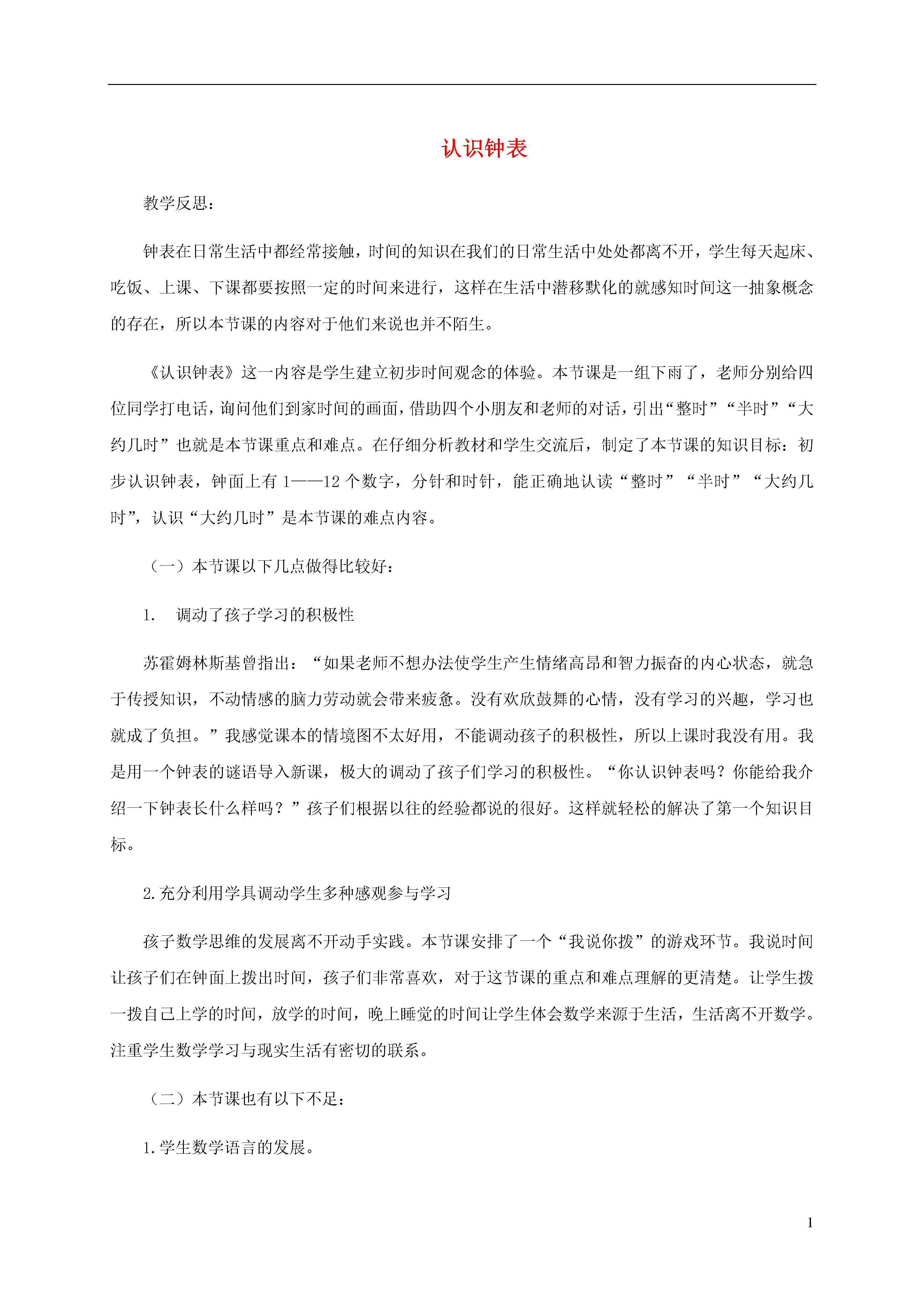 1认识钟表教学反思:钟表在日常生活中都经常接触,时间的知识在我们的日常生活中处处都离不开,学生每天起床、吃饭、上课、下课都要按照一定的时间来进行,这样在生活中潜移默化的就感知时间这一抽象概念的存在,所以本节课的内容对于他们来说也并不陌生。《认识钟表》这一内容是学生建立初步时间观念的体验。本节课是一组下雨了,老师分别给四位同学打电话,询问他们到家时间的画面,借助四个小朋友和老师的对话,引出“整时”“半时”“大约几时”也就是本节课重点和难点。在仔细分析教材和学生交流后,制定了本节课的知识目标:初步认识钟表,钟面上有1——12个数字,分针和时针,能正确地认读“整时”“半时”“大约几时”,认识“大约几时”是本节课的难点内容。(一)本节课以下几点做得比较好:1.调动了孩子学习的积极性苏霍姆林斯基曾指出:“如果老师不想办法使学生产生情绪高昂和智力振奋的内心状态,就急于传授知识,不动情感的脑力劳动就会带来疲惫。没有欢欣鼓舞的心情,没有学习的兴趣,学习也就成了负担。”我感觉课本的情境图不太好用,不能调动孩子的积极性,所以上课时我没有用。我是用一个钟表的谜语导入新课,极大的调动了孩子们学习的积极性。“你认识钟表吗?你能给我介绍一下钟表长什么样吗?”孩子们根据以往的经验都说的很好。这样就轻松的解决了第一个知识目标。2.充分利用学具调动学生多种感观参与学习孩子数学思维的发展离不开动手实践。本节课安排了一个“我说你拨”的游戏环节。我说时间让孩子们在钟面上拨出时间,孩子们非常喜欢,对于这节课的重点和难点理解的更清楚。让学生拨一拨自己上学的时间,放学的时间,晚上睡觉的时间让学生体会数学来源于生活,生活离不开数学。注重学生数学学习与现实生活有密切的联系。(二)本节课也有以下不足:1.学生数学语言的发展。本节课比较注重学生动手操作,而忽略了数学语言的发展,学生不能准确的用数学语言描述时间。心里明白就是说不出来。让他们拨一个时间的时候都能拨对,但用语言描述的时候,大部分孩子没有说清楚,这也是下节课要改进的地方。2.难点突破不够。大约几时是这节课的难点内容,从当堂达标检测来看还有部分孩子对于大约几时不理解。3.学生会用自己的小闹钟拨时间,但给他们一个空白的钟面让他画时间的时候,有很多孩子就画不出来了,看来孩子没能学以致用。这也是下一步训练的重点。
