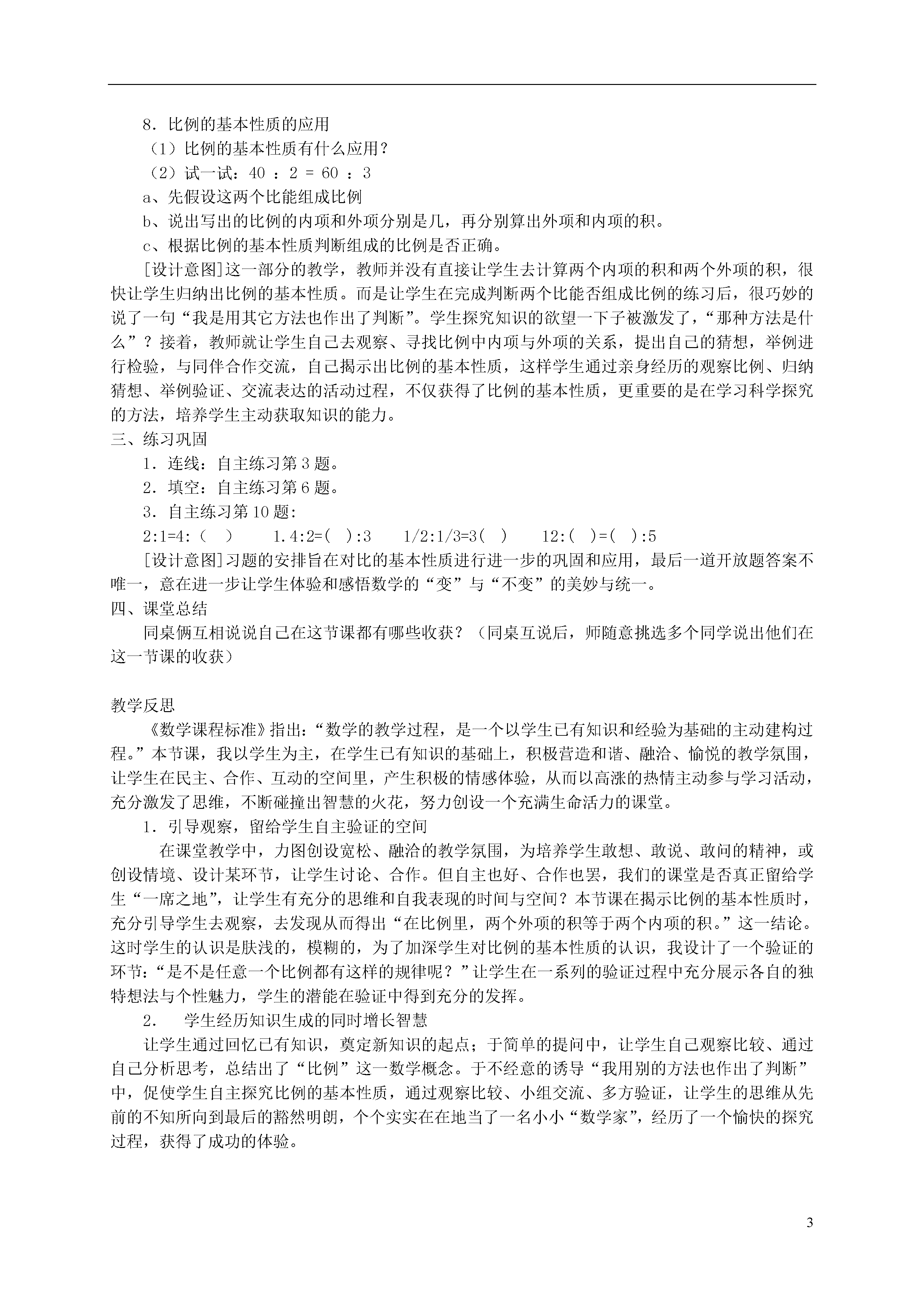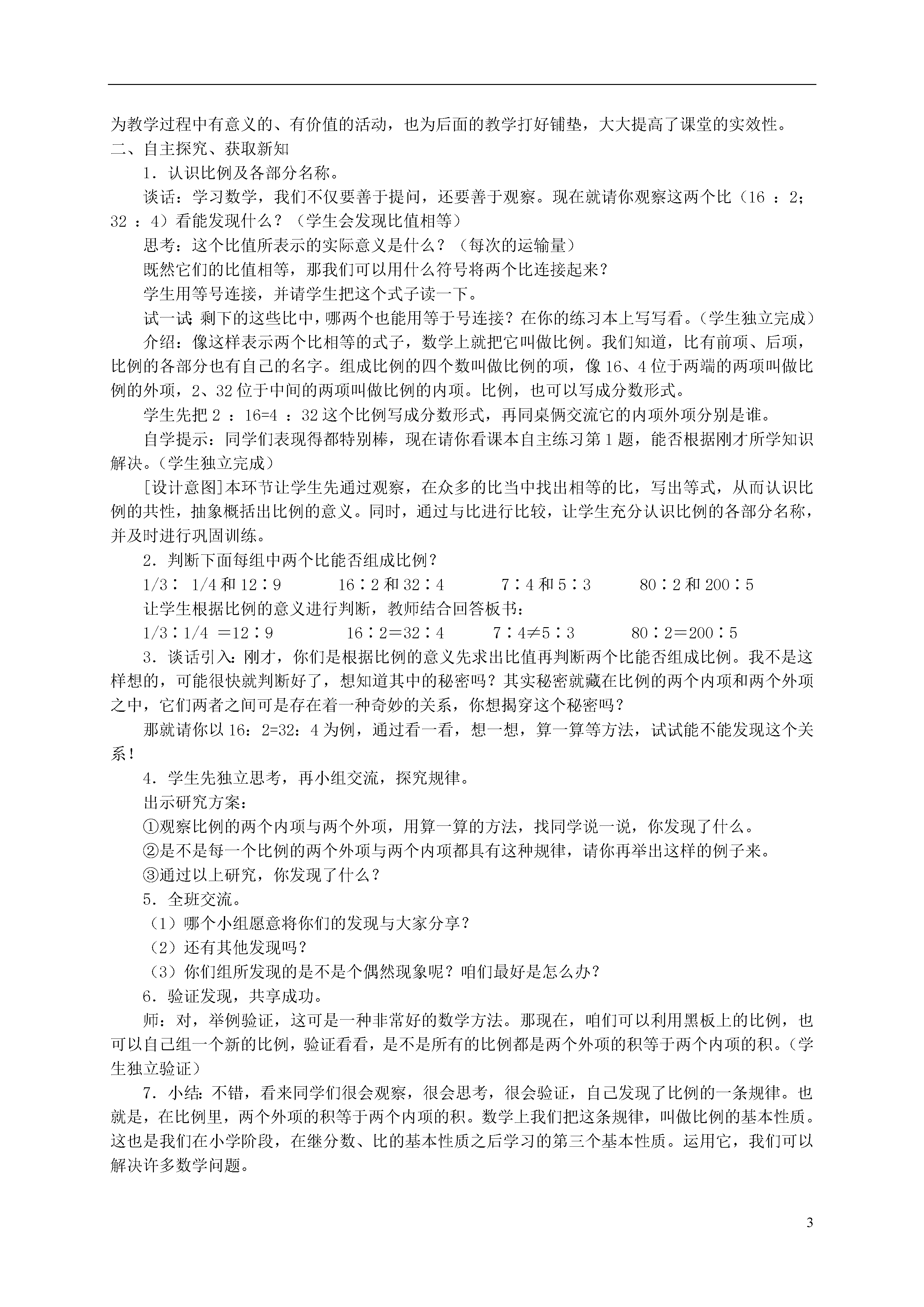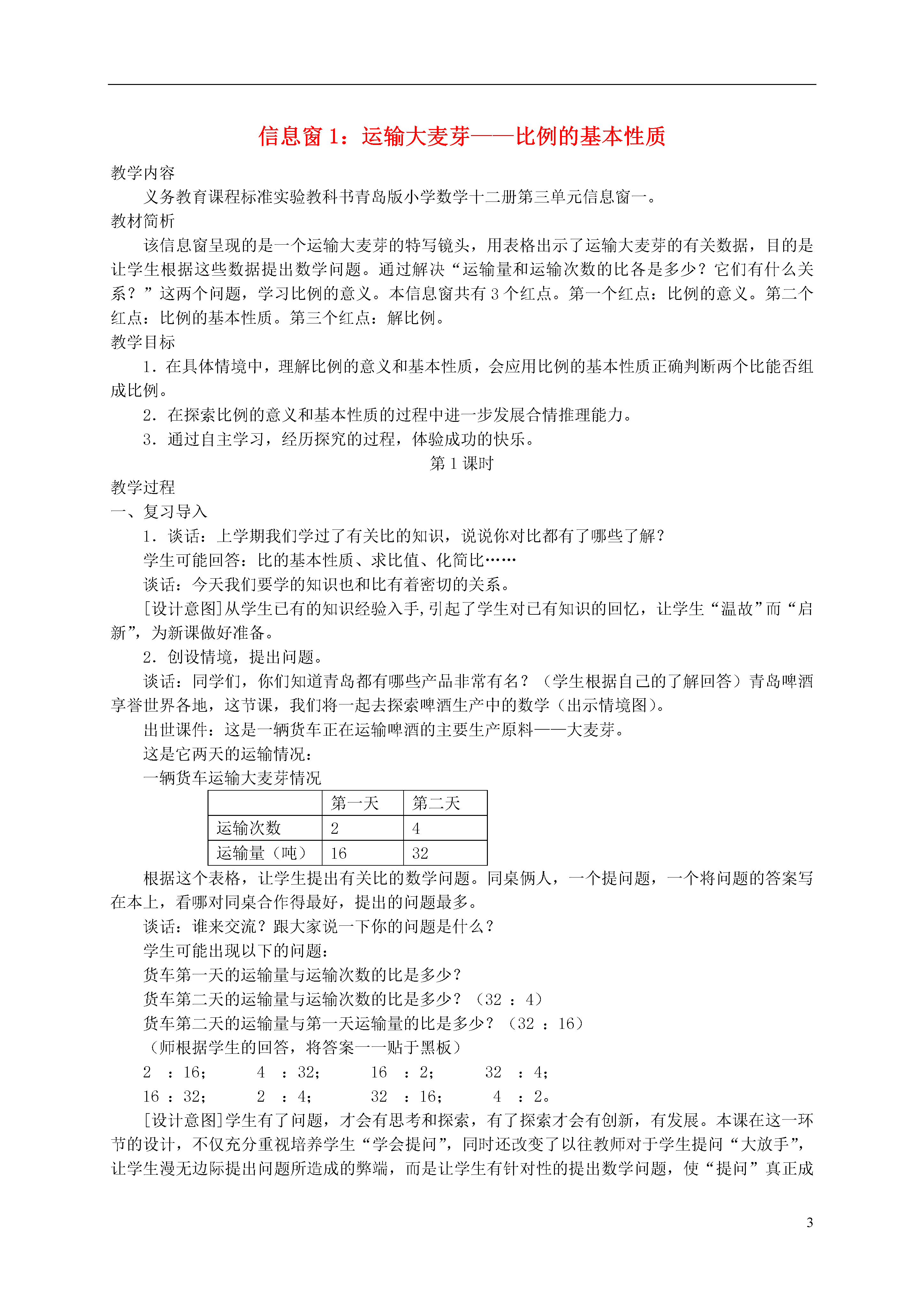 3信息窗1:运输大麦芽——比例的基本性质教学内容义务教育课程标准实验教科书青岛版小学数学十二册第三单元信息窗一。教材简析该信息窗呈现的是一个运输大麦芽的特写镜头,用表格出示了运输大麦芽的有关数据,目的是让学生根据这些数据提出数学问题。通过解决“运输量和运输次数的比各是多少?它们有什么关系?”这两个问题,学习比例的意义。本信息窗共有3个红点。第一个红点:比例的意义。第二个红点:比例的基本性质。第三个红点:解比例。教学目标1.在具体情境中,理解比例的意义和基本性质,会应用比例的基本性质正确判断两个比能否组成比例。2.在探索比例的意义和基本性质的过程中进一步发展合情推理能力。3.通过自主学习,经历探究的过程,体验成功的快乐。第1课时教学过程一、复习导入1.谈话:上学期我们学过了有关比的知识,说说你对比都有了哪些了解?学生可能回答:比的基本性质、求比值、化简比……谈话:今天我们要学的知识也和比有着密切的关系。[设计意图]从学生已有的知识经验入手,引起了学生对已有知识的回忆,让学生“温故”而“启新”,为新课做好准备。2.创设情境,提出问题。谈话:同学们,你们知道青岛都有哪些产品非常有名?(学生根据自己的了解回答)青岛啤酒享誉世界各地,这节课,我们将一起去探索啤酒生产中的数学(出示情境图)。出世课件:这是一辆货车正在运输啤酒的主要生产原料——大麦芽。这是它两天的运输情况:一辆货车运输大麦芽情况第一天第二天运输次数24运输量(吨)1632根据这个表格,让学生提出有关比的数学问题。同桌俩人,一个提问题,一个将问题的答案写在本上,看哪对同桌合作得最好,提出的问题最多。谈话:谁来交流?跟大家说一下你的问题是什么?学生可能出现以下的问题:货车第一天的运输量与运输次数的比是多少?货车第二天的运输量与运输次数的比是多少?(32:4)货车第二天的运输量与第一天运输量的比是多少?(32:16)(师根据学生的回答,将答案一一贴于黑板)2:16;4:32;16:2;32:4;16:32;2:4;32:16;4:2。[设计意图]学生有了问题,才会有思考和探索,有了探索才会有创新,有发展。本课在这一环节的设计,不仅充分重视培养学生“学会提问”,同时还改变了以往教师对于学生提问“大放手”,让学生漫无边际提出问题所造成的弊端,而是让学生有针对性的提出数学问题,使“提问”真正成为教学过程中有意义的、有价值的活动,也为后面的教学打好铺垫,大大提高了课堂的实效性。二、自主探究、获取新知1.认识比例及各部分名称。谈话:学习数学,我们不仅要善于提问,还要善于观察。现在就请你观察这两个比(16:2;32:4)看能发现什么?(学生会发现比值相等)思考:这个比值所表示的实际意义是什么?(每次的运输量)既然它们的比值相等,那我们可以用什么符号将两个比连接起来?学生用等号连接,并请学生把这个式子读一下。试一试:剩下的这些比中,哪两个也能用等于号连接?在你的练习本上写写看。(学生独立完成)介绍:像这样表示两个比相等的式子,数学上就把它叫做比例。我们知道,比有前项、后项,比例的各部分也有自己的名字。组成比例的四个数叫做比例的项,像16、4位于两端的两项叫做比例的外项,2、32位于中间的两项叫做比例的内项。比例,也可以写成分数形式。学生先把2:16=4:32这个比例写成分数形式,再同桌俩交流它的内项外项分别是谁。自学提示:同学们表现得都特别棒,现在请你看课本自主练习第1题,能否根据刚才所学知识解决。(学生独立完成)[设计意图]本环节让学生先通过观察,在众多的比当中找出相等的比,写出等式,从而认识比例的共性,抽象概括出比例的意义。同时,通过与比进行比较,让学生充分认识比例的各部分名称,并及时进行巩固训练。2.判断下面每组中两个比能否组成比例?1/3∶1/4和12∶916∶2和32∶47∶4和5∶380∶2和200∶5让学生根据比例的意义进行判断,教师结合回答板书:1/3∶1/4=12∶916∶2=32∶47∶4≠5∶380∶2=200∶53.谈话引入:刚才,你们是根据比例的意义先求出比值再判断两个比能否组成比例。我不是这样想的,可能很快就判断好了,想知道其中的秘密吗?其实秘密就藏在比例的两个内项和两个外项之中,它们两者之间可是存在着一种奇妙的关系,你想揭穿这个秘密吗?那就请你以16:2=32:4为例,通过看一看,想一想,算一算等方法,试试能不能发现这个关系!4.学生先独立思考,再小组交流,探究规律。出示研究方案:①观察比例的两个内项与两个外项,用算一算的方法,找同学说一说,你发现了什么。②是不是每一个比例的两个外项与两个内项都具有这种规律,请