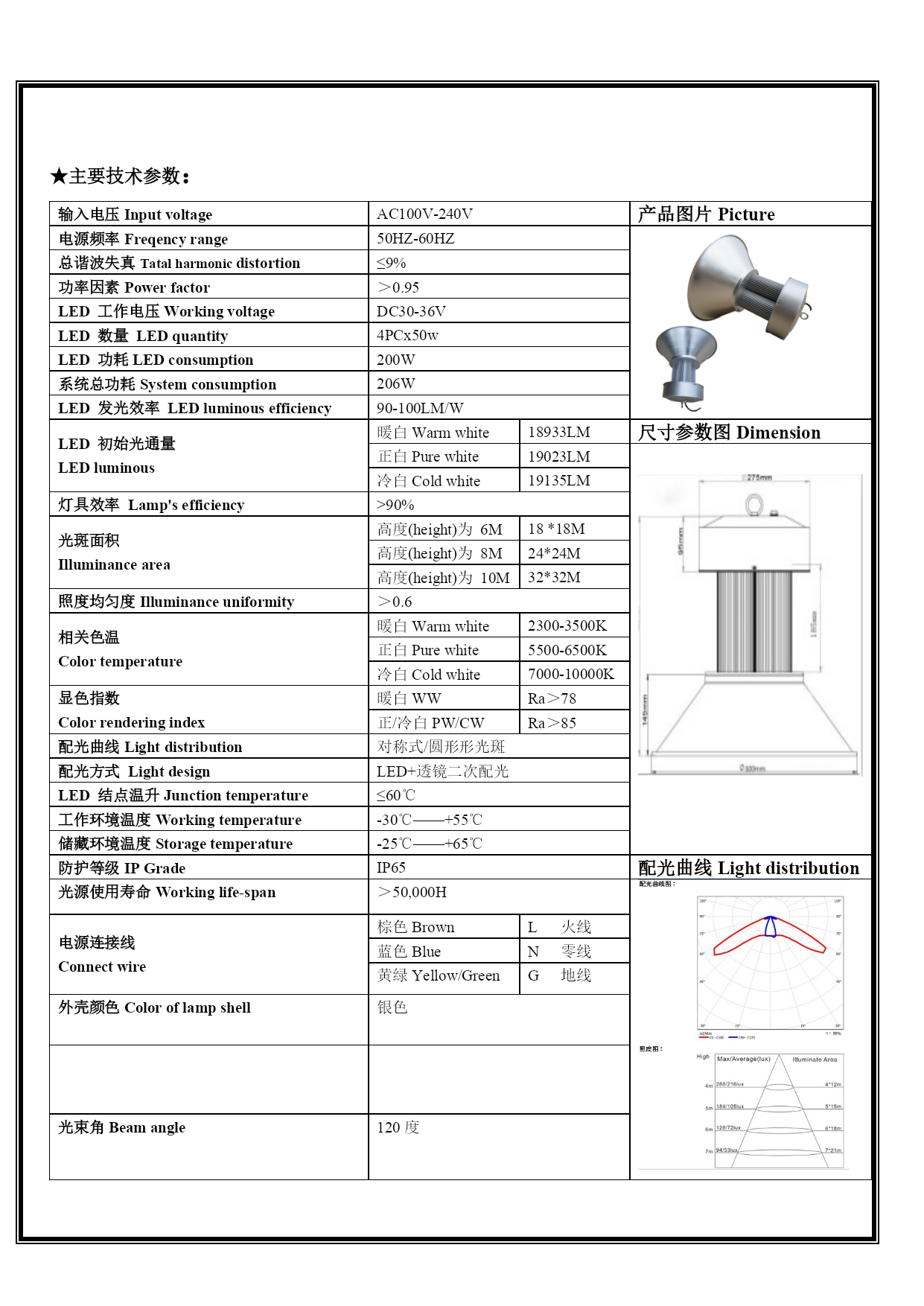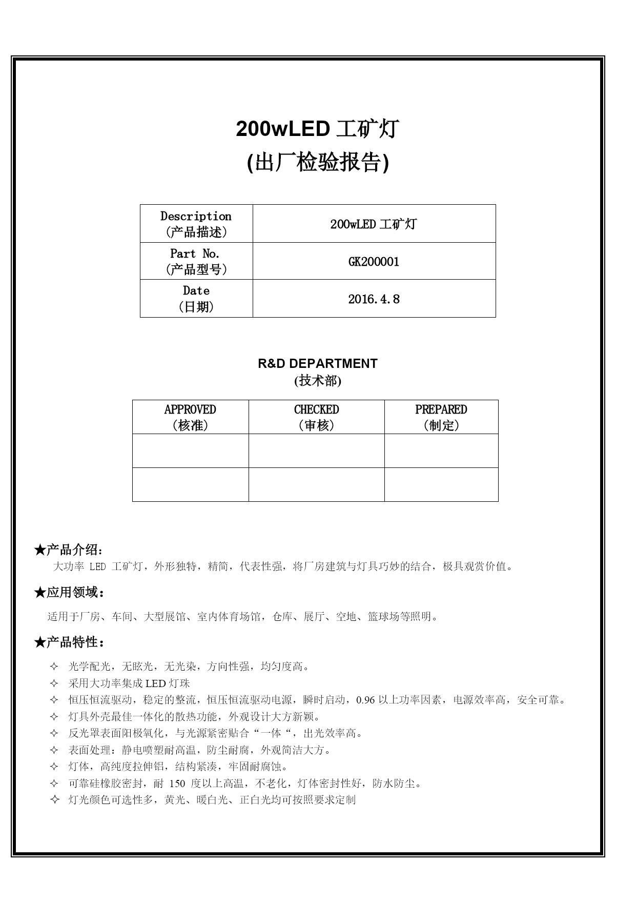 200wLED工矿灯(出厂检验报告)Description(产品描述)200wLED工矿灯PartNo.(产品型号)GK200001Date(日期)2016.4.8R&DDEPARTMENT(技术部)APPROVED(核准)CHECKED(审核)PREPARED(制定)★产品介绍:大功率LED工矿灯,外形独特,精简,代表性强,将厂房建筑与灯具巧妙的结合,极具观赏价值。★应用领域:适用于厂房、车间、大型展馆、室内体育场馆,仓库、展厅、空地、篮球场等照明。★产品特性:光学配光,无眩光,无光染,方向性强,均匀度高。采用大功率集成LED灯珠恒压恒流驱动,稳定的整流,恒压恒流驱动电源,瞬时启动,0.96以上功率因素,电源效率高,安全可靠。灯具外壳最佳一体化的散热功能,外观设计大方新颖。反光罩表面阳极氧化,与光源紧密贴合“一体“,出光效率高。表面处理:静电喷塑耐高温,防尘耐腐,外观简洁大方。灯体,高纯度拉伸铝,结构紧凑,牢固耐腐蚀。可靠硅橡胶密封,耐150度以上高温,不老化,灯体密封性好,防水防尘。灯光颜色可选性多,黄光、暖白光、正白光均可按照要求定制★主要技术参数:输入电压InputvoltageAC100V-240V产品图片Picture电源频率Freqencyrange50HZ-60HZ总谐波失真≤9%功率因素>0.98LED工作电压DC30-36VLED数量1PCLED功耗10W系统总功耗11.8WLED发光效率90-100LM/W总谐波失真Tatalharmonicdistortion≤9%功率因素Powerfactor>0.95LED工作电压WorkingvoltageDC30-36VLED数量LEDquantity4PCx50wLED功耗LEDconsumption200W系统总功耗Systemconsumption206WLED发光效率LEDluminousefficiency90-100LM/WLED初始光通量LEDluminous暖白Warmwhite18933LM尺寸参数图Dimension正白Purewhite19023LM冷白Coldwhite19135LM灯具效率Lamp'sefficiency>90%光斑面积Illuminancearea高度(height)为6M18*18M高度(height)为8M24*24M高度(height)为10M32*32M照度均匀度Illuminanceuniformity>0.6相关色温Colortemperature暖白Warmwhite2300-3500K正白Purewhite5500-6500K冷白Coldwhite7000-10000K显色指数Colorrenderingindex暖白WWRa>78正/冷白PW/CWRa>85配光曲线Lightdistribution对称式/圆形形光斑配光方式LightdesignLED+透镜二次配光LED结点温升Junctiontemperature≤60℃工作环境温度Workingtemperature-30℃——+55℃-25℃——+65℃储藏环境温度Storagetemperature-25℃——+65℃防护等级IPGradeIP65配光曲线Lightdistribution光源使用寿命Workinglife-span>50,000H电源连接线Connectwire棕色Brown蓝色N零线黄色或黄绿G地线L火线蓝色BlueN零线黄绿Yellow/GreenG地线外壳颜色Coloroflampshell银色光束角Beamangle120度★使用说明1.产品使用工作电压:AC110V~240V50/60Hz,请勿超出工作电压范围。2.由于灯具有玻璃配件,在搬运,贮存的时候请注意轻拿轻放,勿重压。★安装使用说明1.通过产品背后的支架固定在需要安装的位置,请确保稳固。2.工作环境温度,储存。3.安装灯具时,接线与接线处封闭好,防止漏电。4.外接电源线时,必须做好绝缘措施。5.该灯具使用时不能违反任何防火法规。6.安装请找专业电工,三芯电缆接线方式为红线为火线,蓝色线为零线,黄绿色线为地线。★维护维修说明1.维护维修前请确定已经断电。2.定期对工矿灯的玻璃进行清洁,以保持灯具良好的透光性。3.定期对工矿灯的外壳及散热器的灰尘进行清洁,以保持良好的散热性能。4.注意不要用水或者腐蚀性强的溶液进行清洁,最好用干抹布。5.更换电源时,可直接用螺丝刀打开后盖后,取出电源,AC电源三芯线接线按照红色对应电源上的“L”,蓝色对应电源上的“N”,黄绿色或者黄色对应“”,DC电源线的红线或者白线对应电源的正黑线对应电源的负极,注意正负极不要接反。★质保,售后服务在正常使用条件下,质量保证是基于产品的正确保存、安装、使用和维护;由于安装使用不当,违反产品操