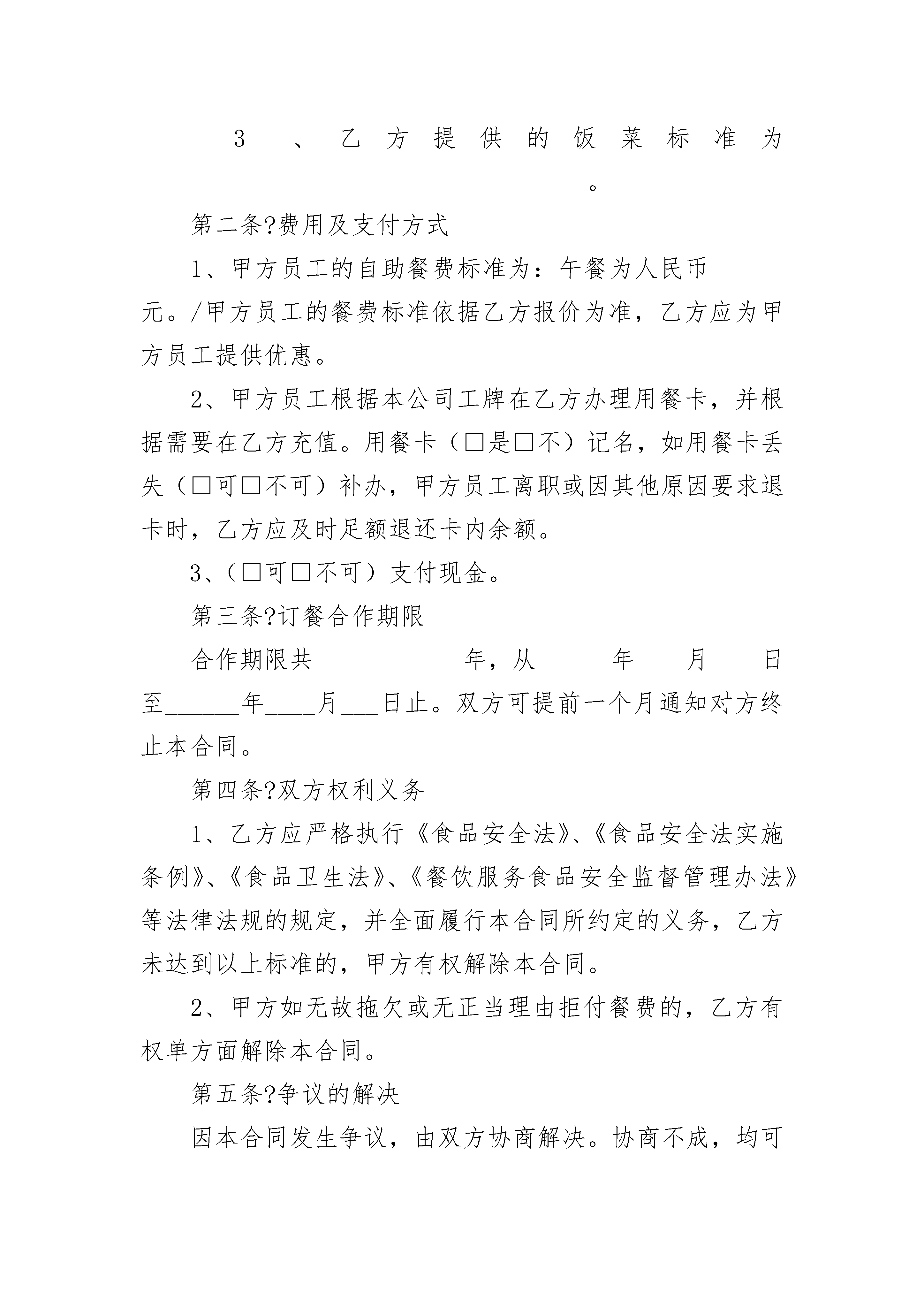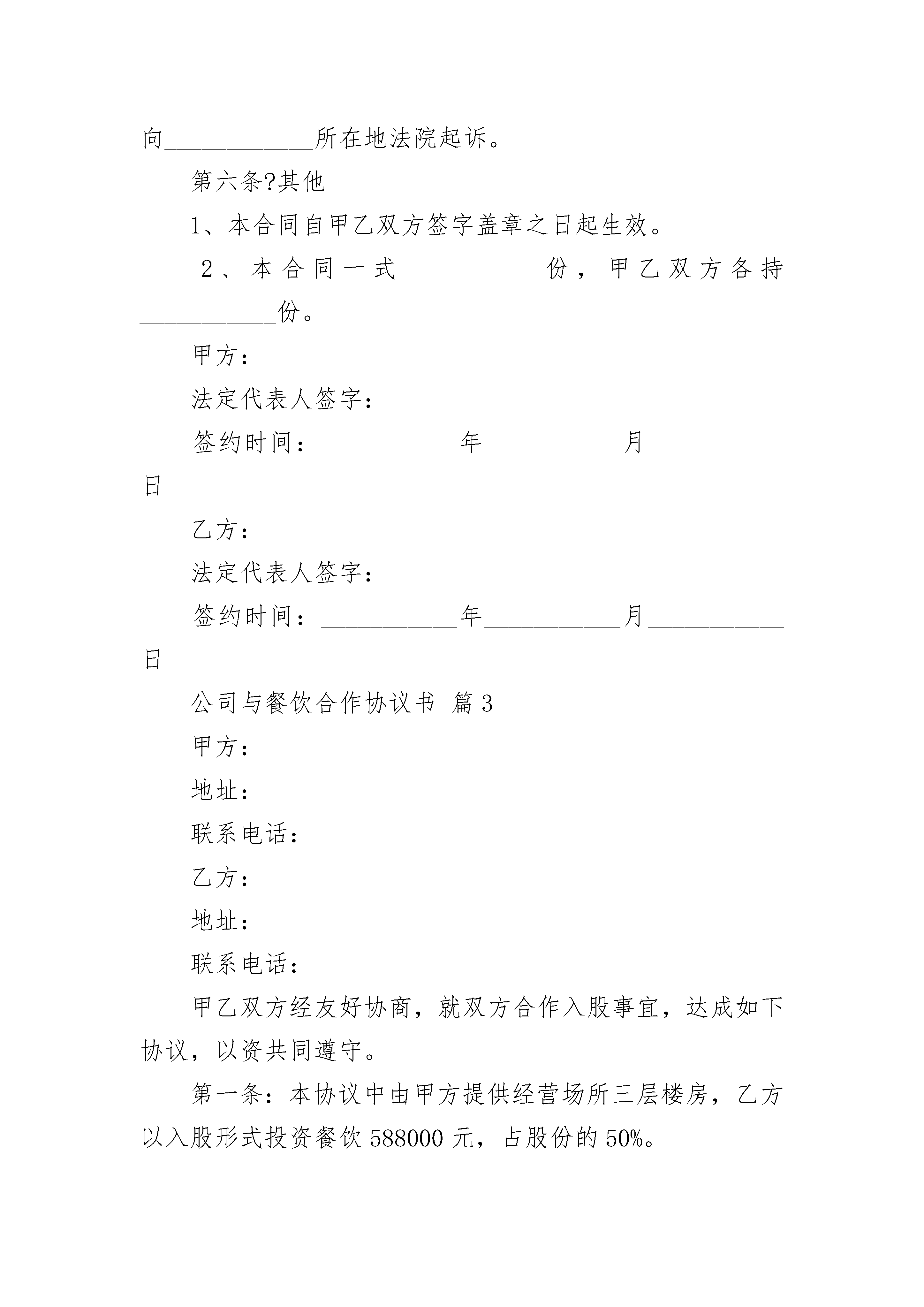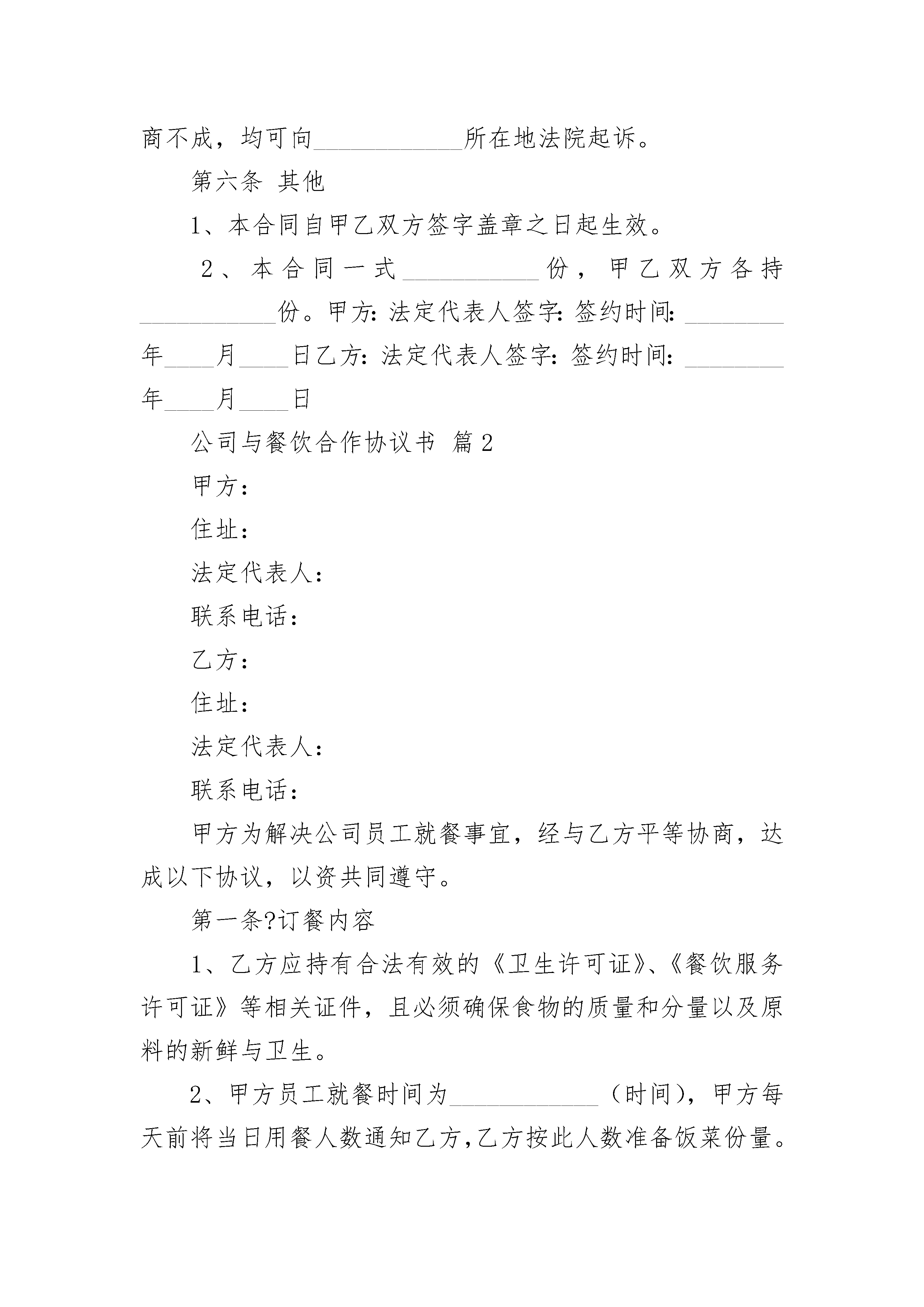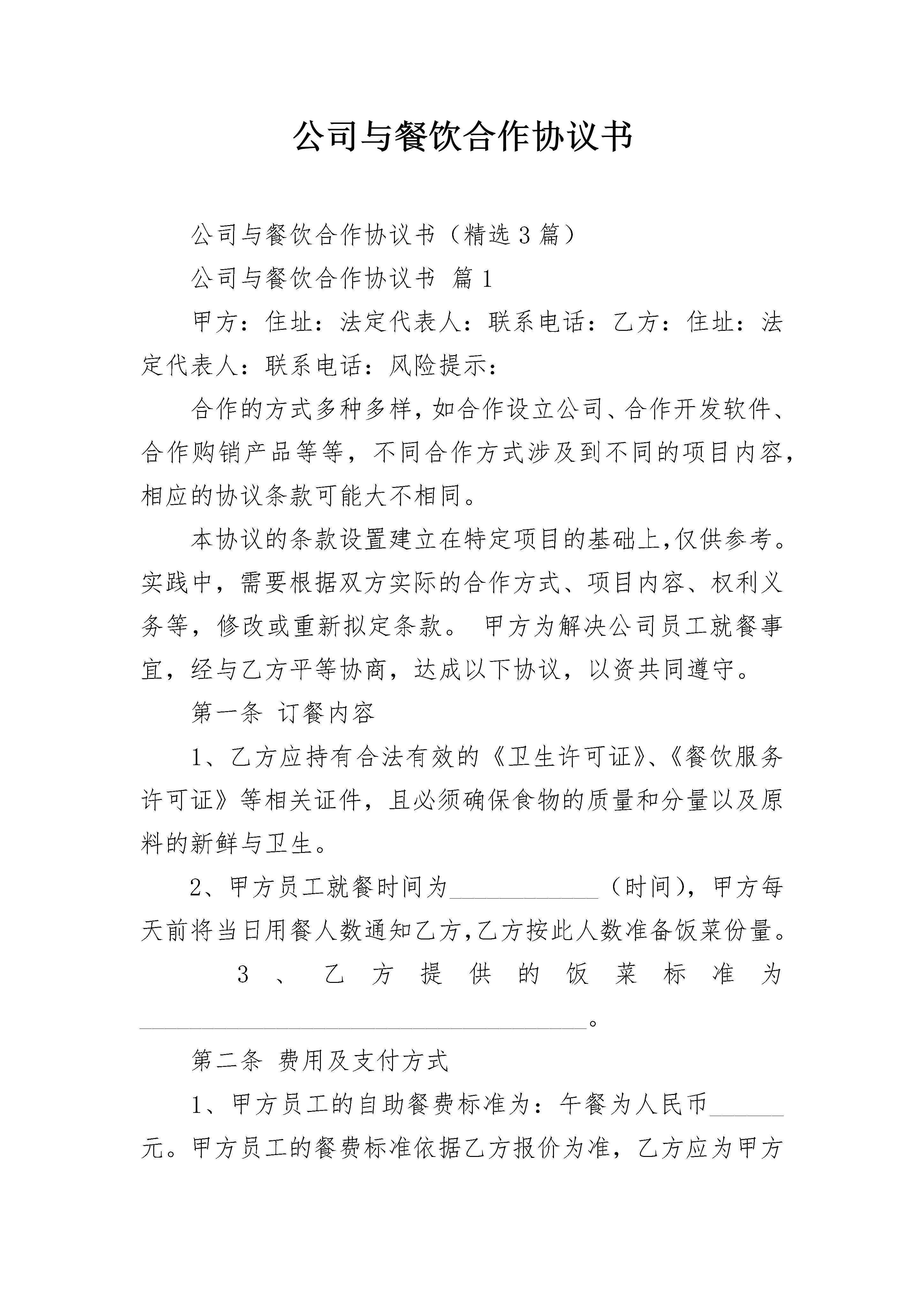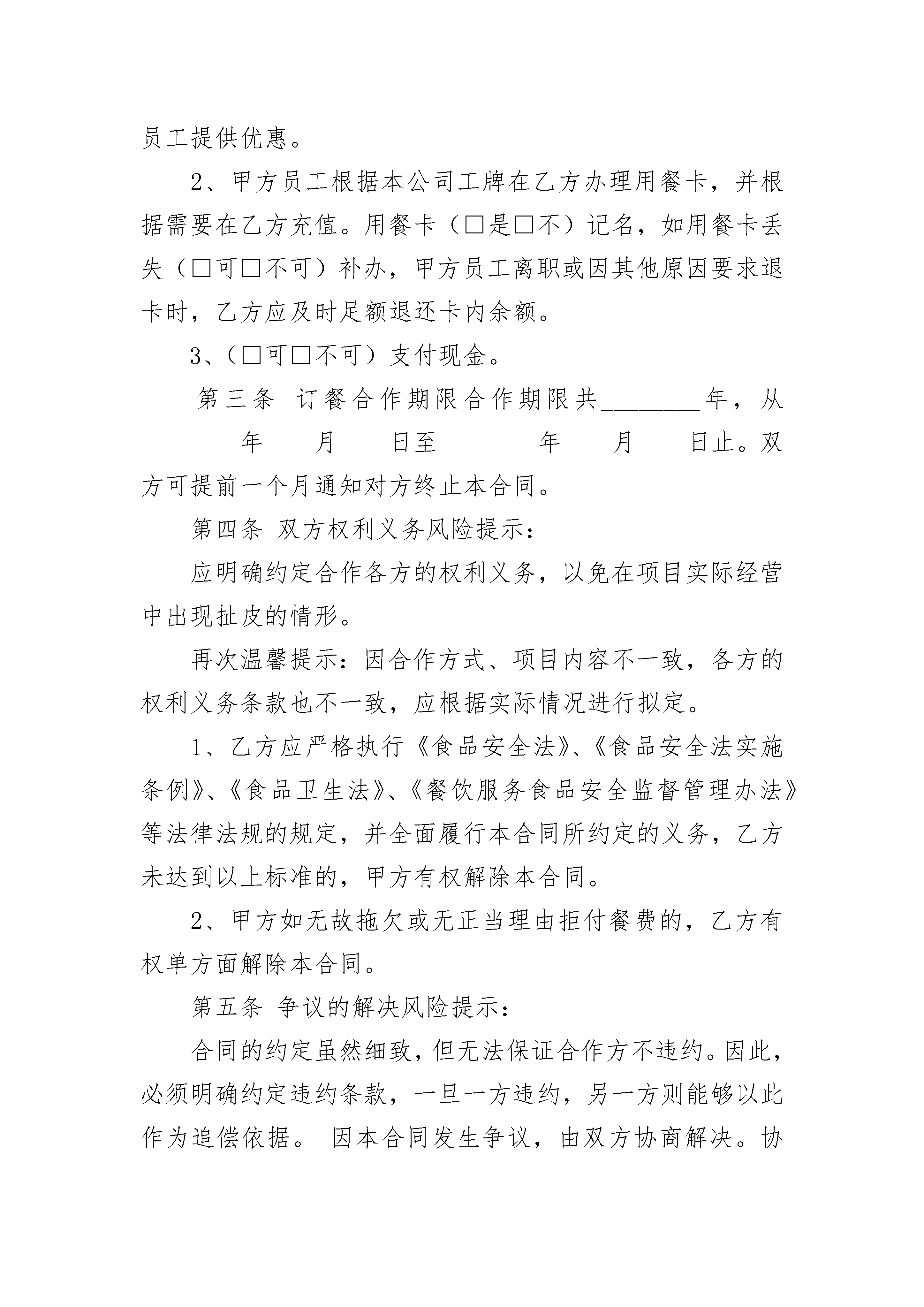 公司与餐饮合作协议书公司与餐饮合作协议书(精选3篇)公司与餐饮合作协议书篇1甲方:住址:法定代表人:联系电话:乙方:住址:法定代表人:联系电话:风险提示:合作的方式多种多样,如合作设立公司、合作开发软件、合作购销产品等等,不同合作方式涉及到不同的项目内容,相应的协议条款可能大不相同。本协议的条款设置建立在特定项目的基础上,仅供参考。实践中,需要根据双方实际的合作方式、项目内容、权利义务等,修改或重新拟定条款。甲方为解决公司员工就餐事宜,经与乙方平等协商,达成以下协议,以资共同遵守。第一条订餐内容1、乙方应持有合法有效的《卫生许可证》、《餐饮服务许可证》等相关证件,且必须确保食物的质量和分量以及原料的新鲜与卫生。2、甲方员工就餐时间为____________(时间),甲方每天前将当日用餐人数通知乙方,乙方按此人数准备饭菜份量。3、乙方提供的饭菜标准为____________________________________。第二条费用及支付方式1、甲方员工的自助餐费标准为:午餐为人民币______元。甲方员工的餐费标准依据乙方报价为准,乙方应为甲方员工提供优惠。2、甲方员工根据本公司工牌在乙方办理用餐卡,并根据需要在乙方充值。用餐卡(□是□不)记名,如用餐卡丢失(□可□不可)补办,甲方员工离职或因其他原因要求退卡时,乙方应及时足额退还卡内余额。3、(□可□不可)支付现金。第三条订餐合作期限合作期限共________年,从________年____月____日至________年____月____日止。双方可提前一个月通知对方终止本合同。第四条双方权利义务风险提示:应明确约定合作各方的权利义务,以免在项目实际经营中出现扯皮的情形。再次温馨提示:因合作方式、项目内容不一致,各方的权利义务条款也不一致,应根据实际情况进行拟定。1、乙方应严格执行《食品安全法》、《食品安全法实施条例》、《食品卫生法》、《餐饮服务食品安全监督管理办法》等法律法规的规定,并全面履行本合同所约定的义务,乙方未达到以上标准的,甲方有权解除本合同。2、甲方如无故拖欠或无正当理由拒付餐费的,乙方有权单方面解除本合同。第五条争议的解决风险提示:合同的约定虽然细致,但无法保证合作方不违约。因此,必须明确约定违约条款,一旦一方违约,另一方则能够以此作为追偿依据。因本合同发生争议,由双方协商解决。协商不成,均可向____________所在地法院起诉。第六条其他1、本合同自甲乙双方签字盖章之日起生效。2、本合同一式___________份,甲乙双方各持___________份。甲方:法定代表人签字:签约时间:________年____月____日乙方:法定代表人签字:签约时间:________年____月____日公司与餐饮合作协议书篇2甲方:住址:法定代表人:联系电话:乙方:住址:法定代表人:联系电话:甲方为解决公司员工就餐事宜,经与乙方平等协商,达成以下协议,以资共同遵守。第一条?订餐内容1、乙方应持有合法有效的《卫生许可证》、《餐饮服务许可证》等相关证件,且必须确保食物的质量和分量以及原料的新鲜与卫生。2、甲方员工就餐时间为____________(时间),甲方每天前将当日用餐人数通知乙方,乙方按此人数准备饭菜份量。3、乙方提供的饭菜标准为____________________________________。第二条?费用及支付方式1、甲方员工的自助餐费标准为:午餐为人民币______元。/甲方员工的餐费标准依据乙方报价为准,乙方应为甲方员工提供优惠。2、甲方员工根据本公司工牌在乙方办理用餐卡,并根据需要在乙方充值。用餐卡(□是□不)记名,如用餐卡丢失(□可□不可)补办,甲方员工离职或因其他原因要求退卡时,乙方应及时足额退还卡内余额。3、(□可□不可)支付现金。第三条?订餐合作期限合作期限共____________年,从______年____月____日至______年____月___日止。双方可提前一个月通知对方终止本合同。第四条?双方权利义务1、乙方应严格执行《食品安全法》、《食品安全法实施条例》、《食品卫生法》、《餐饮服务食品安全监督管理办法》等法律法规的规定,并全面履行本合同所约定的义务,乙方未达到以上标准的,甲方有权解除本合同。2、甲方如无故拖欠或无正当理由拒付餐费的,乙方有权单方面解除本合同。第五条?争议的解决因本合同发生争议,由双方协商解决。协商不成,均可向____________所在地法院起诉。第六条?其他1、本合同自甲乙双方签字盖章之日起生效。2、本合同一式___________份,甲乙双方各持___________份。甲方:法定代表人签字:签约时间:___________年___________月___________日乙方:法定代表人签字:签