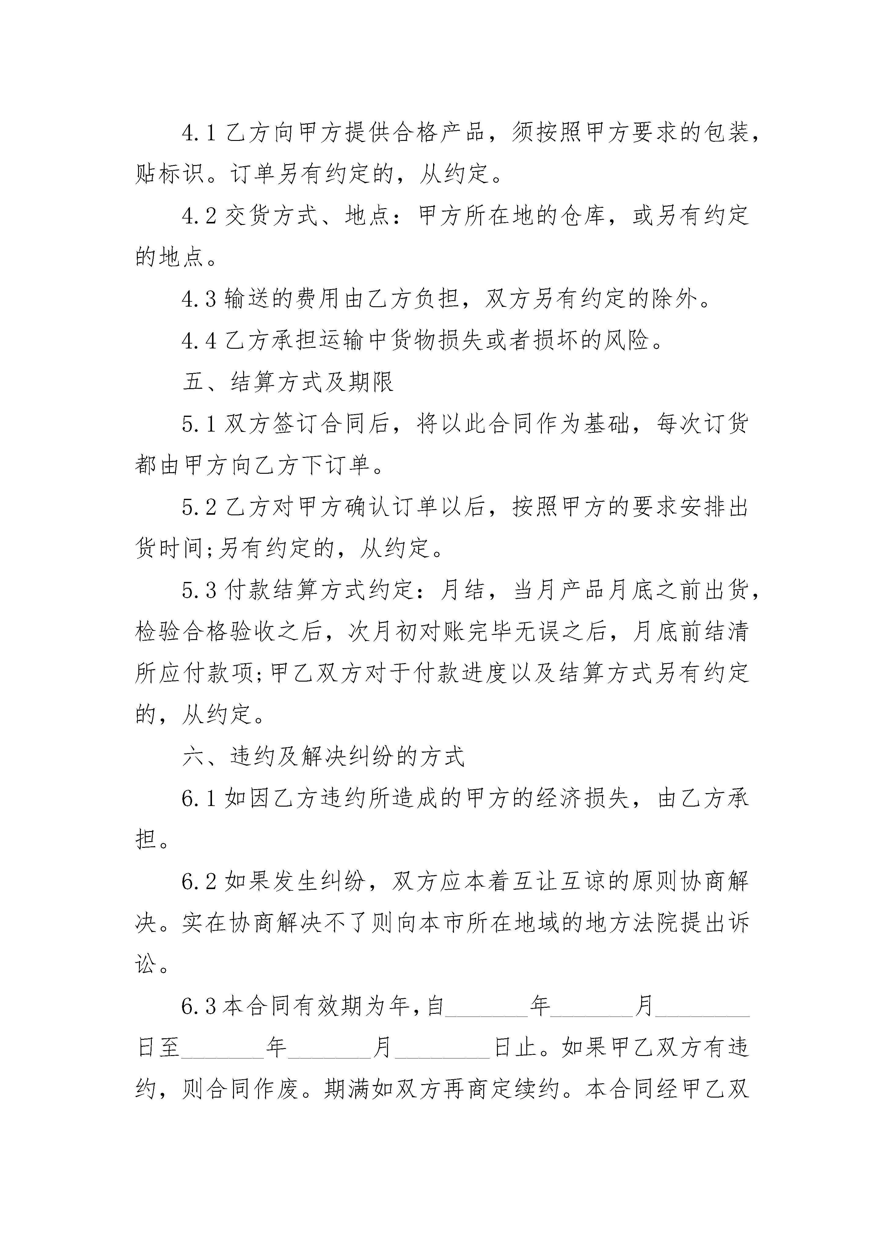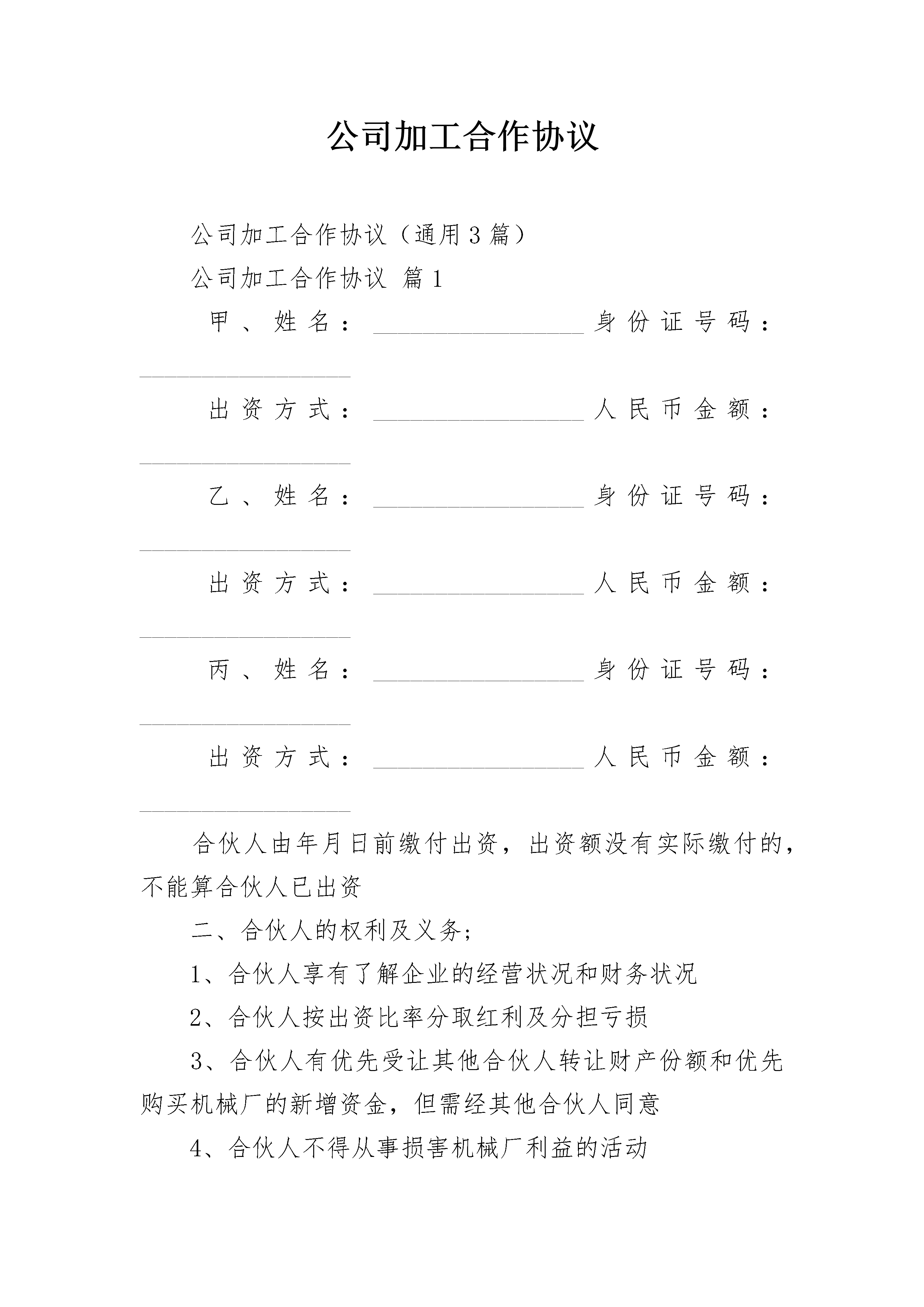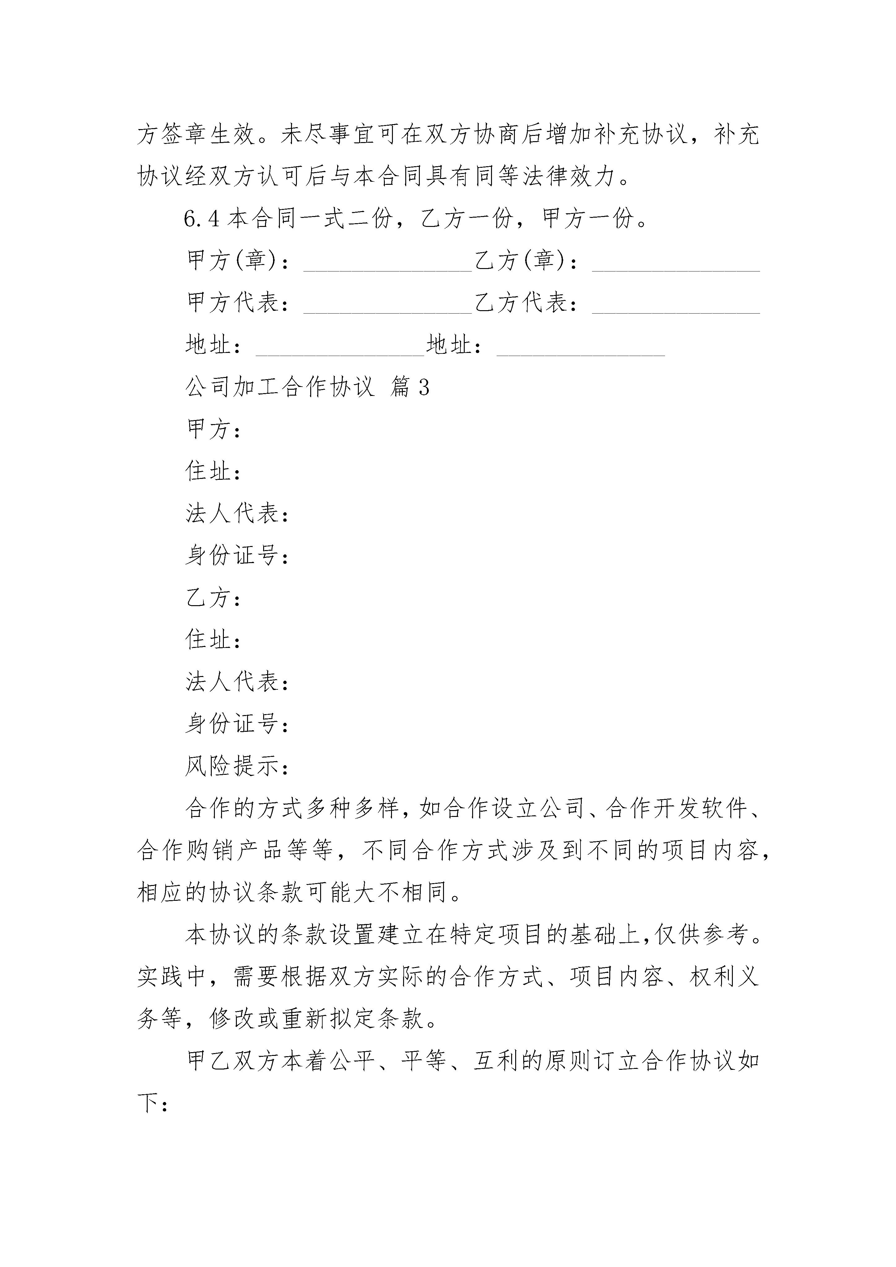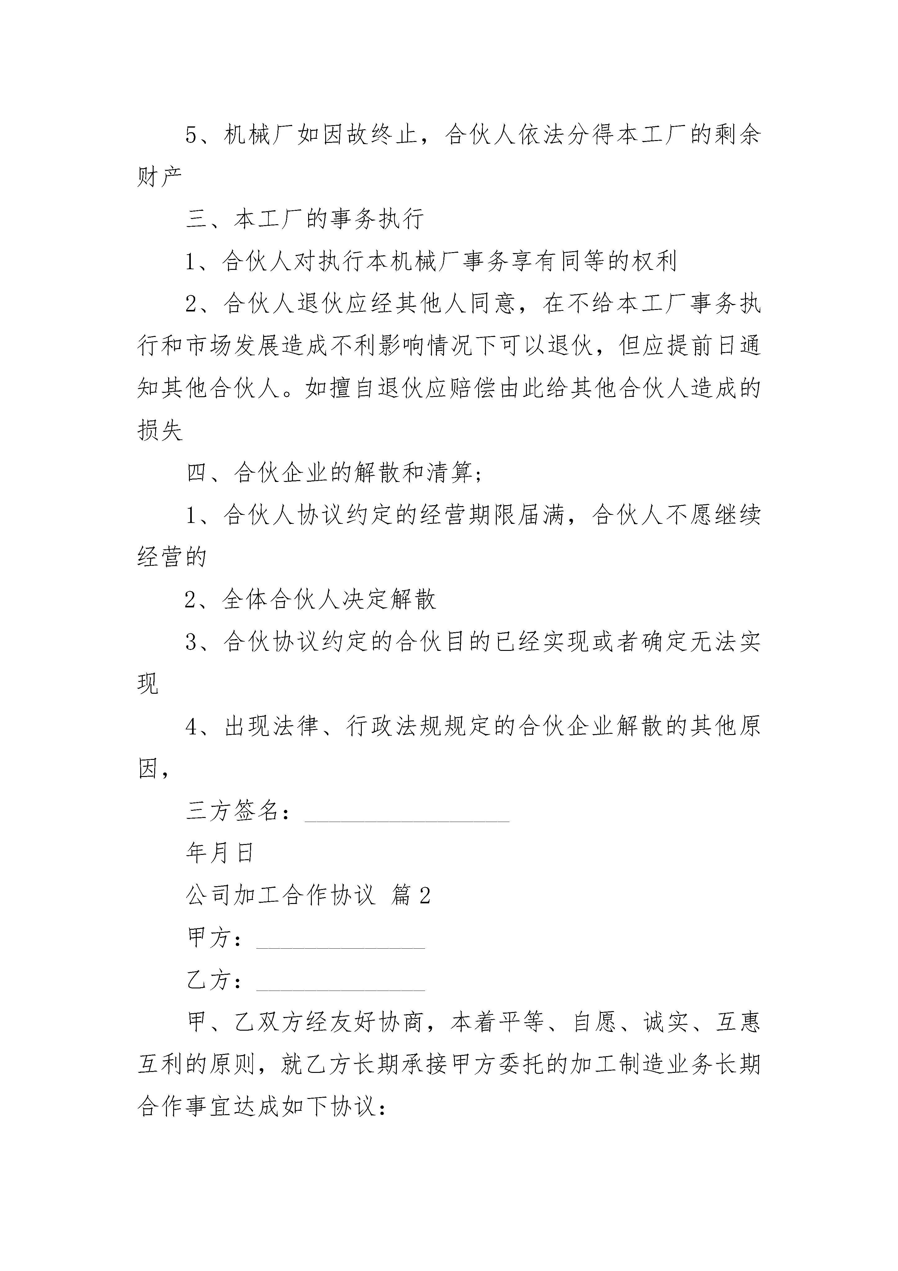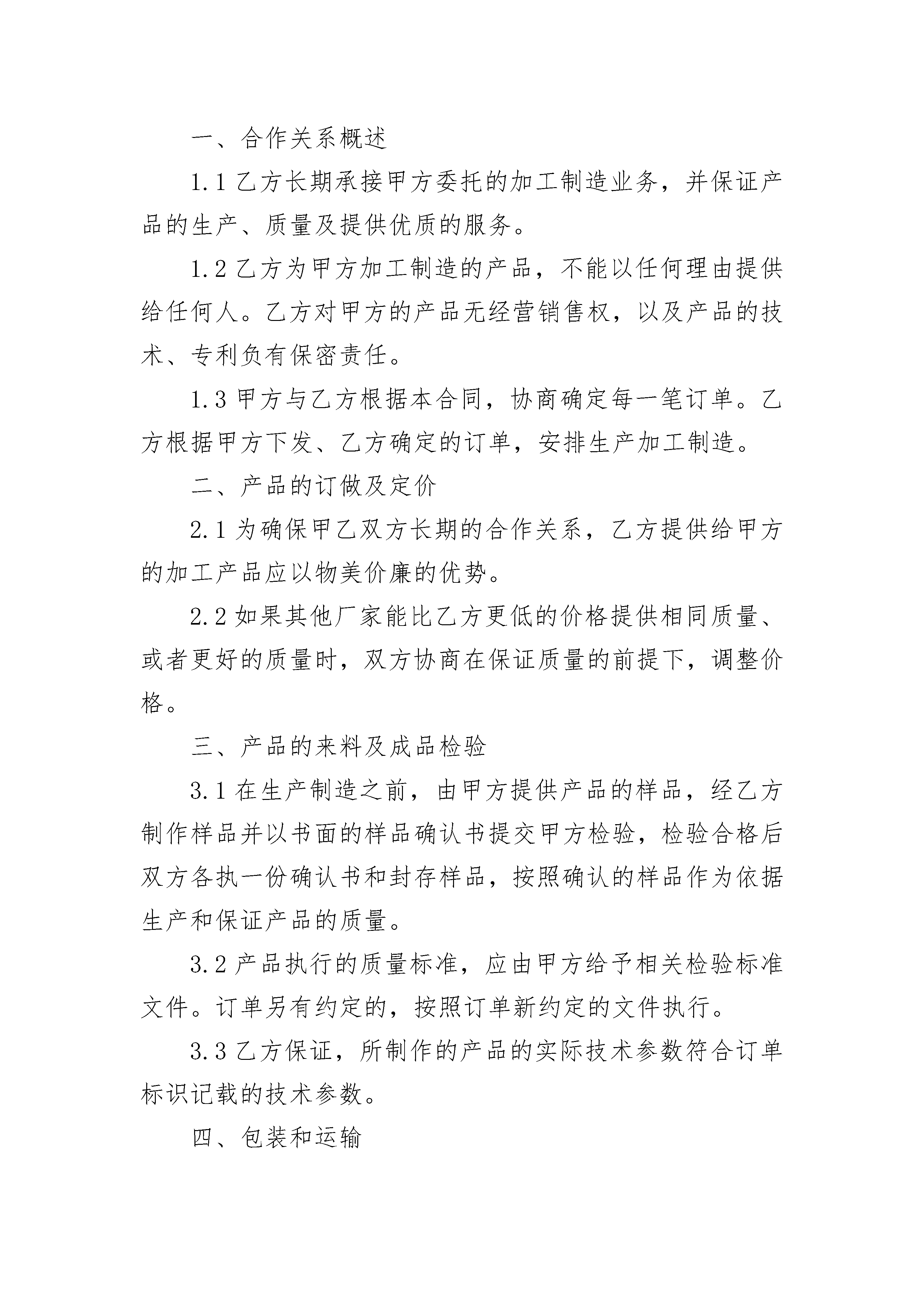 公司加工合作协议公司加工合作协议(通用3篇)公司加工合作协议篇1甲、姓名:_________________身份证号码:_________________出资方式:_________________人民币金额:_________________乙、姓名:_________________身份证号码:_________________出资方式:_________________人民币金额:_________________丙、姓名:_________________身份证号码:_________________出资方式:_________________人民币金额:_________________合伙人由年月日前缴付出资,出资额没有实际缴付的,不能算合伙人已出资二、合伙人的权利及义务;1、合伙人享有了解企业的经营状况和财务状况2、合伙人按出资比率分取红利及分担亏损3、合伙人有优先受让其他合伙人转让财产份额和优先购买机械厂的新增资金,但需经其他合伙人同意4、合伙人不得从事损害机械厂利益的活动5、机械厂如因故终止,合伙人依法分得本工厂的剩余财产三、本工厂的事务执行1、合伙人对执行本机械厂事务享有同等的权利2、合伙人退伙应经其他人同意,在不给本工厂事务执行和市场发展造成不利影响情况下可以退伙,但应提前日通知其他合伙人。如擅自退伙应赔偿由此给其他合伙人造成的损失四、合伙企业的解散和清算;1、合伙人协议约定的经营期限届满,合伙人不愿继续经营的2、全体合伙人决定解散3、合伙协议约定的合伙目的已经实现或者确定无法实现4、出现法律、行政法规规定的合伙企业解散的其他原因,三方签名:_________________年月日公司加工合作协议篇2甲方:______________乙方:______________甲、乙双方经友好协商,本着平等、自愿、诚实、互惠互利的原则,就乙方长期承接甲方委托的加工制造业务长期合作事宜达成如下协议:一、合作关系概述1.1乙方长期承接甲方委托的加工制造业务,并保证产品的生产、质量及提供优质的服务。1.2乙方为甲方加工制造的产品,不能以任何理由提供给任何人。乙方对甲方的产品无经营销售权,以及产品的技术、专利负有保密责任。1.3甲方与乙方根据本合同,协商确定每一笔订单。乙方根据甲方下发、乙方确定的订单,安排生产加工制造。二、产品的订做及定价2.1为确保甲乙双方长期的合作关系,乙方提供给甲方的加工产品应以物美价廉的优势。2.2如果其他厂家能比乙方更低的价格提供相同质量、或者更好的质量时,双方协商在保证质量的前提下,调整价格。三、产品的来料及成品检验3.1在生产制造之前,由甲方提供产品的样品,经乙方制作样品并以书面的样品确认书提交甲方检验,检验合格后双方各执一份确认书和封存样品,按照确认的样品作为依据生产和保证产品的质量。3.2产品执行的质量标准,应由甲方给予相关检验标准文件。订单另有约定的,按照订单新约定的文件执行。3.3乙方保证,所制作的产品的实际技术参数符合订单标识记载的技术参数。四、包装和运输4.1乙方向甲方提供合格产品,须按照甲方要求的包装,贴标识。订单另有约定的,从约定。4.2交货方式、地点:甲方所在地的仓库,或另有约定的地点。4.3输送的费用由乙方负担,双方另有约定的除外。4.4乙方承担运输中货物损失或者损坏的风险。五、结算方式及期限5.1双方签订合同后,将以此合同作为基础,每次订货都由甲方向乙方下订单。5.2乙方对甲方确认订单以后,按照甲方的要求安排出货时间;另有约定的,从约定。5.3付款结算方式约定:月结,当月产品月底之前出货,检验合格验收之后,次月初对账完毕无误之后,月底前结清所应付款项;甲乙双方对于付款进度以及结算方式另有约定的,从约定。六、违约及解决纠纷的方式6.1如因乙方违约所造成的甲方的经济损失,由乙方承担。6.2如果发生纠纷,双方应本着互让互谅的原则协商解决。实在协商解决不了则向本市所在地域的地方法院提出诉讼。6.3本合同有效期为年,自_______年_______月________日至_______年_______月________日止。如果甲乙双方有违约,则合同作废。期满如双方再商定续约。本合同经甲乙双方签章生效。未尽事宜可在双方协商后增加补充协议,补充协议经双方认可后与本合同具有同等法律效力。6.4本合同一式二份,乙方一份,甲方一份。甲方(章):______________乙方(章):______________甲方代表:______________乙方代表:______________地址:______________地址:______________公司加工合作协议篇3甲方:住址:法人代表:身份证号:乙方:住址:法人代表:身份证号:风险提示:合作的方式多种多样,如合作设立公司、合作开