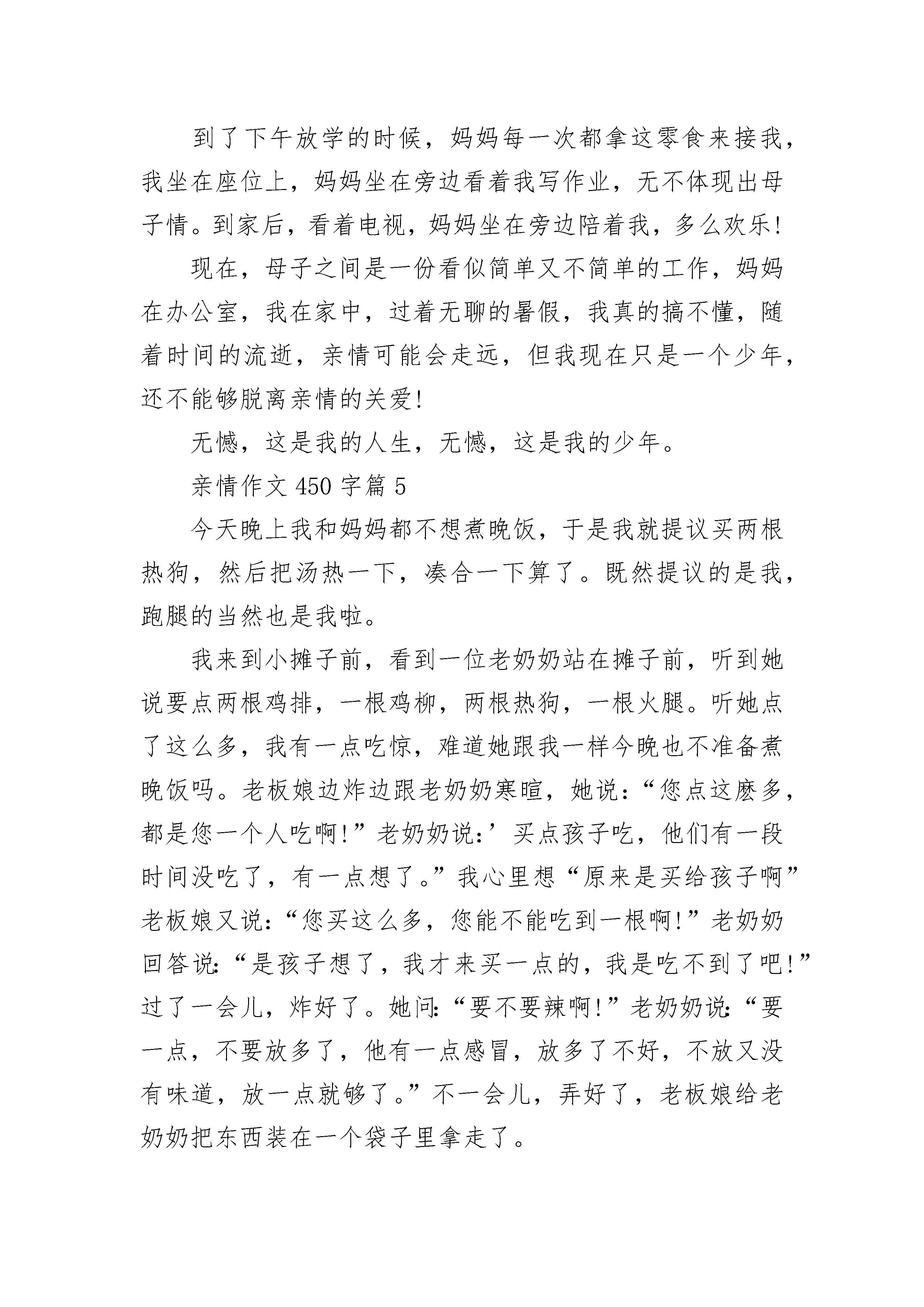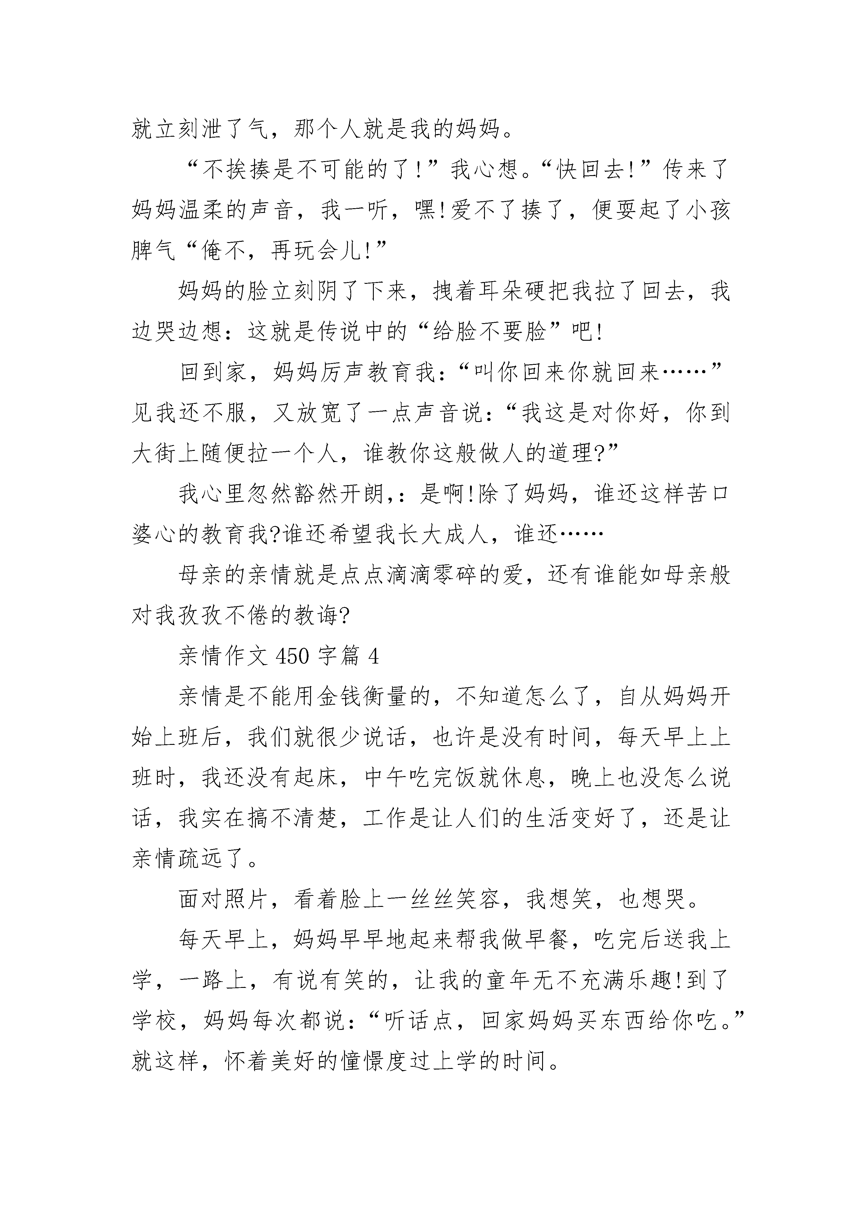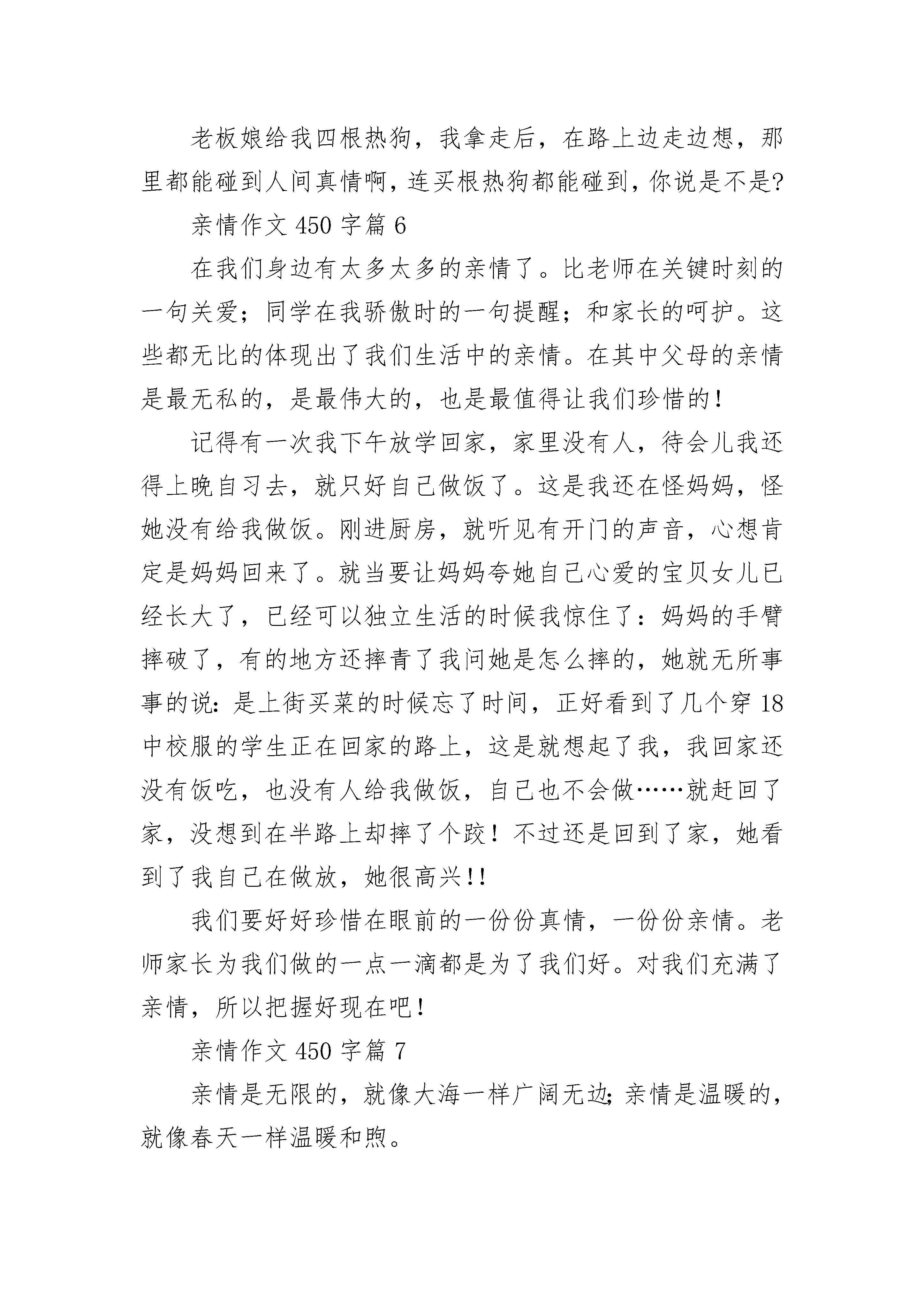 亲情作文450字范文10篇亲情是一盏指明灯,在漆黑的夜晚可以给你点亮前方。亲情是一个牵挂,不论去哪里,永远会有根线把彼此的心联系起来。亲情是一瓶水,渴了可以喝了解渴,旱了,可以滋润内心枯燥的甘泉。人人都说,母爱似水,父爱如山。母爱温柔似水的柔情,父爱深沉似山的沉稳,能够奏响了一曲幸福的爱之歌。从小开始我就爱哭,我的每一次哭,给家里人都增加了一份忙乱。记得一次,我发高烧了,晚上,是头晕目眩,朦胧中一束耀眼的光把我射醒,睁开眼,只见妈妈伏在桌上,再一看,妈妈正在看药的说明书。爸爸把我抱在怀里。妈妈则给我吃药,量体温。爸爸妈妈为了我的发烧一夜没睡。从一年级开始,妈妈每天早上都会早早起来送我上学,放学时早早在校门口等着我。从来都是她等我,直到四年级。这四年里,无论是严寒还是酷暑,狂风还是暴雨,他都会准时出现在那里。到五年级,我长大了,不需要家长忙了!我终于为父母减少了一点负担。亲情是无价的,任何东西都买不来亲情,失去了亲情,没有亲人的关怀,怎抹去你心中的伤痛?如果你感到了舒心,那一定是亲情,珍惜亲情吧!去感受亲情带来的温暖!亲情作文450字篇2在这整个世界里,亲情仿佛是一盏明亮的蜡烛闪着烛光;亲情仿佛又是一条棉被将我牢牢的躺在里面;亲情又仿佛是一鼓暖流,温暖你的心灵。当你感到无助时,回到家里得到的一声安慰、一份鼓舞是亲情;当你在外面饱受风吹雨打时,回到家里得到一碗热腾腾的汤是亲情;当你在外工作,亲人等你归来是亲情;当你……童年时代的我和外婆一起生活,她没有文化,却懂得什么是人生。每天早晨当公鸡报晓时,外婆就会起来准备早饭,看到时间差不多了,她就会到我床边把我叫醒,她就像是一台闹钟,会准时提醒我。在饭桌前落座,我会看到充满暖气的早餐。我吃早餐时外婆就帮我收拾书包,待我一下饭桌,就会把书包递给我。在我走出门口之前,她总会帮我弄好身上的衣服,最后摸摸我的小脑袋,笑着对我说:“快去上学!”每天放学回到家里,我总是先去完成作业,虽然饭桌上摆着外婆早已准备好的饭菜。她不识字,但总爱在我写作业的时候左看右看。晚上睡觉前她会为我把床铺平,最后看我睡下了,再把灯熄掉,自己才去休息。她给予我的是“最完美的服务。”亲情作文450字篇3其实,我们每一分、每一秒都浸泡在母亲的关爱之中,一个问候的眼神,一句嘘寒问暖的话语,甚至一声生气的责怪……这些都是爱,是母亲对我们的爱。在二年级的一天,我放学后在学校小院里玩卡,忘了时辰,太阳都升到正中间了也没回家。正玩得起劲时,我感觉后背被人拍了一下,就立刻转过头怒目而视。一看见人,我就立刻泄了气,那个人就是我的妈妈。“不挨揍是不可能的了!”我心想。“快回去!”传来了妈妈温柔的声音,我一听,嘿!爱不了揍了,便耍起了小孩脾气“俺不,再玩会儿!”妈妈的脸立刻阴了下来,拽着耳朵硬把我拉了回去,我边哭边想:这就是传说中的“给脸不要脸”吧!回到家,妈妈厉声教育我:“叫你回来你就回来……”见我还不服,又放宽了一点声音说:“我这是对你好,你到大街上随便拉一个人,谁教你这般做人的道理?”我心里忽然豁然开朗,:是啊!除了妈妈,谁还这样苦口婆心的教育我?谁还希望我长大成人,谁还……母亲的亲情就是点点滴滴零碎的爱,还有谁能如母亲般对我孜孜不倦的教诲?亲情作文450字篇4亲情是不能用金钱衡量的,不知道怎么了,自从妈妈开始上班后,我们就很少说话,也许是没有时间,每天早上上班时,我还没有起床,中午吃完饭就休息,晚上也没怎么说话,我实在搞不清楚,工作是让人们的生活变好了,还是让亲情疏远了。面对照片,看着脸上一丝丝笑容,我想笑,也想哭。每天早上,妈妈早早地起来帮我做早餐,吃完后送我上学,一路上,有说有笑的,让我的童年无不充满乐趣!到了学校,妈妈每次都说:“听话点,回家妈妈买东西给你吃。”就这样,怀着美好的憧憬度过上学的时间。到了下午放学的时候,妈妈每一次都拿这零食来接我,我坐在座位上,妈妈坐在旁边看着我写作业,无不体现出母子情。到家后,看着电视,妈妈坐在旁边陪着我,多么欢乐!现在,母子之间是一份看似简单又不简单的工作,妈妈在办公室,我在家中,过着无聊的暑假,我真的搞不懂,随着时间的流逝,亲情可能会走远,但我现在只是一个少年,还不能够脱离亲情的关爱!无憾,这是我的人生,无憾,这是我的少年。亲情作文450字篇5今天晚上我和妈妈都不想煮晚饭,于是我就提议买两根热狗,然后把汤热一下,凑合一下算了。既然提议的是我,跑腿的当然也是我啦。我来到小摊子前,看到一位老奶奶站在摊子前,听到她说要点两根鸡排,一根鸡柳,两根热狗,一根火腿。听她点了这么多,我有一点吃惊,难道她跟我一样今晚也不准备煮晚饭吗。老板娘边炸边跟老奶奶寒暄,她说:“您点这麽多,都是您一个人吃啊!”老奶奶说:’买点孩子吃,他们有一段时间没吃了,有一点想了。”我心里想“原来是买给孩子啊”老板娘又说:“您买这