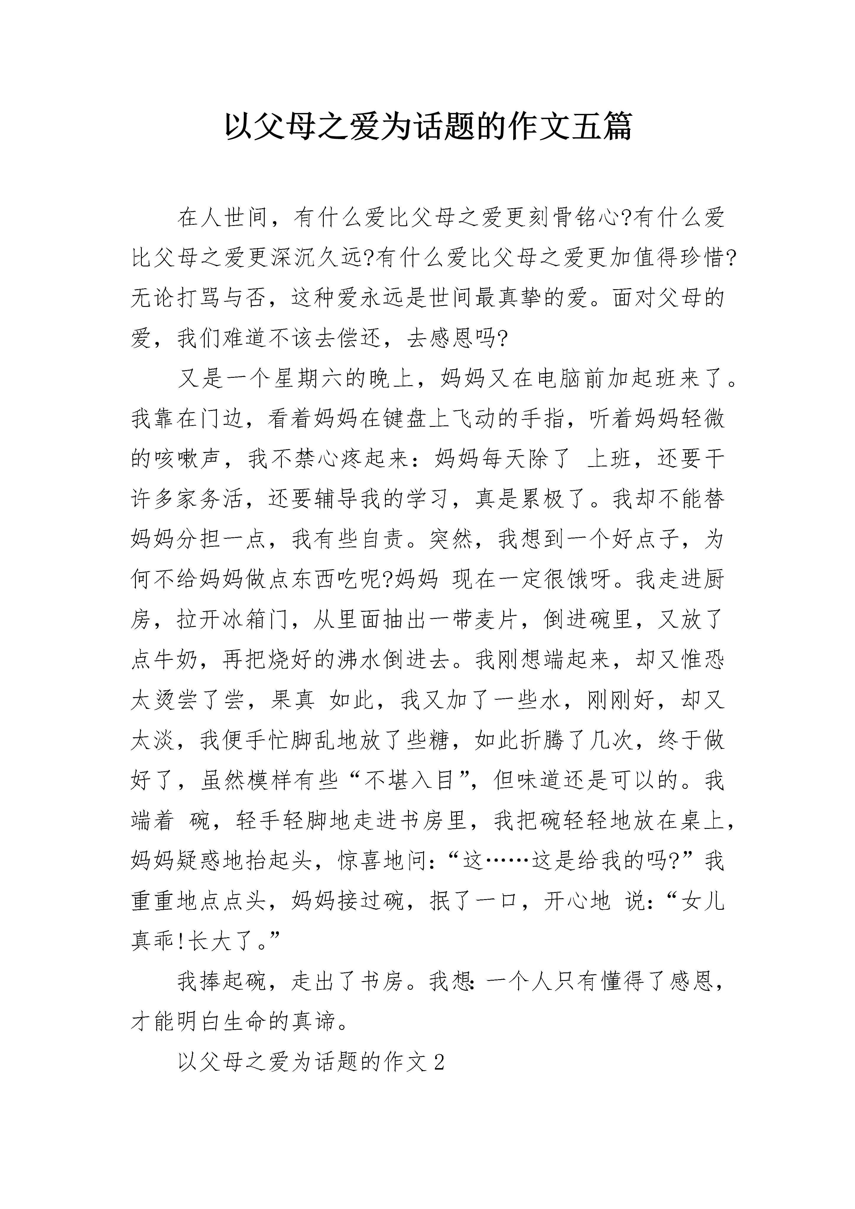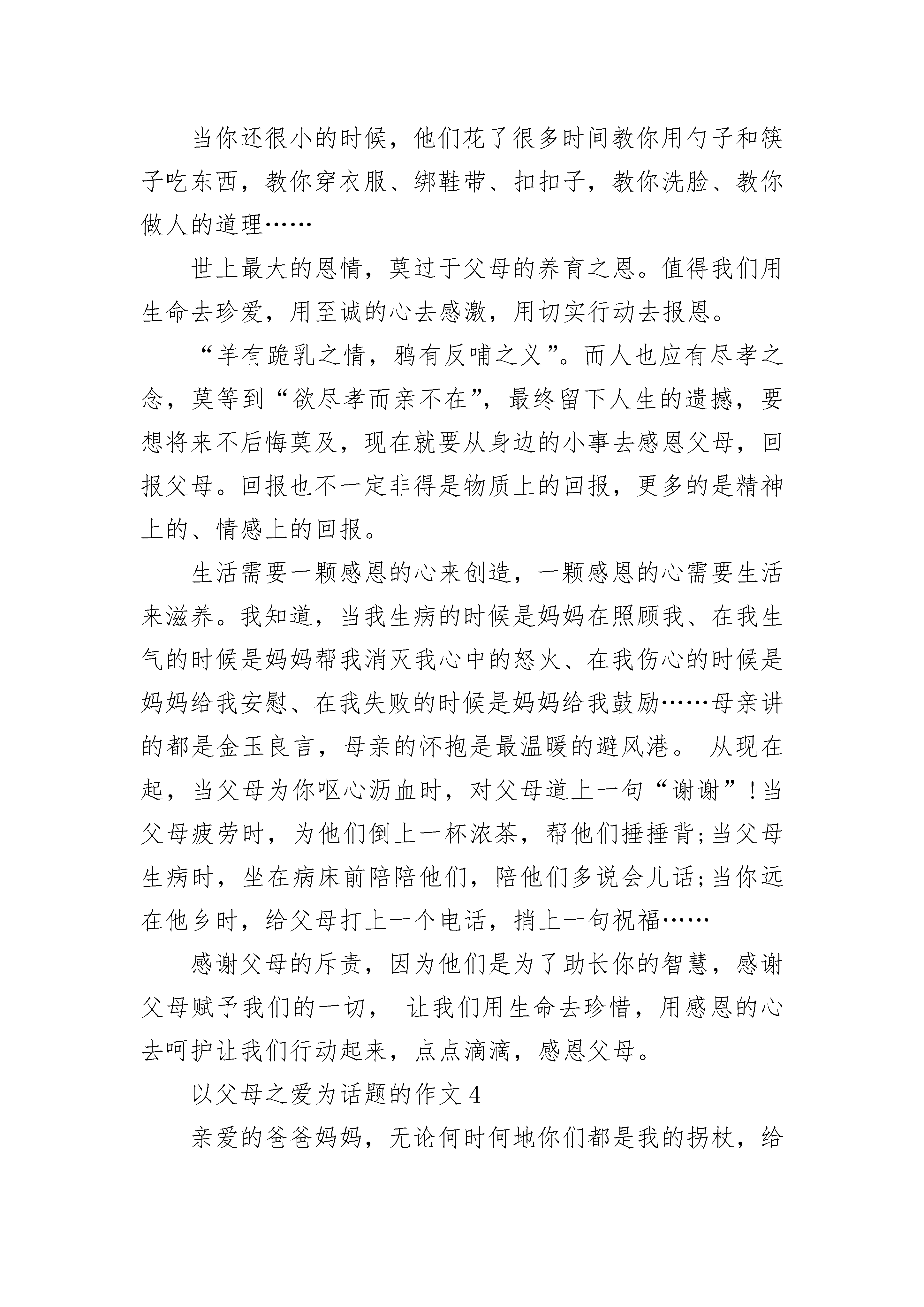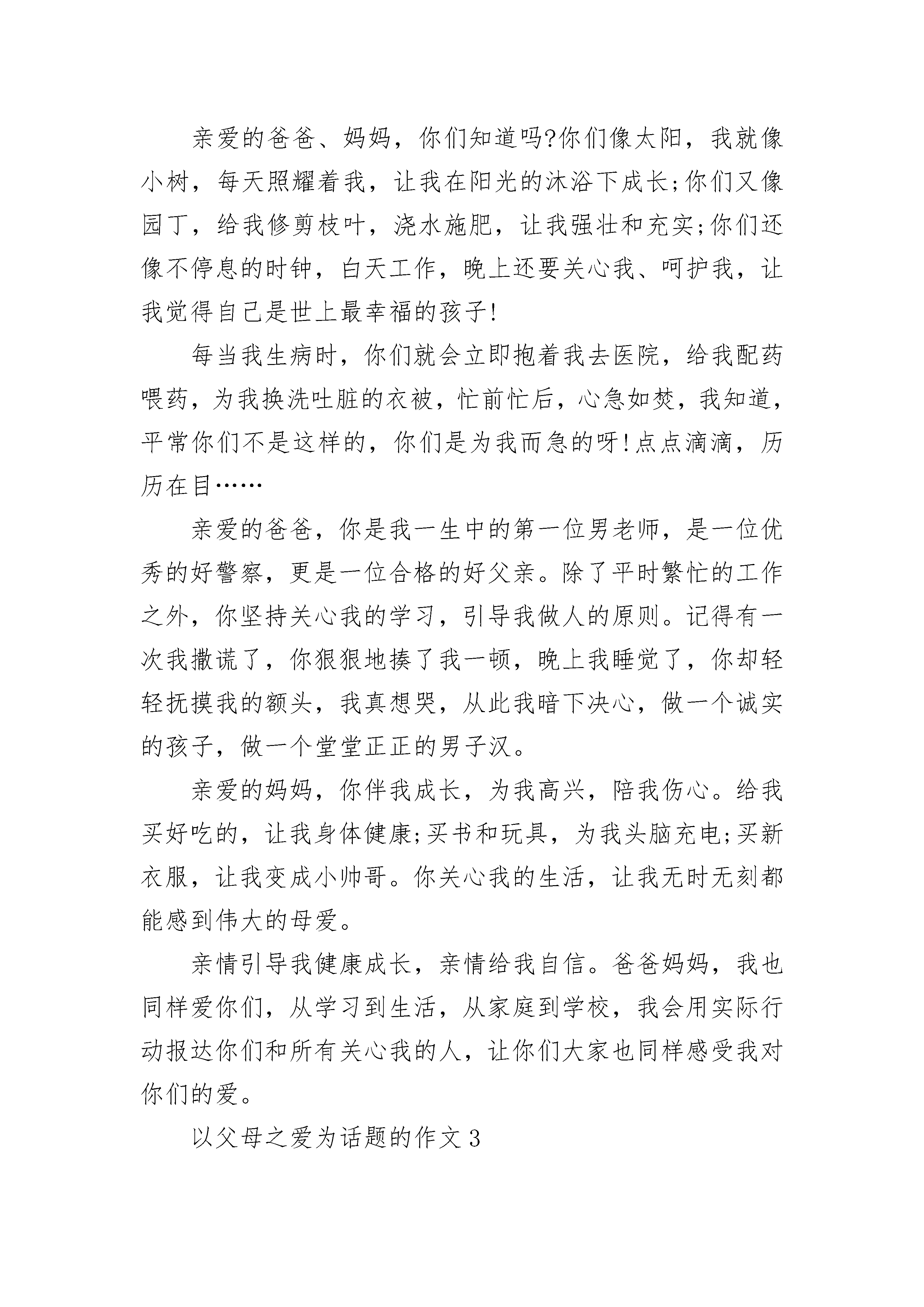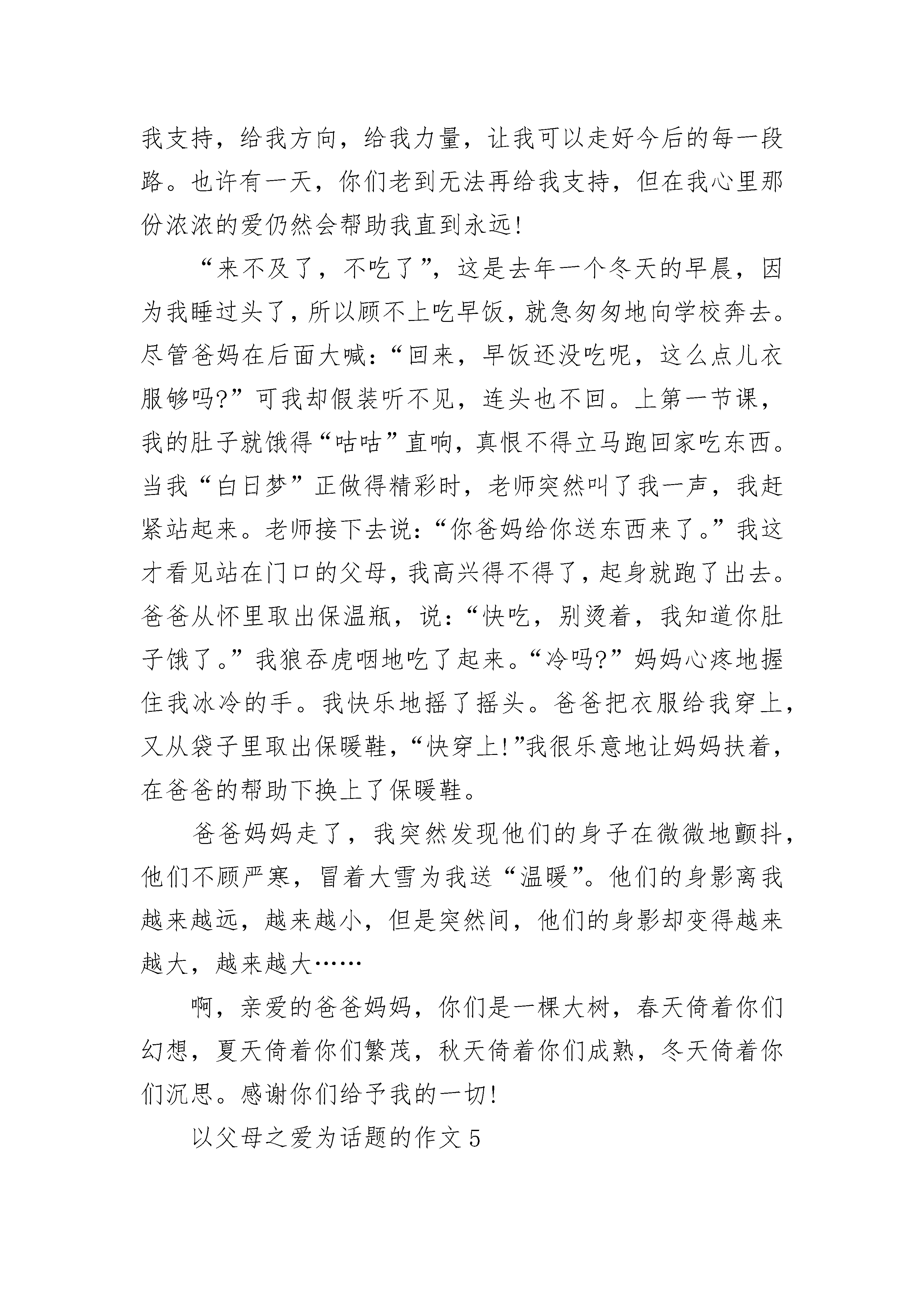 以父母之爱为话题的作文五篇在人世间,有什么爱比父母之爱更刻骨铭心?有什么爱比父母之爱更深沉久远?有什么爱比父母之爱更加值得珍惜?无论打骂与否,这种爱永远是世间最真挚的爱。面对父母的爱,我们难道不该去偿还,去感恩吗?又是一个星期六的晚上,妈妈又在电脑前加起班来了。我靠在门边,看着妈妈在键盘上飞动的手指,听着妈妈轻微的咳嗽声,我不禁心疼起来:妈妈每天除了上班,还要干许多家务活,还要辅导我的学习,真是累极了。我却不能替妈妈分担一点,我有些自责。突然,我想到一个好点子,为何不给妈妈做点东西吃呢?妈妈现在一定很饿呀。我走进厨房,拉开冰箱门,从里面抽出一带麦片,倒进碗里,又放了点牛奶,再把烧好的沸水倒进去。我刚想端起来,却又惟恐太烫尝了尝,果真如此,我又加了一些水,刚刚好,却又太淡,我便手忙脚乱地放了些糖,如此折腾了几次,终于做好了,虽然模样有些“不堪入目”,但味道还是可以的。我端着碗,轻手轻脚地走进书房里,我把碗轻轻地放在桌上,妈妈疑惑地抬起头,惊喜地问:“这……这是给我的吗?”我重重地点点头,妈妈接过碗,抿了一口,开心地说:“女儿真乖!长大了。”我捧起碗,走出了书房。我想:一个人只有懂得了感恩,才能明白生命的真谛。以父母之爱为话题的作文2亲爱的爸爸、妈妈,你们知道吗?你们像太阳,我就像小树,每天照耀着我,让我在阳光的沐浴下成长;你们又像园丁,给我修剪枝叶,浇水施肥,让我强壮和充实;你们还像不停息的时钟,白天工作,晚上还要关心我、呵护我,让我觉得自己是世上最幸福的孩子!每当我生病时,你们就会立即抱着我去医院,给我配药喂药,为我换洗吐脏的衣被,忙前忙后,心急如焚,我知道,平常你们不是这样的,你们是为我而急的呀!点点滴滴,历历在目……亲爱的爸爸,你是我一生中的第一位男老师,是一位优秀的好警察,更是一位合格的好父亲。除了平时繁忙的工作之外,你坚持关心我的学习,引导我做人的原则。记得有一次我撒谎了,你狠狠地揍了我一顿,晚上我睡觉了,你却轻轻抚摸我的额头,我真想哭,从此我暗下决心,做一个诚实的孩子,做一个堂堂正正的男子汉。亲爱的妈妈,你伴我成长,为我高兴,陪我伤心。给我买好吃的,让我身体健康;买书和玩具,为我头脑充电;买新衣服,让我变成小帅哥。你关心我的生活,让我无时无刻都能感到伟大的母爱。亲情引导我健康成长,亲情给我自信。爸爸妈妈,我也同样爱你们,从学习到生活,从家庭到学校,我会用实际行动报达你们和所有关心我的人,让你们大家也同样感受我对你们的爱。以父母之爱为话题的作文3当你还很小的时候,他们花了很多时间教你用勺子和筷子吃东西,教你穿衣服、绑鞋带、扣扣子,教你洗脸、教你做人的道理……世上最大的恩情,莫过于父母的养育之恩。值得我们用生命去珍爱,用至诚的心去感激,用切实行动去报恩。“羊有跪乳之情,鸦有反哺之义”。而人也应有尽孝之念,莫等到“欲尽孝而亲不在”,最终留下人生的遗撼,要想将来不后悔莫及,现在就要从身边的小事去感恩父母,回报父母。回报也不一定非得是物质上的回报,更多的是精神上的、情感上的回报。生活需要一颗感恩的心来创造,一颗感恩的心需要生活来滋养。我知道,当我生病的时候是妈妈在照顾我、在我生气的时候是妈妈帮我消灭我心中的怒火、在我伤心的时候是妈妈给我安慰、在我失败的时候是妈妈给我鼓励……母亲讲的都是金玉良言,母亲的怀抱是最温暖的避风港。从现在起,当父母为你呕心沥血时,对父母道上一句“谢谢”!当父母疲劳时,为他们倒上一杯浓茶,帮他们捶捶背;当父母生病时,坐在病床前陪陪他们,陪他们多说会儿话;当你远在他乡时,给父母打上一个电话,捎上一句祝福……感谢父母的斥责,因为他们是为了助长你的智慧,感谢父母赋予我们的一切,让我们用生命去珍惜,用感恩的心去呵护让我们行动起来,点点滴滴,感恩父母。以父母之爱为话题的作文4亲爱的爸爸妈妈,无论何时何地你们都是我的拐杖,给我支持,给我方向,给我力量,让我可以走好今后的每一段路。也许有一天,你们老到无法再给我支持,但在我心里那份浓浓的爱仍然会帮助我直到永远!“来不及了,不吃了”,这是去年一个冬天的早晨,因为我睡过头了,所以顾不上吃早饭,就急匆匆地向学校奔去。尽管爸妈在后面大喊:“回来,早饭还没吃呢,这么点儿衣服够吗?”可我却假装听不见,连头也不回。上第一节课,我的肚子就饿得“咕咕”直响,真恨不得立马跑回家吃东西。当我“白日梦”正做得精彩时,老师突然叫了我一声,我赶紧站起来。老师接下去说:“你爸妈给你送东西来了。”我这才看见站在门口的父母,我高兴得不得了,起身就跑了出去。爸爸从怀里取出保温瓶,说:“快吃,别烫着,我知道你肚子饿了。”我狼吞虎咽地吃了起来。“冷吗?”妈妈心疼地握住我冰冷的手。我快乐地摇了摇头。爸爸把衣服给我穿上,又从袋子里取出保暖鞋,“快穿上!”我很乐意地让妈妈扶着,在爸爸的帮助下换上了保暖鞋。爸爸妈
