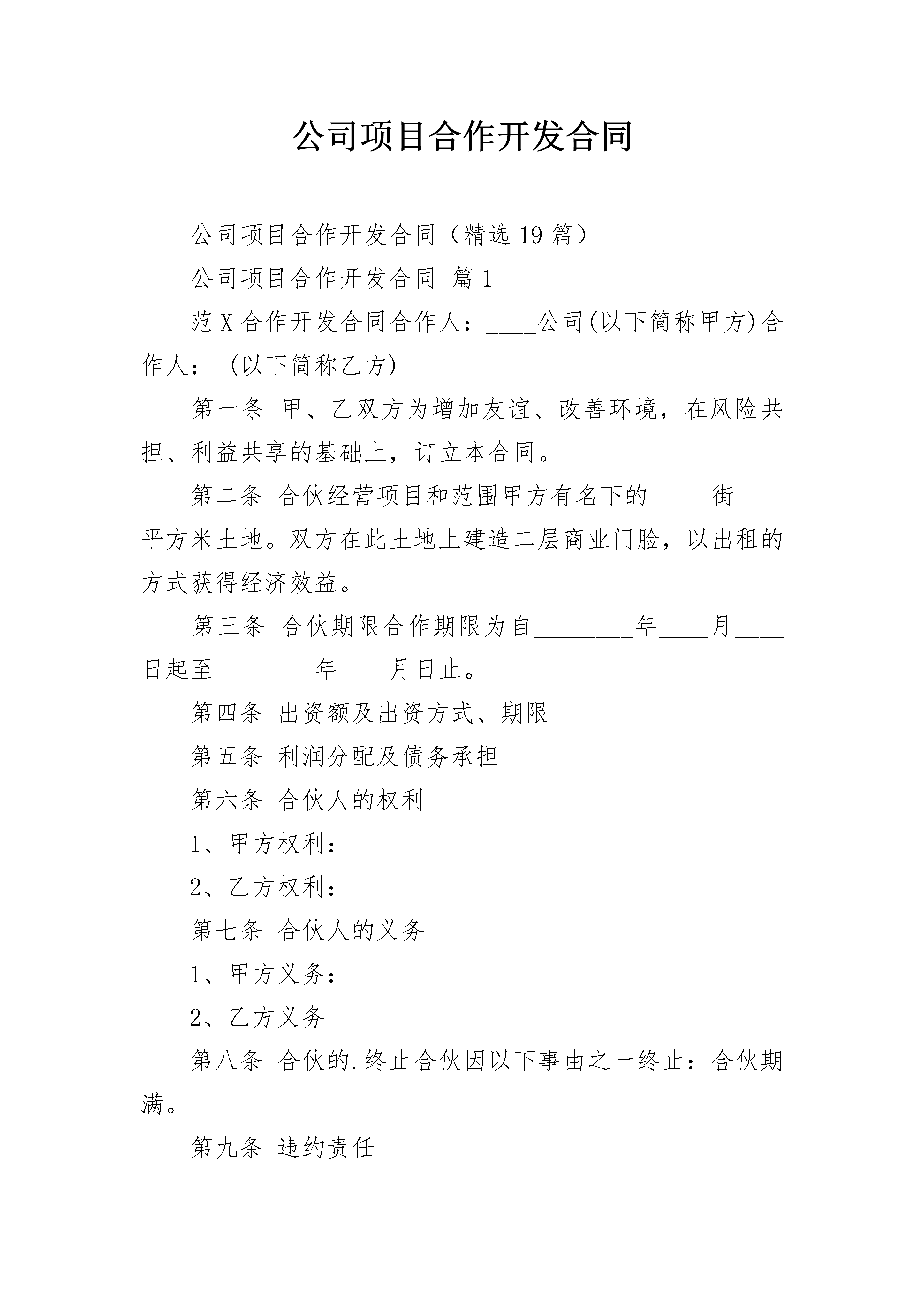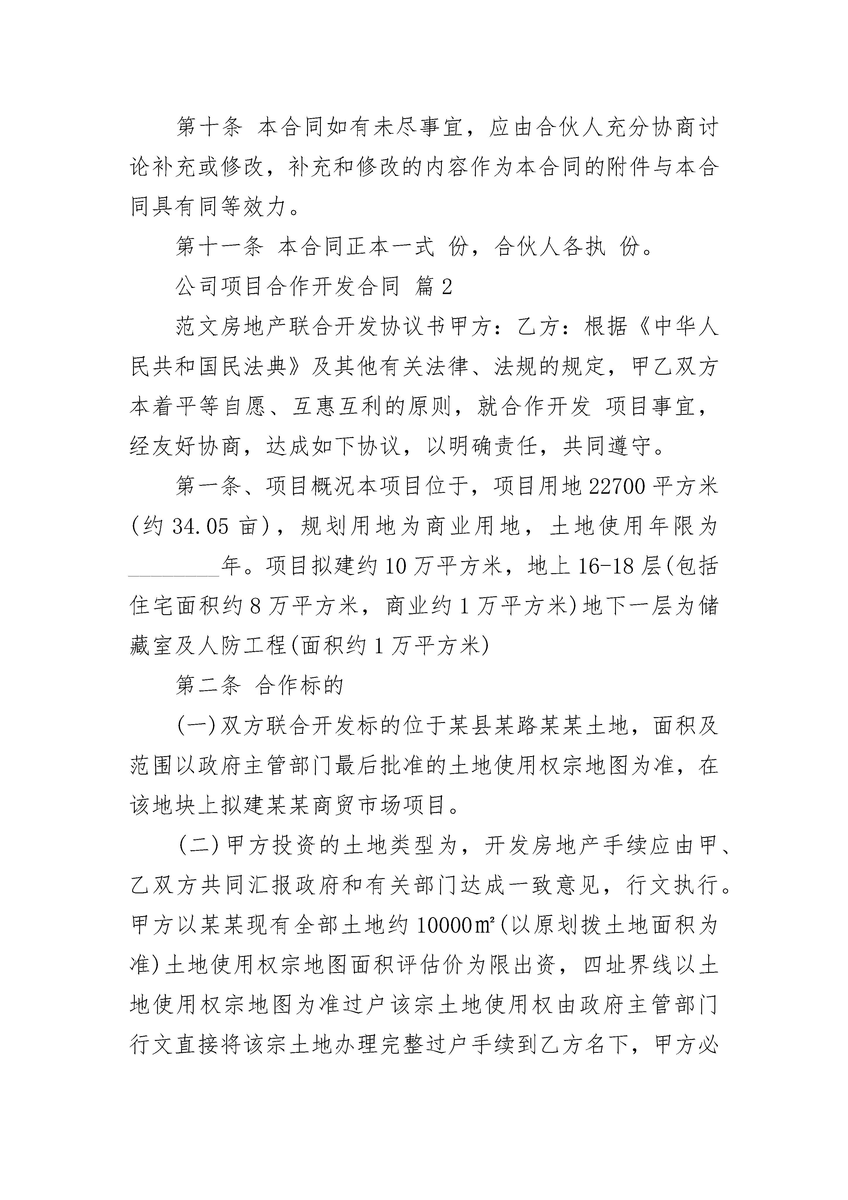 公司项目合作开发合同公司项目合作开发合同(精选19篇)公司项目合作开发合同篇1范X合作开发合同合作人:____公司(以下简称甲方)合作人:(以下简称乙方)第一条甲、乙双方为增加友谊、改善环境,在风险共担、利益共享的基础上,订立本合同。第二条合伙经营项目和范围甲方有名下的_____街____平方米土地。双方在此土地上建造二层商业门脸,以出租的方式获得经济效益。第三条合伙期限合作期限为自________年____月____日起至________年____月日止。第四条出资额及出资方式、期限第五条利润分配及债务承担第六条合伙人的权利1、甲方权利:2、乙方权利:第七条合伙人的义务1、甲方义务:2、乙方义务第八条合伙的.终止合伙因以下事由之一终止:合伙期满。第九条违约责任第十条本合同如有未尽事宜,应由合伙人充分协商讨论补充或修改,补充和修改的内容作为本合同的附件与本合同具有同等效力。第十一条本合同正本一式份,合伙人各执份。公司项目合作开发合同篇2范文房地产联合开发协议书甲方:乙方:根据《中华人民共和国民法典》及其他有关法律、法规的规定,甲乙双方本着平等自愿、互惠互利的原则,就合作开发项目事宜,经友好协商,达成如下协议,以明确责任,共同遵守。第一条、项目概况本项目位于,项目用地22700平方米(约34.05亩),规划用地为商业用地,土地使用年限为________年。项目拟建约10万平方米,地上16-18层(包括住宅面积约8万平方米,商业约1万平方米)地下一层为储藏室及人防工程(面积约1万平方米)第二条合作标的(一)双方联合开发标的位于某县某路某某土地,面积及范围以政府主管部门最后批准的土地使用权宗地图为准,在该地块上拟建某某商贸市场项目。(二)甲方投资的土地类型为,开发房地产手续应由甲、乙双方共同汇报政府和有关部门达成一致意见,行文执行。甲方以某某现有全部土地约10000㎡(以原划拨土地面积为准)土地使用权宗地图面积评估价为限出资,四址界线以土地使用权宗地图为准过户该宗土地使用权由政府主管部门行文直接将该宗土地办理完整过户手续到乙方名下,甲方必须提供相关资料手续。过户契税由乙方负责,其他费用由甲方承担。(三)甲方投资联合开发的该宗土地,应合法无任何纠纷,如因该宗土地四址界限图内遗留产生的纠纷,以及相关民事责任和经济责任由甲方负责解决,所发生的费用由甲方全部承担;如因该宗土地宗地图外新规划涉及到周边相邻单位及居民因建设所发生的纠纷由乙方解决,产生的费用由乙方承担,与甲方无关。该项目建设实施中需甲方提供的相关资料和需要甲方出面协商的,甲方应积极提供并参与协调。第三条合作方式(一)甲方将其拥有的某某土地按某县国土资源局编制的基准地价进行评估,将其评估价格作为合作出资份额。(二)乙方负责该项目开发资金筹集、工程前期的报批、对规划设计单位、工程监理单位及施工单位的选择和确定、工程的营造、工程款支付、房屋销售、工程的验收以及工程竣工后材料的备案、房屋的保修、物业管理单位的选择等事项,并承担该项目的全部法律责任。第四条合作时间甲乙双方合作时间从签订本协议时起,到全部条款履行完毕后止。全部条款履行完毕应理解为:⑴该项目工程完全按照设计图纸全部建设完毕;⑵该项目的销售部分的房屋销售完毕或甲乙双方认为销售完毕的;⑶该项目完成各种行政报批手续、办理各种竣工手续、完成法律、法规、政策规定的其他手续的;⑷其他双方认为应该完成的事项。第五条项目规模建筑规模按乙方报审的经政府主管部门最后批准的方案为准。第六条利益分成(一)在该项目方案确定后,经甲乙双方协商后大致确定分给甲方商品房的位置及楼层。(二)在该项目竣工后,乙方根据甲方所投入的该地块的评估价格,按当时该项目商品房价格划分与该地块的评估价同等价格的商品房给甲方,甲方所得商品房应缴纳的各种税费和应办理的各种手续由甲方自行负责。第七条甲方的权利和义务(一)落实合作开发项目用地规划手续,办理合建项目占地的使用地规划批文,土地使用权人为乙方,土地使用不附带第三者的利益限制。(二)落实合作开发项目占地的规划报建工作。(三)完成合作开发项目规划用地的拆迁、安置及补偿工作。(四)若乙方自筹资金不足确需贷款,乙方会通甲方后,以项目名义向银行贷款,甲方有权监督乙方使用该银行贷款的情况。(五)甲方应及时配合乙方办理有关项目报批、工程施工、销售等手续。(六)甲方应及时缴纳本协议规定的由甲方缴纳的各种税费,否则由此产生的各种责任与乙方无关。第八条乙方的权利和义务(一)乙方委托二狗同志全权负责该项目的开发资金筹集、工程前期的报批、对规划设计单位、工程监理单位、施工单位的选择和确定、工程的营造、工程款支付、房屋销售、工程的验收以及工程竣工后材料的备案、房屋的保修、物业管理单位的选择等事项。(二)为使该项目如期完工,实现较好的39;经济效