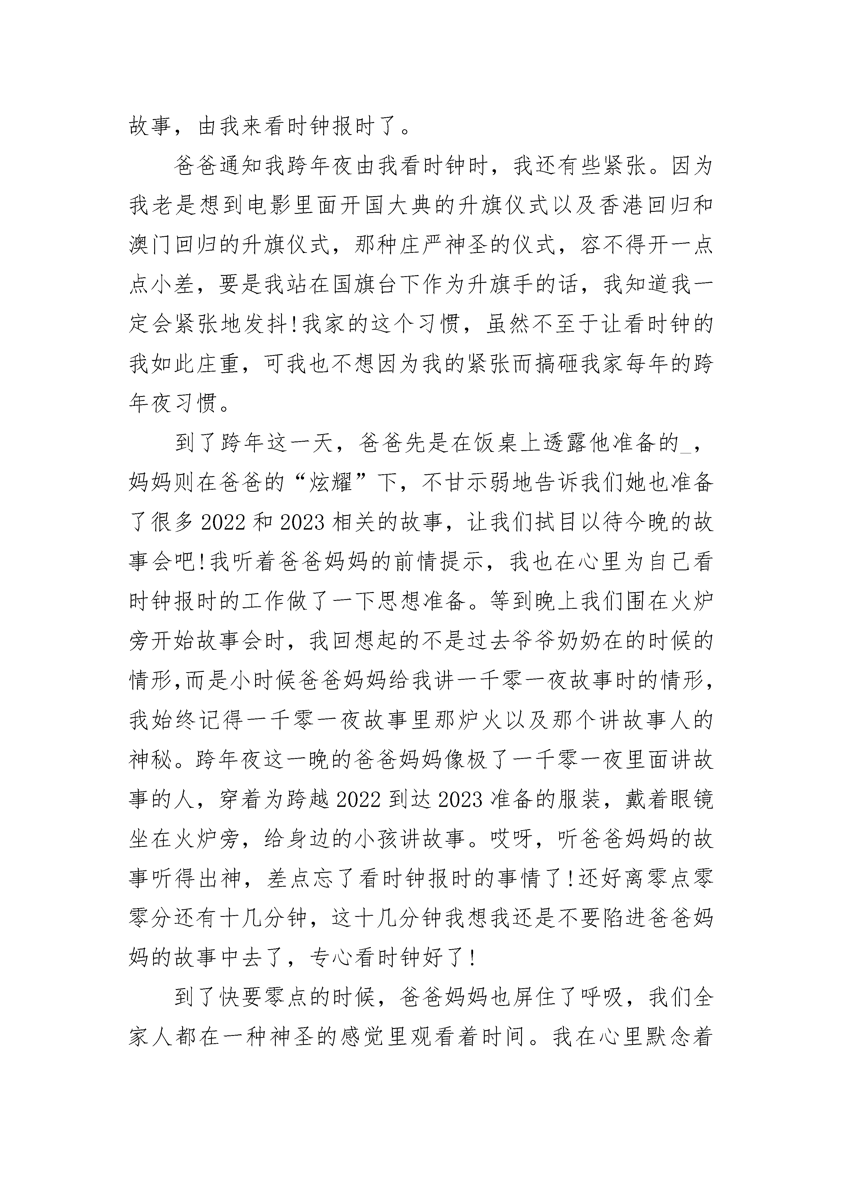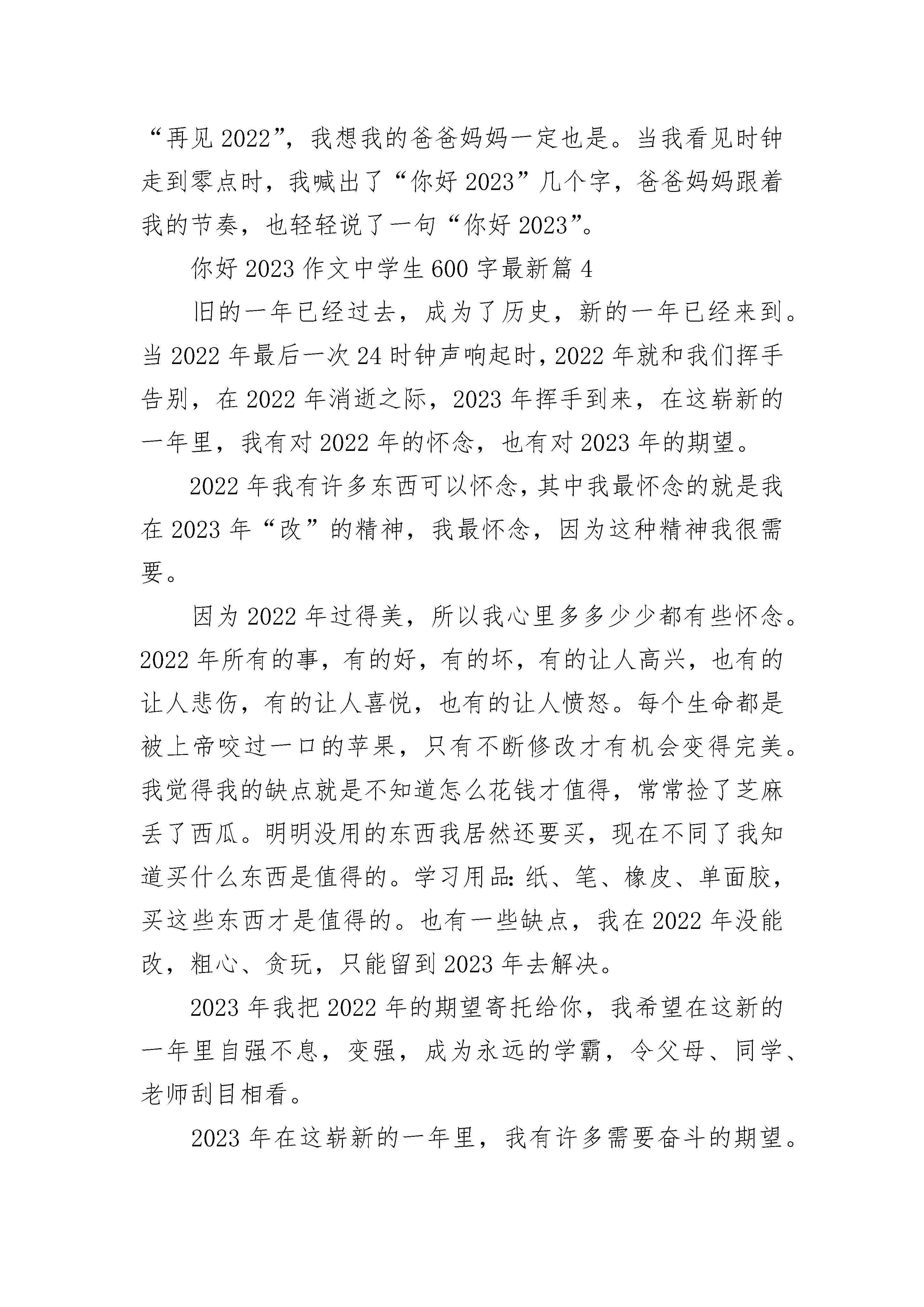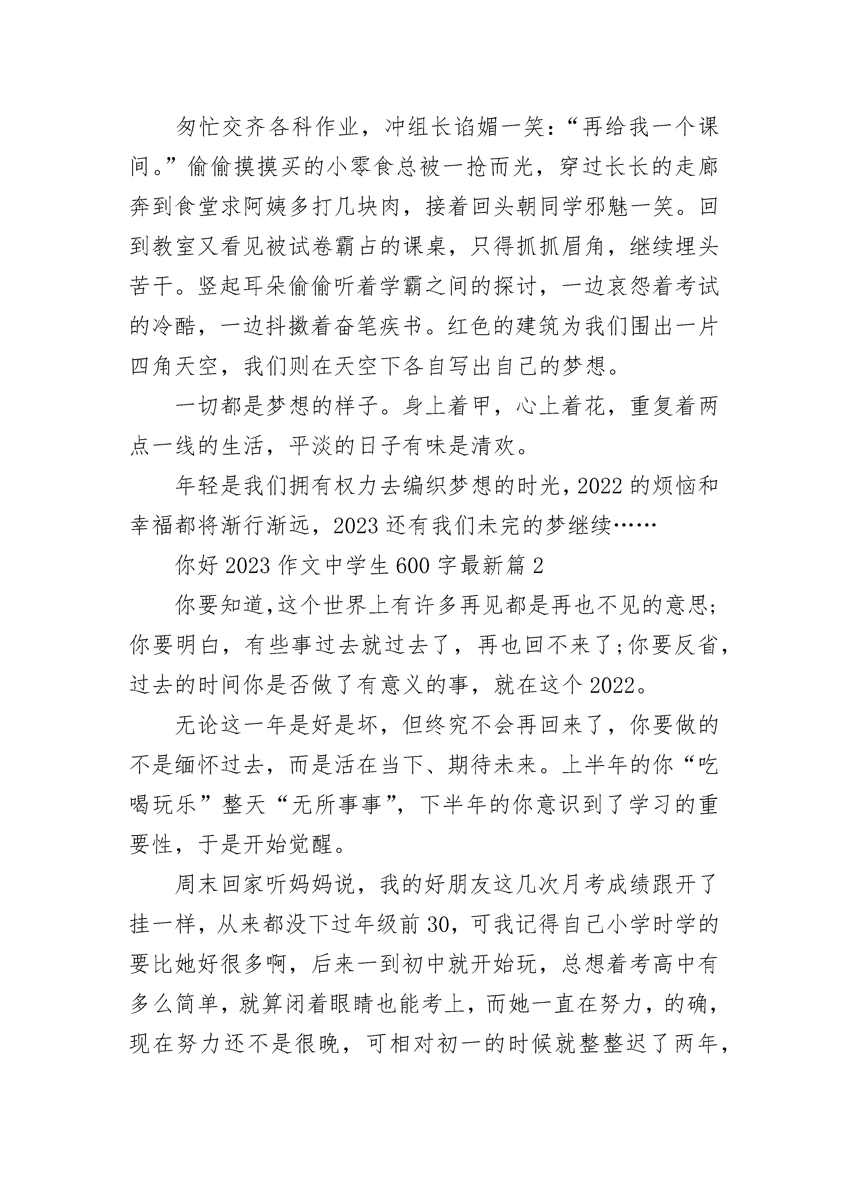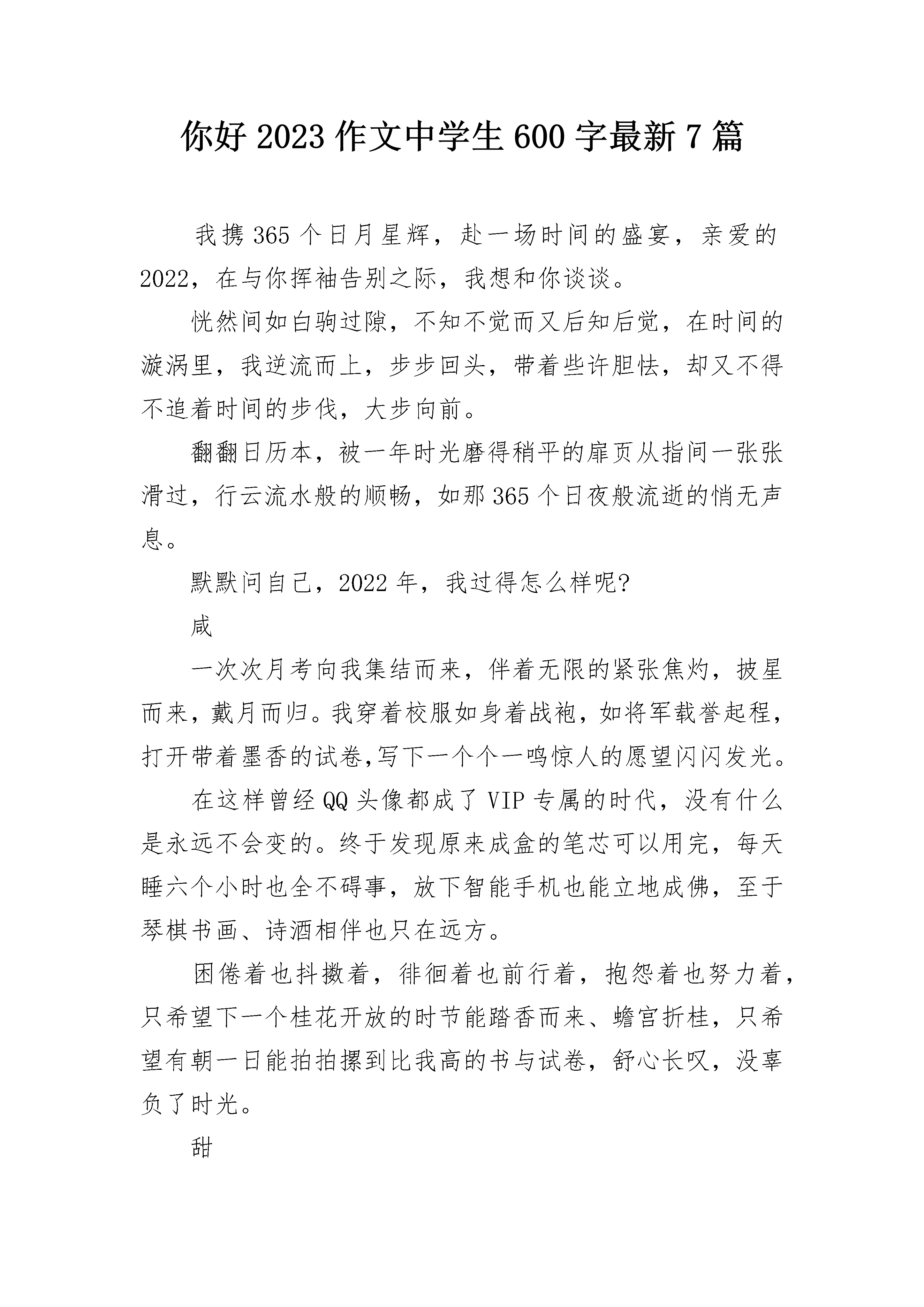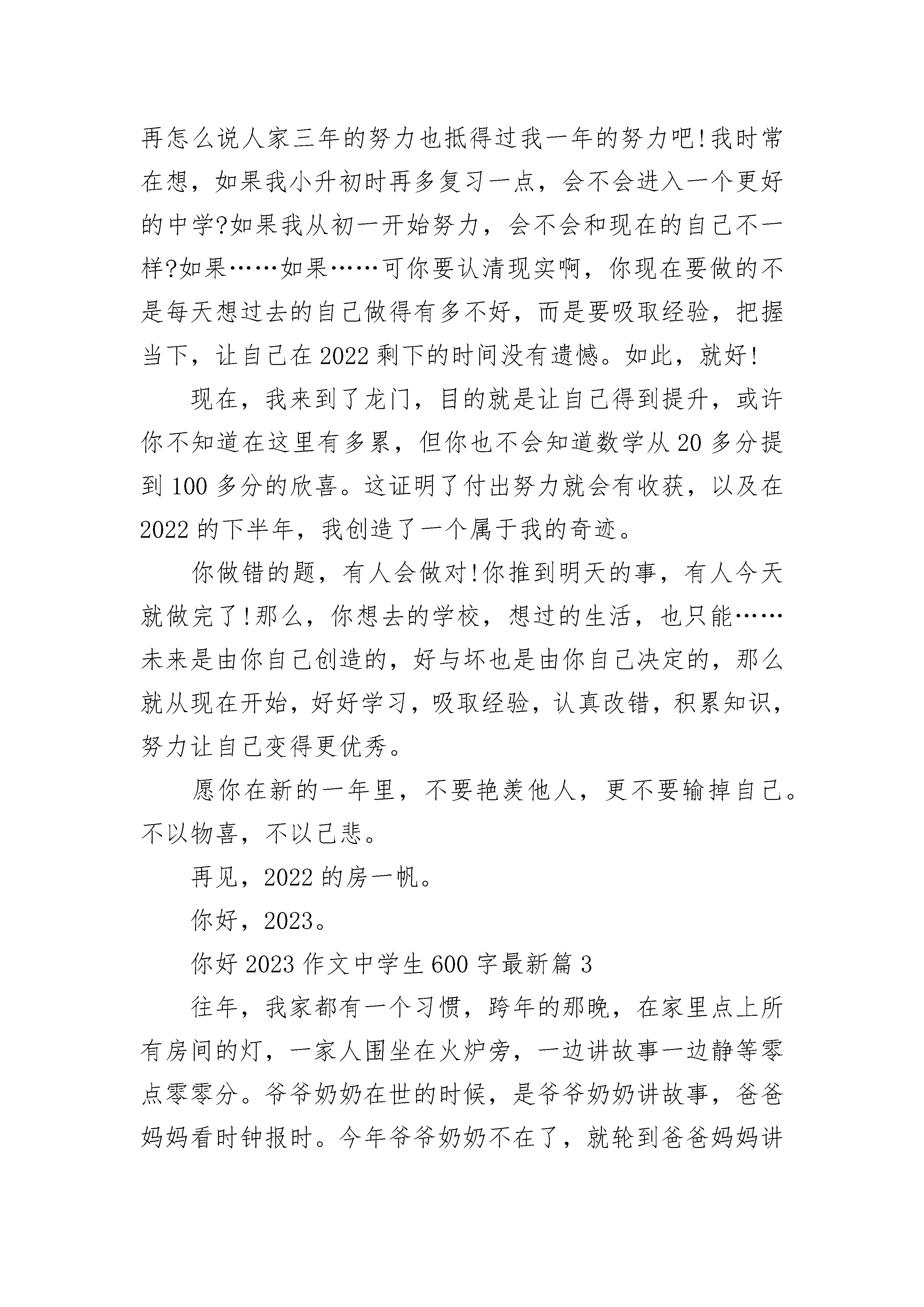 你好2023作文中学生600字最新7篇我携365个日月星辉,赴一场时间的盛宴,亲爱的2022,在与你挥袖告别之际,我想和你谈谈。恍然间如白驹过隙,不知不觉而又后知后觉,在时间的漩涡里,我逆流而上,步步回头,带着些许胆怯,却又不得不追着时间的步伐,大步向前。翻翻日历本,被一年时光磨得稍平的扉页从指间一张张滑过,行云流水般的顺畅,如那365个日夜般流逝的悄无声息。默默问自己,2022年,我过得怎么样呢?咸一次次月考向我集结而来,伴着无限的紧张焦灼,披星而来,戴月而归。我穿着校服如身着战袍,如将军载誉起程,打开带着墨香的试卷,写下一个个一鸣惊人的愿望闪闪发光。在这样曾经QQ头像都成了VIP专属的时代,没有什么是永远不会变的。终于发现原来成盒的笔芯可以用完,每天睡六个小时也全不碍事,放下智能手机也能立地成佛,至于琴棋书画、诗酒相伴也只在远方。困倦着也抖擞着,徘徊着也前行着,抱怨着也努力着,只希望下一个桂花开放的时节能踏香而来、蟾宫折桂,只希望有朝一日能拍拍摞到比我高的书与试卷,舒心长叹,没辜负了时光。甜匆忙交齐各科作业,冲组长谄媚一笑:“再给我一个课间。”偷偷摸摸买的小零食总被一抢而光,穿过长长的走廊奔到食堂求阿姨多打几块肉,接着回头朝同学邪魅一笑。回到教室又看见被试卷霸占的课桌,只得抓抓眉角,继续埋头苦干。竖起耳朵偷偷听着学霸之间的探讨,一边哀怨着考试的冷酷,一边抖擞着奋笔疾书。红色的建筑为我们围出一片四角天空,我们则在天空下各自写出自己的梦想。一切都是梦想的样子。身上着甲,心上着花,重复着两点一线的生活,平淡的日子有味是清欢。年轻是我们拥有权力去编织梦想的时光,2022的烦恼和幸福都将渐行渐远,2023还有我们未完的梦继续……你好2023作文中学生600字最新篇2你要知道,这个世界上有许多再见都是再也不见的意思;你要明白,有些事过去就过去了,再也回不来了;你要反省,过去的时间你是否做了有意义的事,就在这个2022。无论这一年是好是坏,但终究不会再回来了,你要做的不是缅怀过去,而是活在当下、期待未来。上半年的你“吃喝玩乐”整天“无所事事”,下半年的你意识到了学习的重要性,于是开始觉醒。周末回家听妈妈说,我的好朋友这几次月考成绩跟开了挂一样,从来都没下过年级前30,可我记得自己小学时学的要比她好很多啊,后来一到初中就开始玩,总想着考高中有多么简单,就算闭着眼睛也能考上,而她一直在努力,的确,现在努力还不是很晚,可相对初一的时候就整整迟了两年,再怎么说人家三年的努力也抵得过我一年的努力吧!我时常在想,如果我小升初时再多复习一点,会不会进入一个更好的中学?如果我从初一开始努力,会不会和现在的自己不一样?如果……如果……可你要认清现实啊,你现在要做的不是每天想过去的自己做得有多不好,而是要吸取经验,把握当下,让自己在2022剩下的时间没有遗憾。如此,就好!现在,我来到了龙门,目的就是让自己得到提升,或许你不知道在这里有多累,但你也不会知道数学从20多分提到100多分的欣喜。这证明了付出努力就会有收获,以及在2022的下半年,我创造了一个属于我的奇迹。你做错的题,有人会做对!你推到明天的事,有人今天就做完了!那么,你想去的学校,想过的生活,也只能……未来是由你自己创造的,好与坏也是由你自己决定的,那么就从现在开始,好好学习,吸取经验,认真改错,积累知识,努力让自己变得更优秀。愿你在新的一年里,不要艳羡他人,更不要输掉自己。不以物喜,不以己悲。再见,2022的房一帆。你好,2023。你好2023作文中学生600字最新篇3往年,我家都有一个习惯,跨年的那晚,在家里点上所有房间的灯,一家人围坐在火炉旁,一边讲故事一边静等零点零零分。爷爷奶奶在世的时候,是爷爷奶奶讲故事,爸爸妈妈看时钟报时。今年爷爷奶奶不在了,就轮到爸爸妈妈讲故事,由我来看时钟报时了。爸爸通知我跨年夜由我看时钟时,我还有些紧张。因为我老是想到电影里面开国大典的升旗仪式以及香港回归和澳门回归的升旗仪式,那种庄严神圣的仪式,容不得开一点点小差,要是我站在国旗台下作为升旗手的话,我知道我一定会紧张地发抖!我家的这个习惯,虽然不至于让看时钟的我如此庄重,可我也不想因为我的紧张而搞砸我家每年的跨年夜习惯。到了跨年这一天,爸爸先是在饭桌上透露他准备的_,妈妈则在爸爸的“炫耀”下,不甘示弱地告诉我们她也准备了很多2022和2023相关的故事,让我们拭目以待今晚的故事会吧!我听着爸爸妈妈的前情提示,我也在心里为自己看时钟报时的工作做了一下思想准备。等到晚上我们围在火炉旁开始故事会时,我回想起的不是过去爷爷奶奶在的时候的情形,而是小时候爸爸妈妈给我讲一千零一夜故事时的情形,我始终记得一千零一夜故事里那炉火以及那个讲故事人的神秘。跨年夜这一晚的爸爸妈妈像极了一千零一夜里面讲故事的人,穿着为跨越202